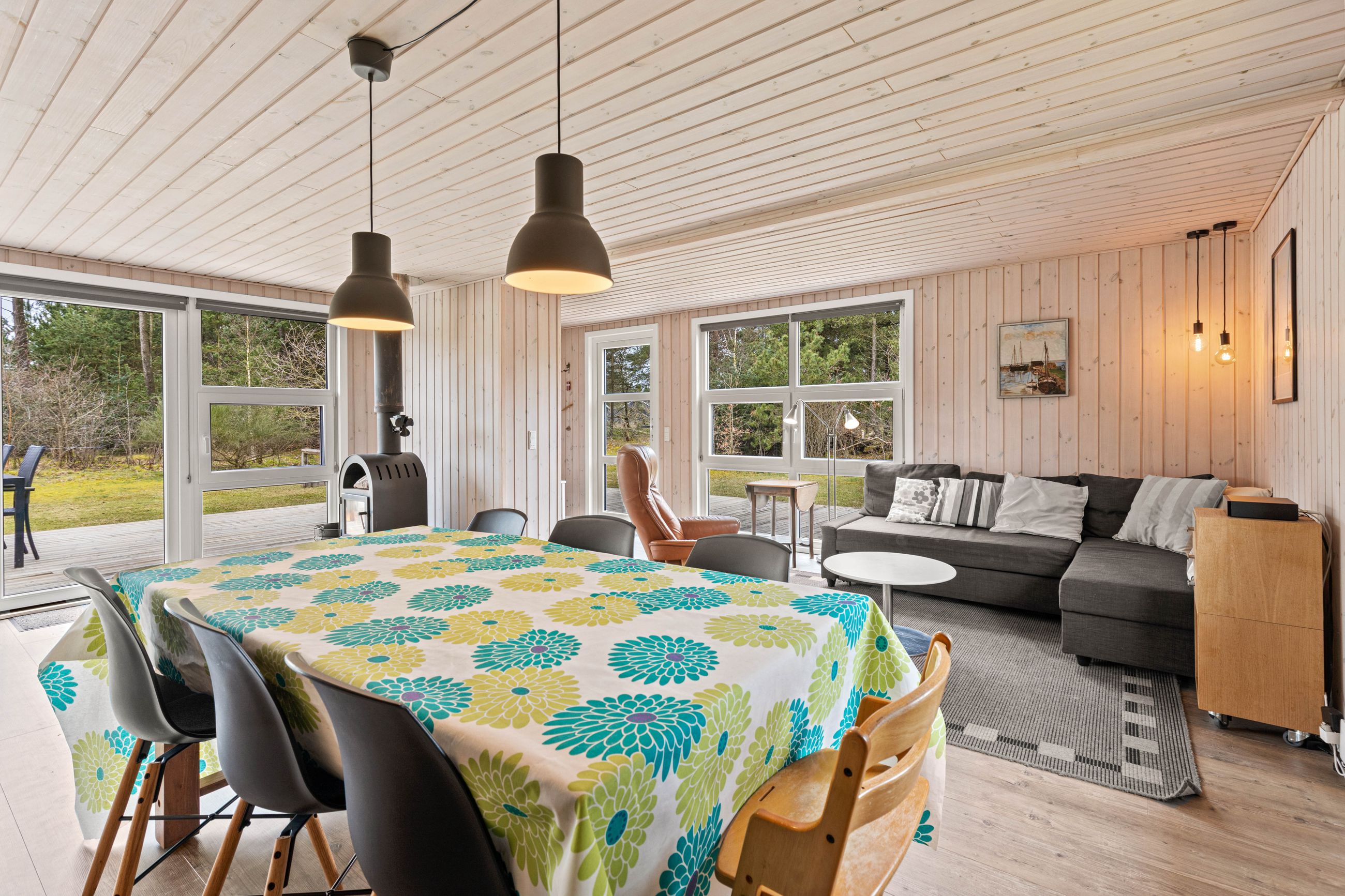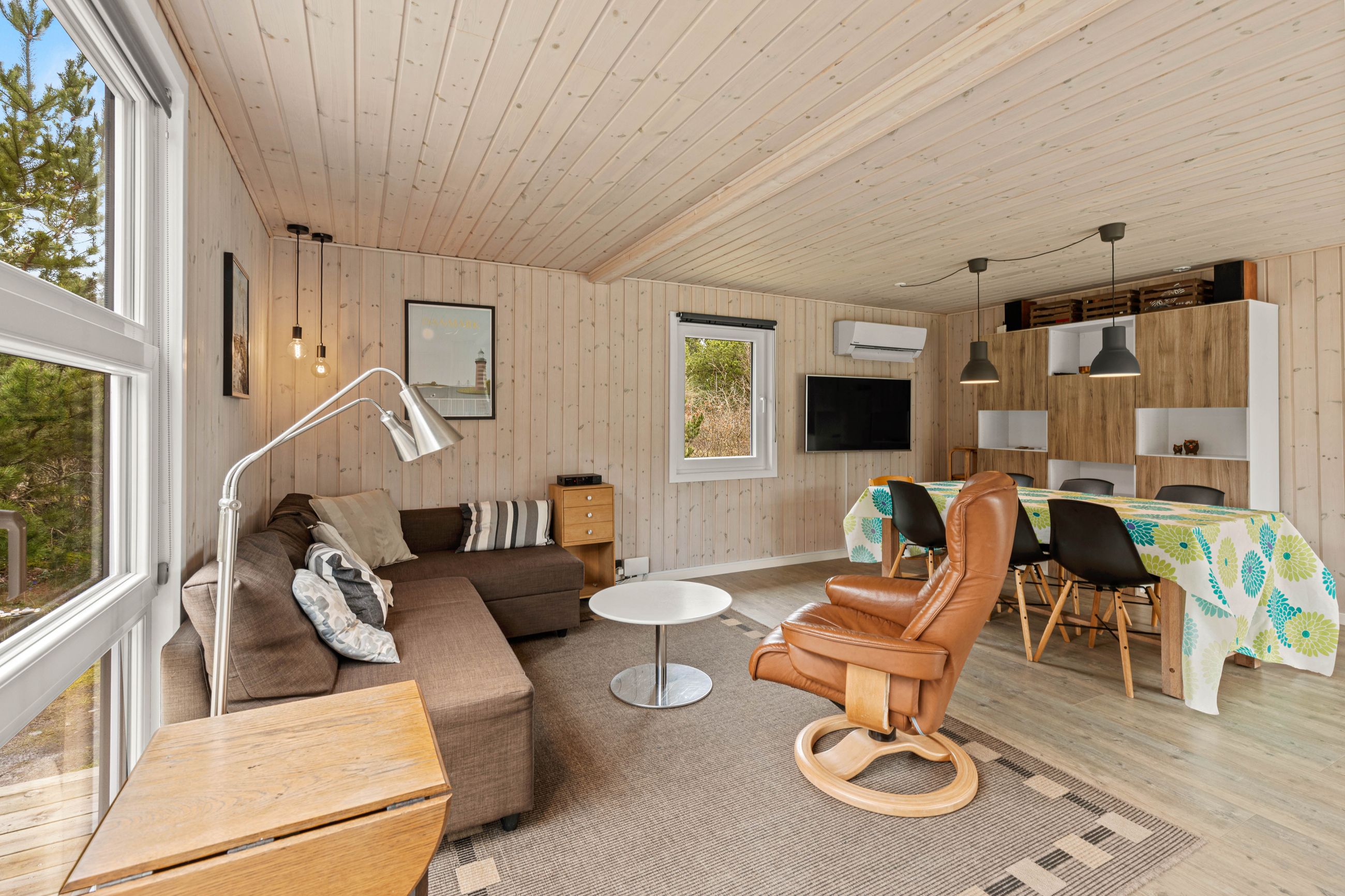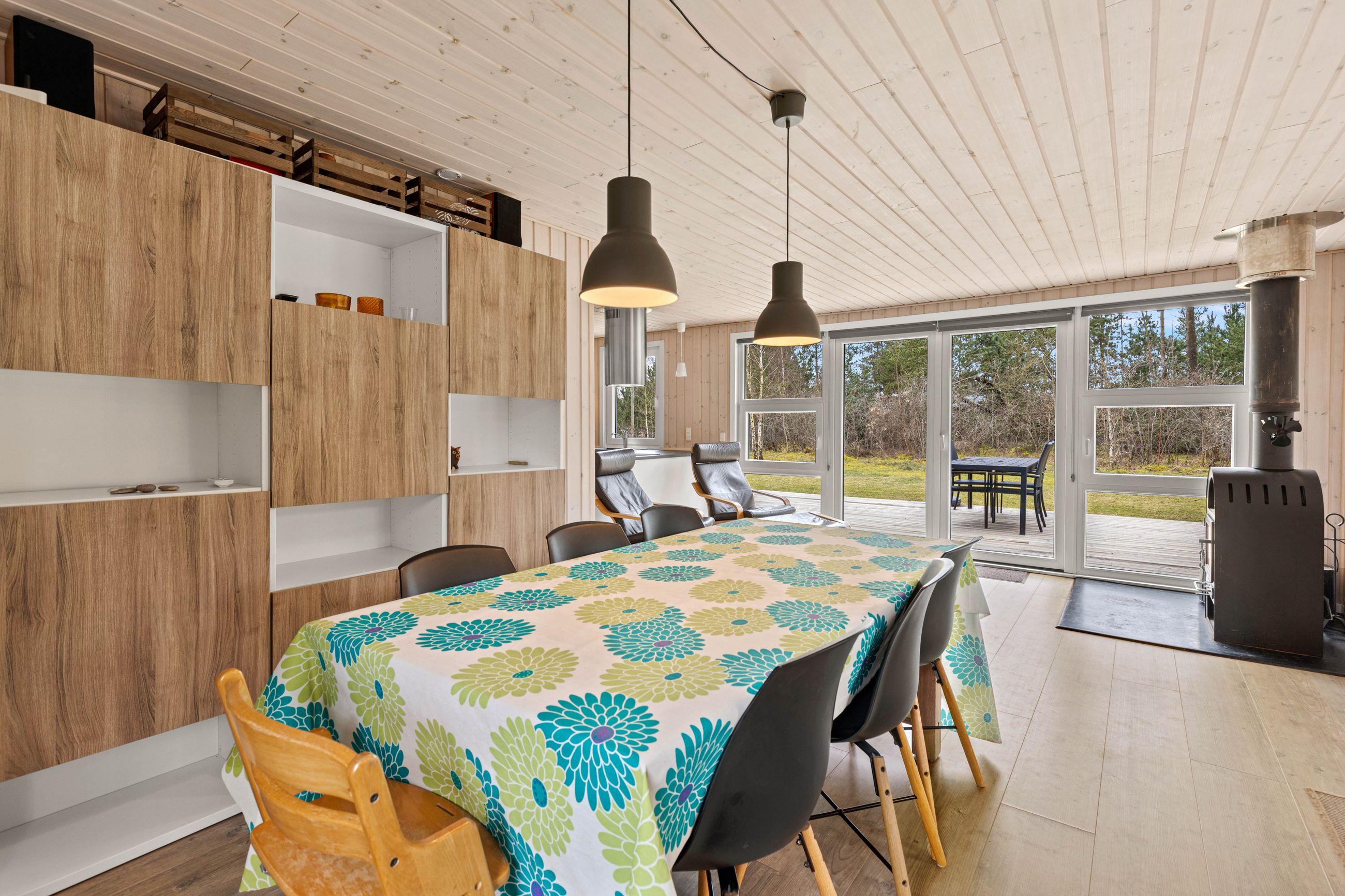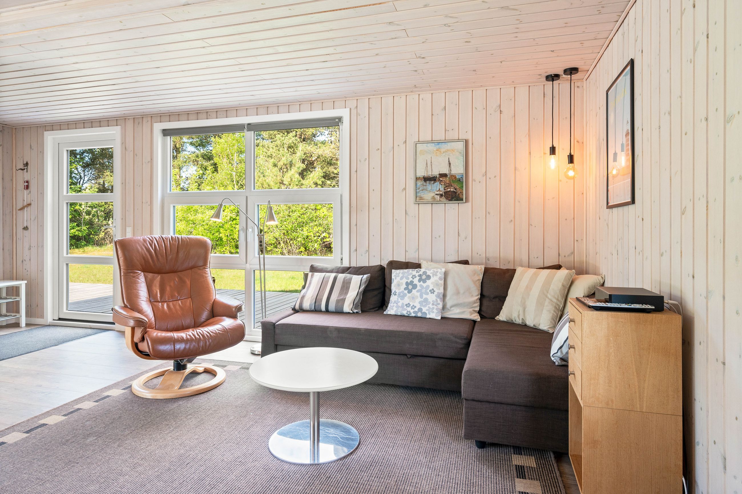 Huset er indrettet med en dejlig entré, stue med spiseplads samt opholdsafdeling med brændeovn. Delvist adskilt køkken, der er holdt i hvide elementer. Pænt badeværelse med skabsarrangement med spejl samt bruseafdeling. Køjerum med fire sovepladser. Soveværelse med dobbeltseng.