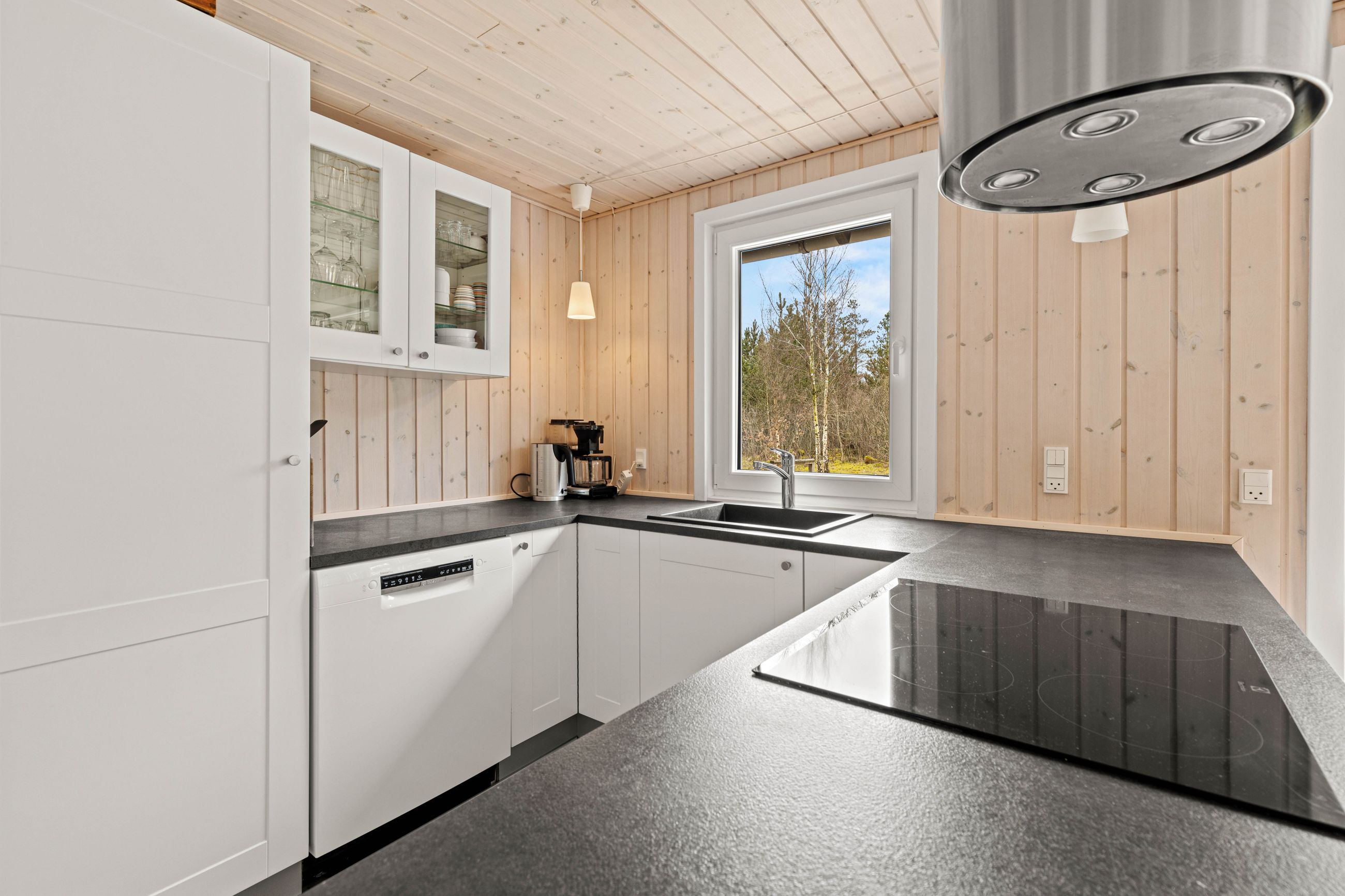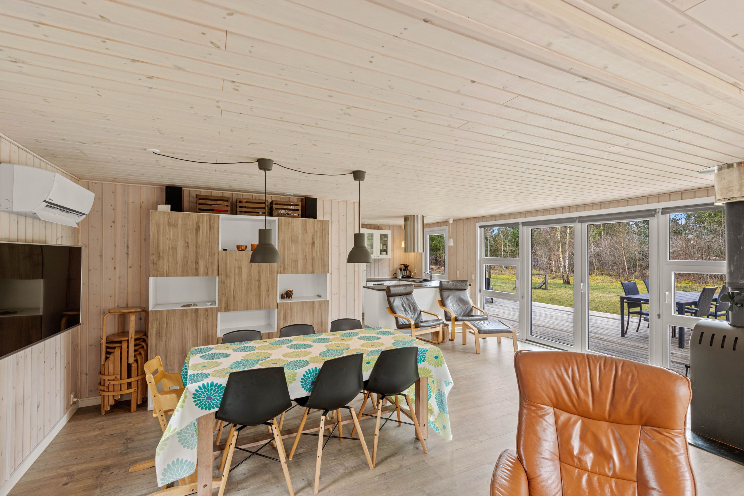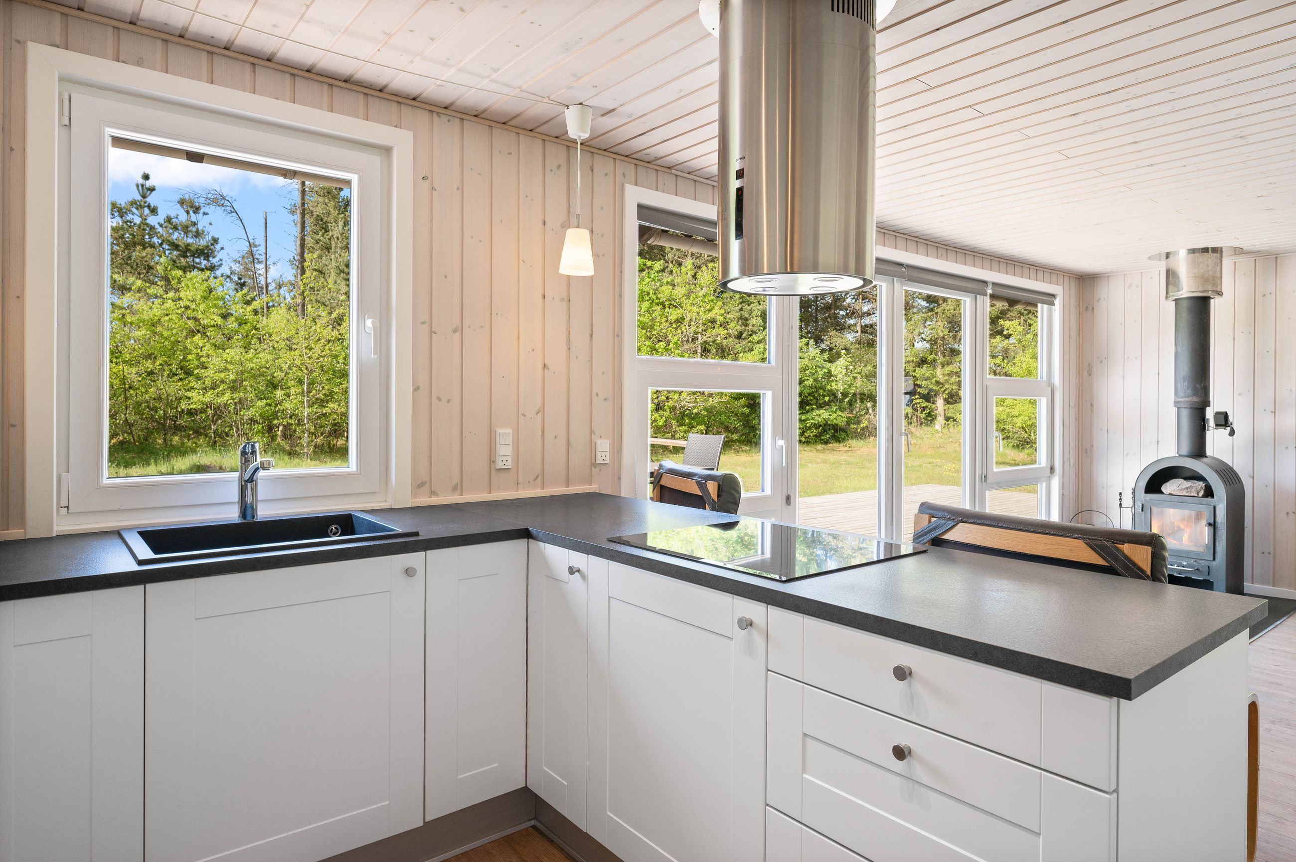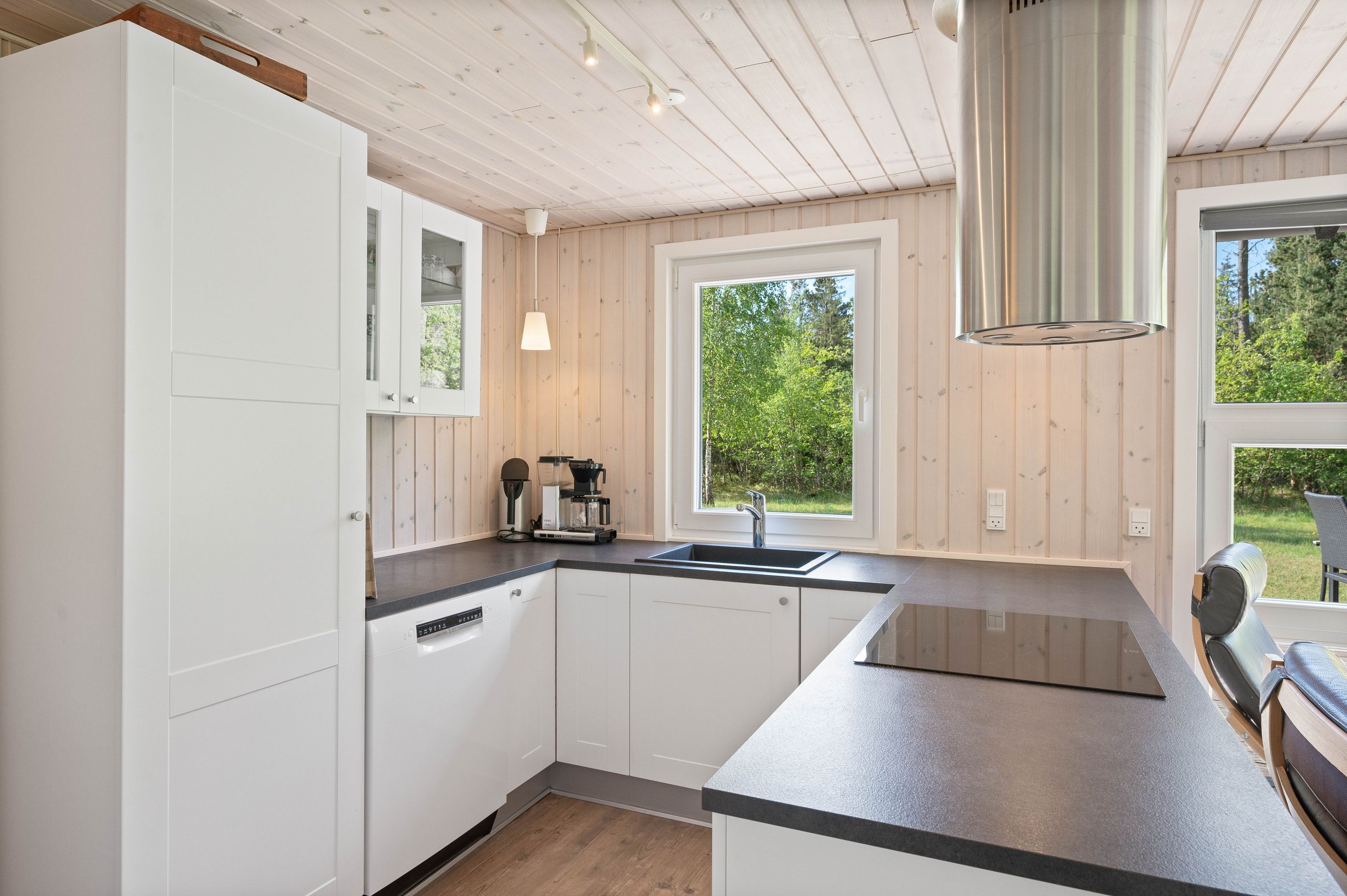 Huset er indrettet med en dejlig entré, stue med spiseplads samt opholdsafdeling med brændeovn. Delvist adskilt køkken, der er holdt i hvide elementer. Pænt badeværelse med skabsarrangement med spejl samt bruseafdeling. Køjerum med fire sovepladser. Soveværelse med dobbeltseng.