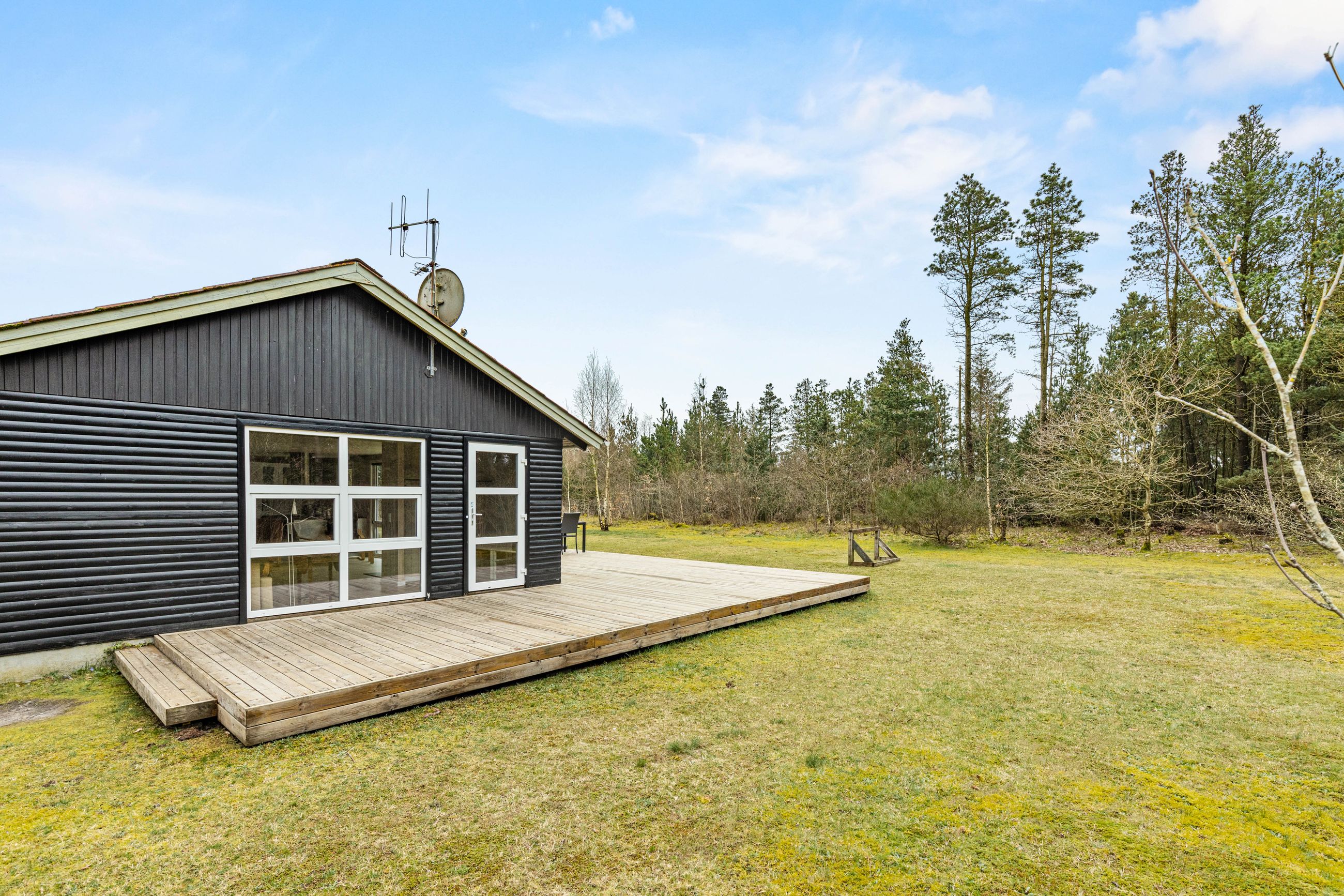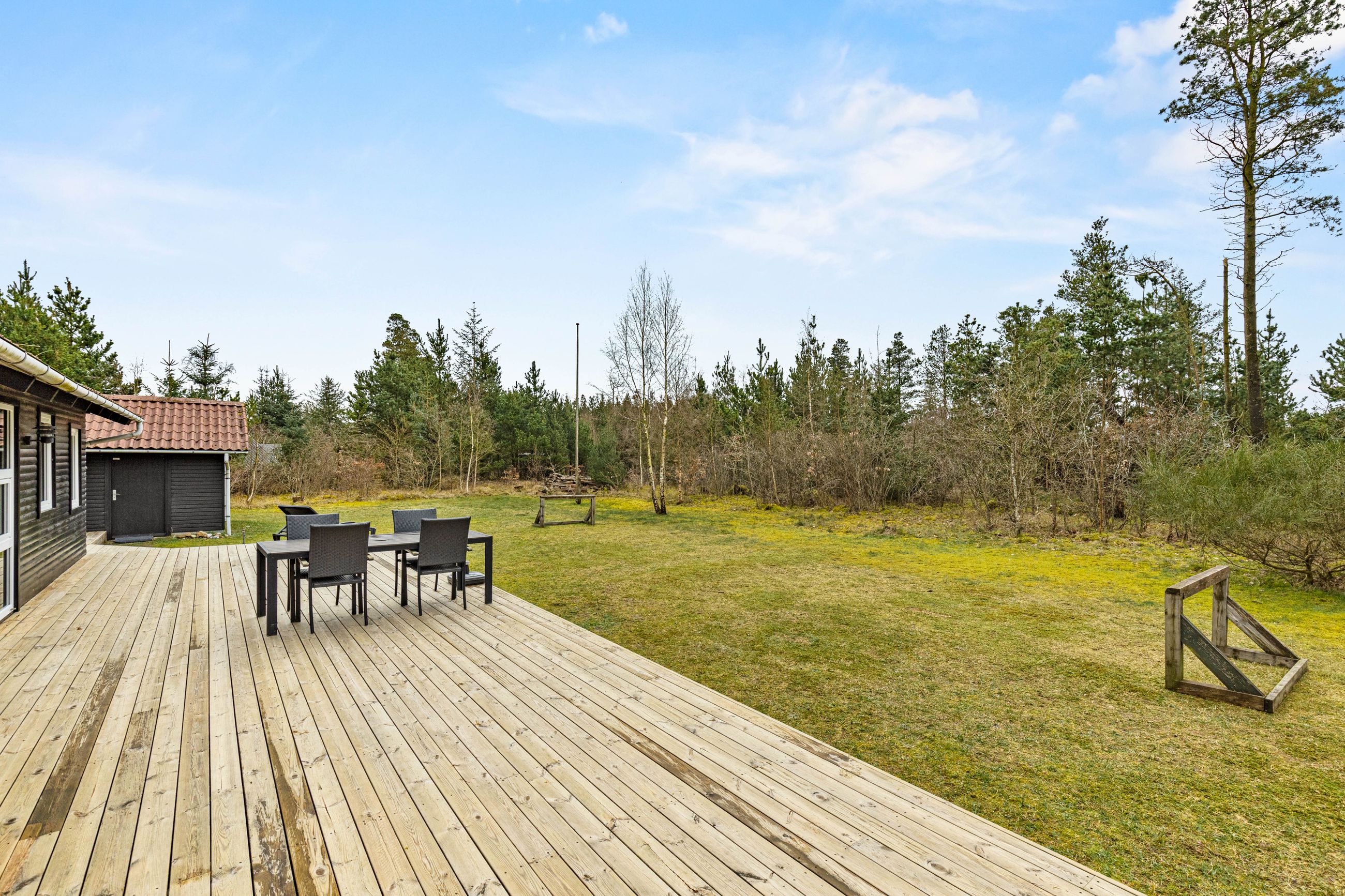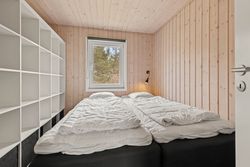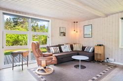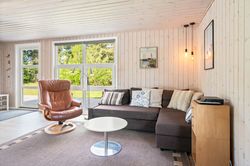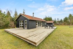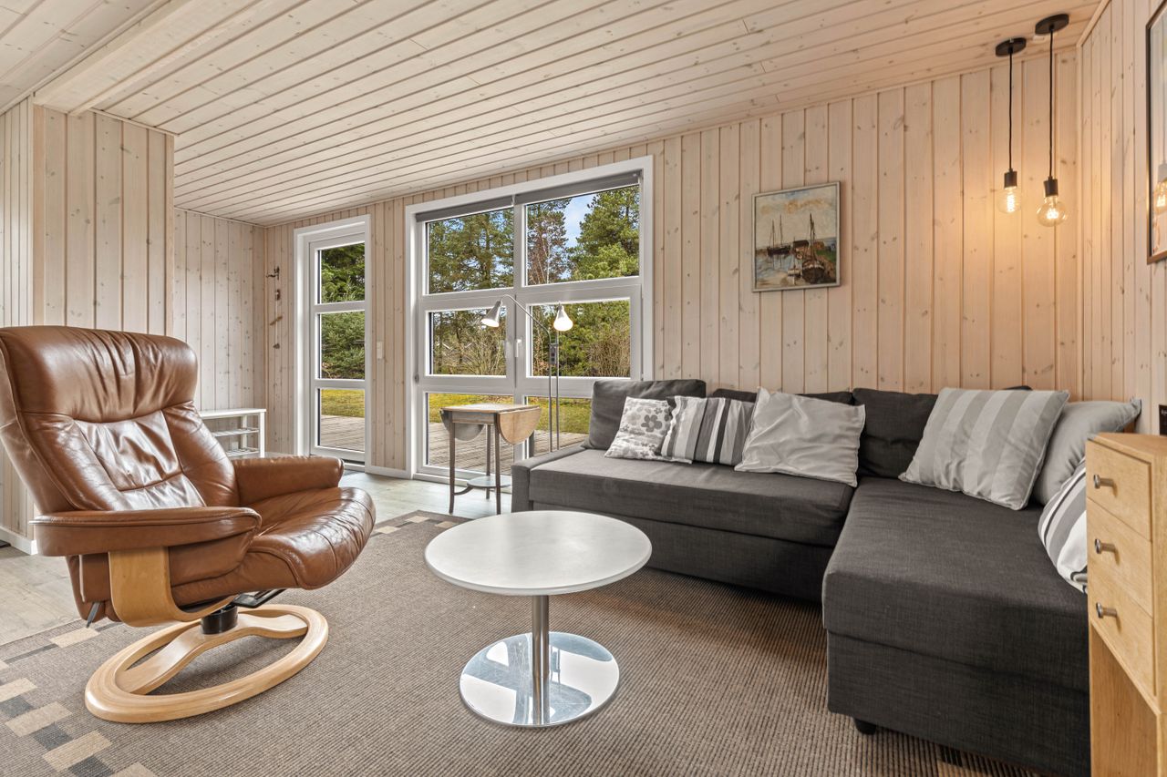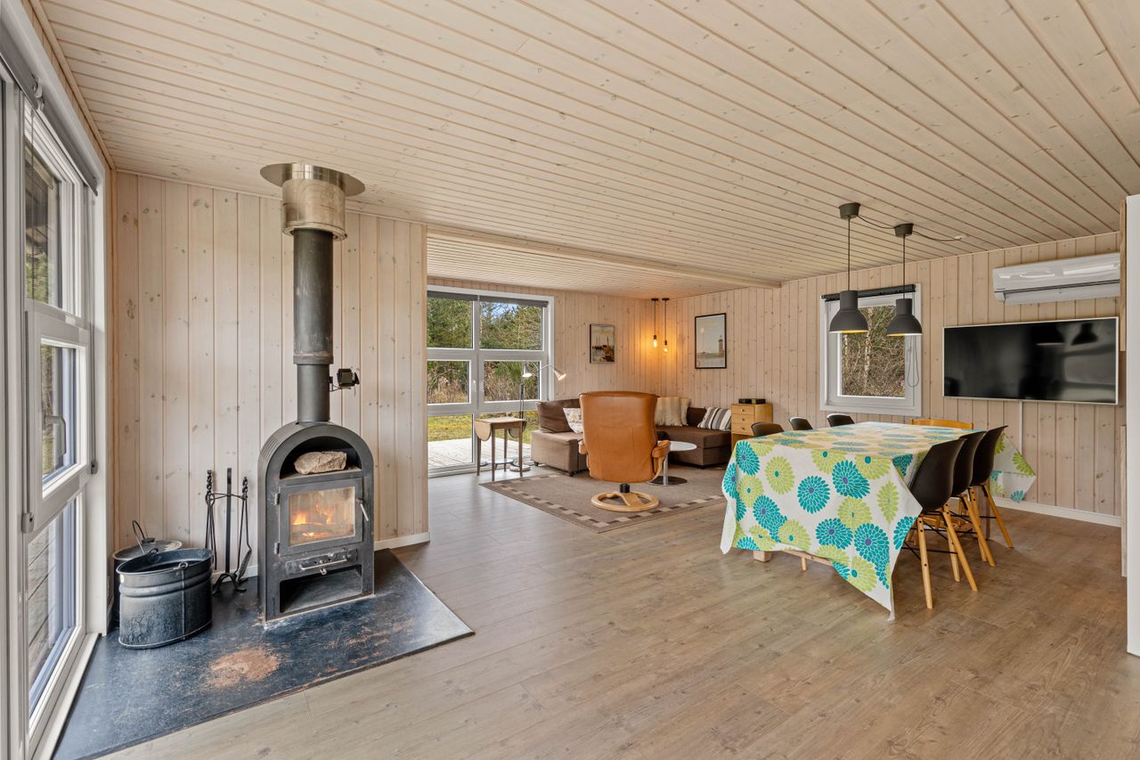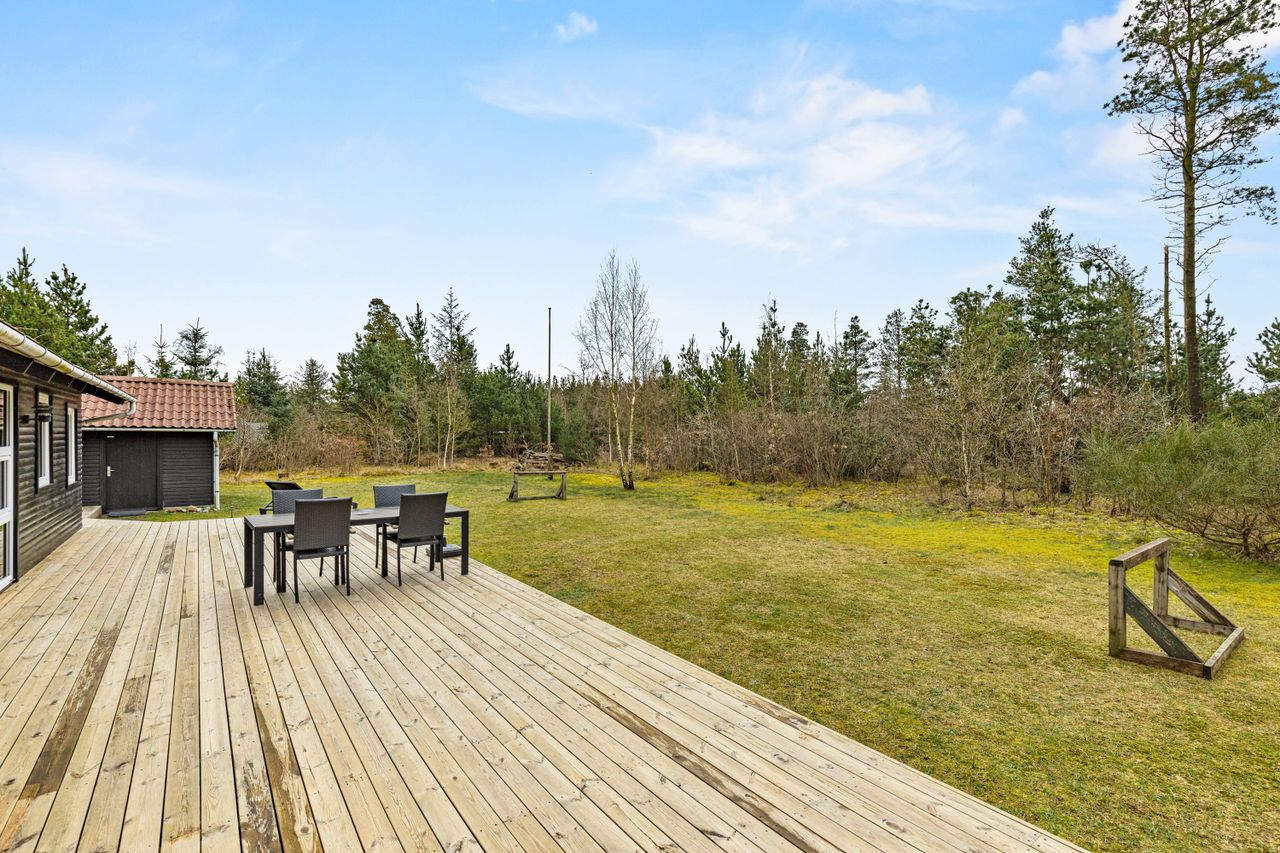 På stor, lukket og samtidig meget børnevenlig naturgrund tilbydes et rigtig hyggeligt og indflytningsklart sommerhus. Huset er løbende renoveret, ligesom boligarealet er blevet udvidet, idet en del af den tidligere overdækning nu er medtaget i beboelsen. Dette har medvirket til, at der er masser af luft i køkken/alrummet. Huset er opført i vandretliggende og sortmalede blokhusbrædder og med tagbelægning af rødt eternit. Der er særdeles gode udearealer med træterrasse. Endvidere er der en tilhørende lukket garage. Mellem de to bygninger er der en dejlig læfyldt terrasse, ligesom der foran huset er træterrasse mod syd og vest.