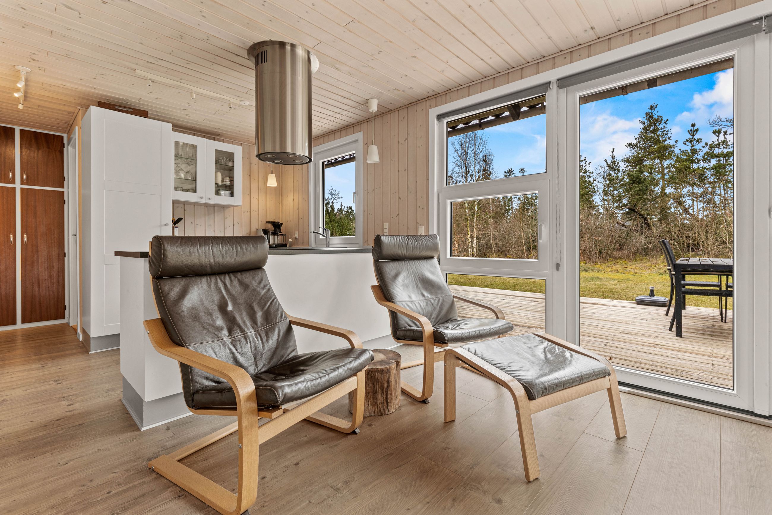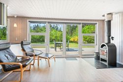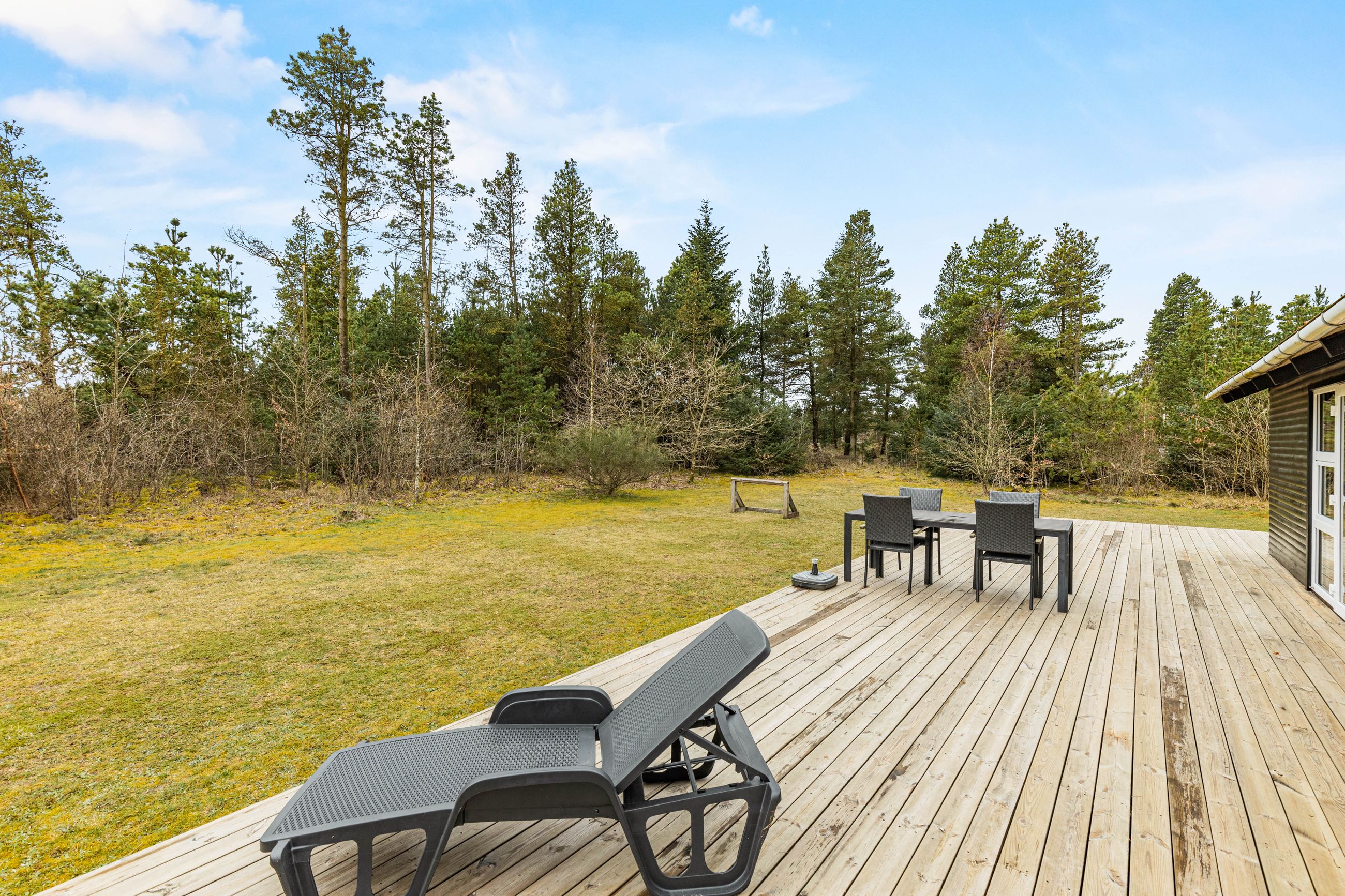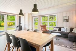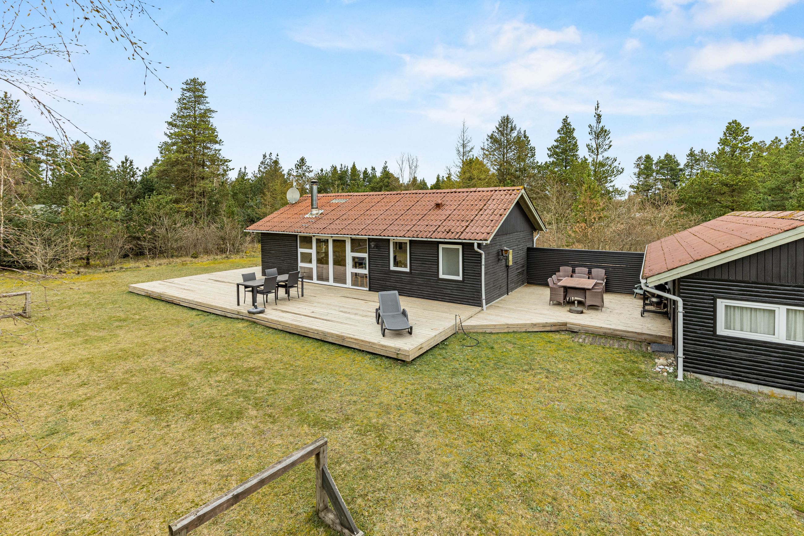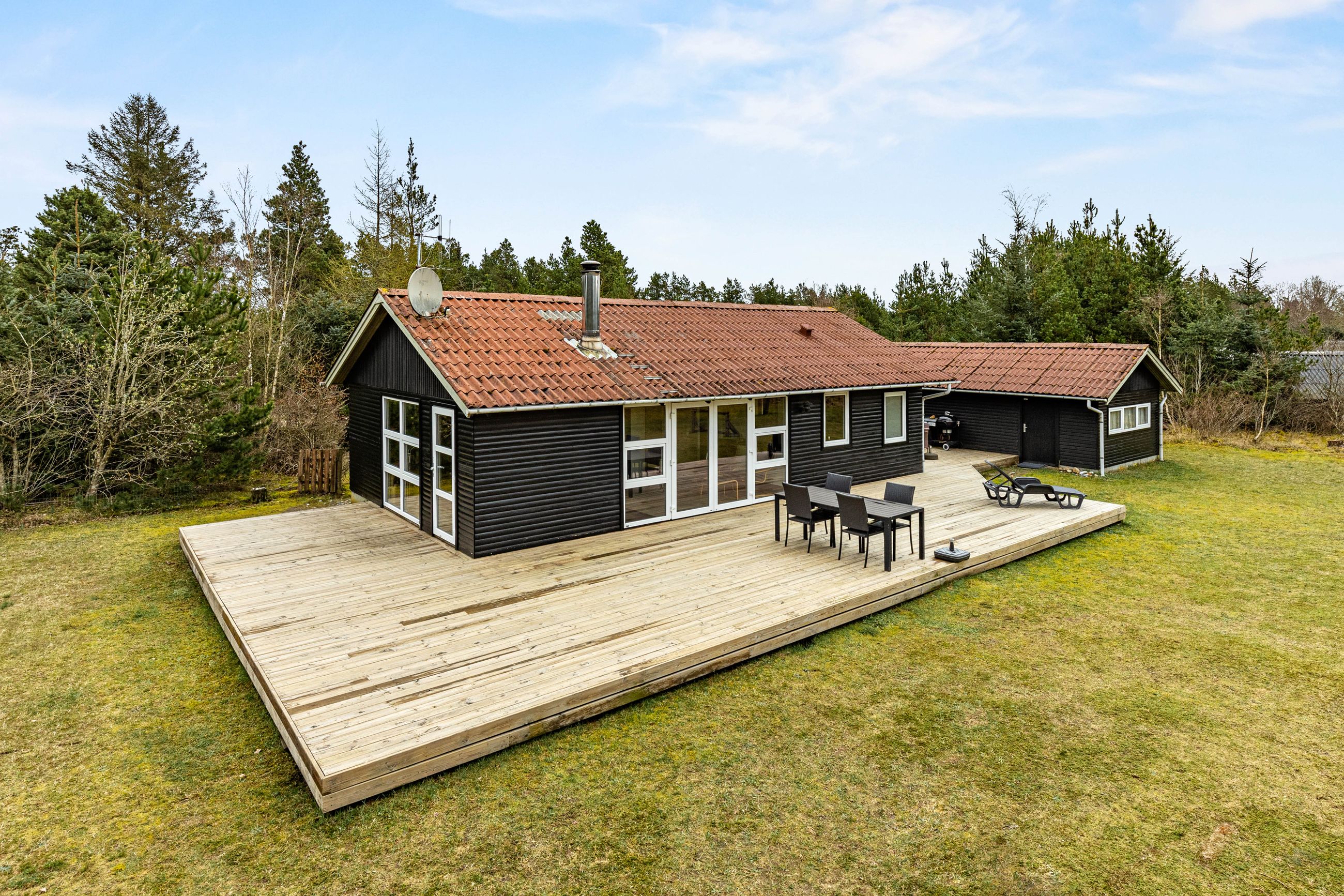 På stor, lukket og samtidig meget børnevenlig naturgrund tilbydes et rigtig hyggeligt og indflytningsklart sommerhus. Huset er løbende renoveret, ligesom boligarealet er blevet udvidet, idet en del af den tidligere overdækning nu er medtaget i beboelsen. Dette har medvirket til, at der er masser af luft i køkken/alrummet. Huset er opført i vandretliggende og sortmalede blokhusbrædder og med tagbelægning af rødt eternit. Der er særdeles gode udearealer med træterrasse. Endvidere er der en tilhørende lukket garage. Mellem de to bygninger er der en dejlig læfyldt terrasse, ligesom der foran huset er træterrasse mod syd og vest.