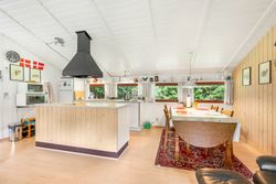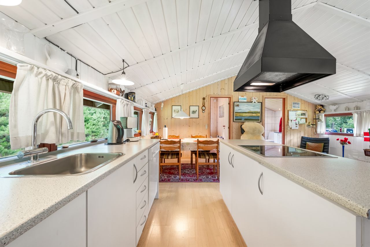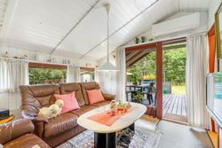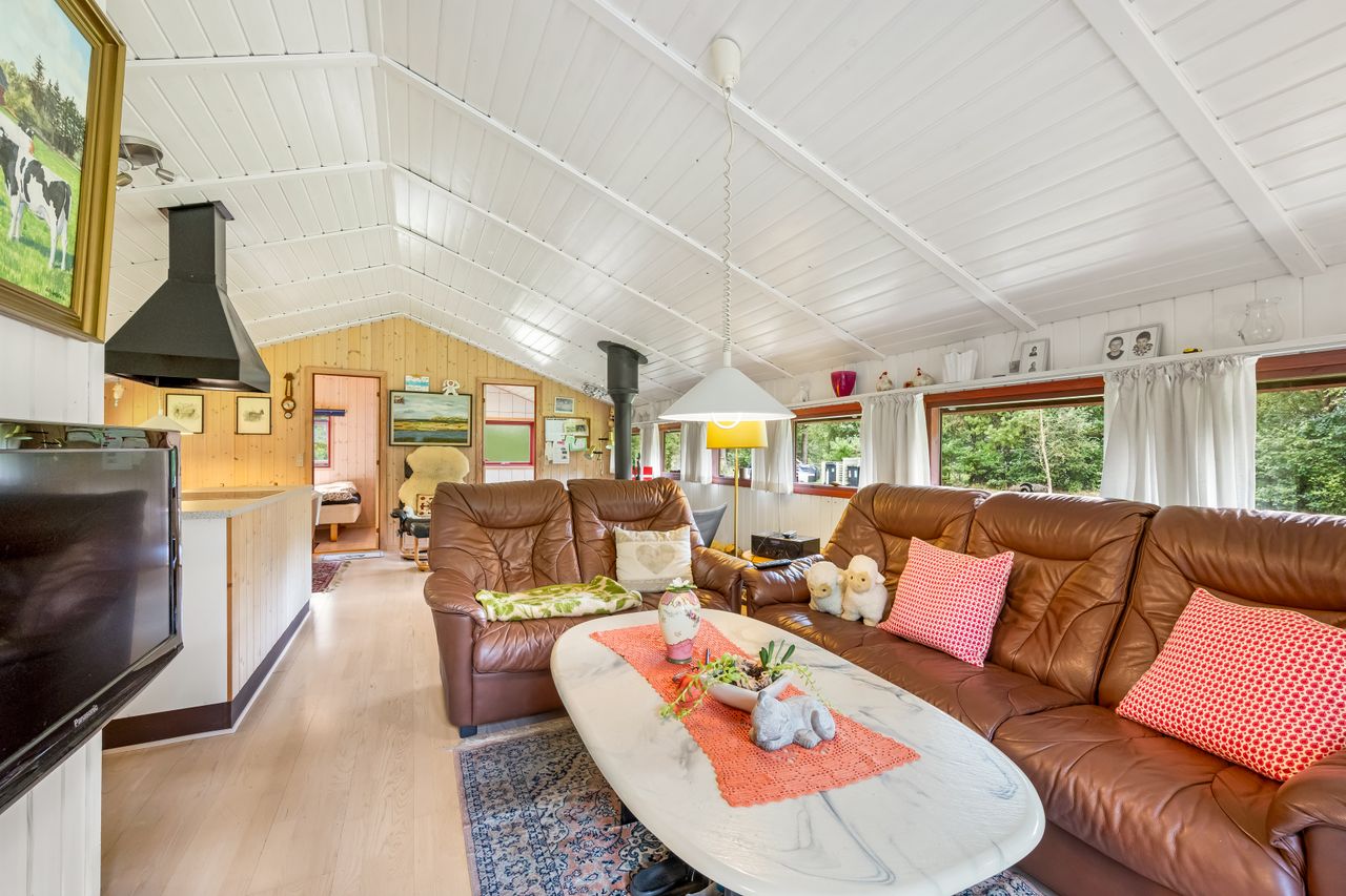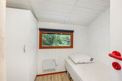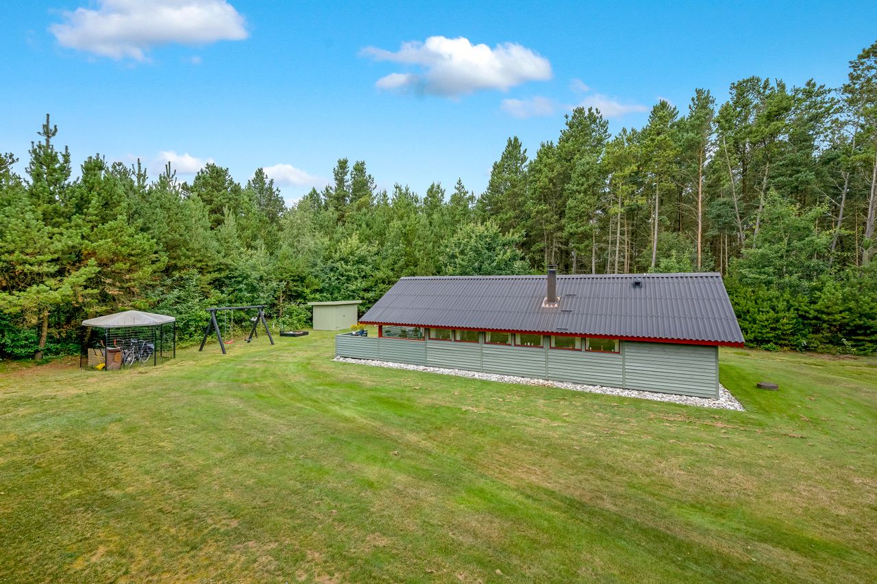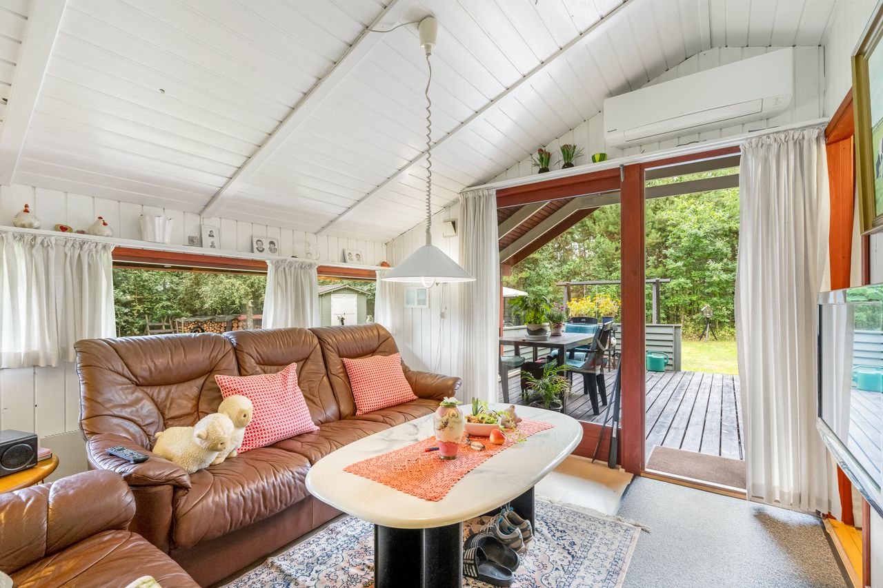 Et hyggeligt og samtidig nemt sommerhus på skøn randbeplantet, børnevenlig grund med høje træer. Huset, der er beliggende i det ene hjørne mod venstre for enden af blind vej, er ikke tilmeldt udlejning og bebos p.t. af husets nuværende ejer.