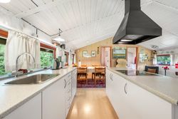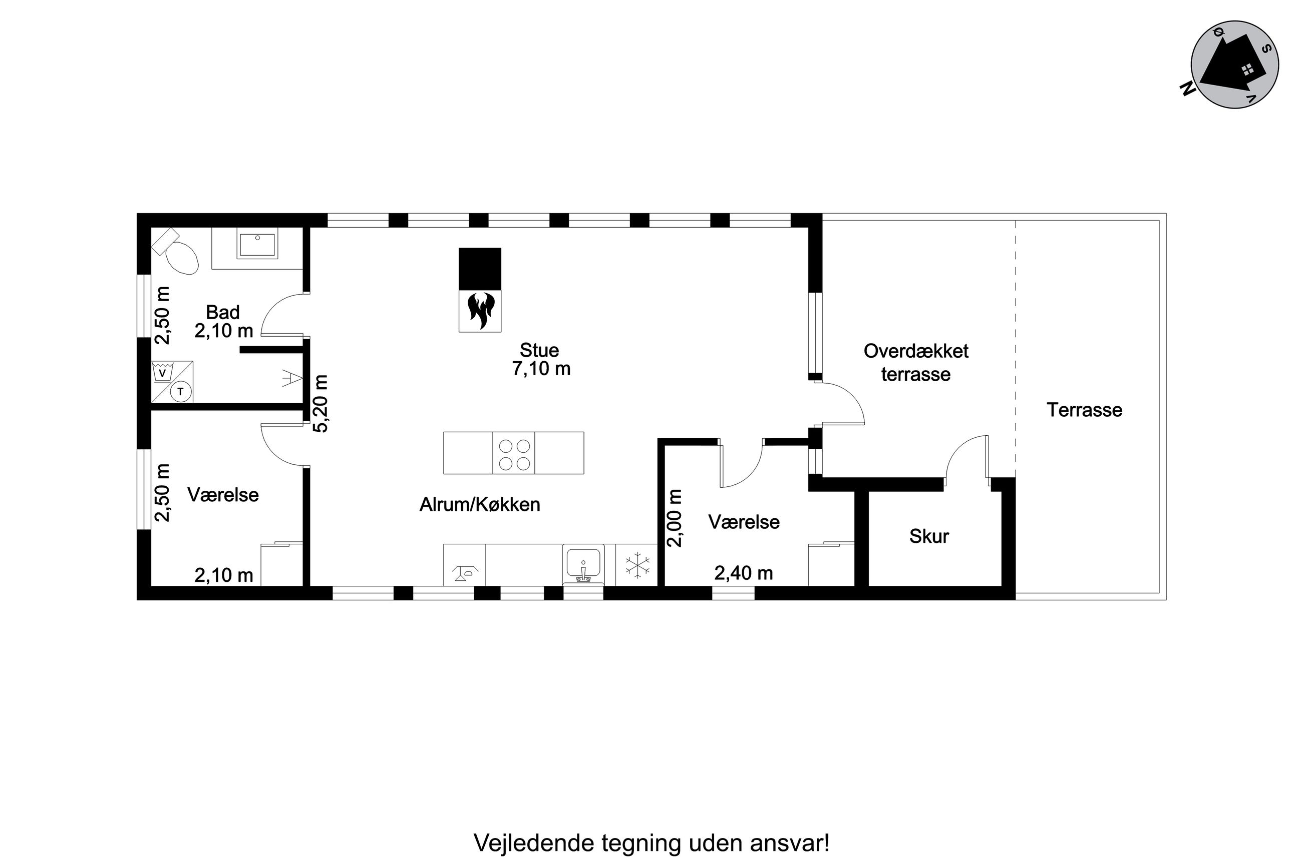 Der er tale om et længehus, opført i træ med tag af eternit. Huset har indgang via stor, delvis overdækket træterrasse til hyggelig stue, hvor der er opholdsafdeling og spiseplads. Åbent køkken. Huset har et godt soveværelse samt et gæsteværelse, ligesom der er badeværelse med bruseniche.