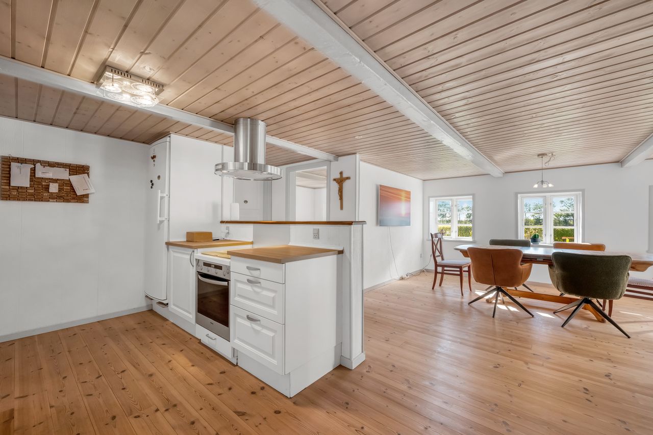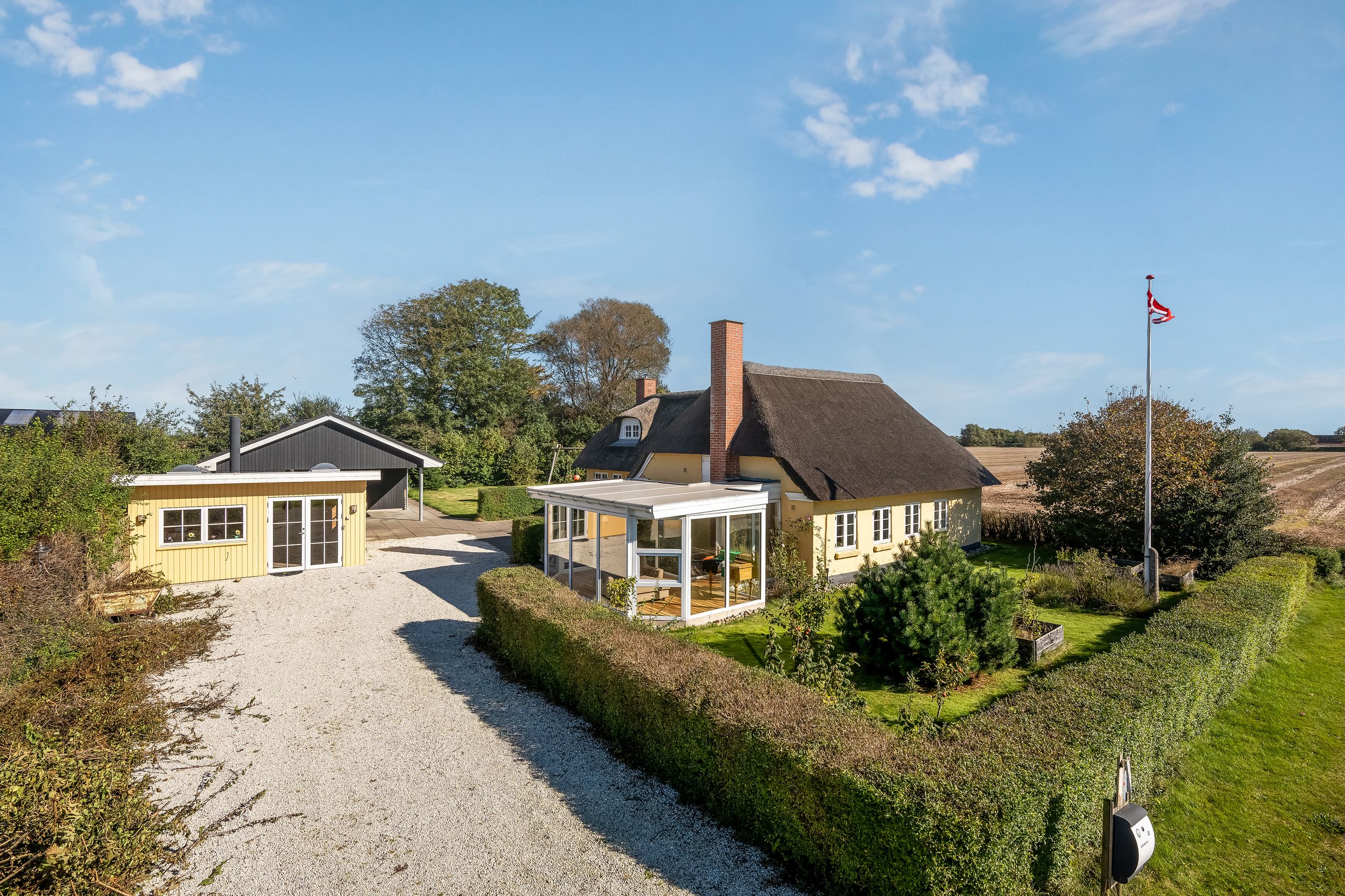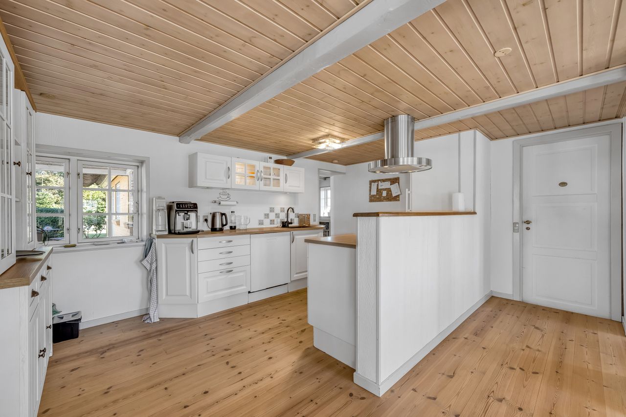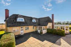 Selve hovedhuset er en gulmalet og pudset stråtækt ejendom med udnyttet tagetage. Ejendommen har entré med adgang til første sal samt stor stue, hyggeligt køkken/alrum, stor udestue, grovkøkken/bryggers samt værelse og badeværelse. På tagetagen er der to gode værelser.