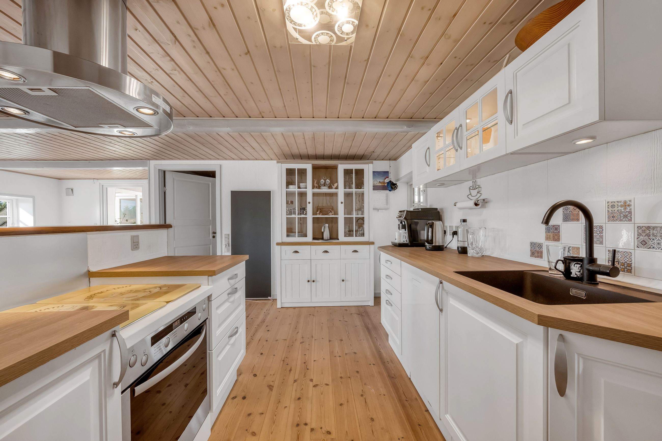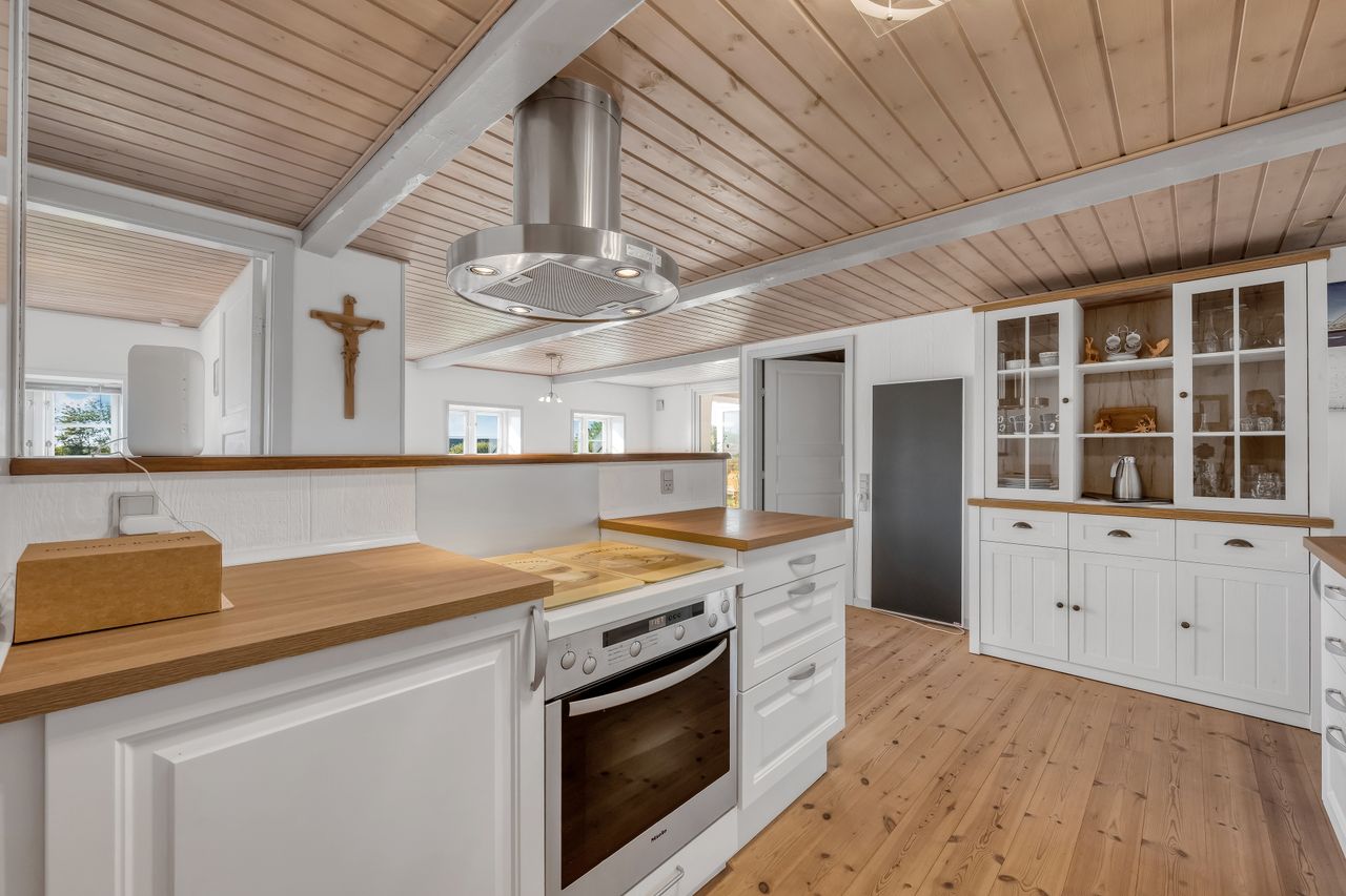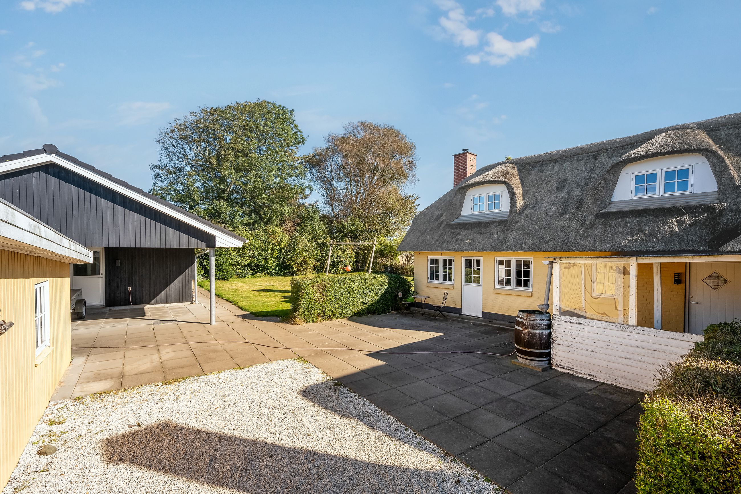 Selve hovedhuset er en gulmalet og pudset stråtækt ejendom med udnyttet tagetage. Ejendommen har entré med adgang til første sal samt stor stue, hyggeligt køkken/alrum, stor udestue, grovkøkken/bryggers samt værelse og badeværelse. På tagetagen er der to gode værelser.
