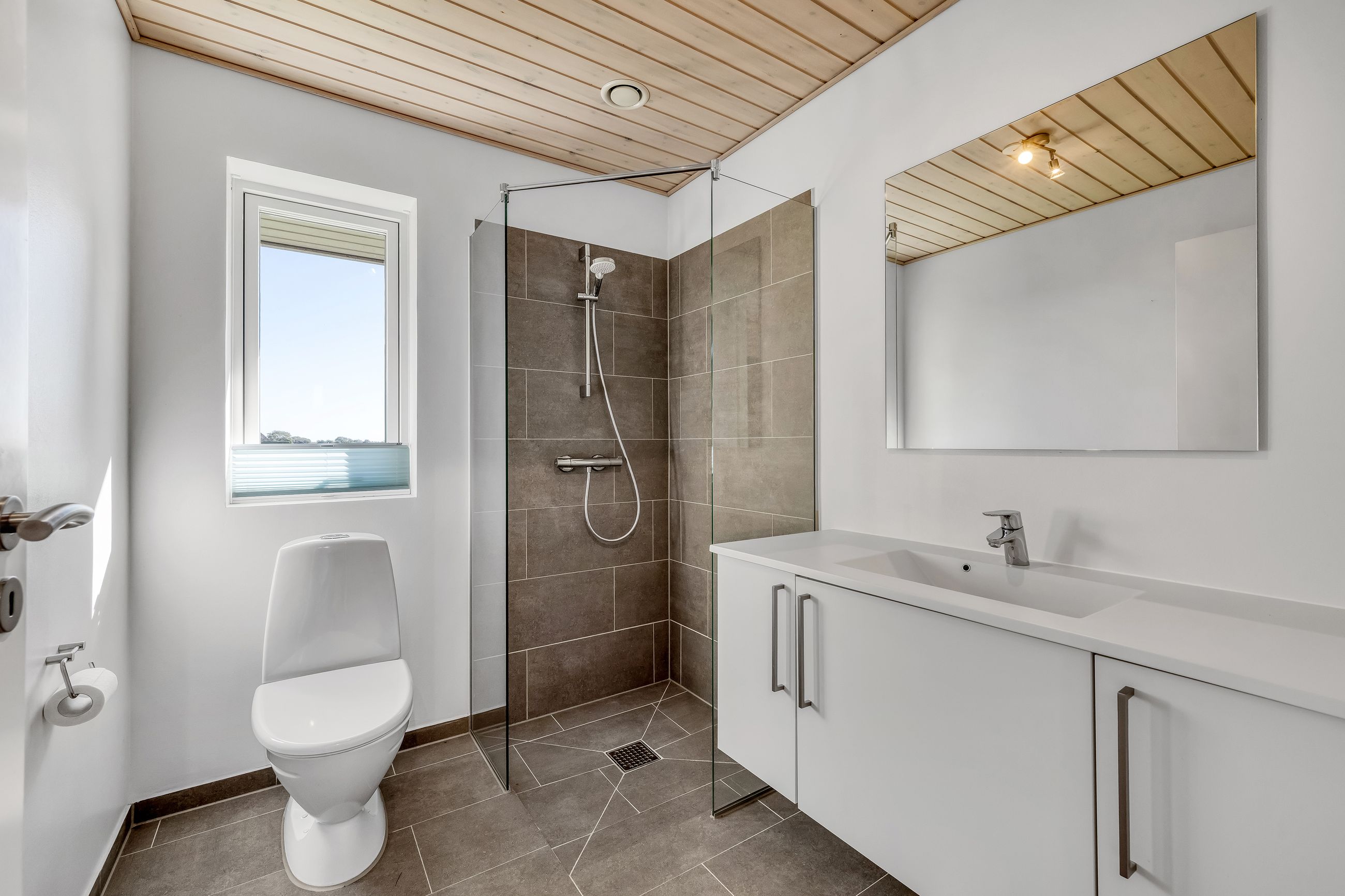Det sorte længehus opvarmes med luft-til-vand varmepumpe, medens det oprindelige hus opvarmes med luft-luft-varmepumpe og brændeovn.