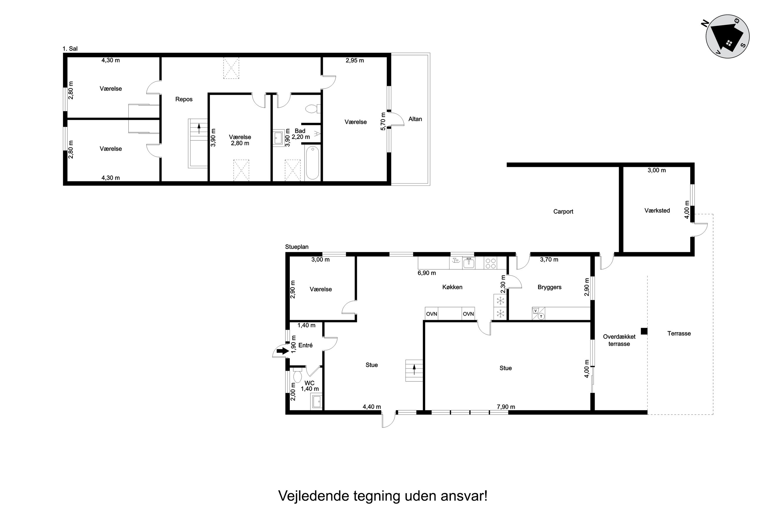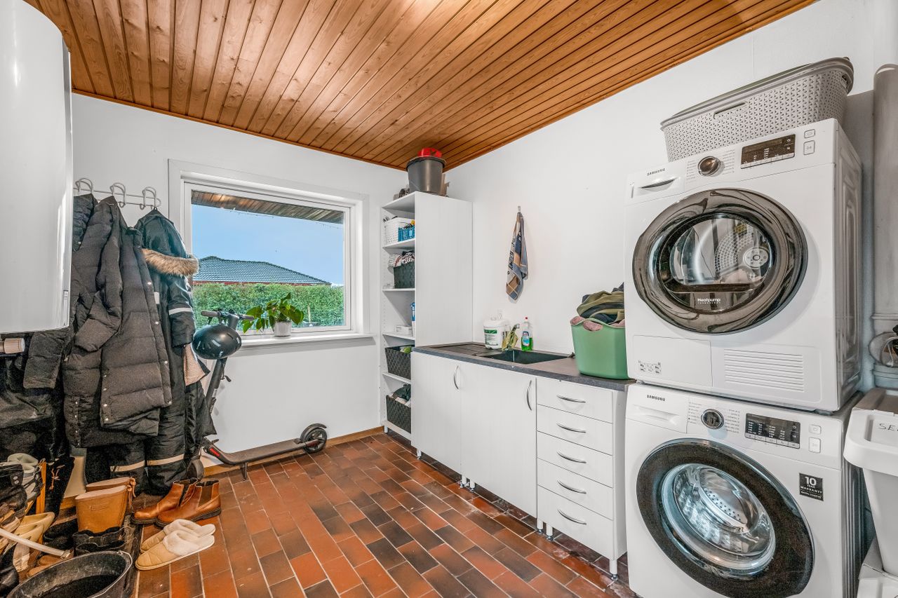 I husets stueplan er der adgang til entré med dør til gæstetoilet samt videre adgang til husets store rummelig alrum, der ligger i delvis åben forbindelse til husets køkken. Fra alrummet er der adgang til ekstra værelse samt husets tagetage. Fra køkkenet er der adgang til stor stue samt husets bryggers, hvor de tekniske installationer ligeledes forefindes. Huset har en stor, nyere tilhørende træterrasse samt en carport.