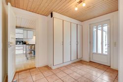 Man tilgår huset via en muret, klinkebelagt trappe, der fører ind til en stor flisebelagt hall/entré. Fra hall'en er der adgang til husets tagetage, der er pænt istandsat.