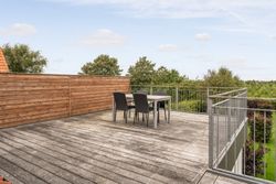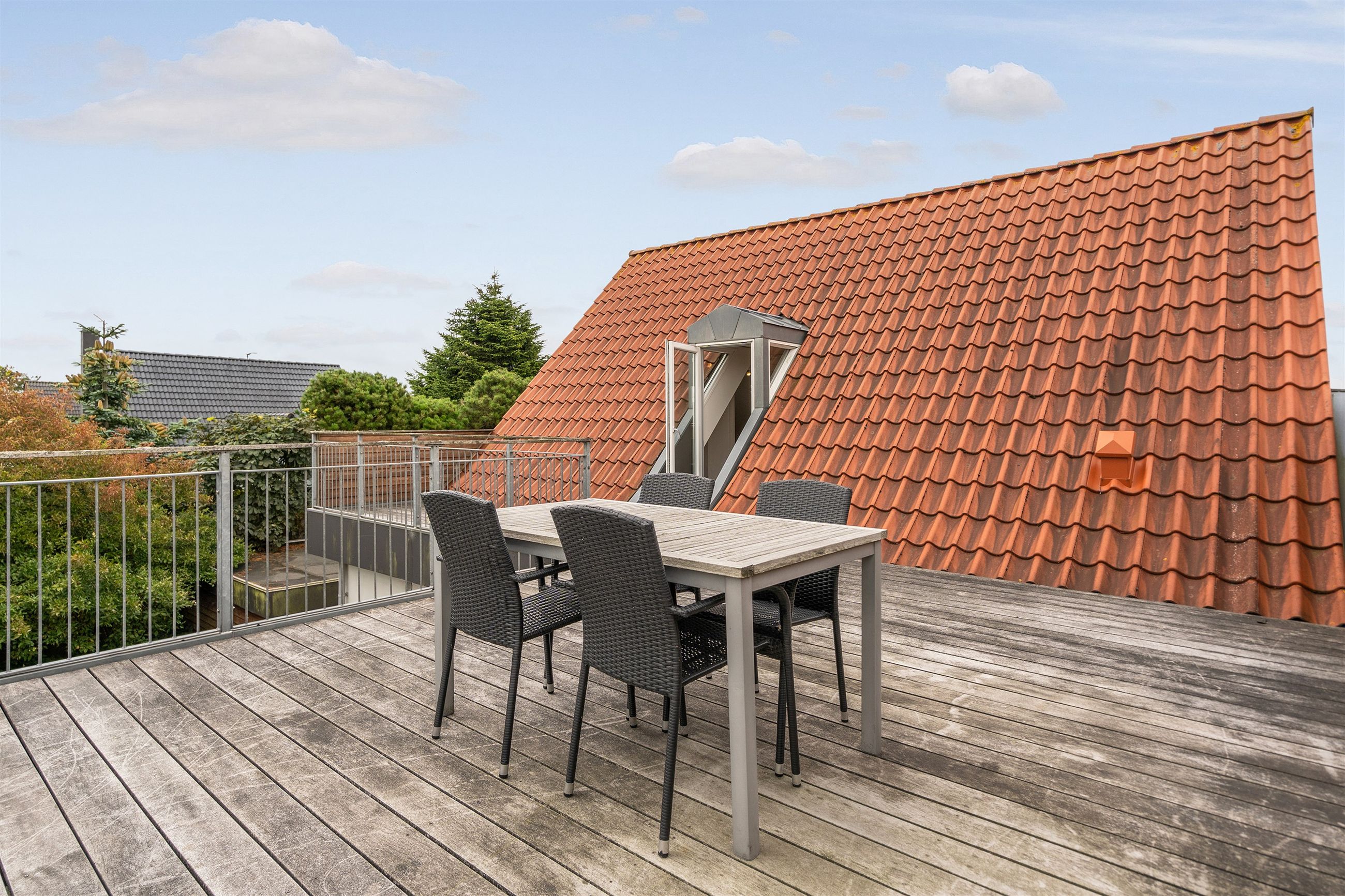 Husets tagetage tilgår man via en smuk trætrappe. Herfra adgang til et tæppebelagt repos med videre adgang til den føromtalte tagterrasse, hvorfra der er skøn udsigt til baghaven og den bagvedliggende plantage. Her kan sommeraftenerne nydes med et glas iskoldt hvidvin, medmindre man foretrækker at gøre dette i orangeriet bagest i haven.
