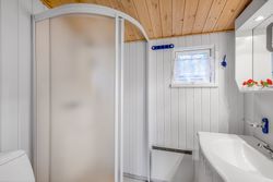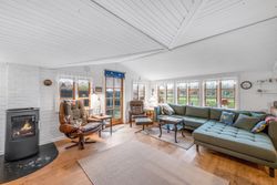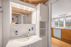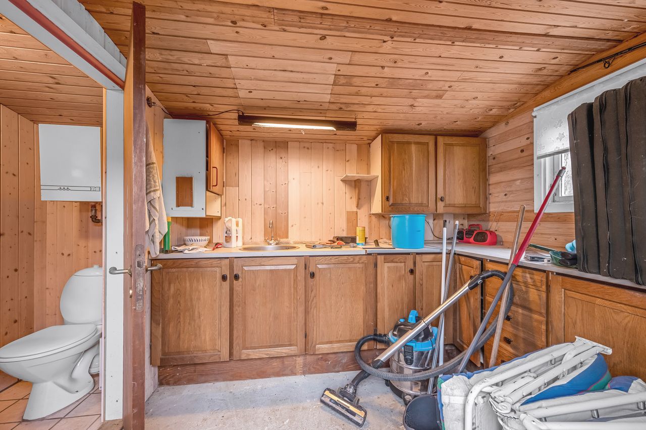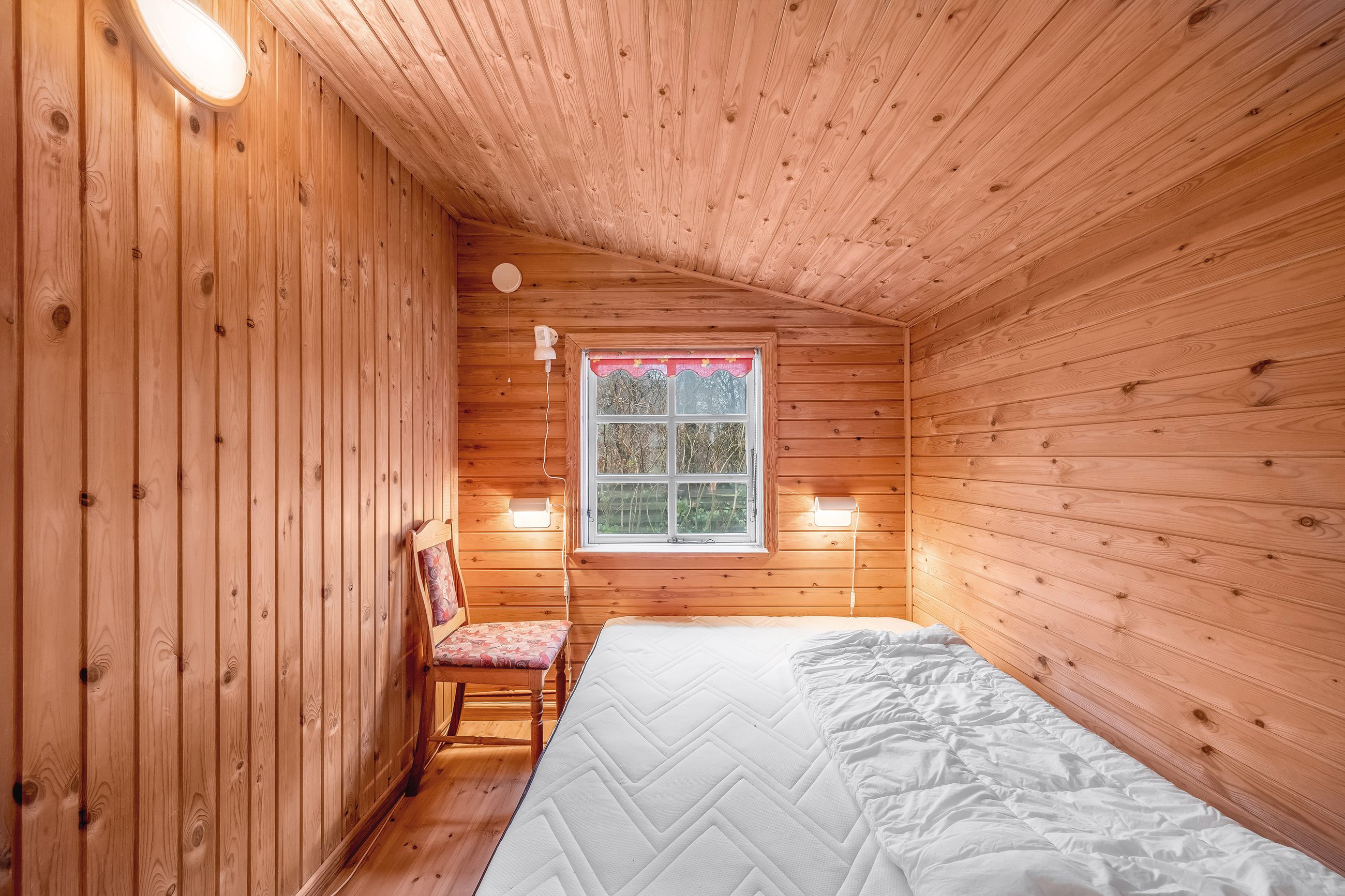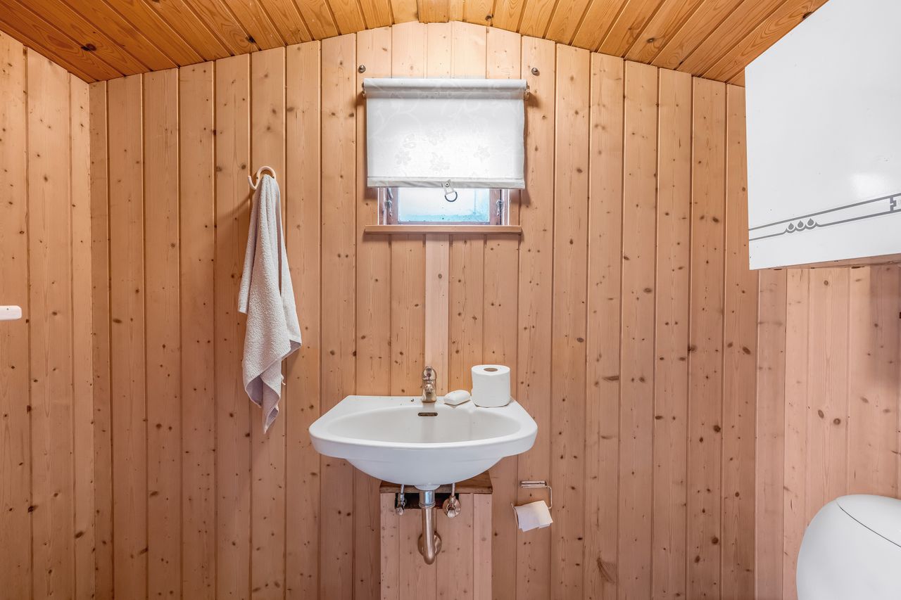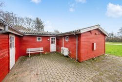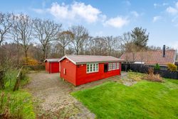 Ud over brændeovnen er der også en luft-til-luft varmepumpe i huset. Til huset hører endvidere et lille udhus.