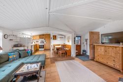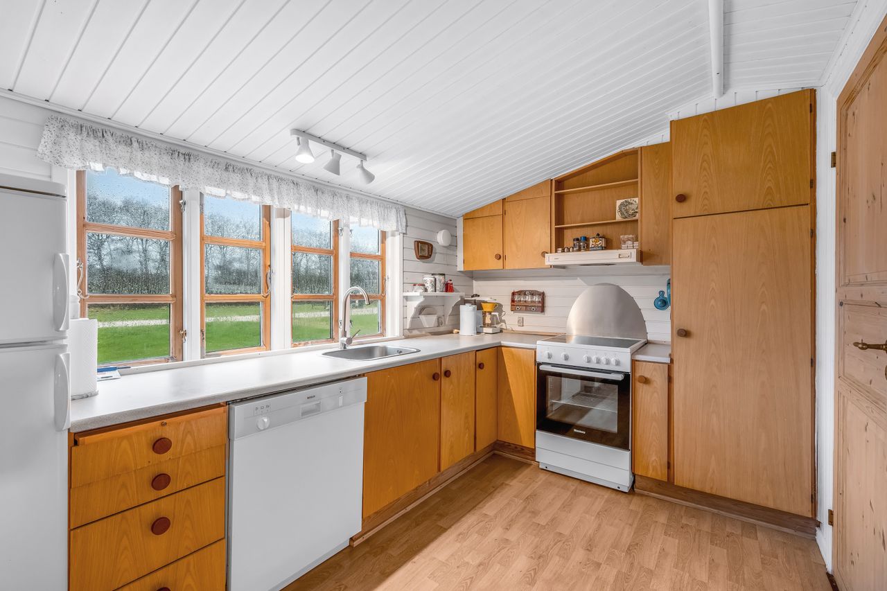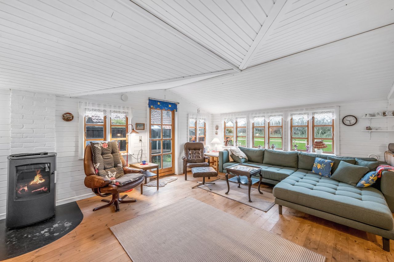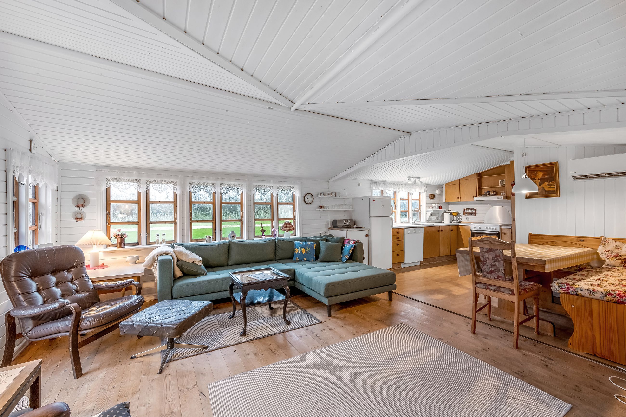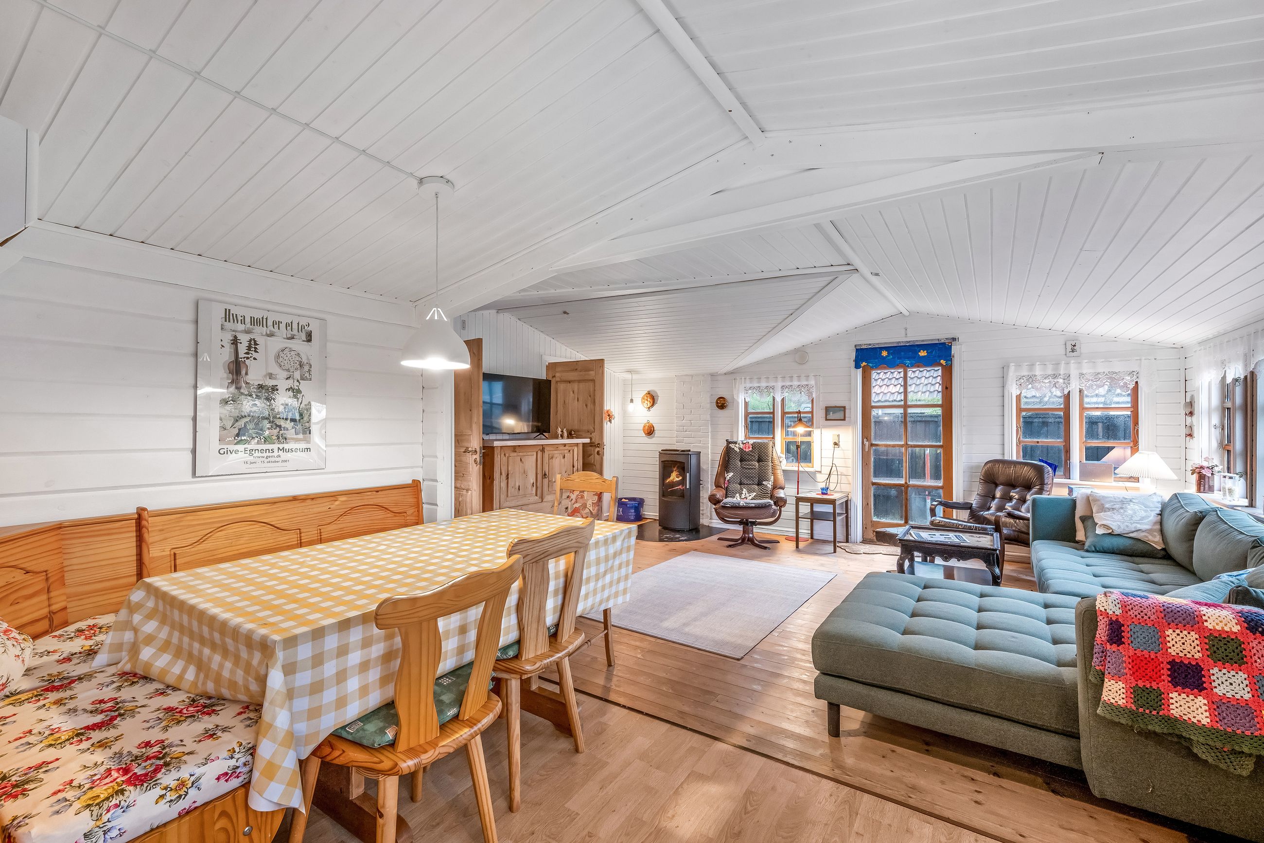 Huset har et stort åbent køkken/alrum og stue med brændeovn, som er installeret i 2023, to værelser samt et badeværelse med bruseniche.