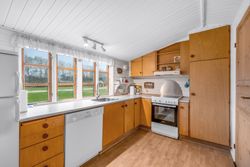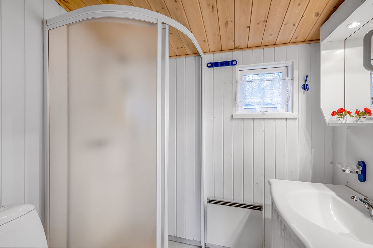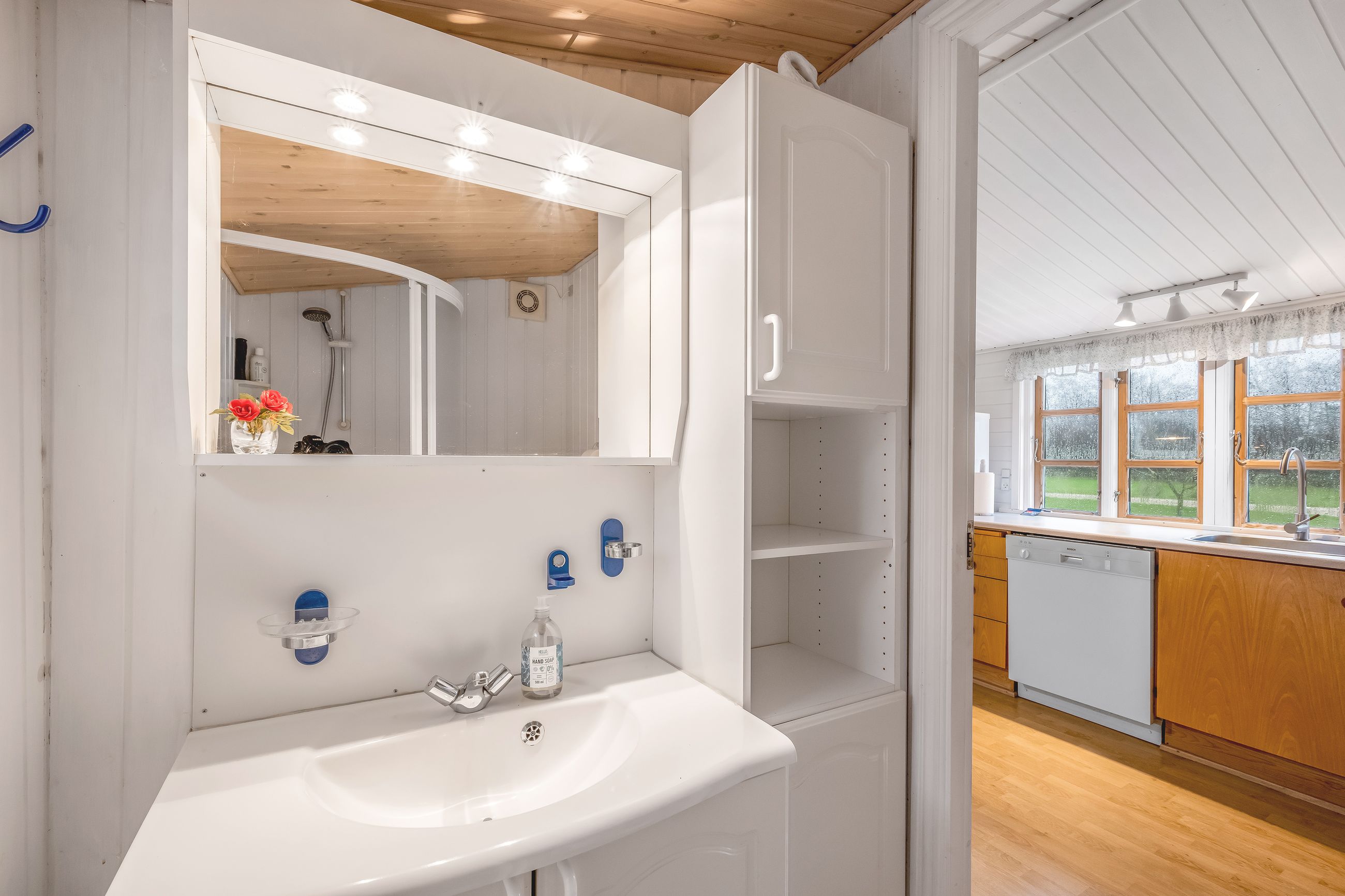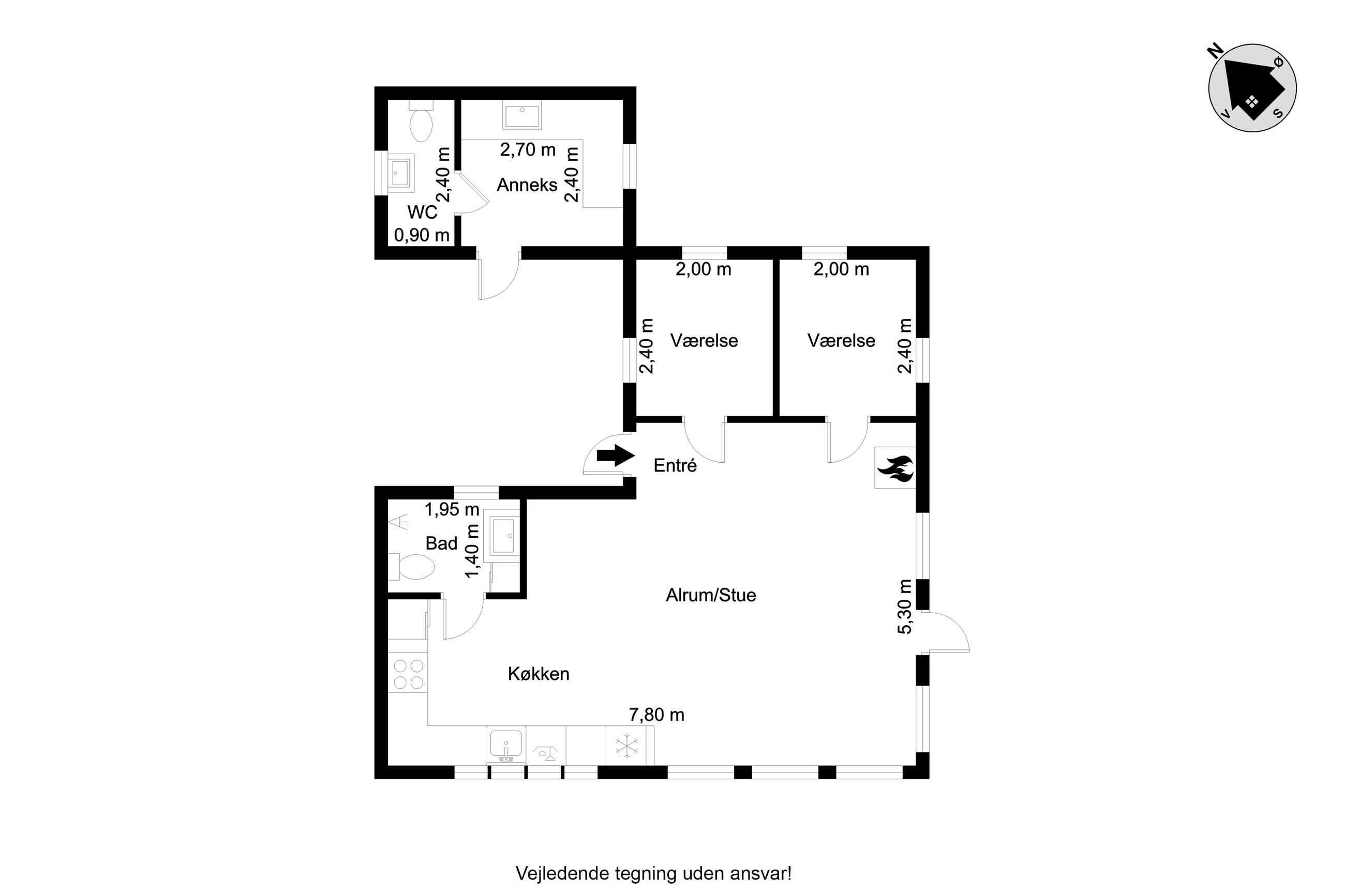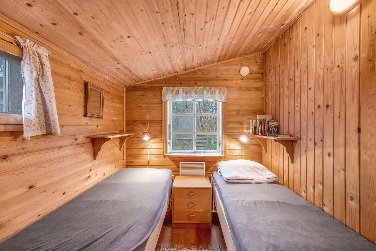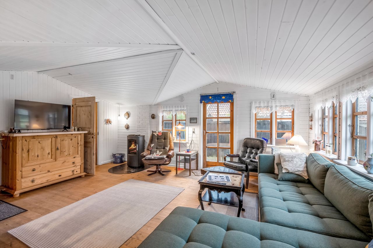 Huset har et stort åbent køkken/alrum og stue med brændeovn, som er installeret i 2023, to værelser samt et badeværelse med bruseniche.