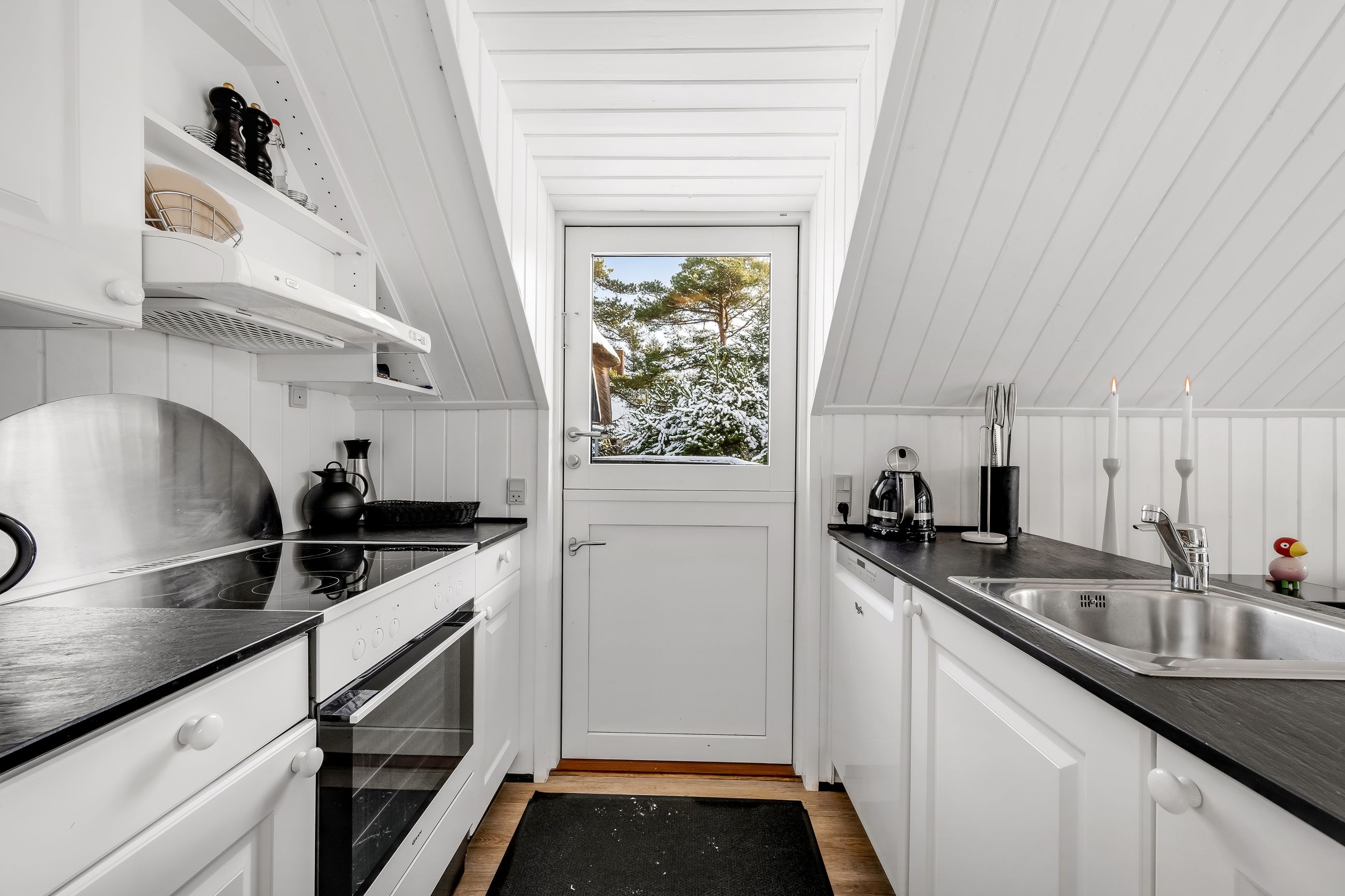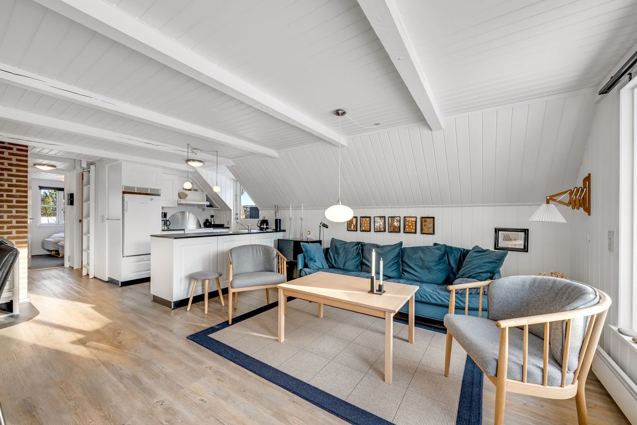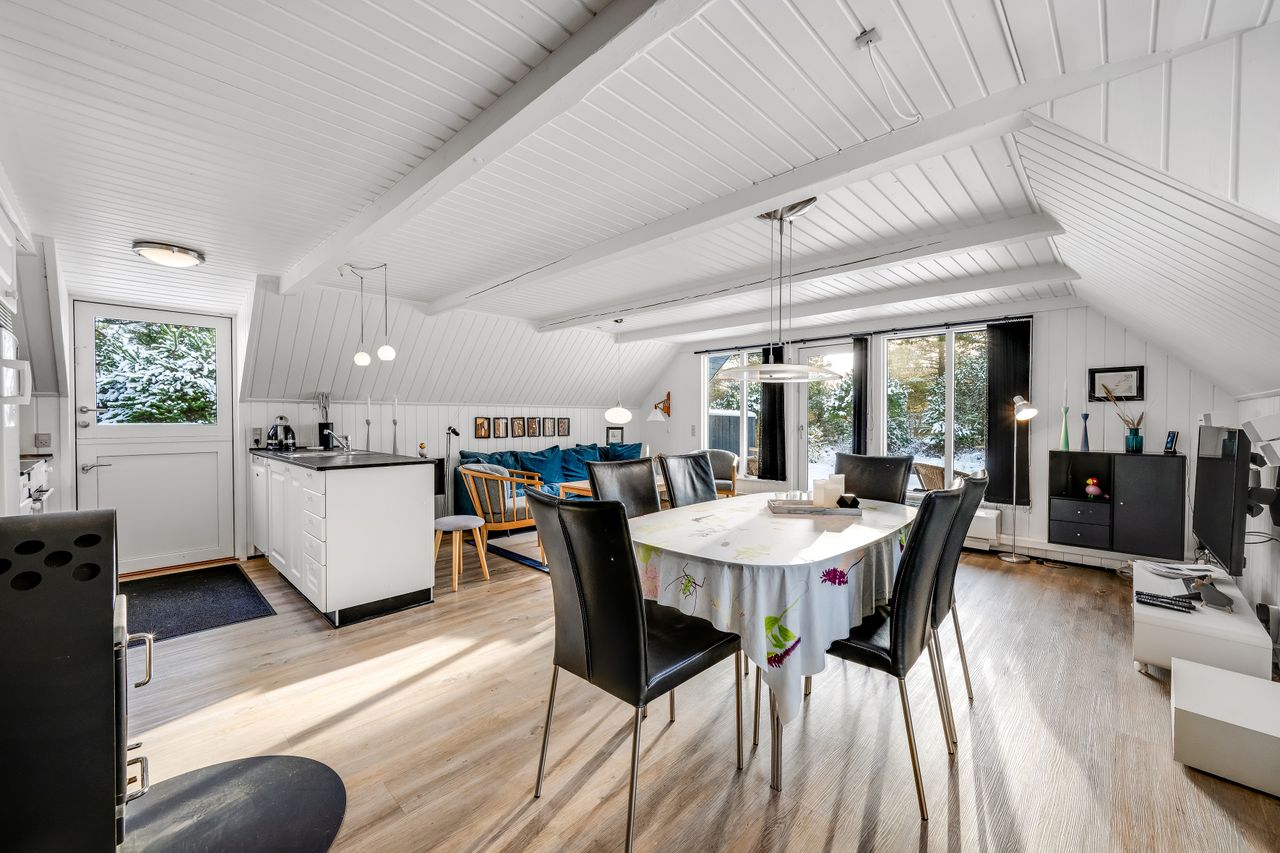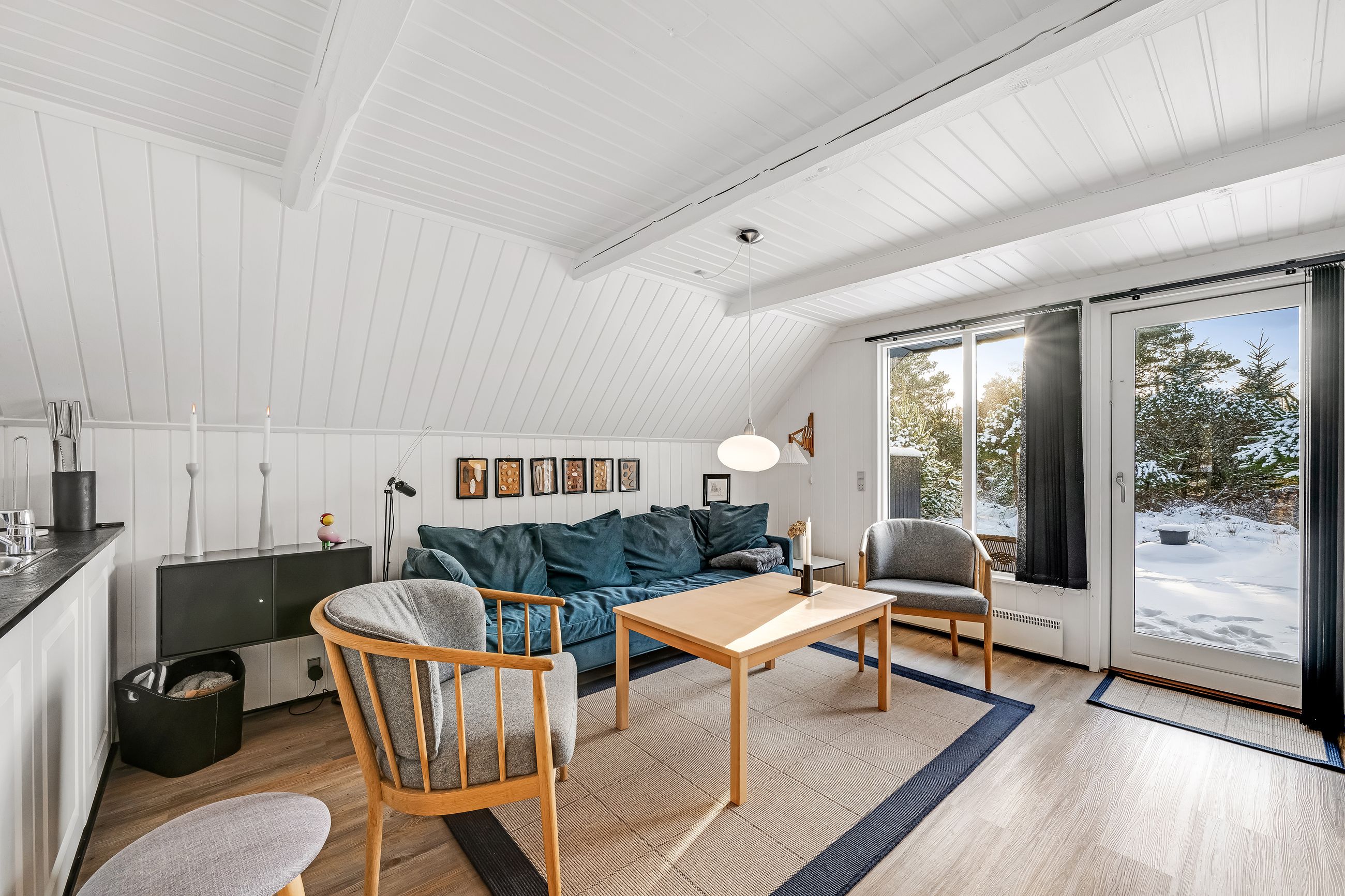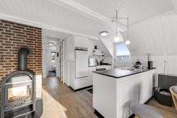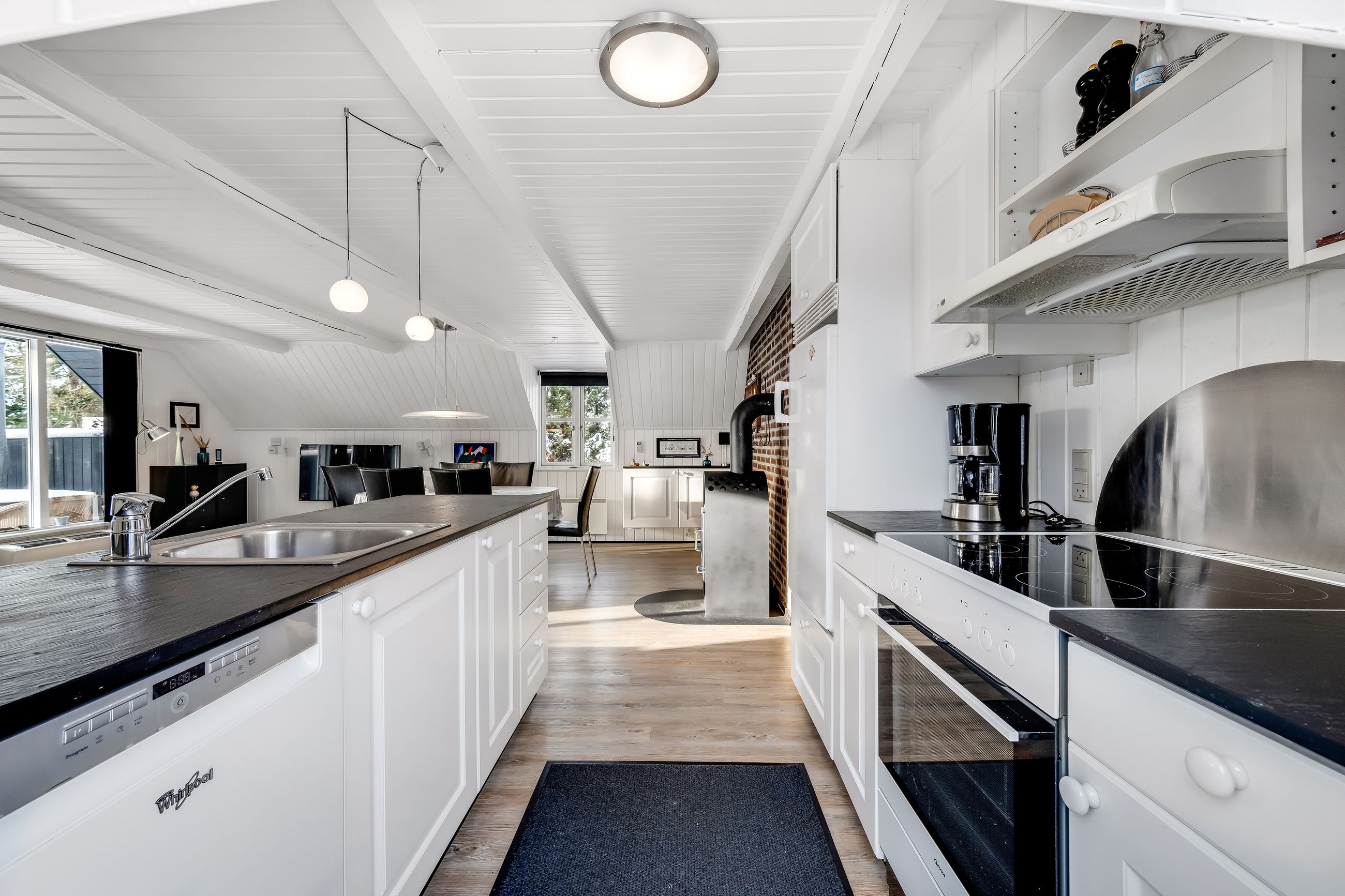 Selve sommerhuset tilgår man fra terrassen, hvor man så har et pænt og åbent køkken, der er holdt i hvide elementer. Der er komfur, emhætte, opvaskemaskine samt et køleskab med en frostboks. I tilknytning til køkkenet er der spiseplads samt en brændeovn med murstensvæg og muret skorsten. Pænt møbleret opholdsstue med sofa, tv-afdeling og varmepumpe.