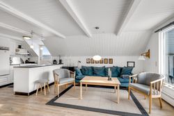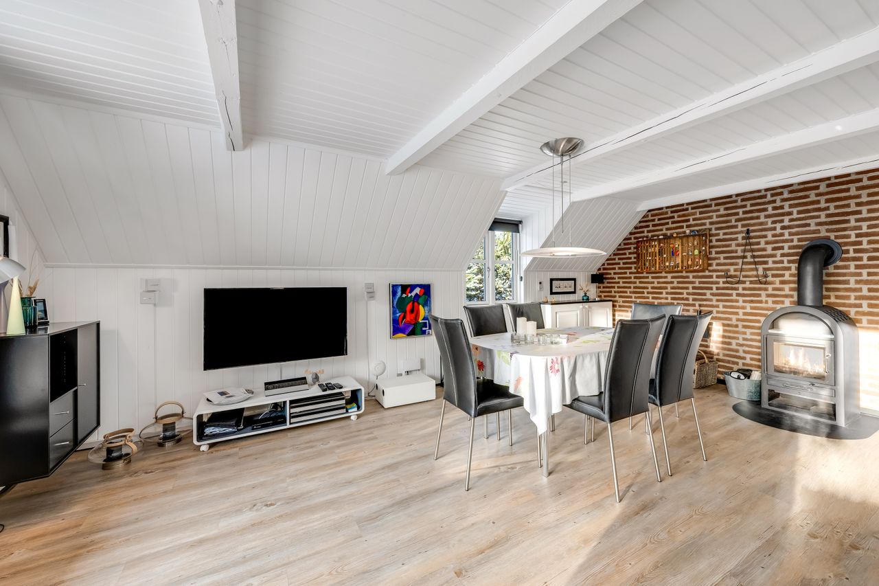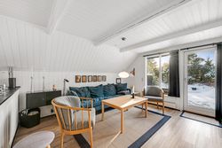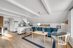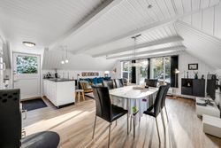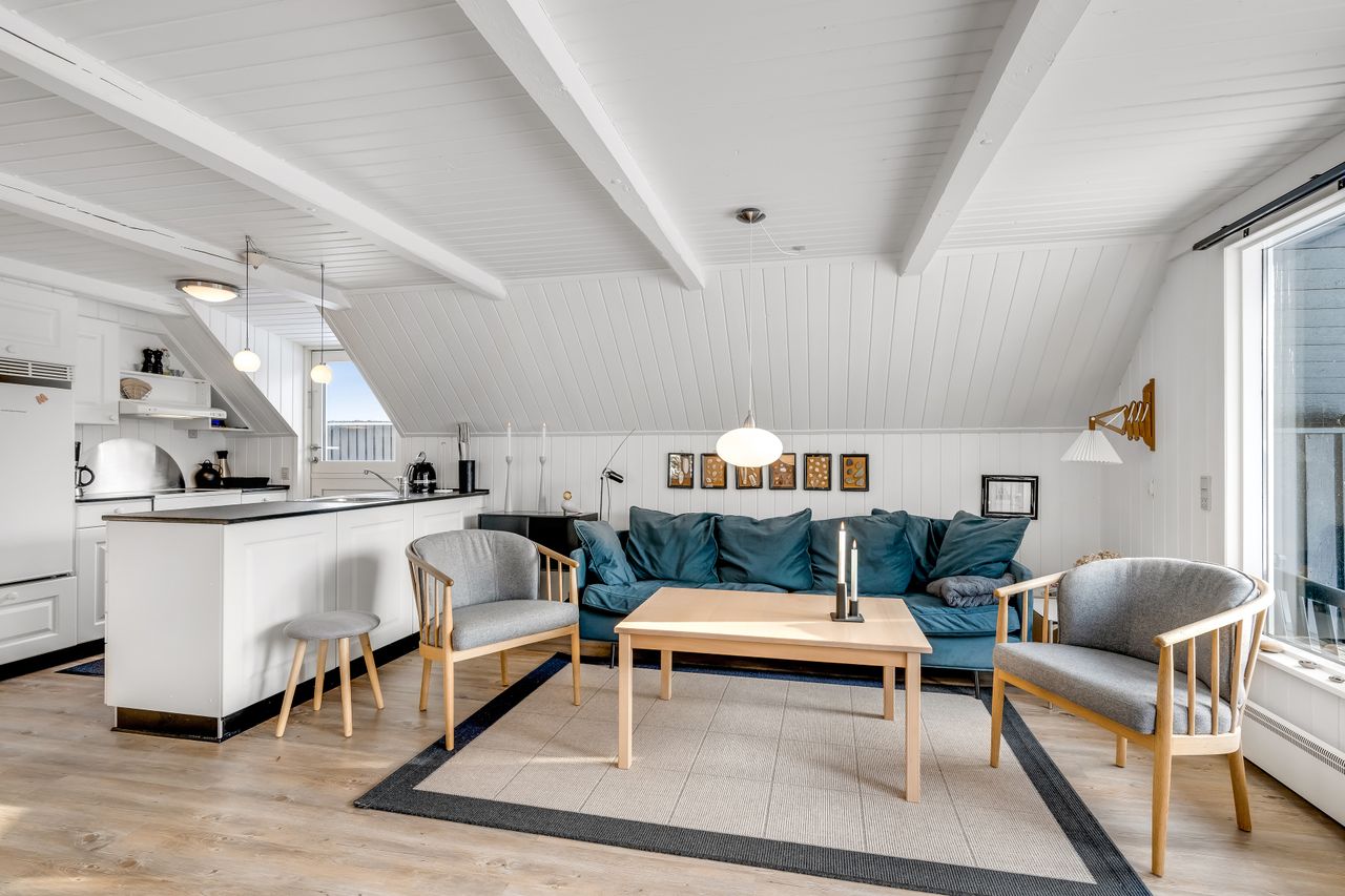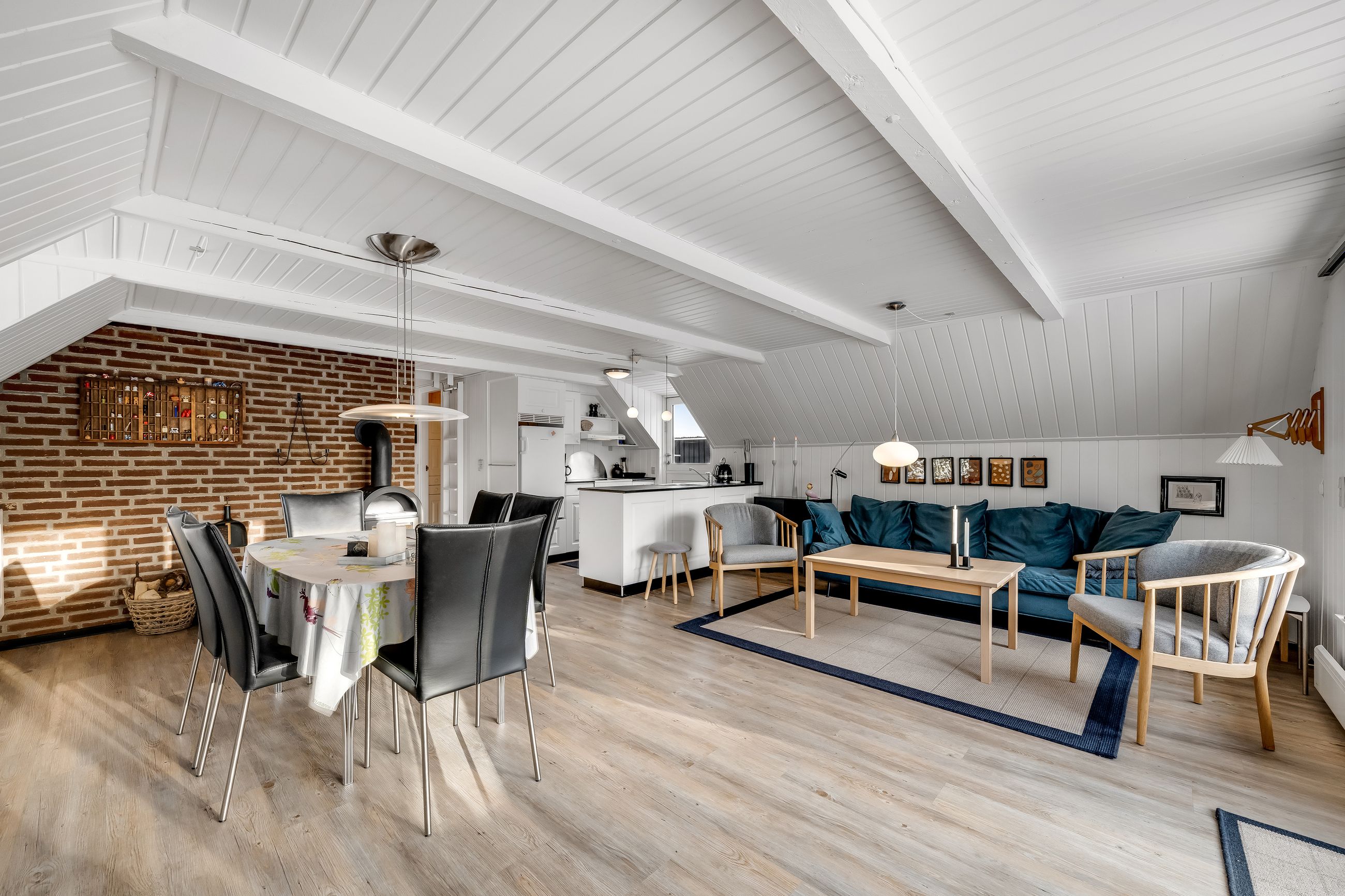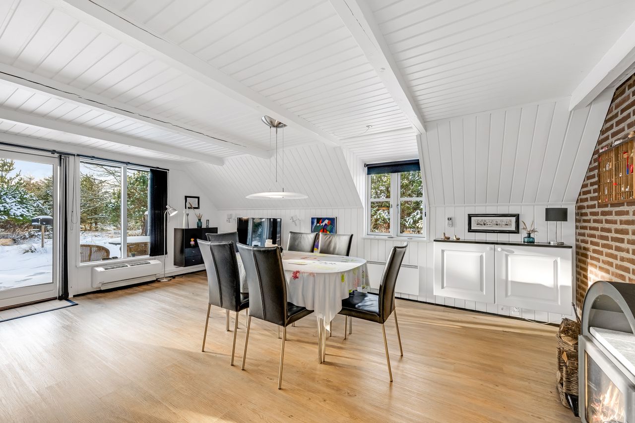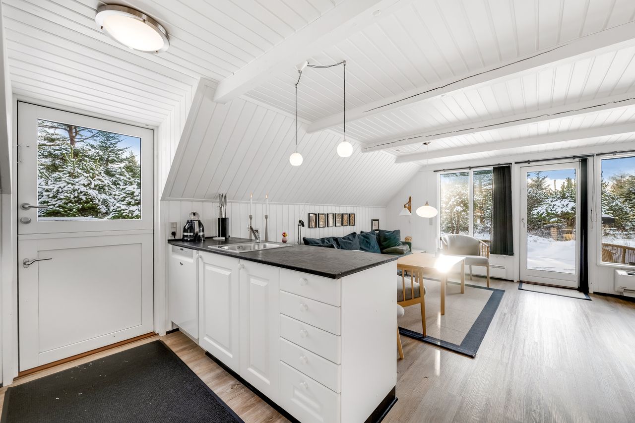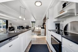 Selve sommerhuset tilgår man fra terrassen, hvor man så har et pænt og åbent køkken, der er holdt i hvide elementer. Der er komfur, emhætte, opvaskemaskine samt et køleskab med en frostboks. I tilknytning til køkkenet er der spiseplads samt en brændeovn med murstensvæg og muret skorsten. Pænt møbleret opholdsstue med sofa, tv-afdeling og varmepumpe.