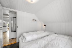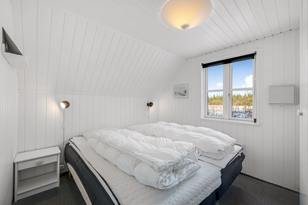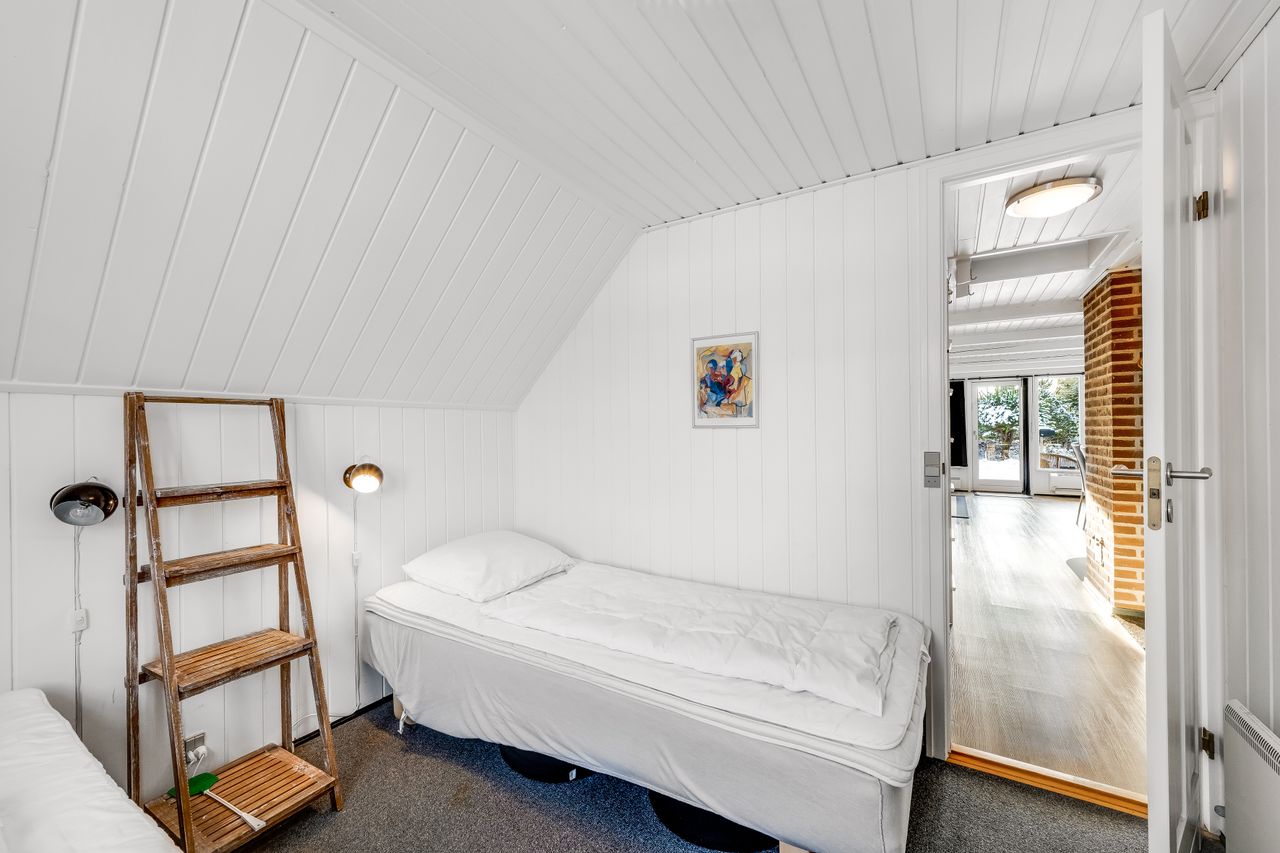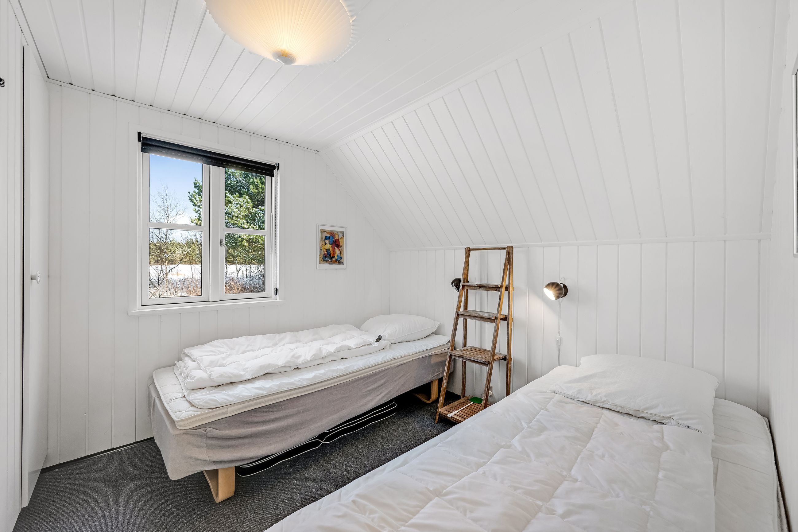 Huset har i alt tre værelser. De to er nærmest identiske, idet der dog i det ene af dem er en dobbeltseng og to indbyggede skabe, medens der i det andet er to enkelt senge og et indbygget skab. Desuden er der et fint ekstra værelse med en sovesofa samt et indbygget skab. Over værelser og med adgang fra gangen er der en lille hems/tagetage på 10 kvadratmeter.