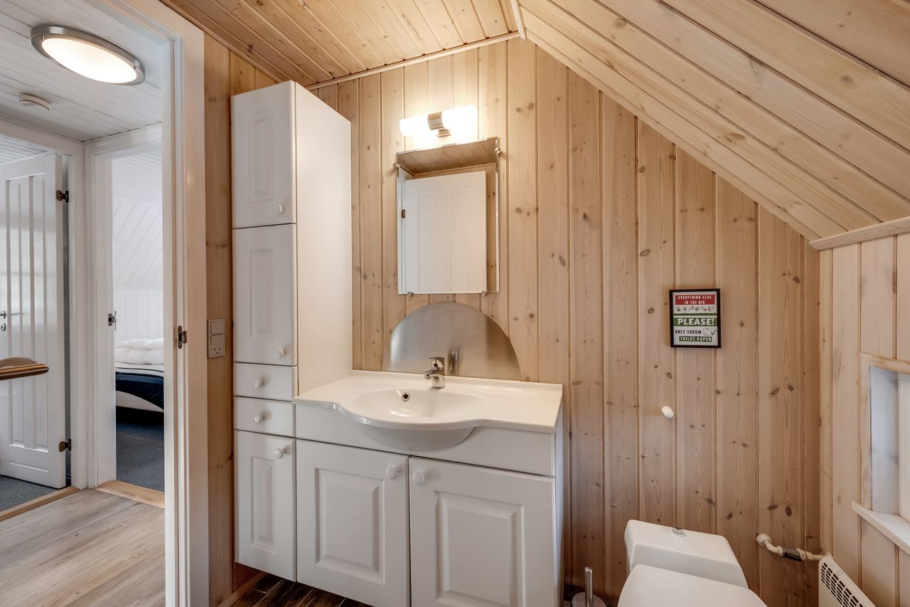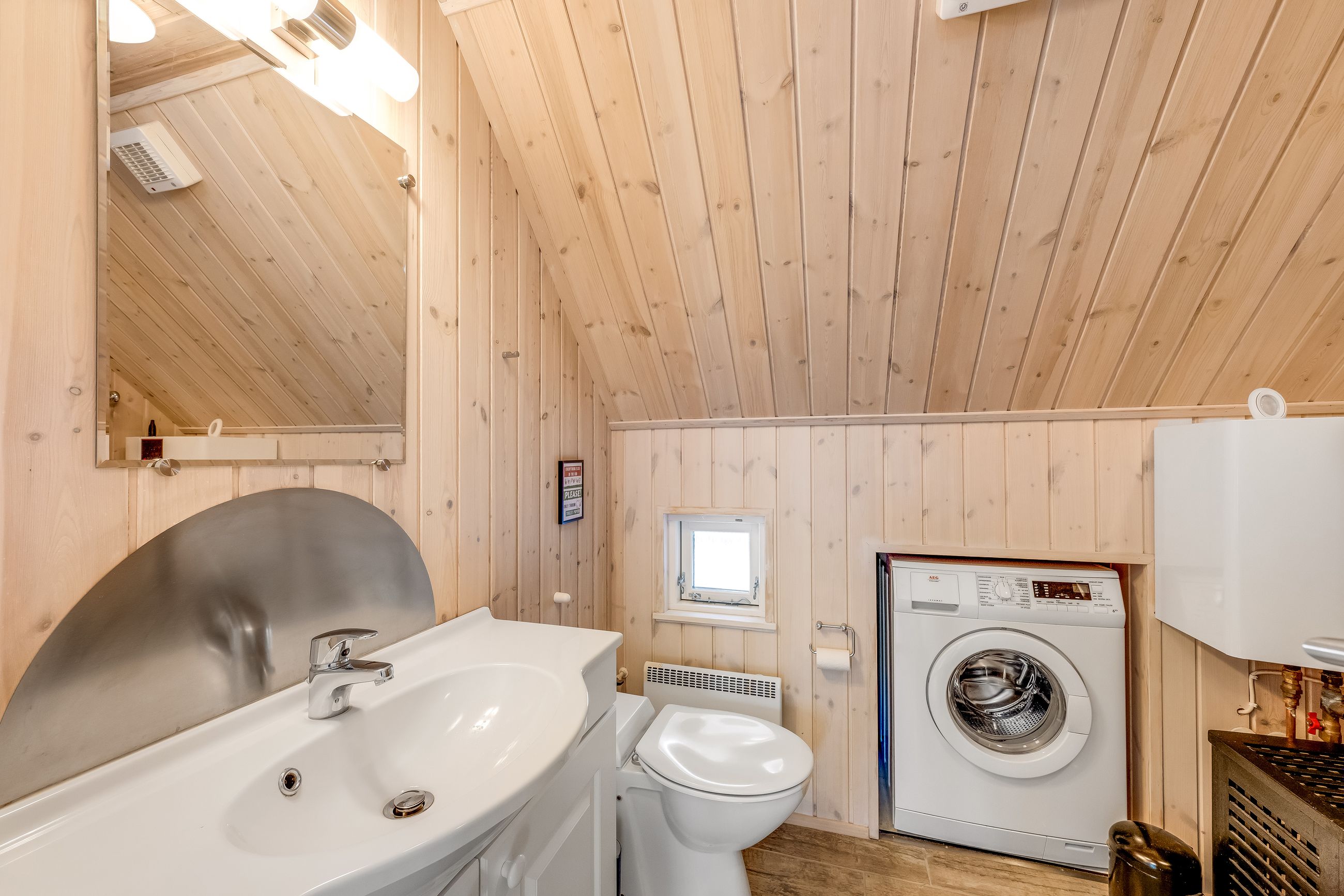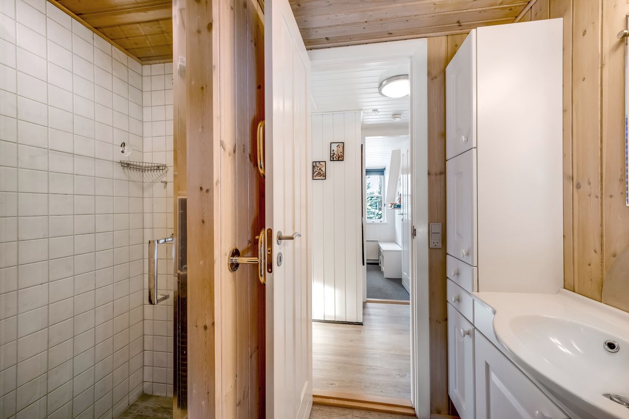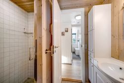 Huset har et pænt badeværelse, hvor der er med en sindrig løsning også er gjort plads til vaskemaskinen. Badeværelset har pæne gulvfliser med gulvvarme og en rummelig bruseniche med en glasvæg.