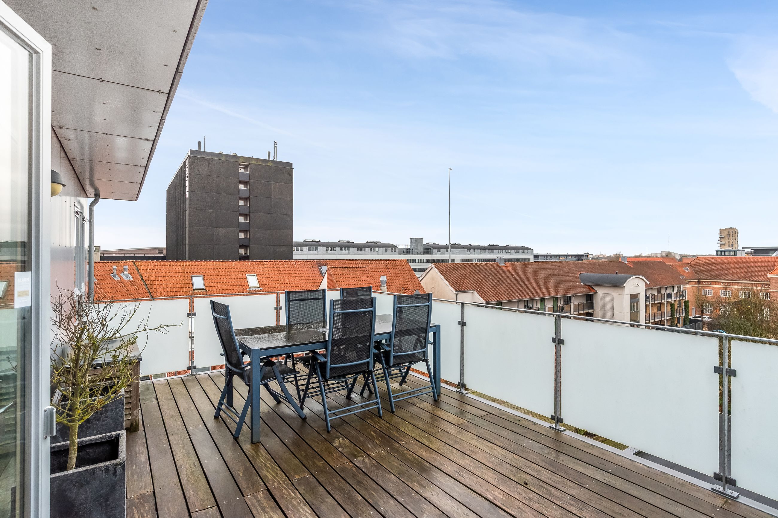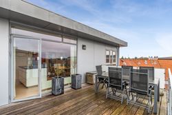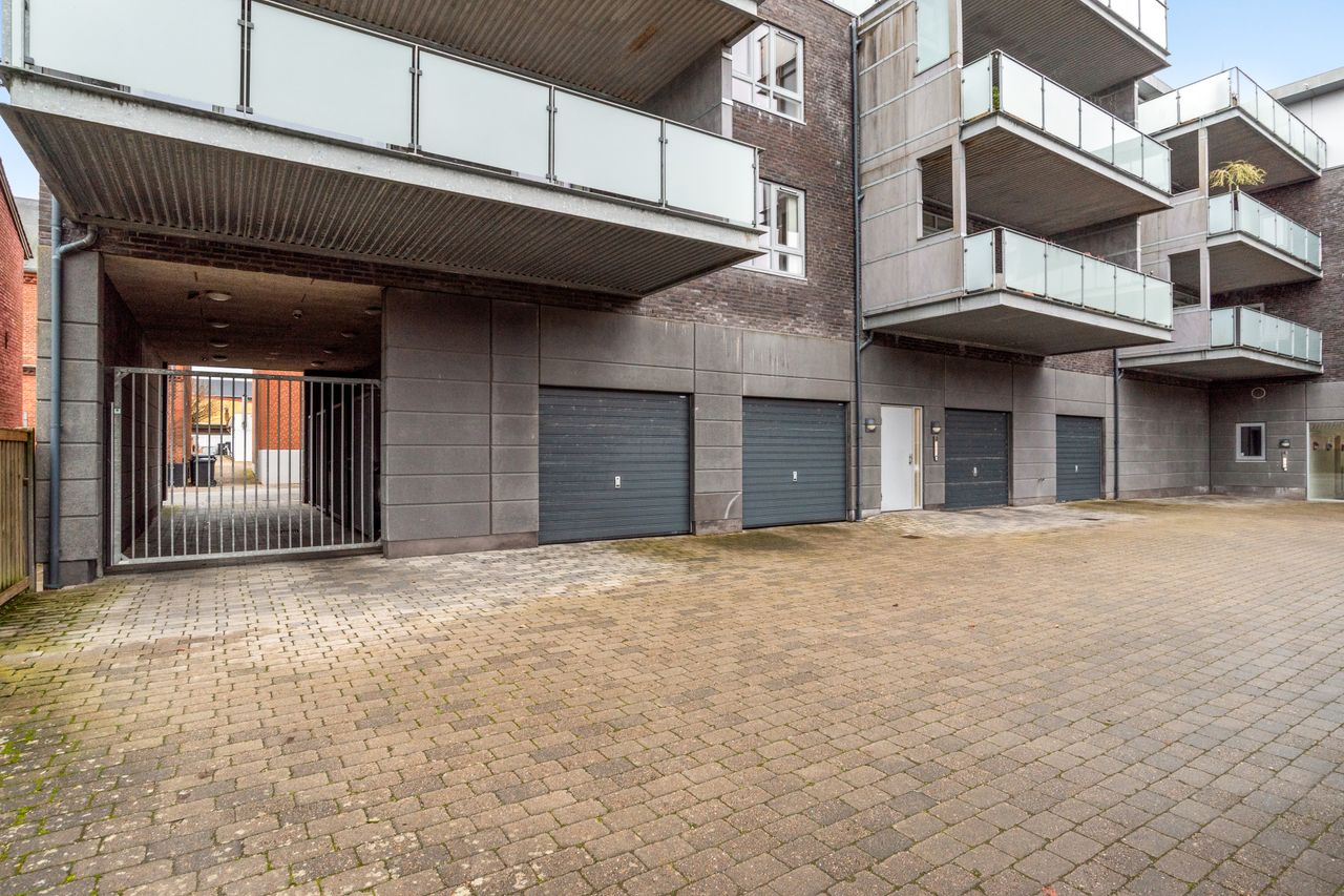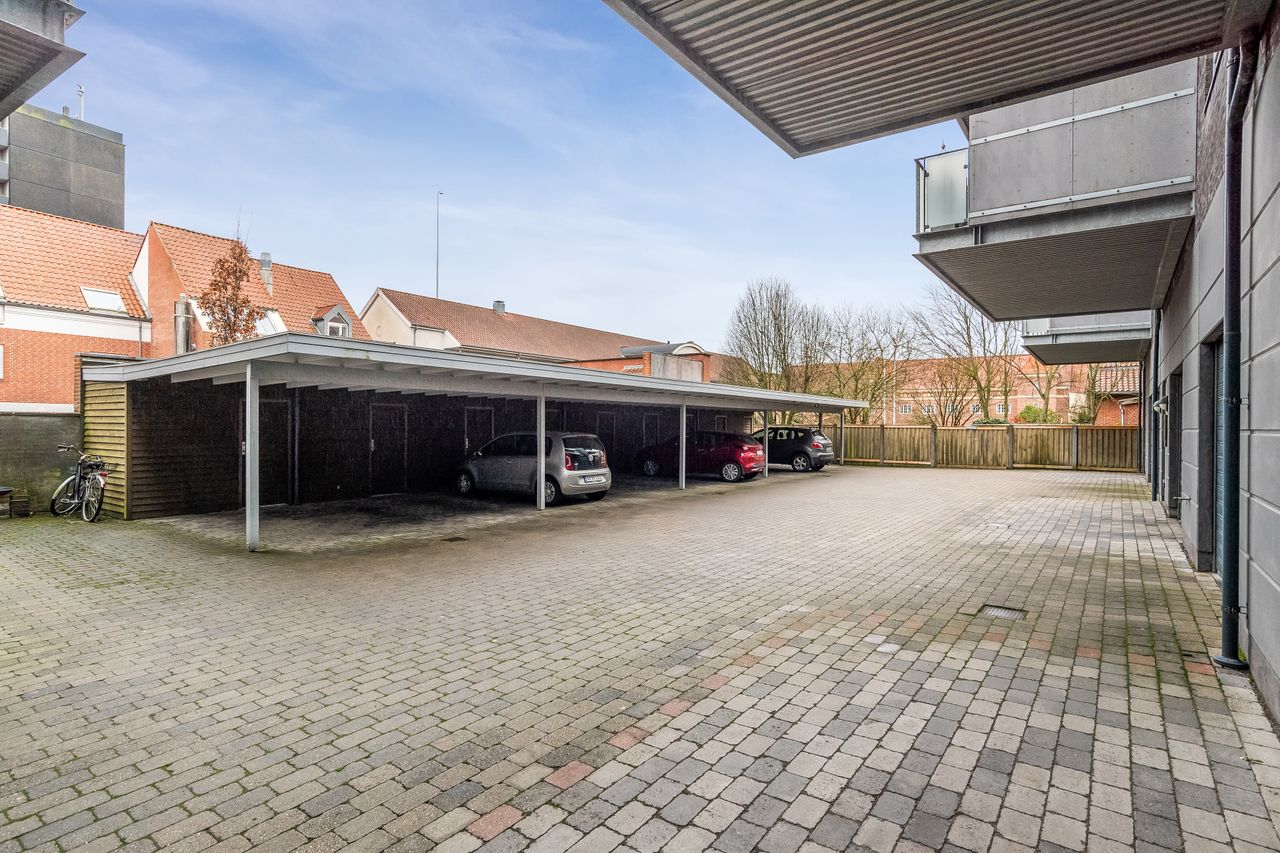 Ejendommen byder også på en pæn trappeopgang med elevator direkte til din etage – nemt når du kommer hjem fra shoppingturen eller har hænderne fulde. Som noget helt særligt har ejendommen også en tilknyttet gæstelejlighed komplet med badeværelse og thekøkken, perfekt når familie eller venner kommer på besøg. Til lejligheden er der egen overdækket parkering i aflåst gård med elport samt eget udhus til opbevaring.
