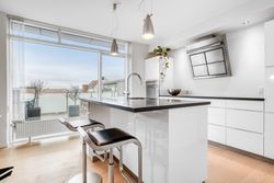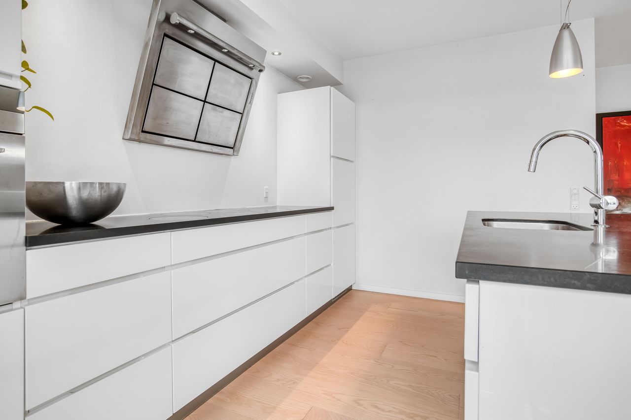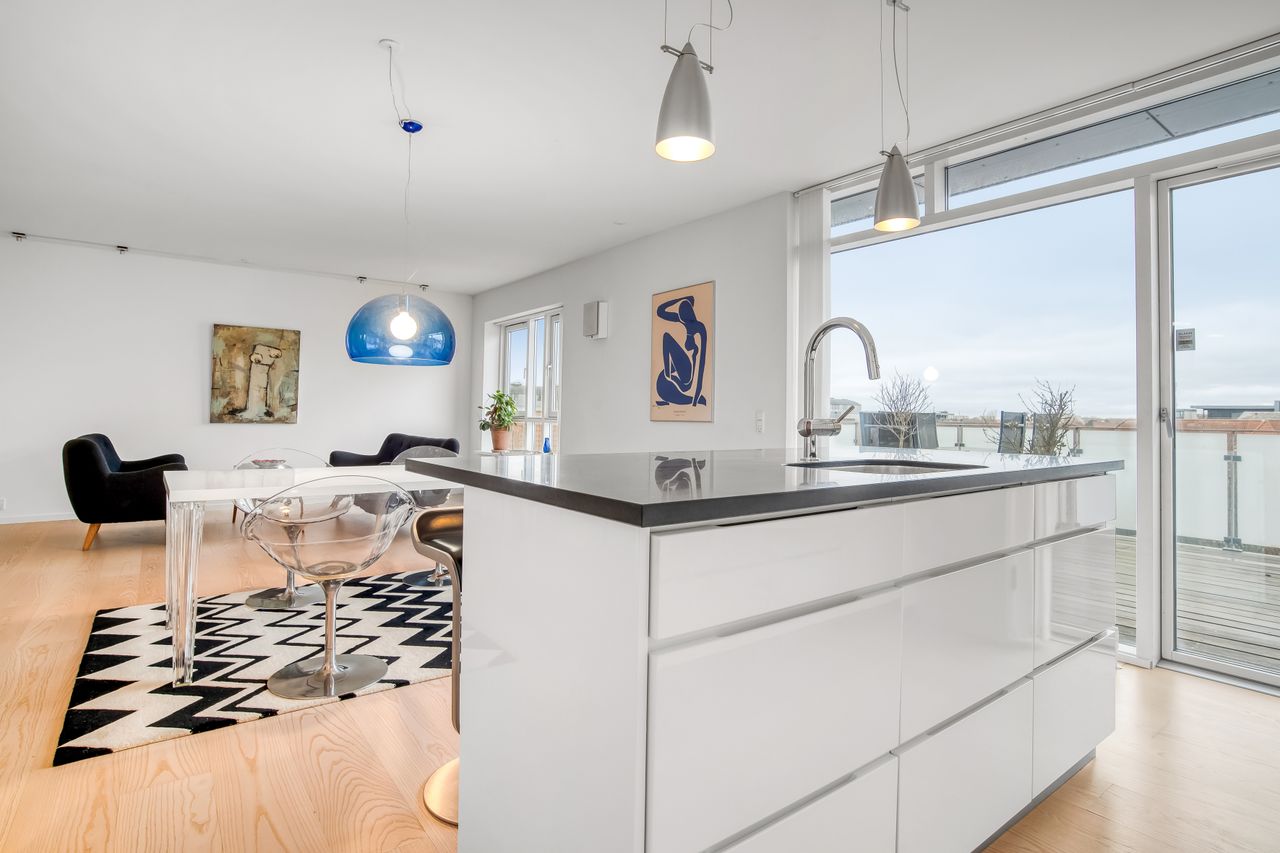 Når du træder ind i lejligheden, bliver du mødt af et åbent køkken/alrum/stue-område, der skaber en lys og rummelig atmosfære. Det moderne køkken er ideelt for både den passionerede kok og dem, der nyder hyggelige middage med venner og familie. Køkkenet giver direkte adgang til en stor sydvestvendt altan – det perfekte sted at nyde morgenkaffen eller slappe af efter en lang dag.