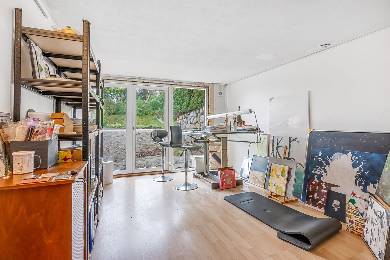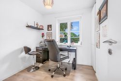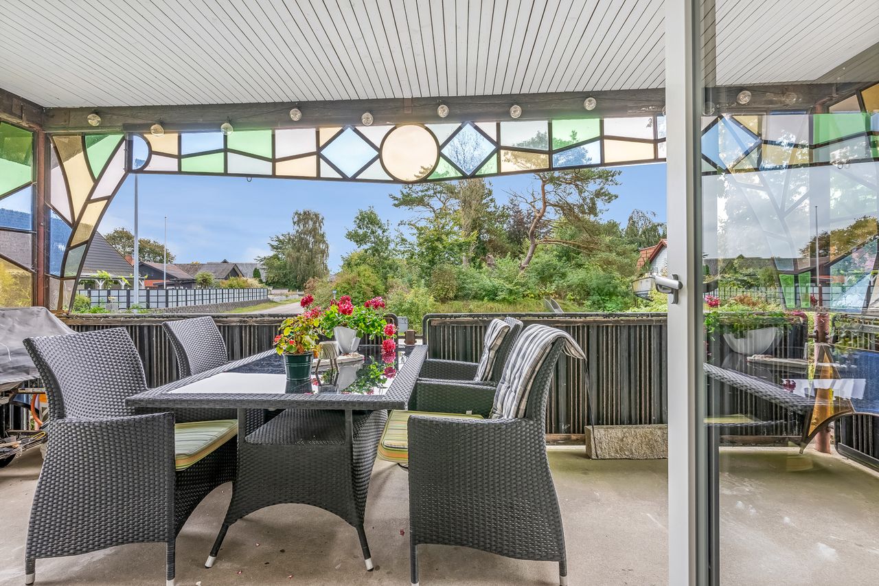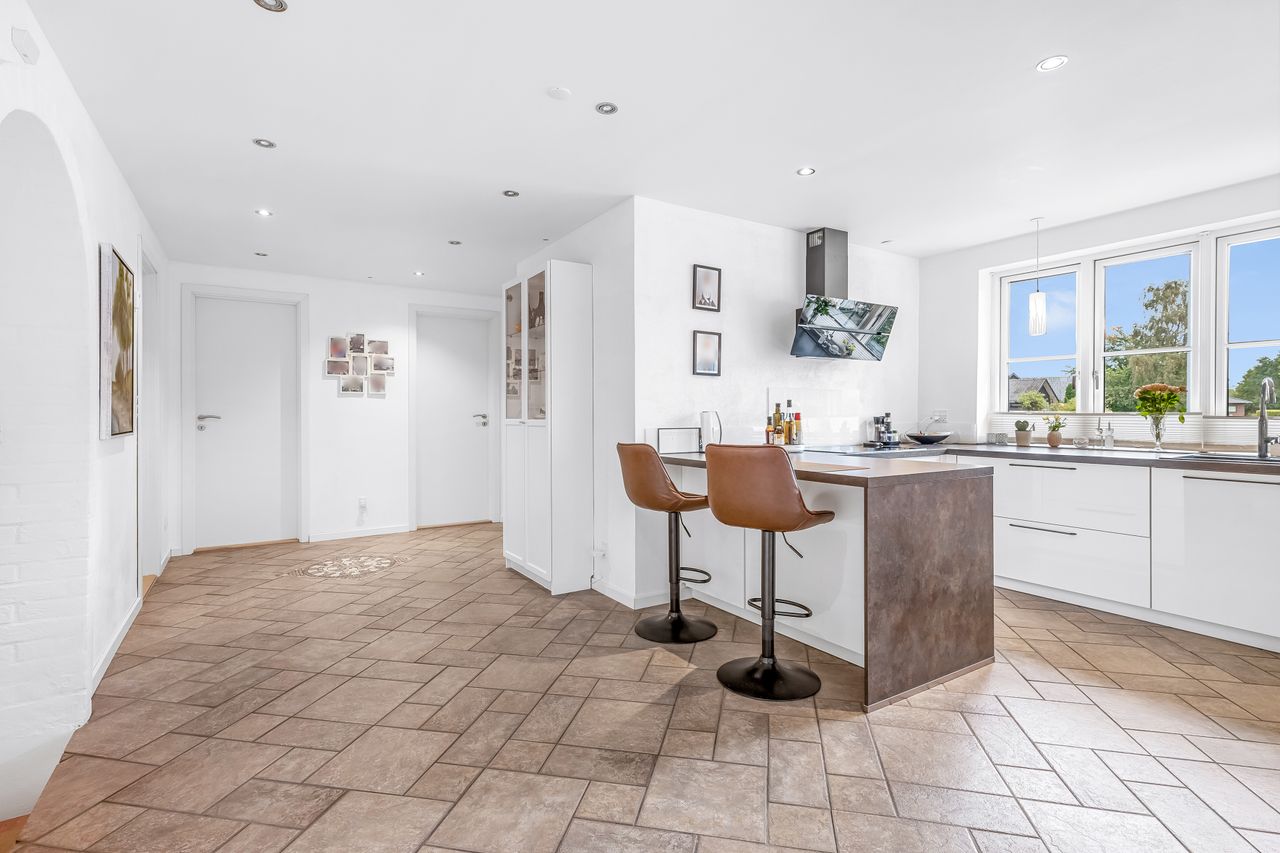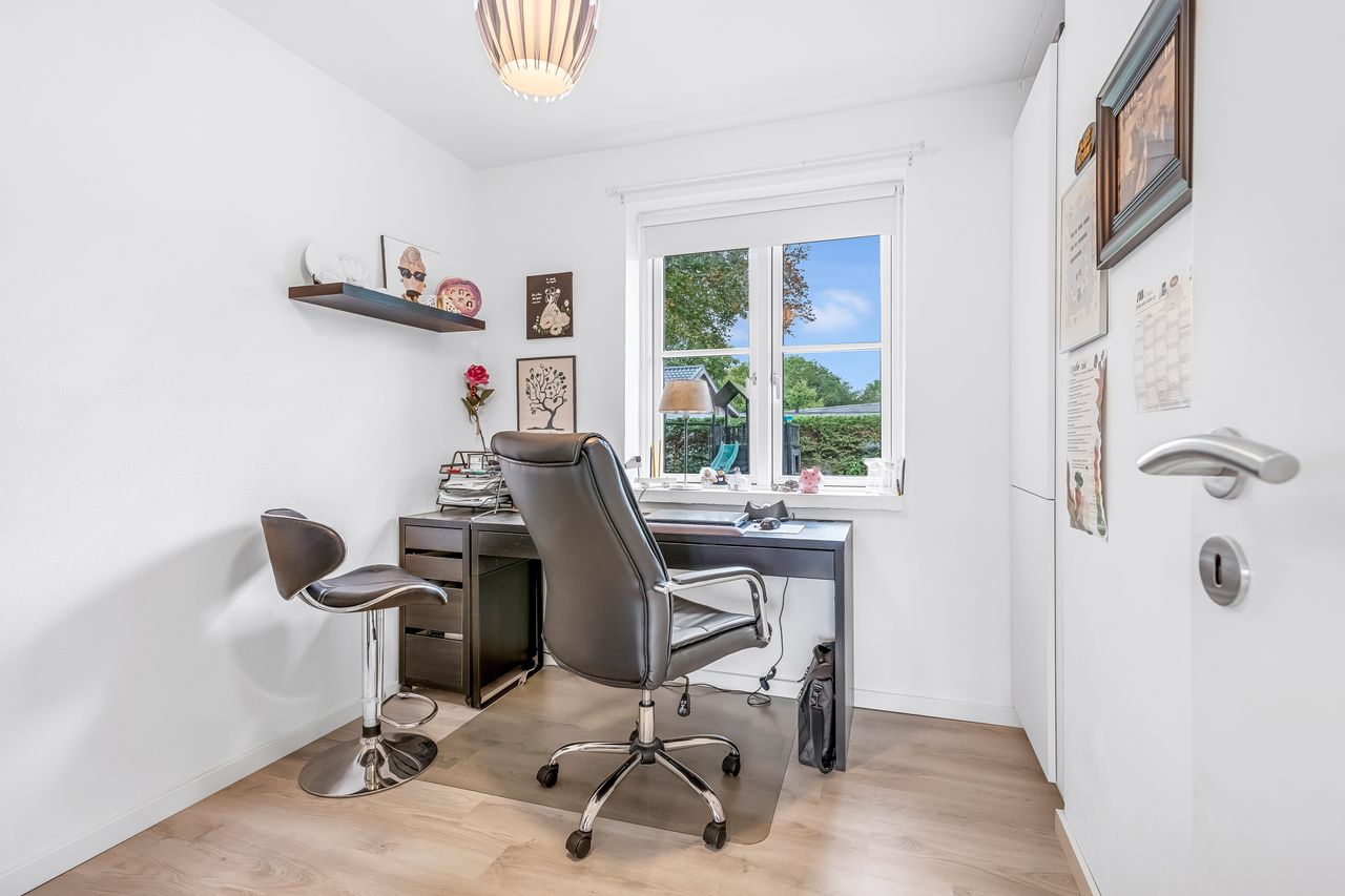 Indenfor mødes du af en lys og venlig atmosfære med gulvvarme i flere rum, der bidrager til den behagelige boligoplevelse. Planløsningen omfatter en entré/bryggers, et flot nyere køkken fra 2019, to gode værelser samt et stort badeværelse. Derudover finder du et kontor perfekt til hjemmearbejde eller studier. Den store lyse stue/alrum er husets hjerte; her er der rigelig plads til både spisebord og sofaafdeling. Fra stuen er der direkte adgang til en overdækket terrasse – ideel til hyggelige stunder uanset vejret.