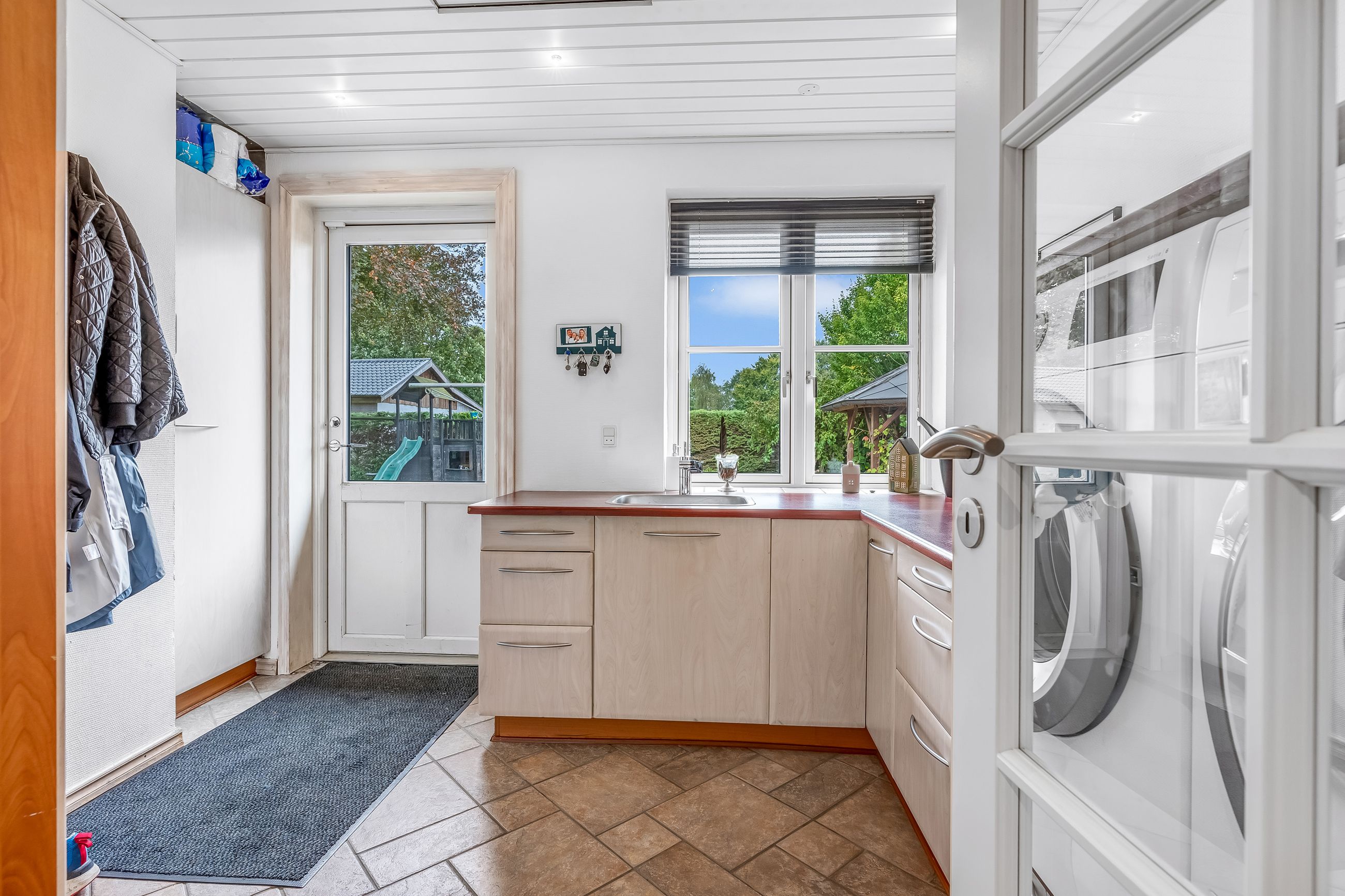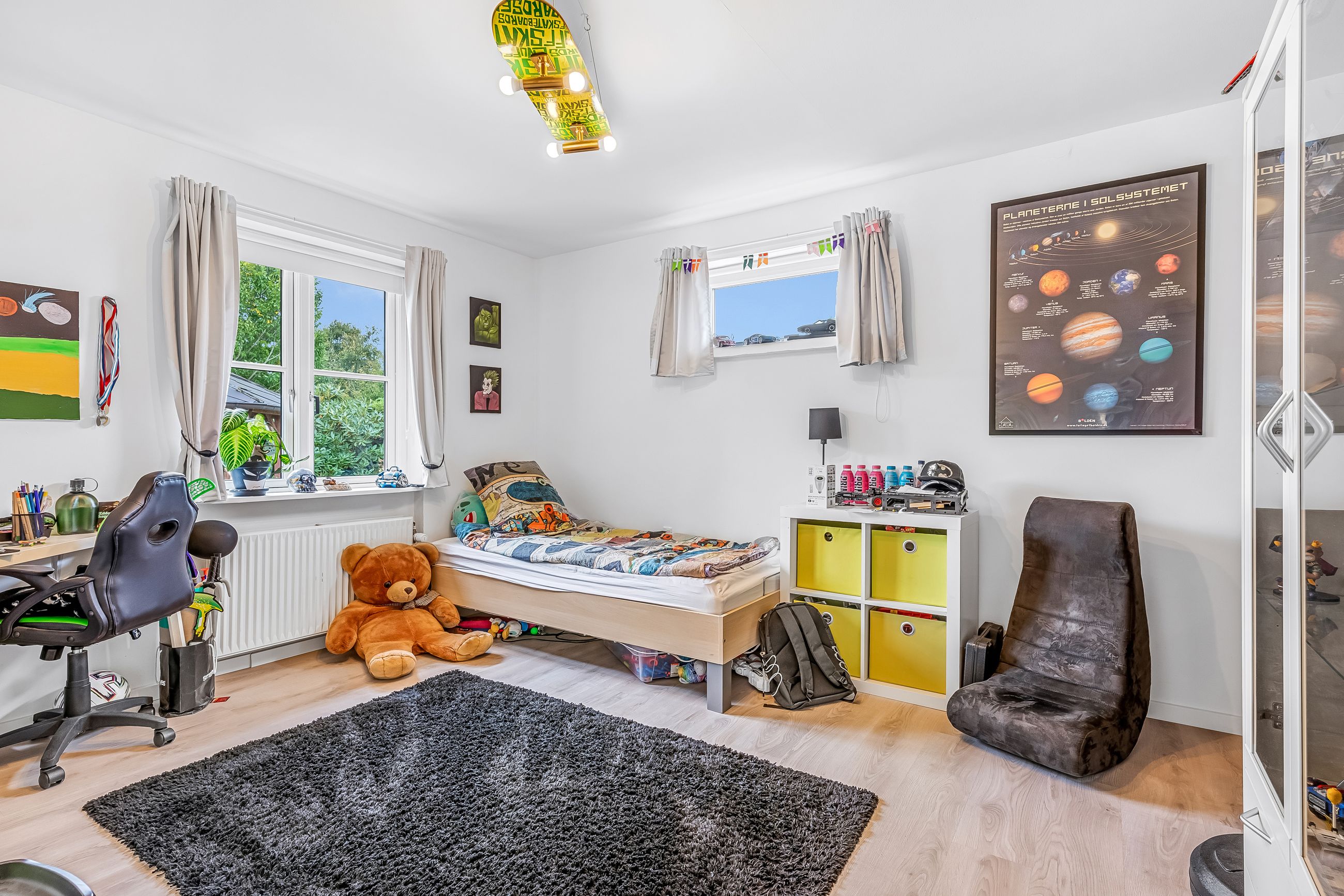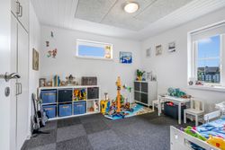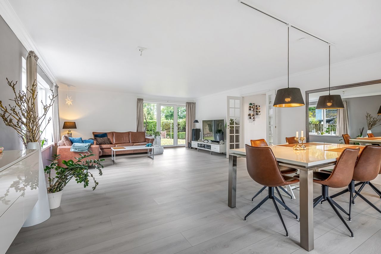 Indenfor mødes du af en lys og venlig atmosfære med gulvvarme i flere rum, der bidrager til den behagelige boligoplevelse. Planløsningen omfatter en entré/bryggers, et flot nyere køkken fra 2019, to gode værelser samt et stort badeværelse. Derudover finder du et kontor perfekt til hjemmearbejde eller studier. Den store lyse stue/alrum er husets hjerte; her er der rigelig plads til både spisebord og sofaafdeling. Fra stuen er der direkte adgang til en overdækket terrasse – ideel til hyggelige stunder uanset vejret.