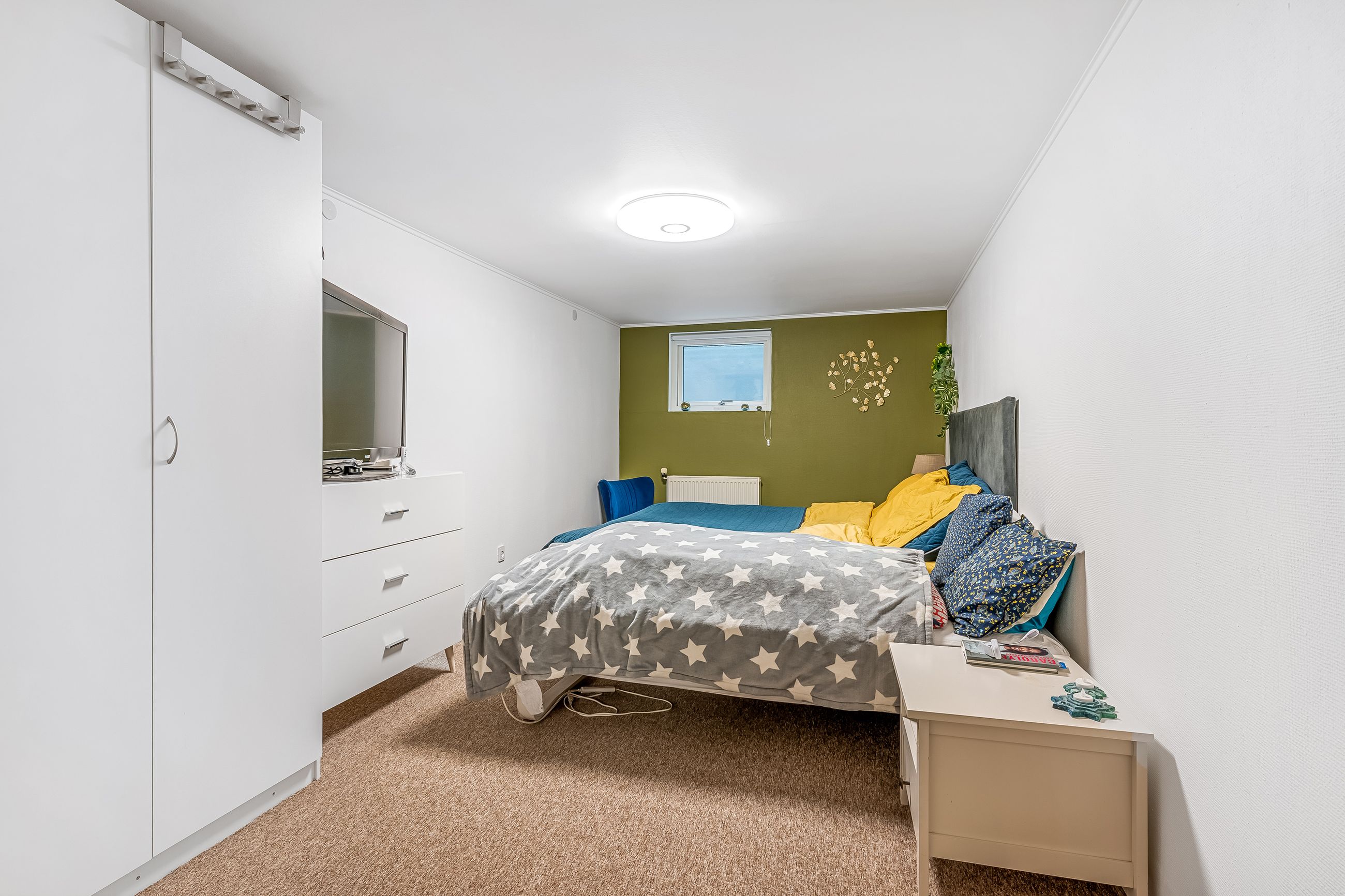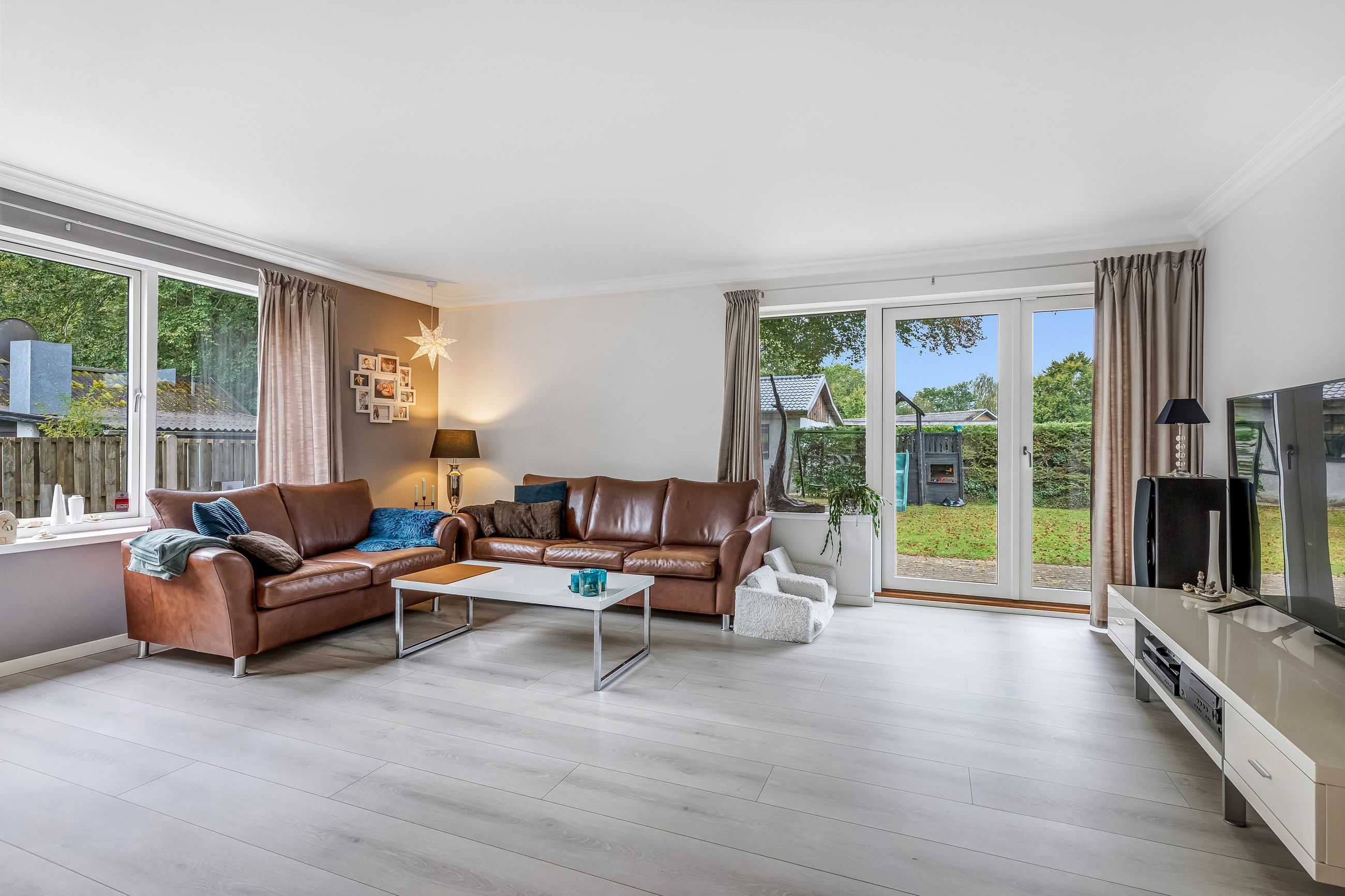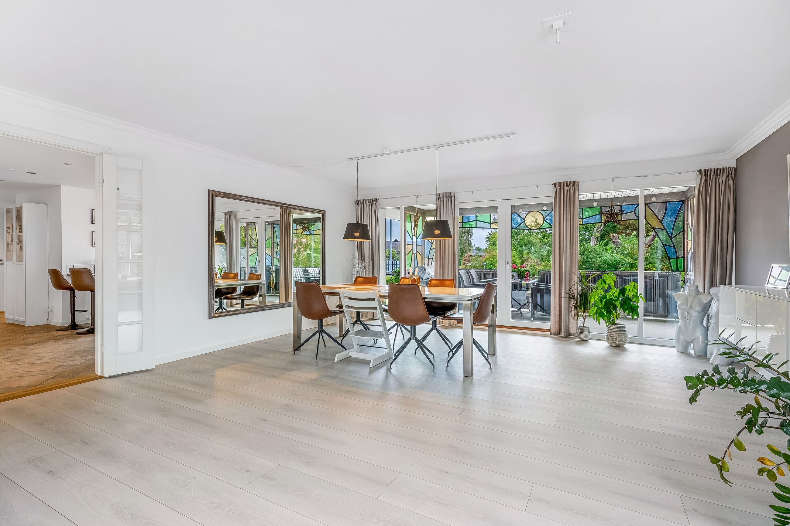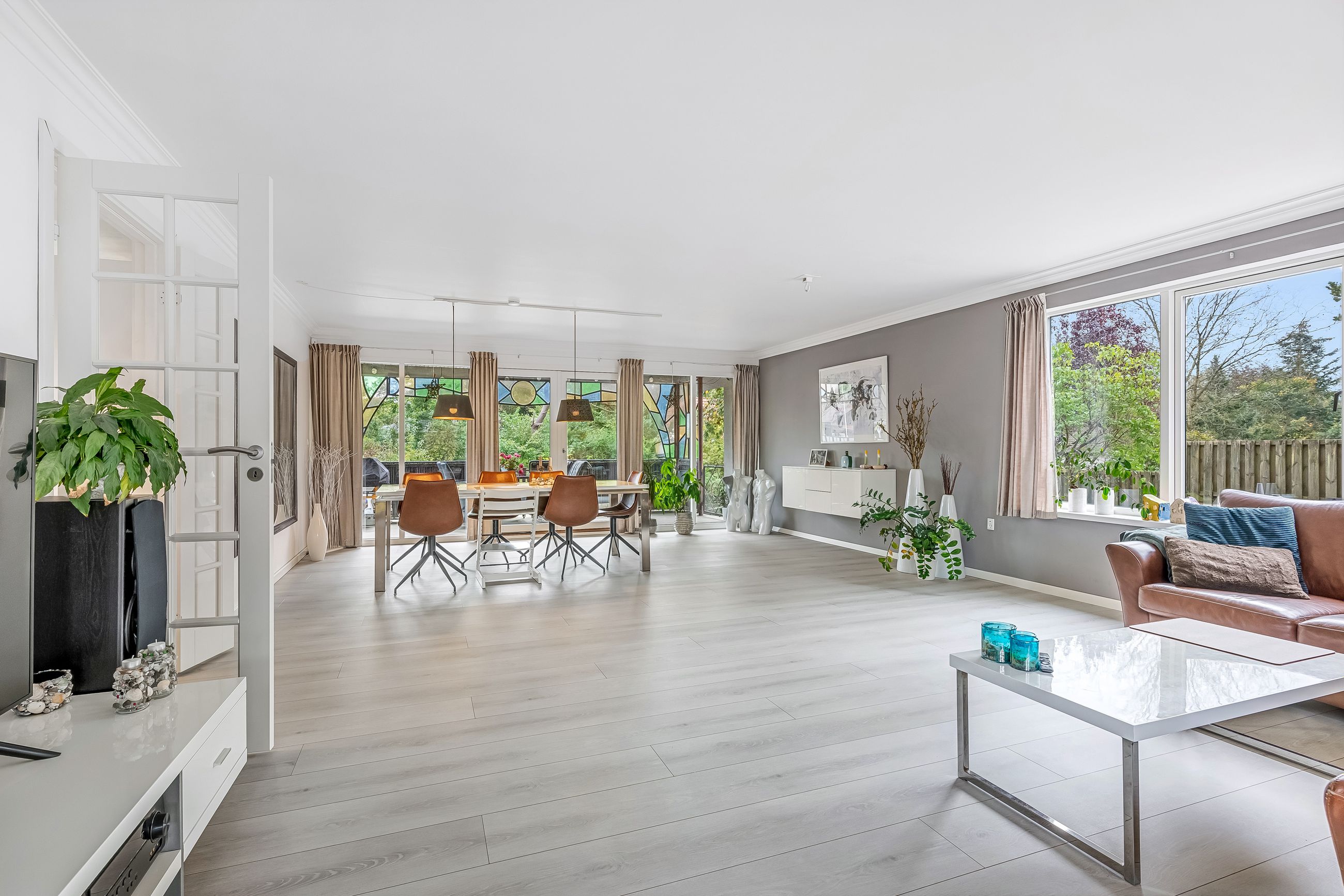 Indenfor mødes du af en lys og venlig atmosfære med gulvvarme i flere rum, der bidrager til den behagelige boligoplevelse. Planløsningen omfatter en entré/bryggers, et flot nyere køkken fra 2019, to gode værelser samt et stort badeværelse. Derudover finder du et kontor perfekt til hjemmearbejde eller studier. Den store lyse stue/alrum er husets hjerte; her er der rigelig plads til både spisebord og sofaafdeling. Fra stuen er der direkte adgang til en overdækket terrasse – ideel til hyggelige stunder uanset vejret.
