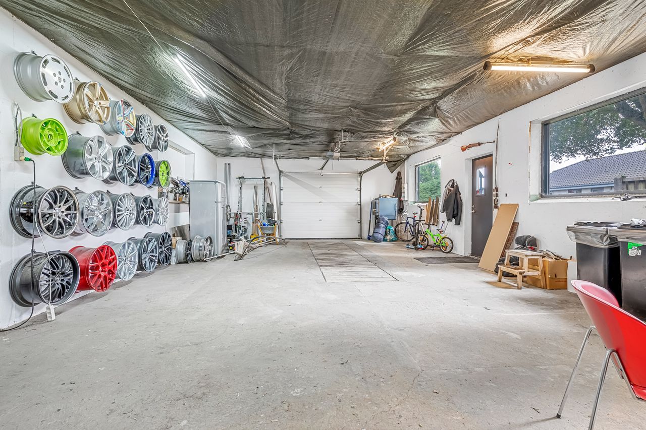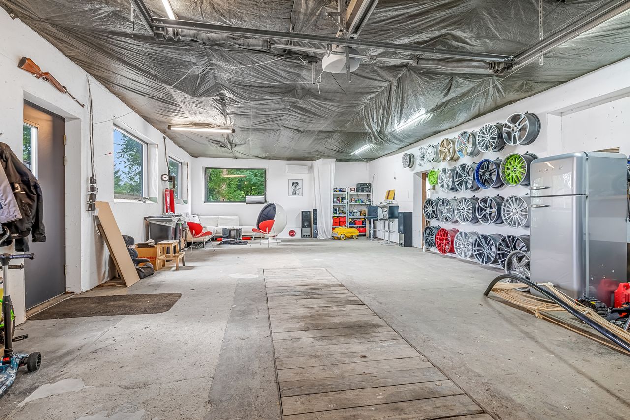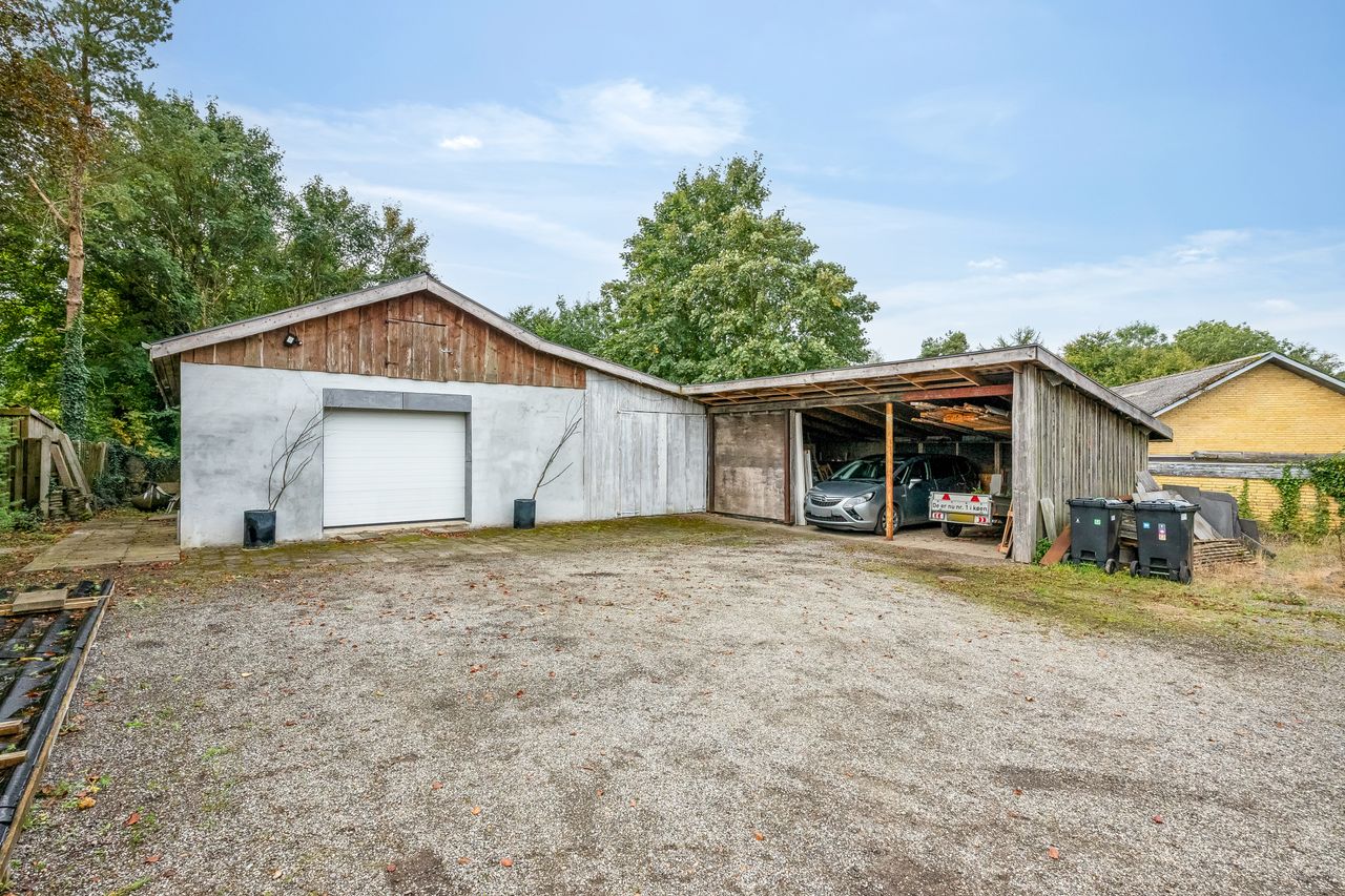 Til ejendommen hører også et garageanlæg på hele 181 kvm. Her findes både værksted/garagefaciliteter samt disponible rum, toilet og køkken – mulighederne er mange for den pladskrævende hobbyist eller håndværker! Udhuset opvarmes effektivt med en luft-til-luft varmepumpe og fremstår med nyere ståltag fra 2021. Derudover er der en træcarport på 40 kvm.