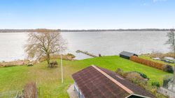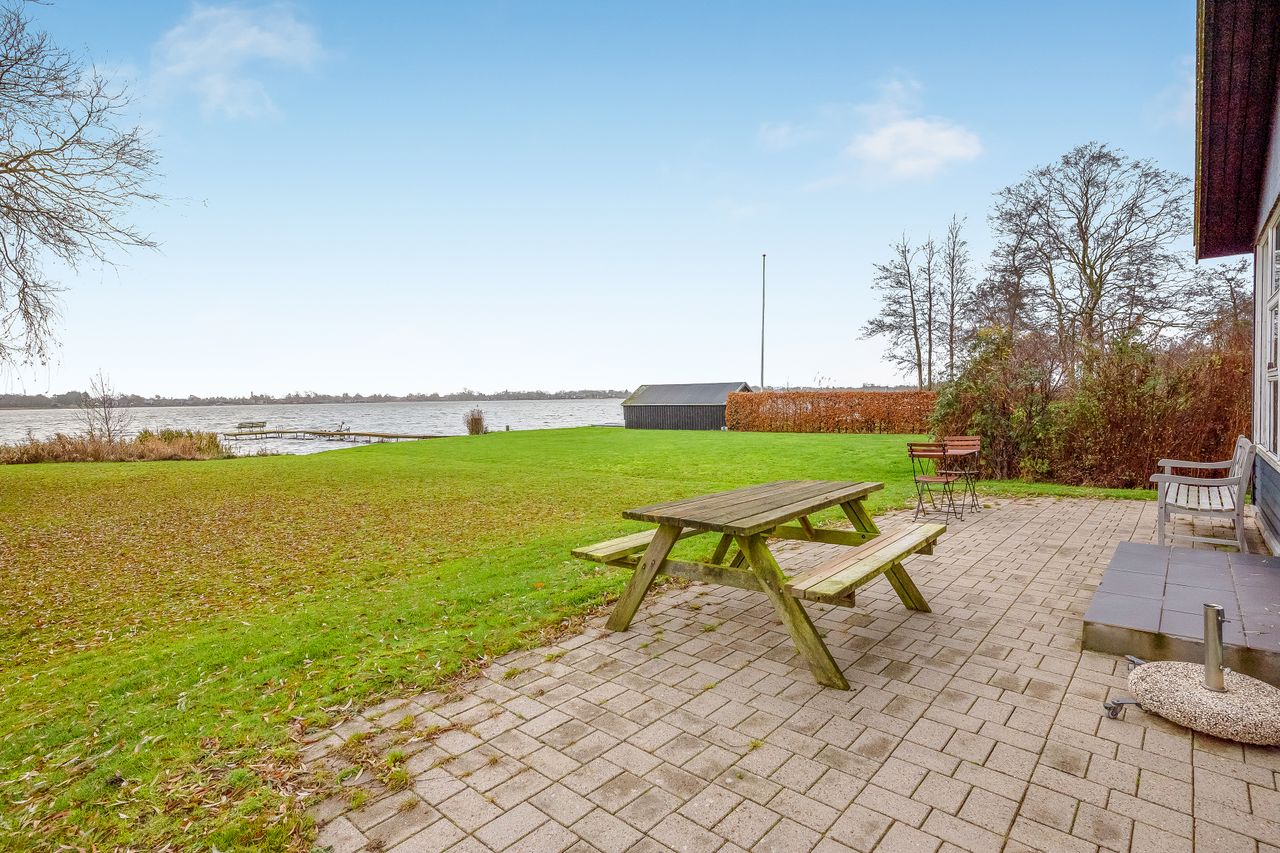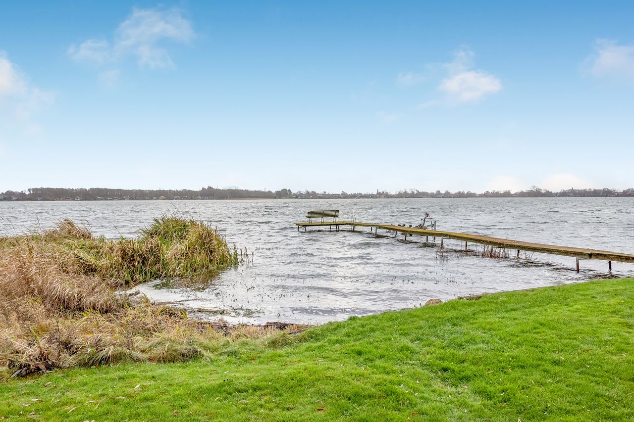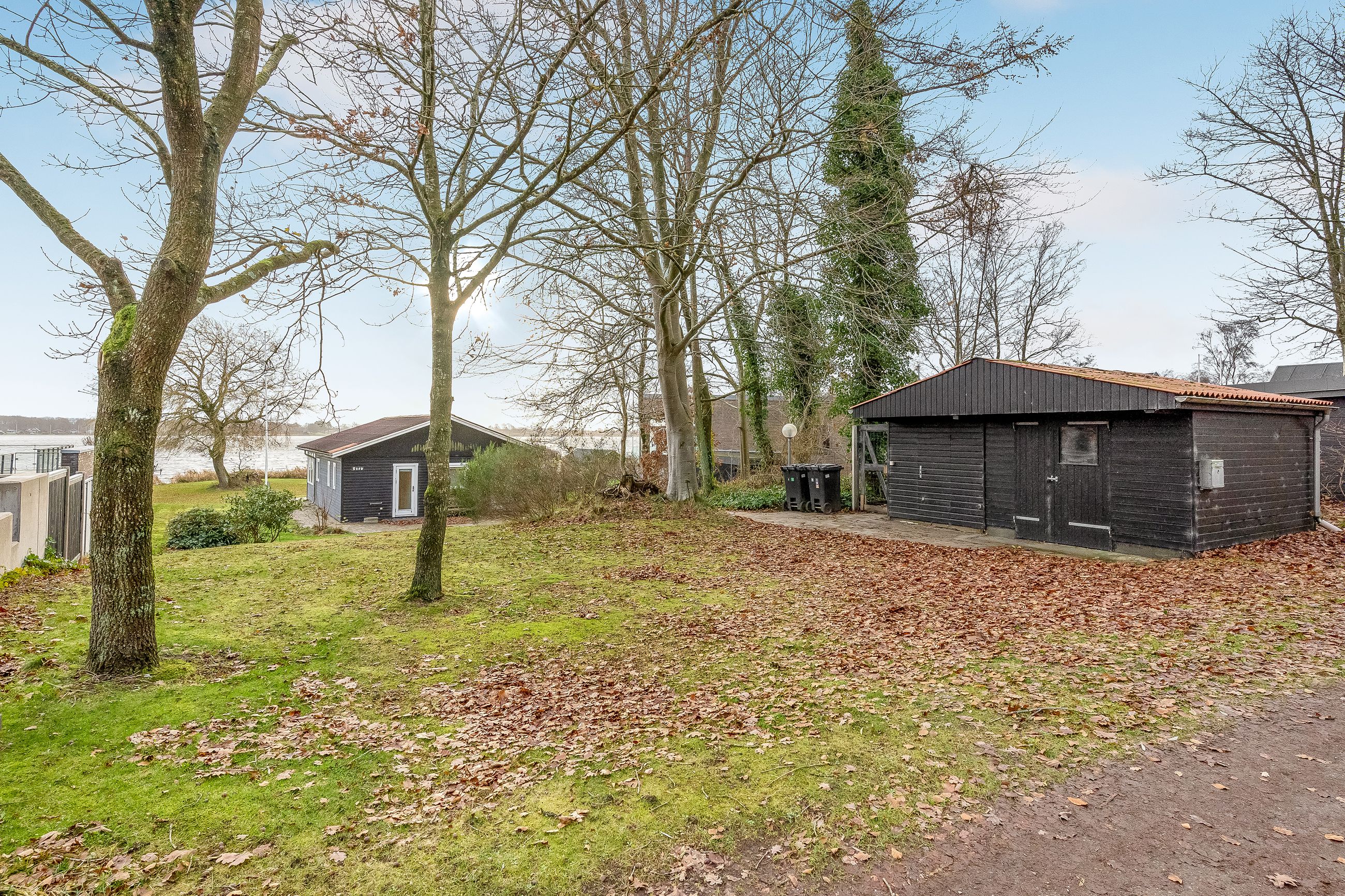 Den sydvendte terrasse er perfekt placeret mod søen og inviterer til lange solrige dage under åben himmel. Den store grund på 1077 kvadratmeter strækker sig helt ned til vandkanten og er anlagt med græs, hvilket gør den ideel til leg eller afslapning i solen. Denne ejendom er virkelig noget særligt – her får du mulighed for at bo i første række til Sunds Sø med alt hvad det indebærer af fredfyldte stunder og naturoplevelser lige udenfor døren.