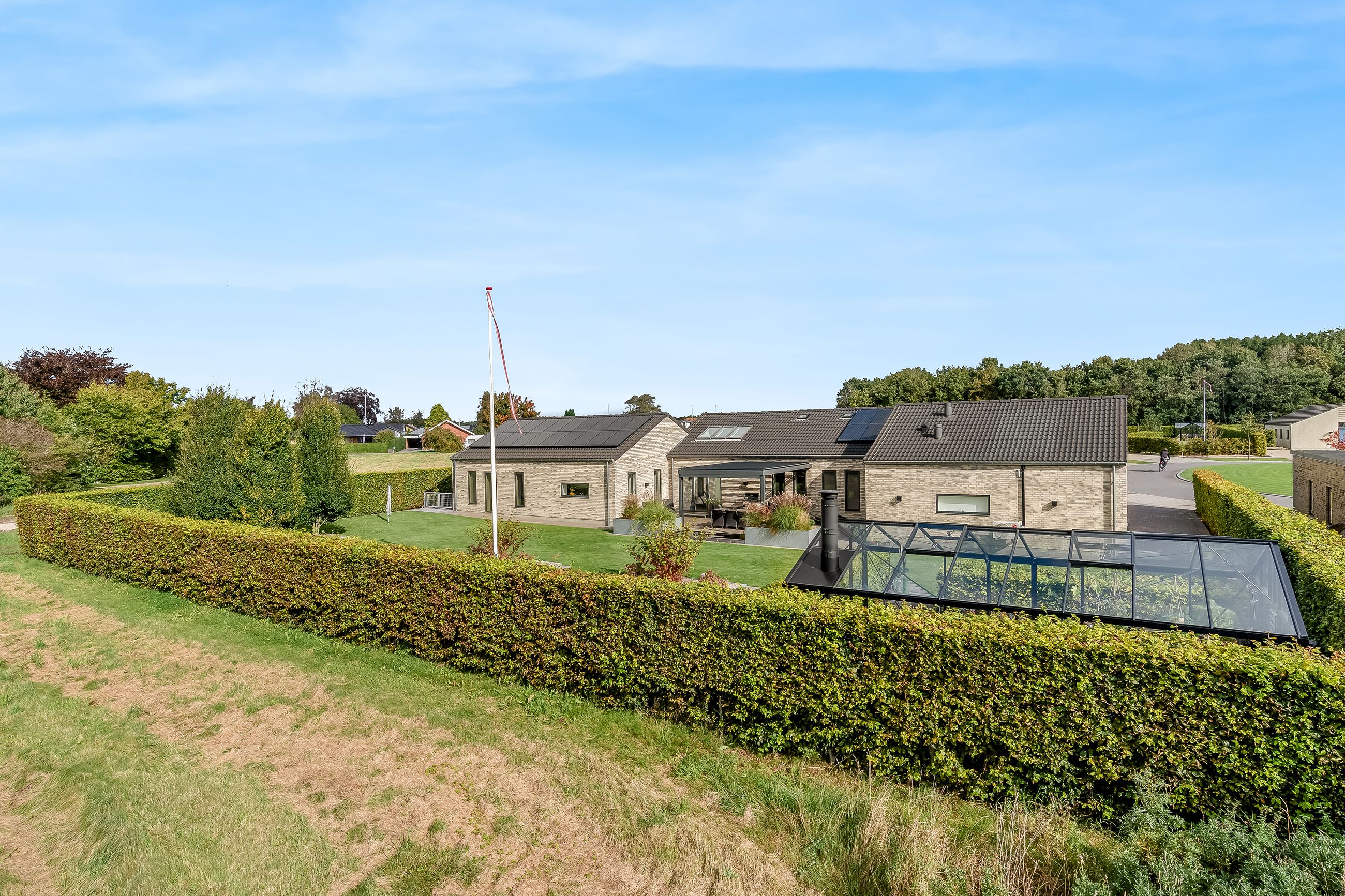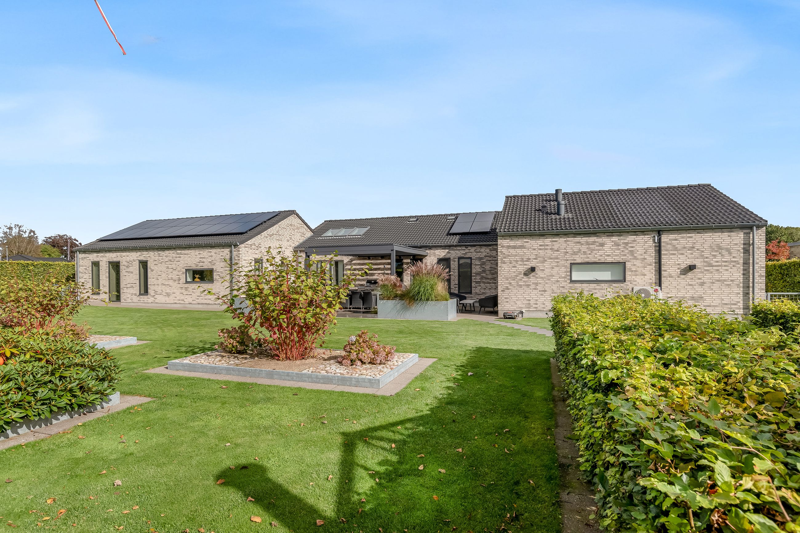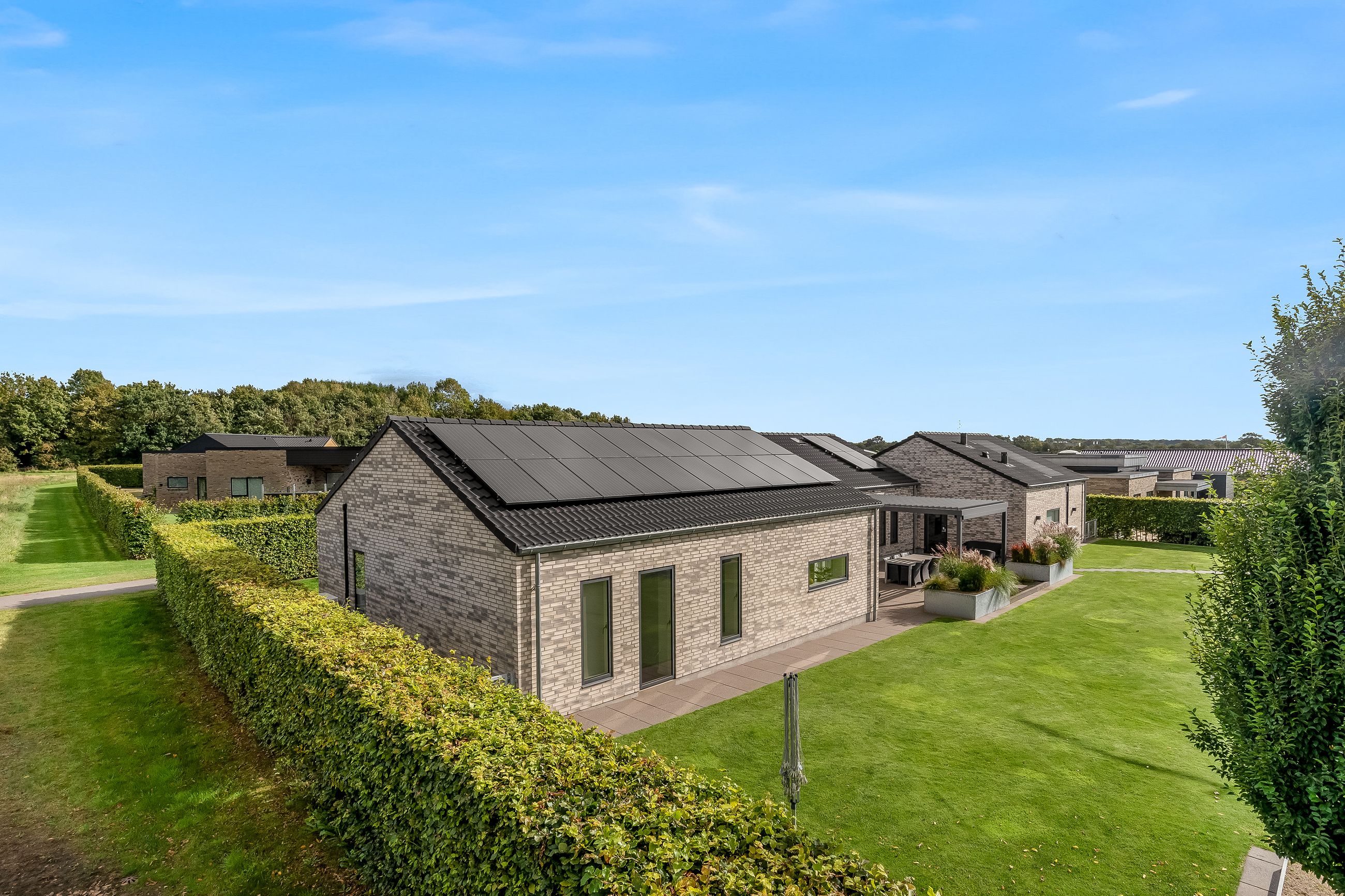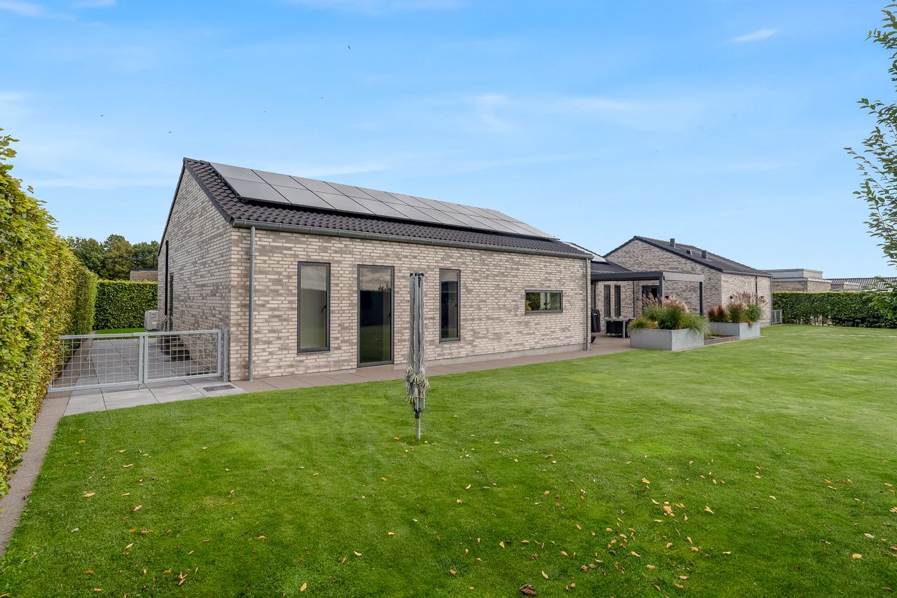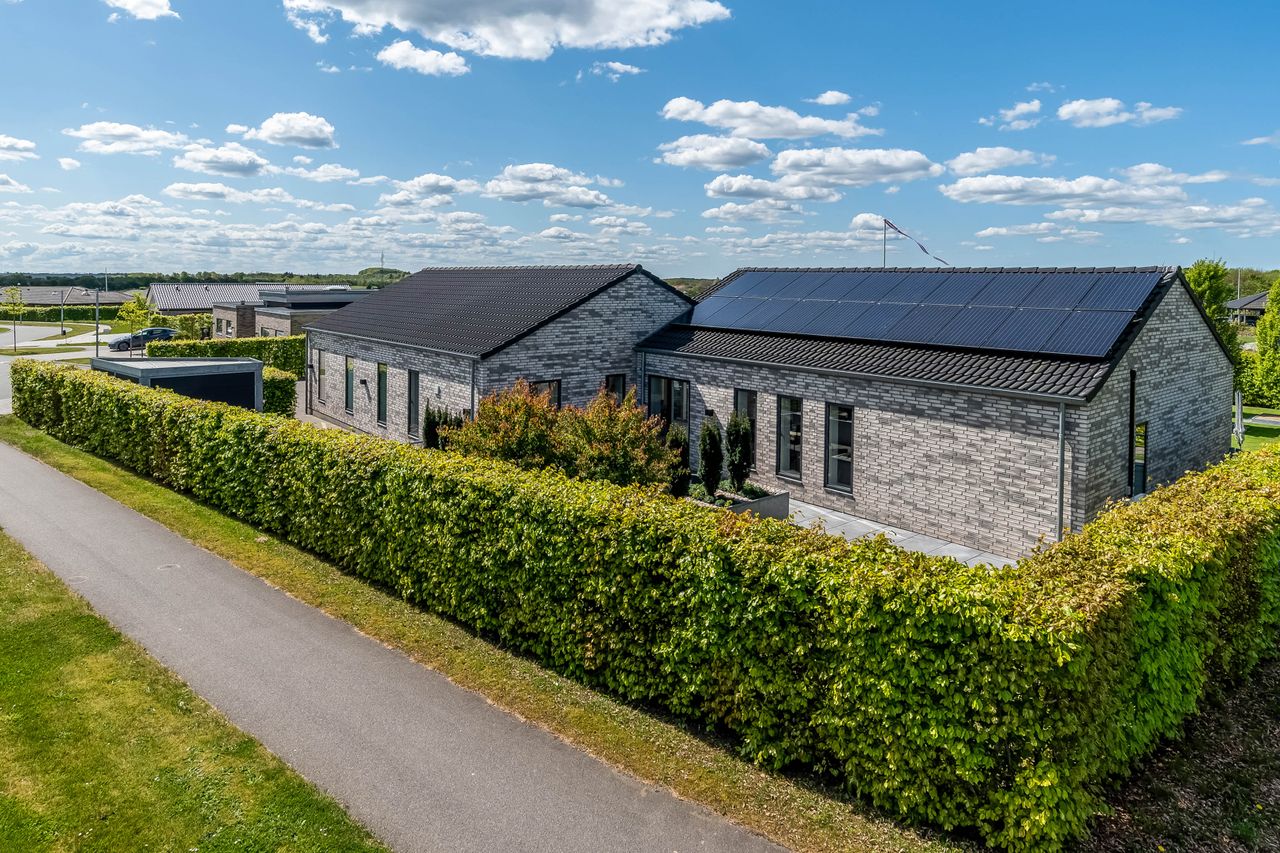 Villaen er opført i de bedste materialer og er fuldmuret for optimal holdbarhed. Med et mekanisk ventilationsanlæg sikres et sundt indeklima året rundt, mens solceller og varmepumpe bidrager til energibesparelser.