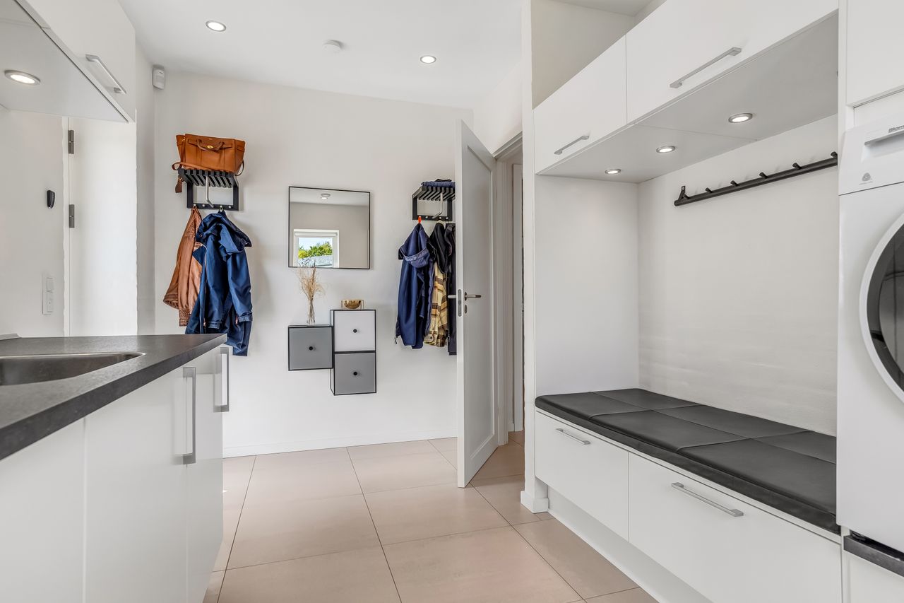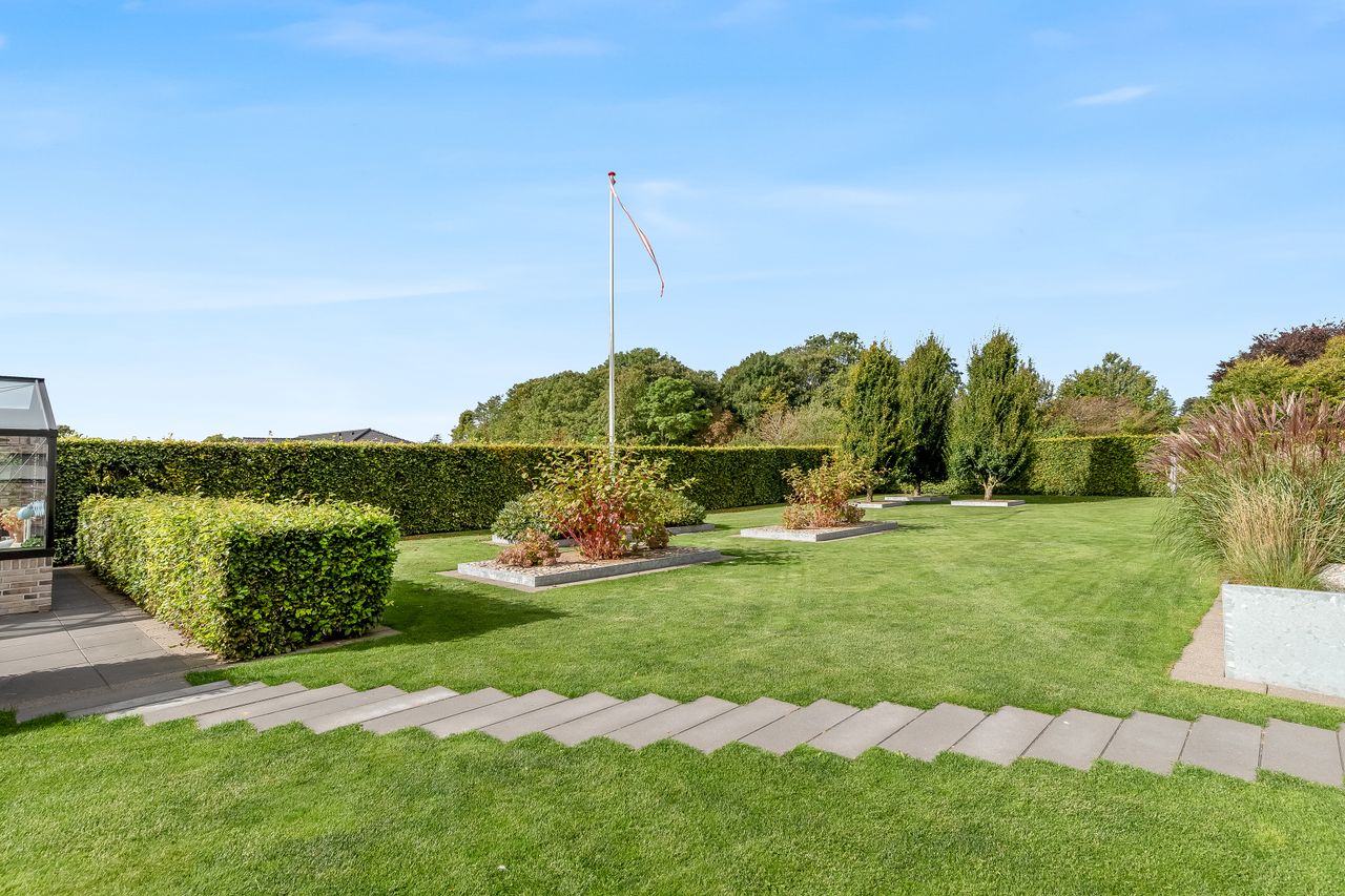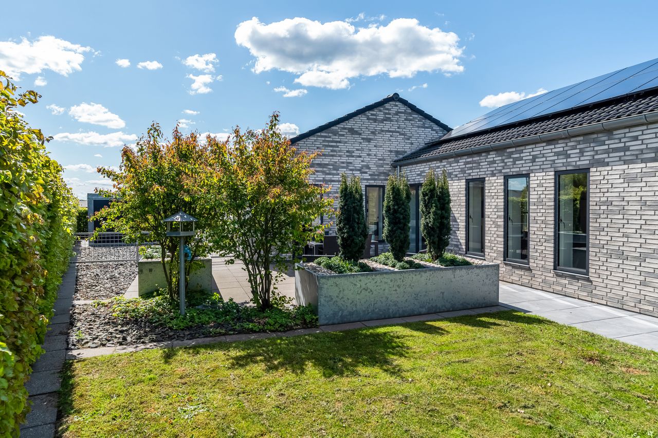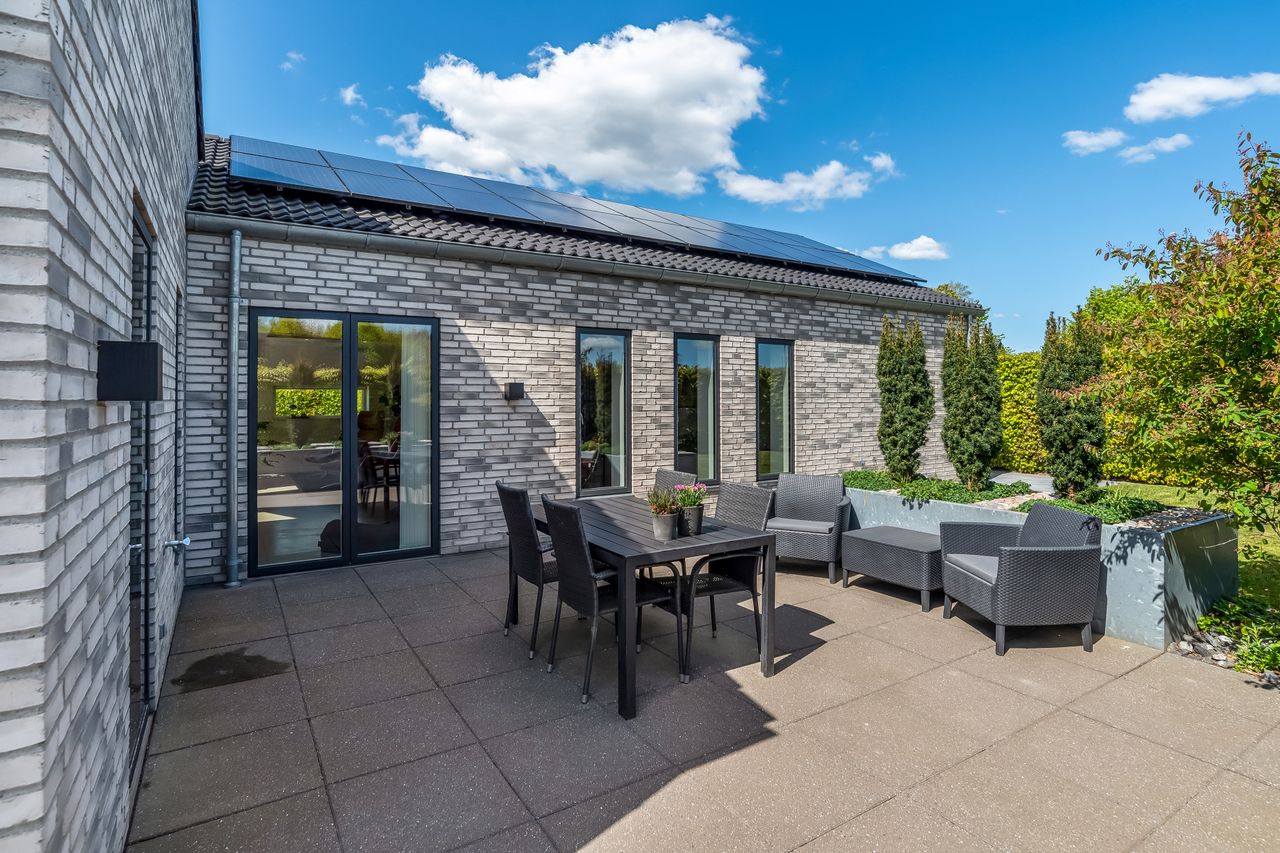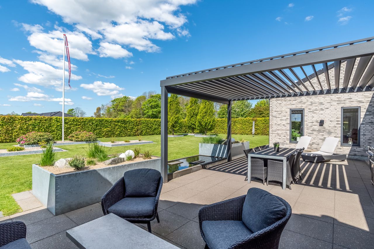Indretningen af huset er velovervejet uden spildplads; store opholdsrum med rigeligt lysindfald skaber en behagelig atmosfære. Fra det elegante alrum kan man træde ud på den store terrasse under pergolaen – perfekt til sommerens grillfester eller afslapning i solen.