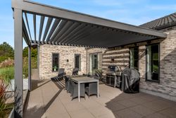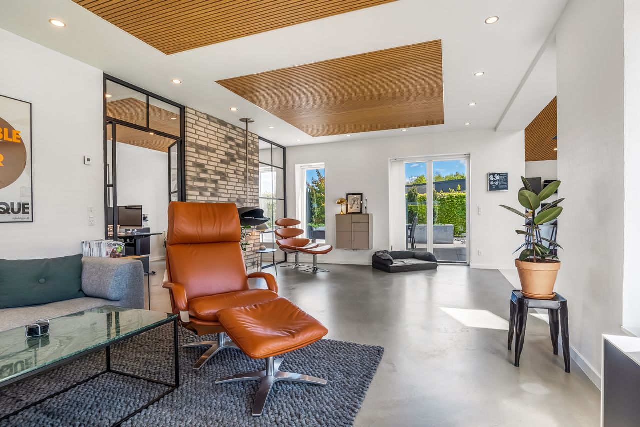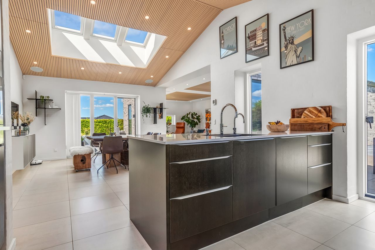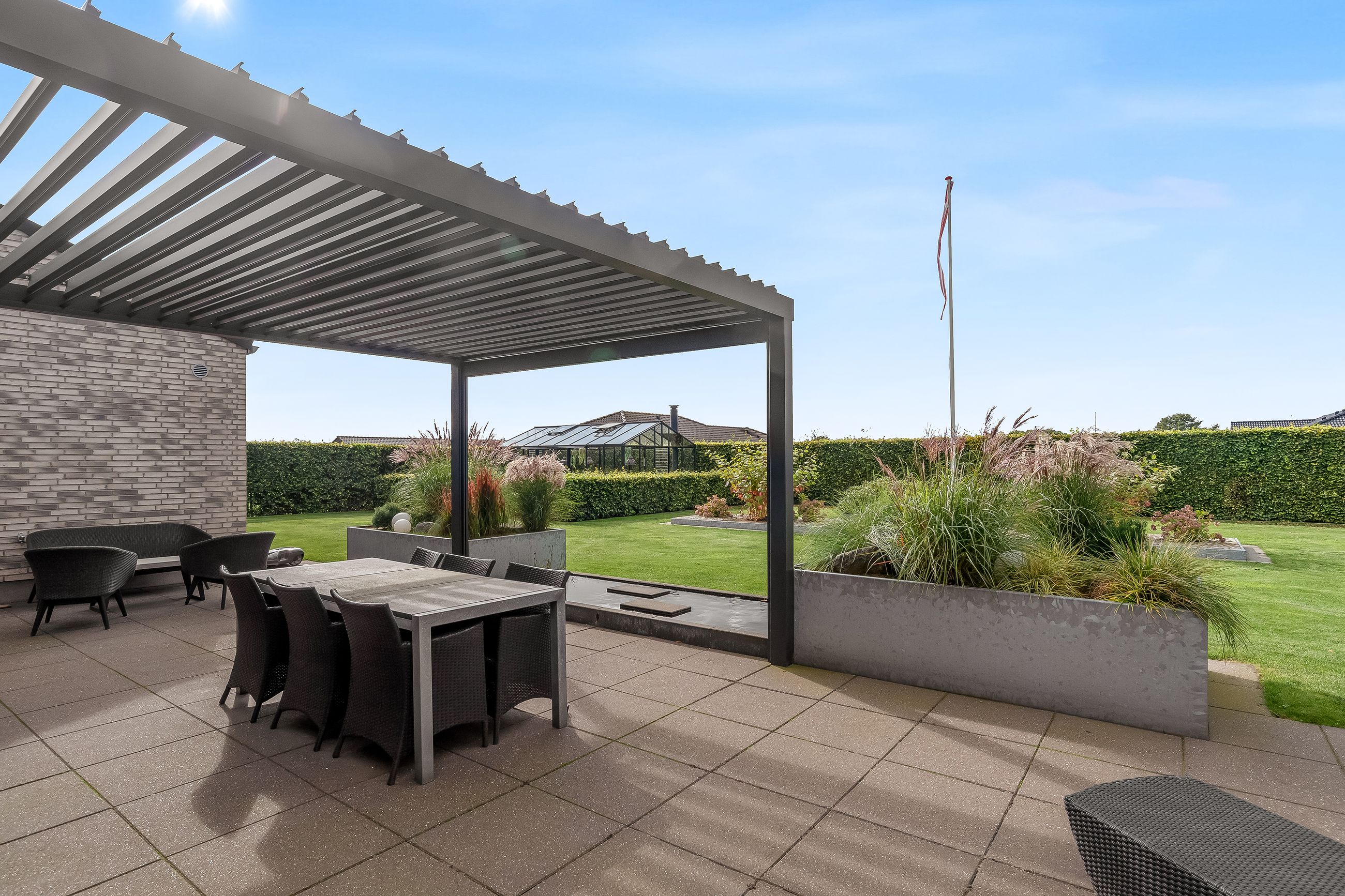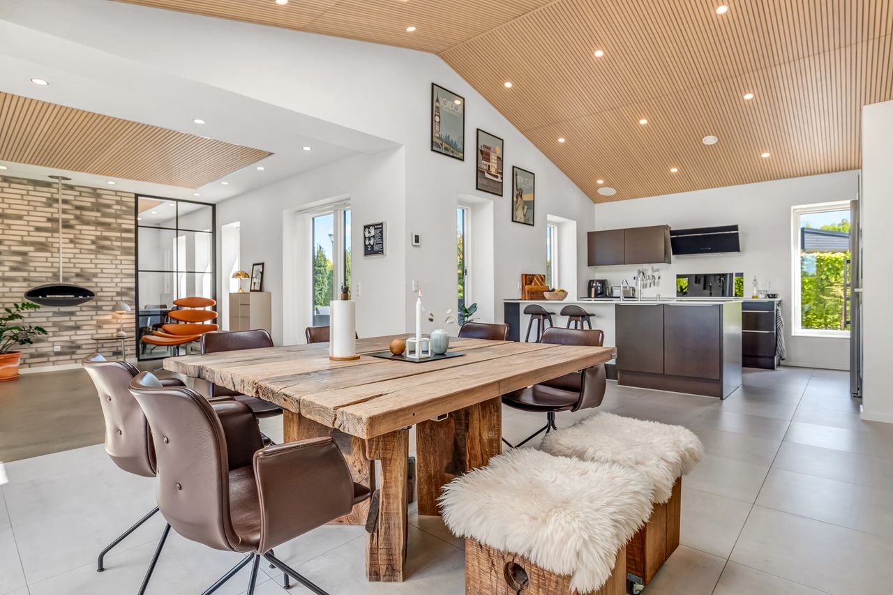 Indretningen af huset er velovervejet uden spildplads; store opholdsrum med rigeligt lysindfald skaber en behagelig atmosfære. Fra det elegante alrum kan man træde ud på den store terrasse under pergolaen – perfekt til sommerens grillfester eller afslapning i solen.
