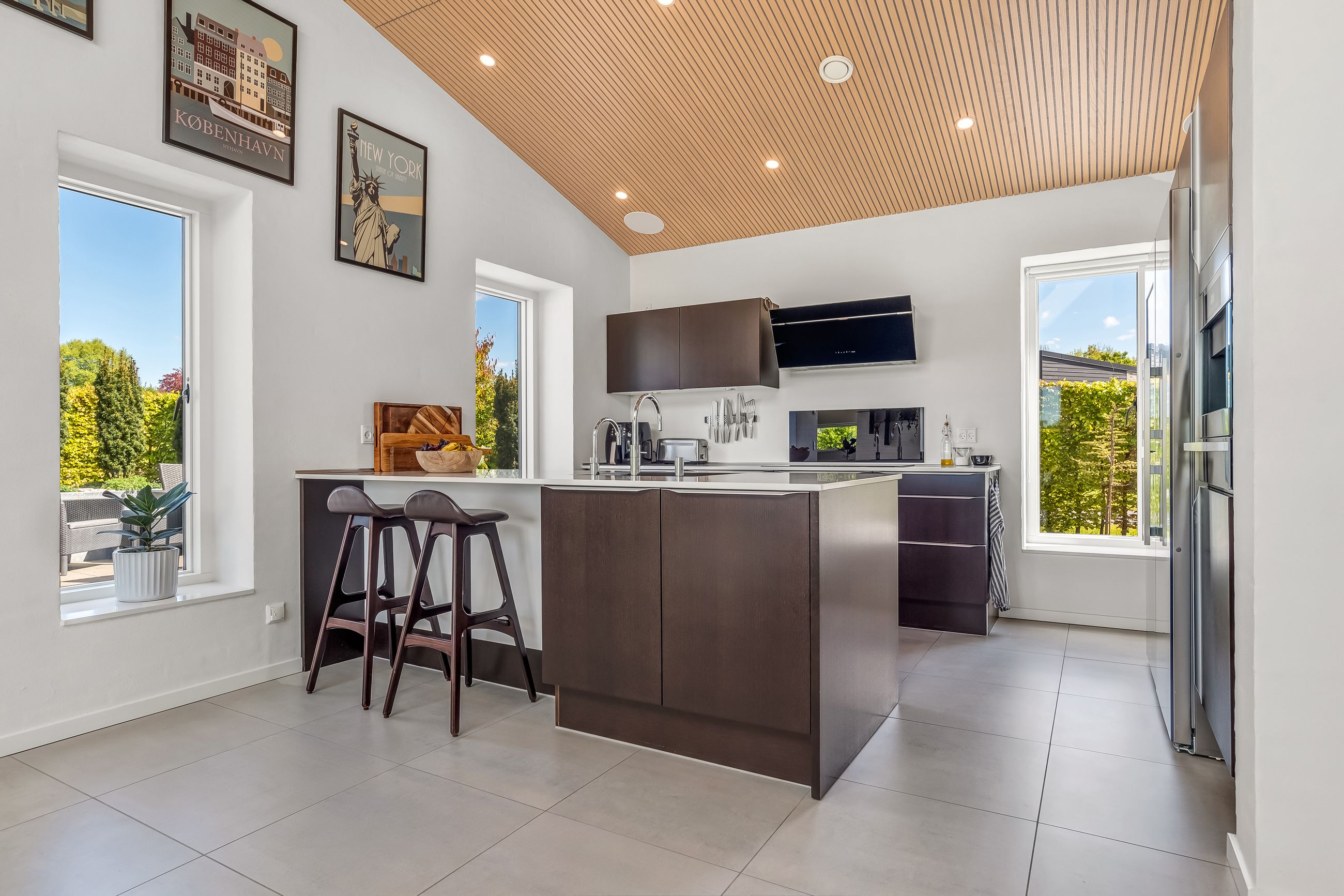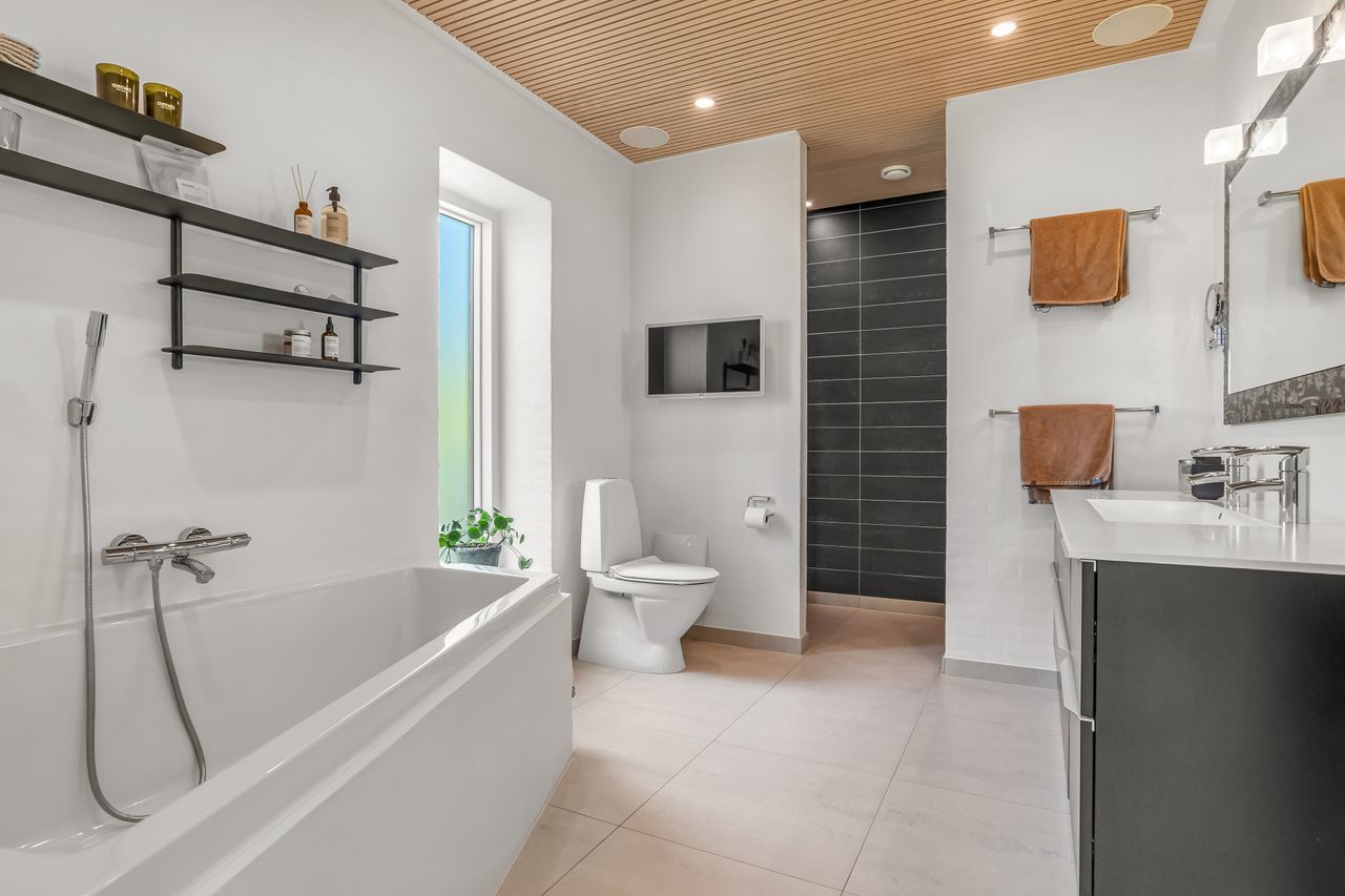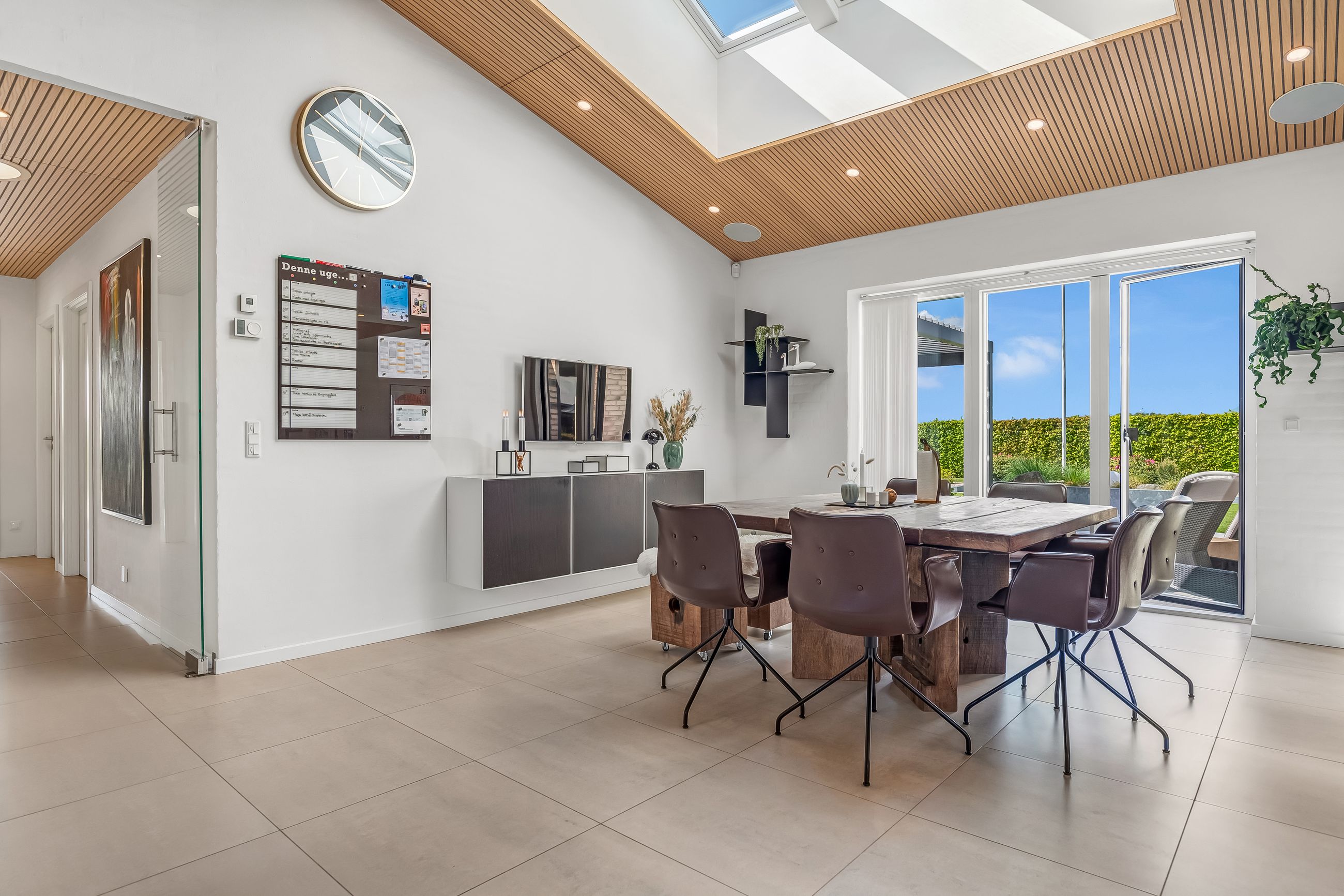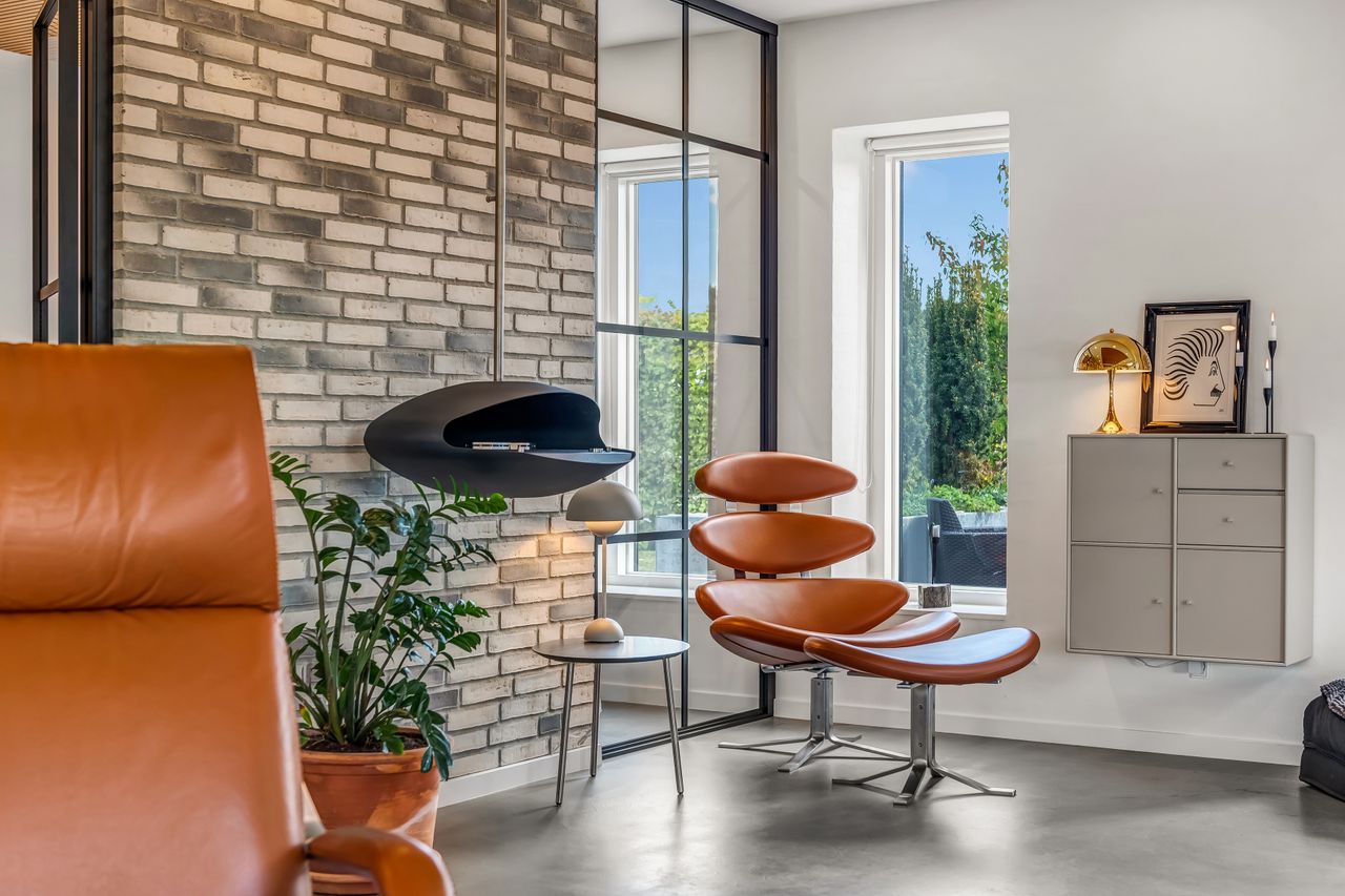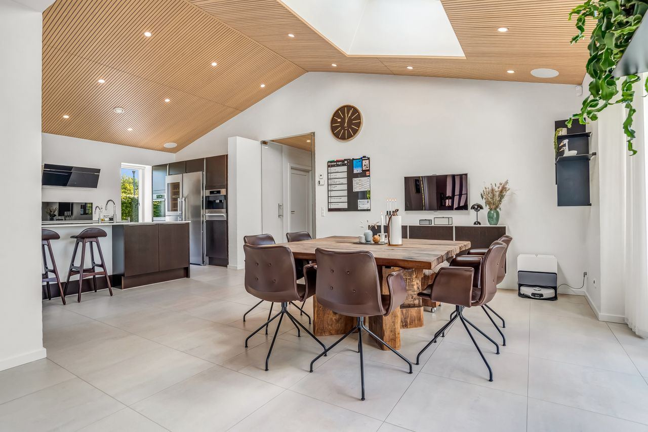 Indretningen af huset er velovervejet uden spildplads; store opholdsrum med rigeligt lysindfald skaber en behagelig atmosfære. Fra det elegante alrum kan man træde ud på den store terrasse under pergolaen – perfekt til sommerens grillfester eller afslapning i solen.