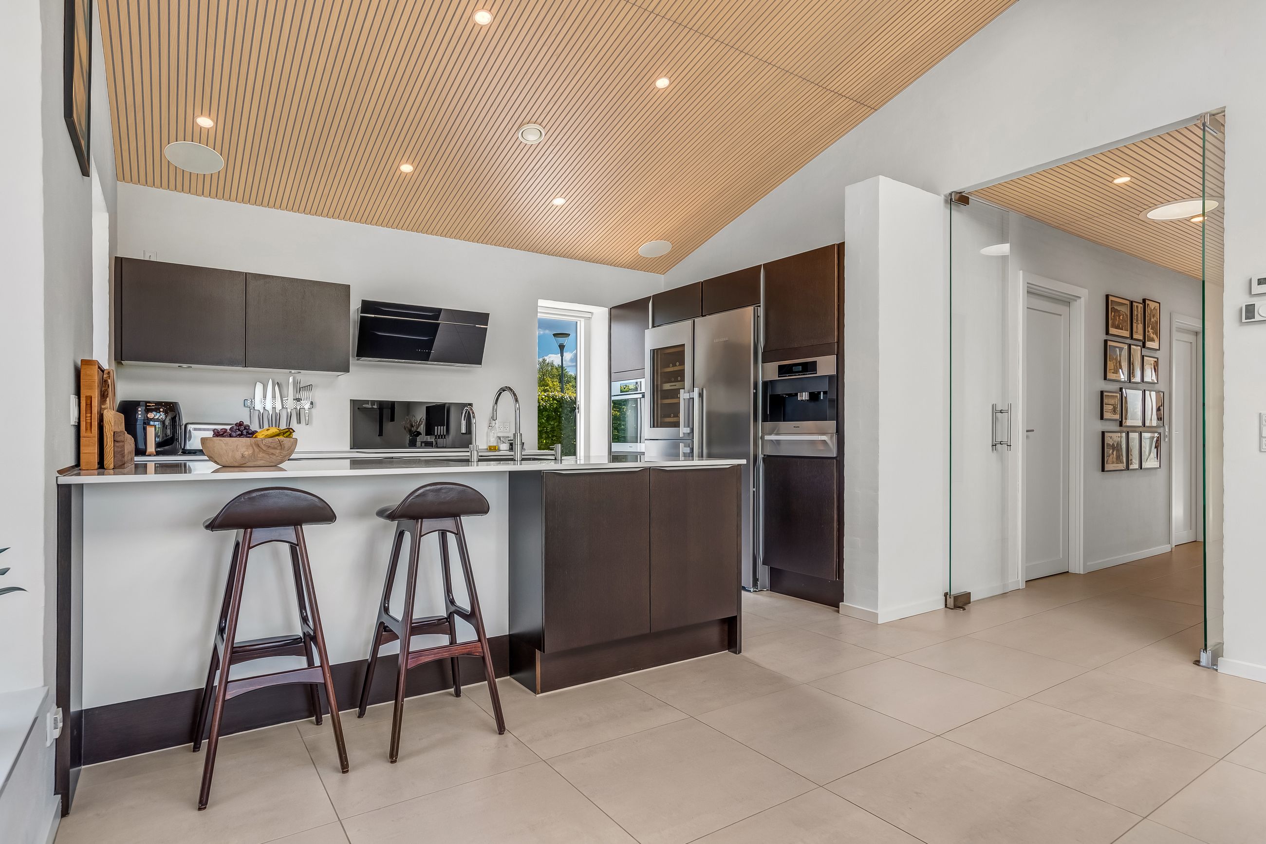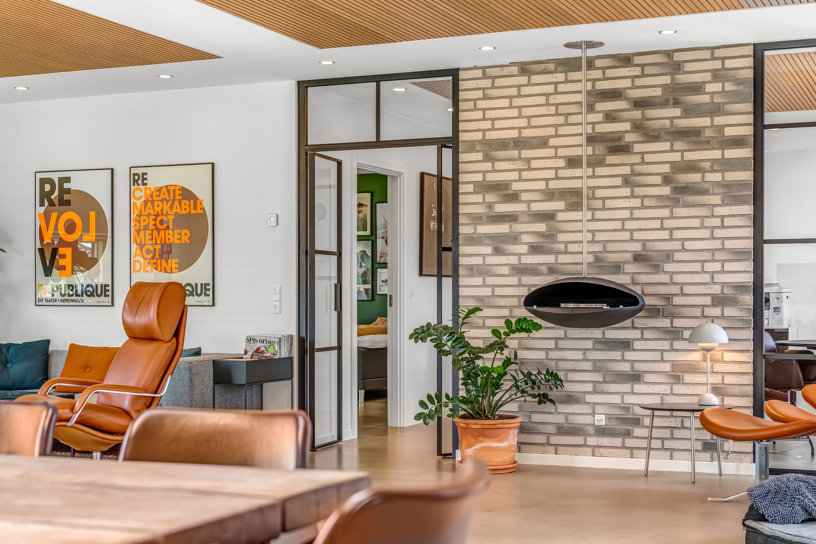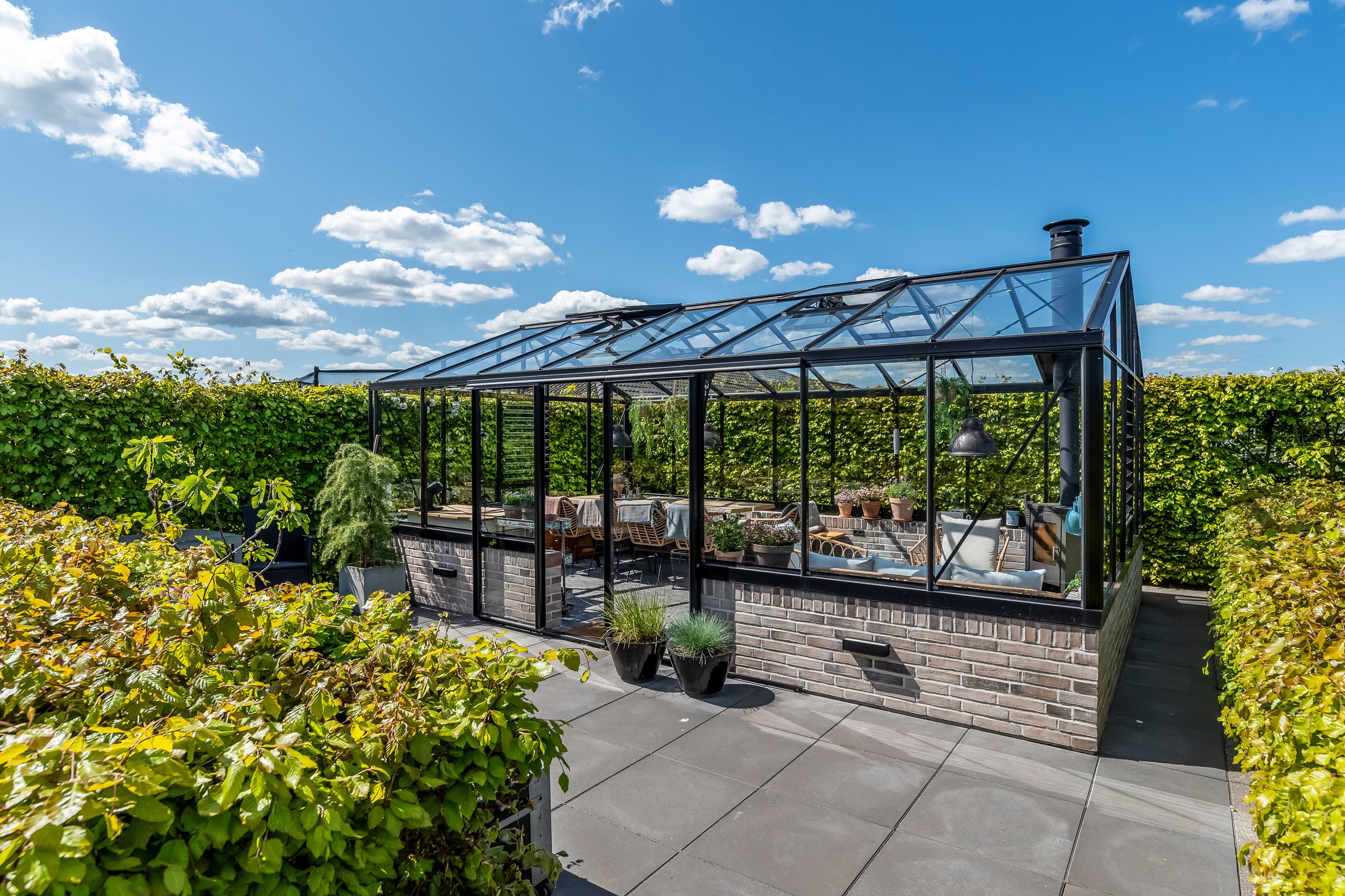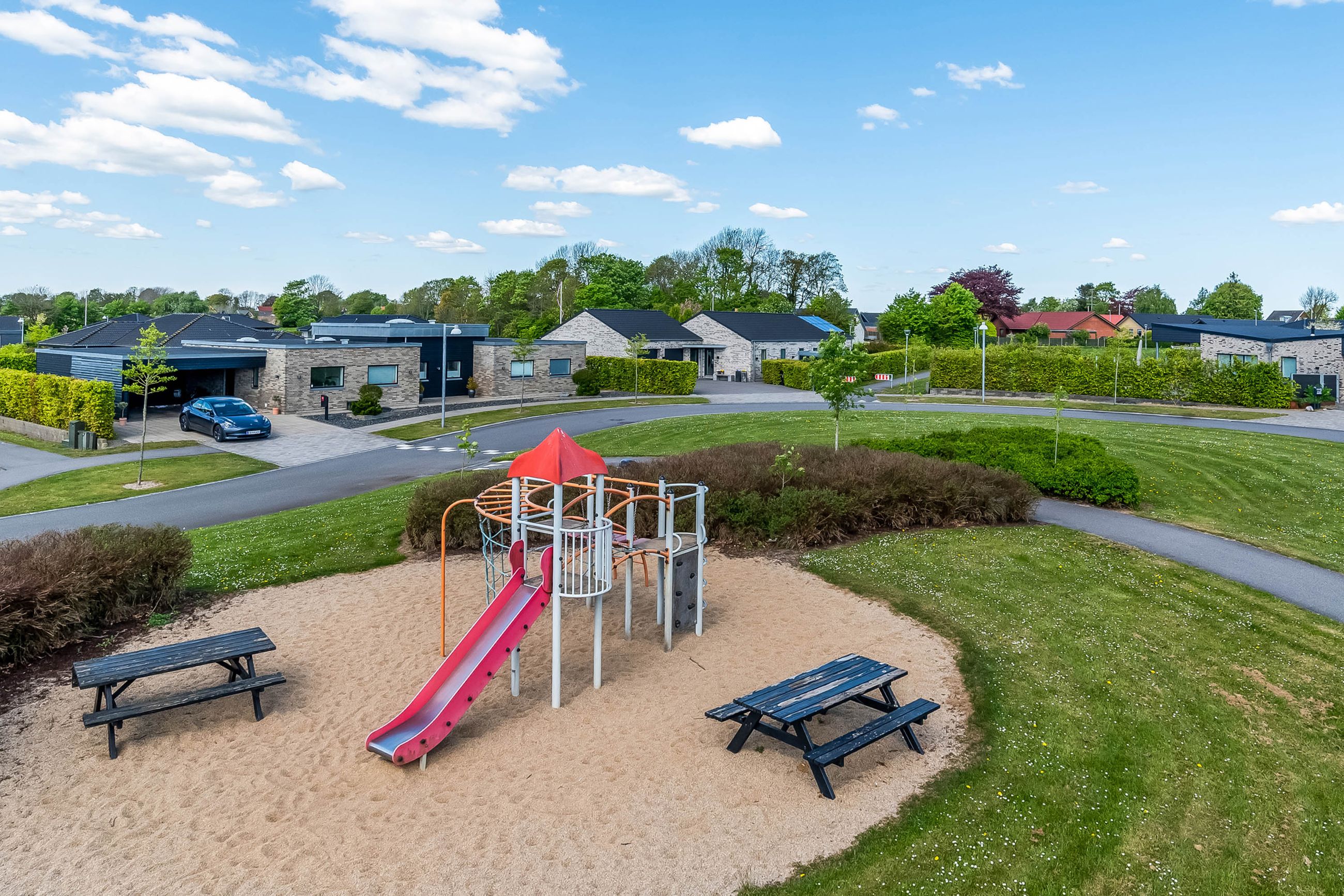 Indretningen af huset er velovervejet uden spildplads; store opholdsrum med rigeligt lysindfald skaber en behagelig atmosfære. Fra det elegante alrum kan man træde ud på den store terrasse under pergolaen – perfekt til sommerens grillfester eller afslapning i solen.