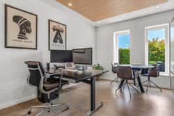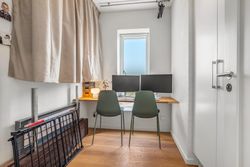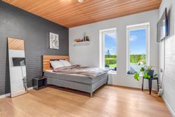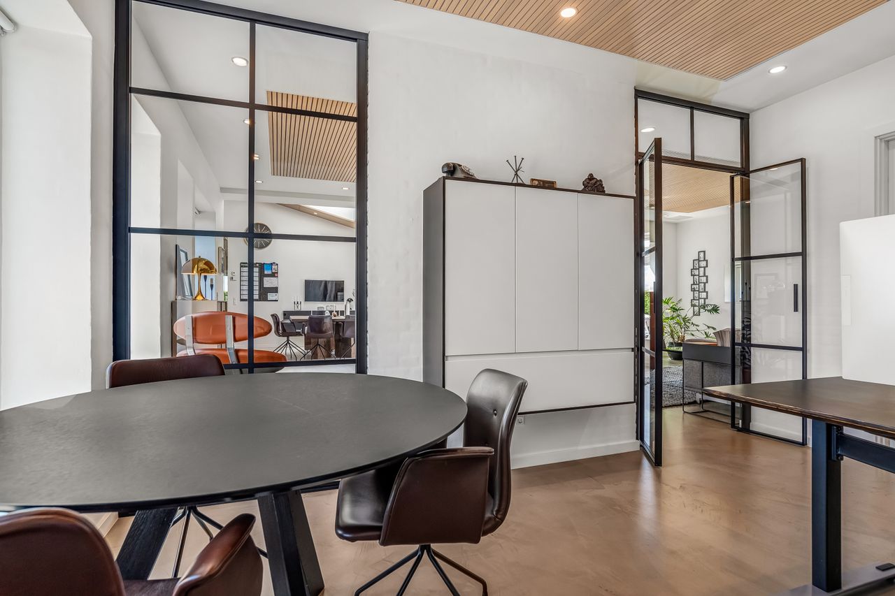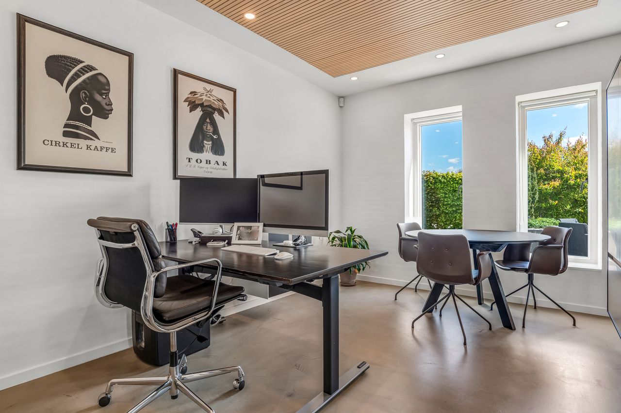 Indvendigt finder du blandt andet en stor entre, to lyse værelser, flot badeværelse samt kontorplads til hjemmearbejdet. Stort lækkert og lyst køkken/alrum i åben forbindelse til stue. Derudover et ekstra stort kontor.