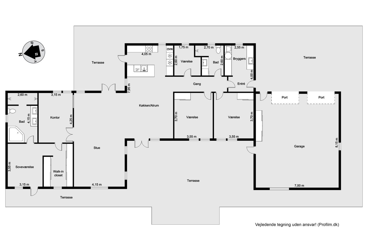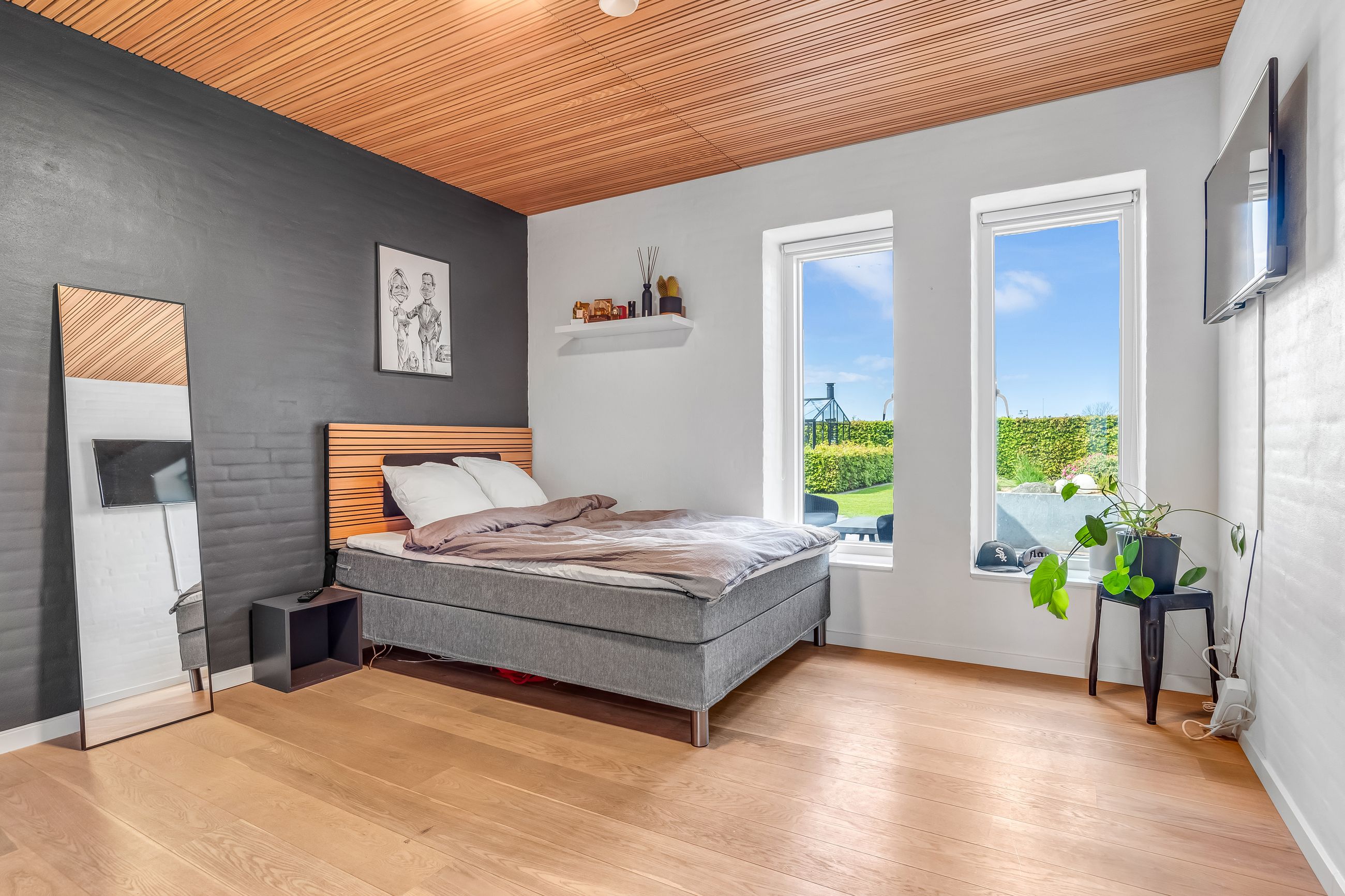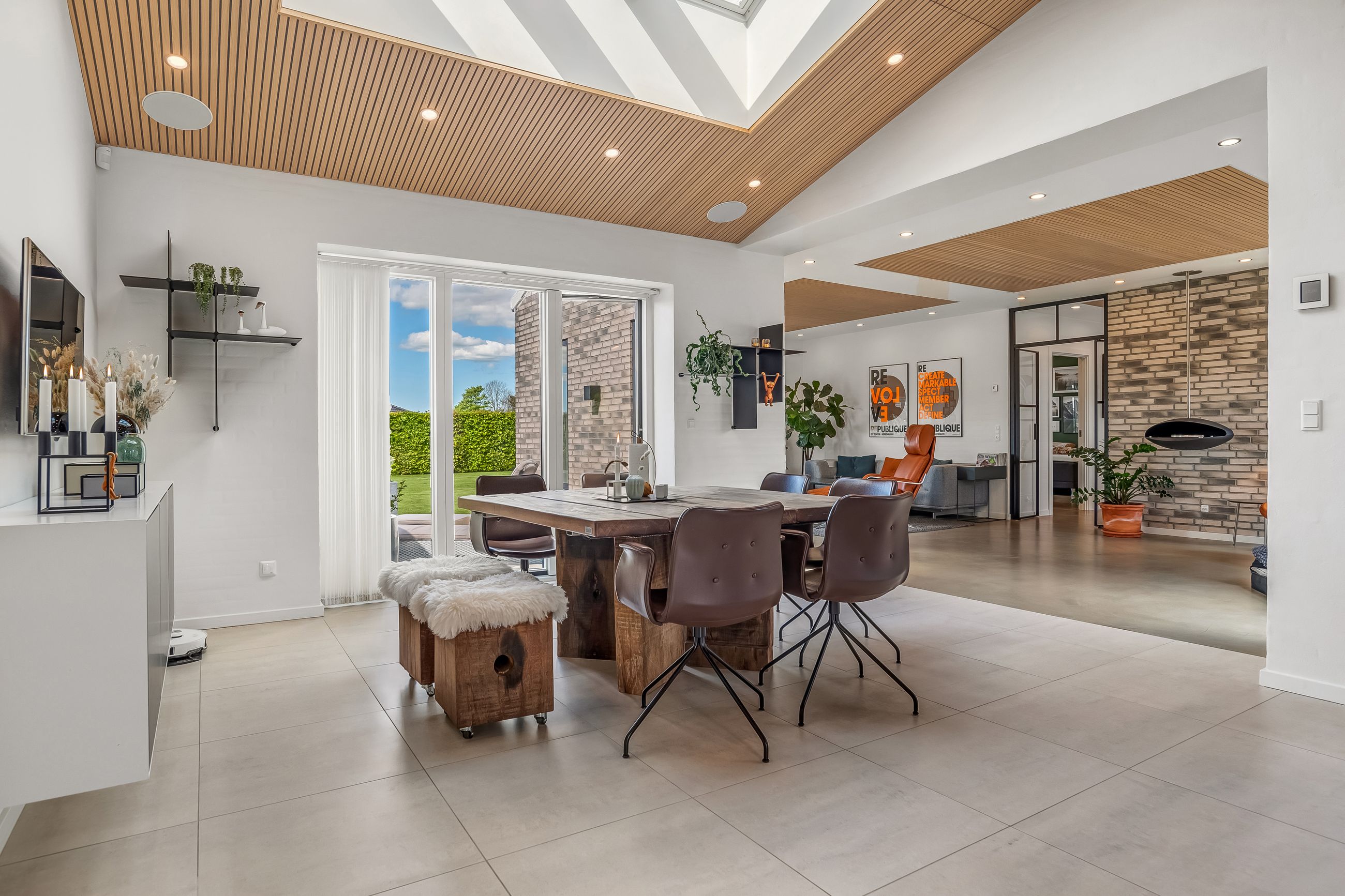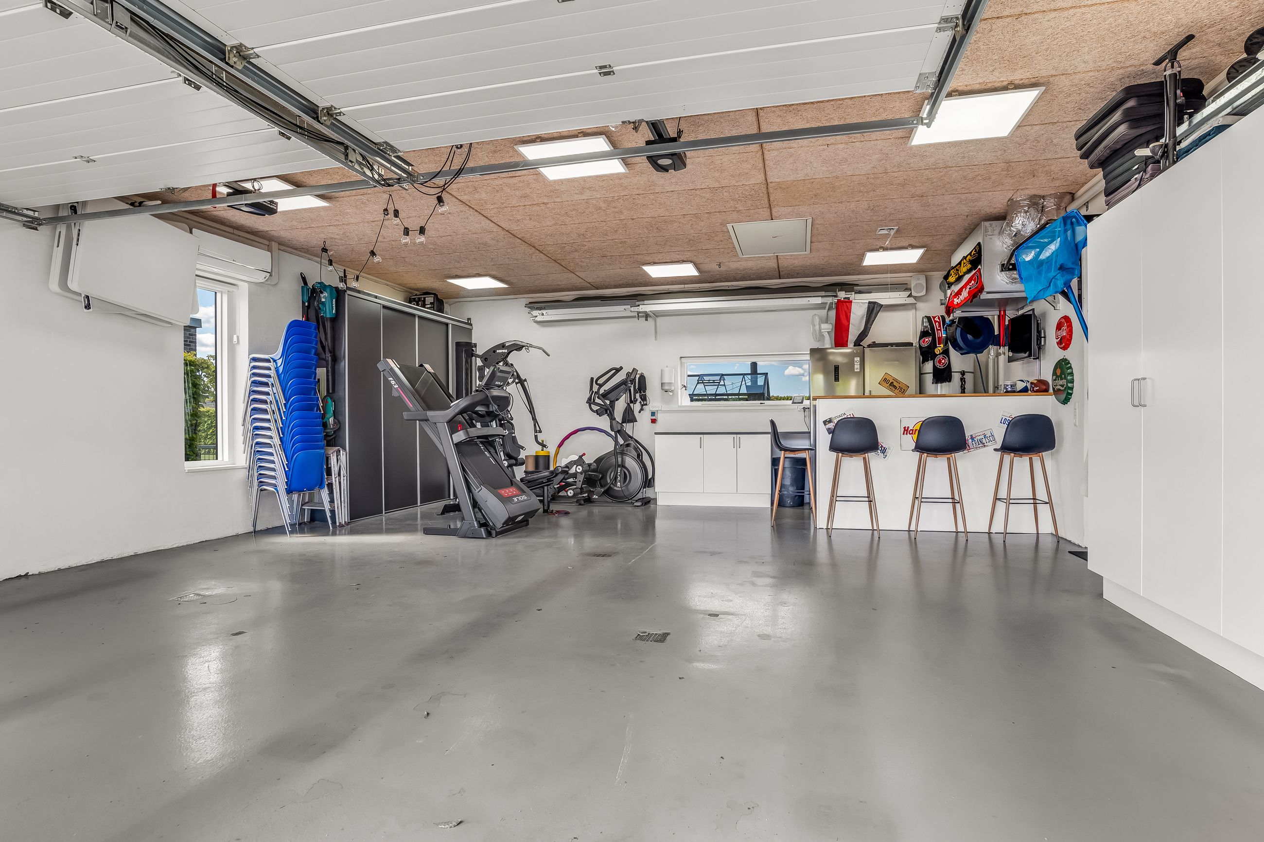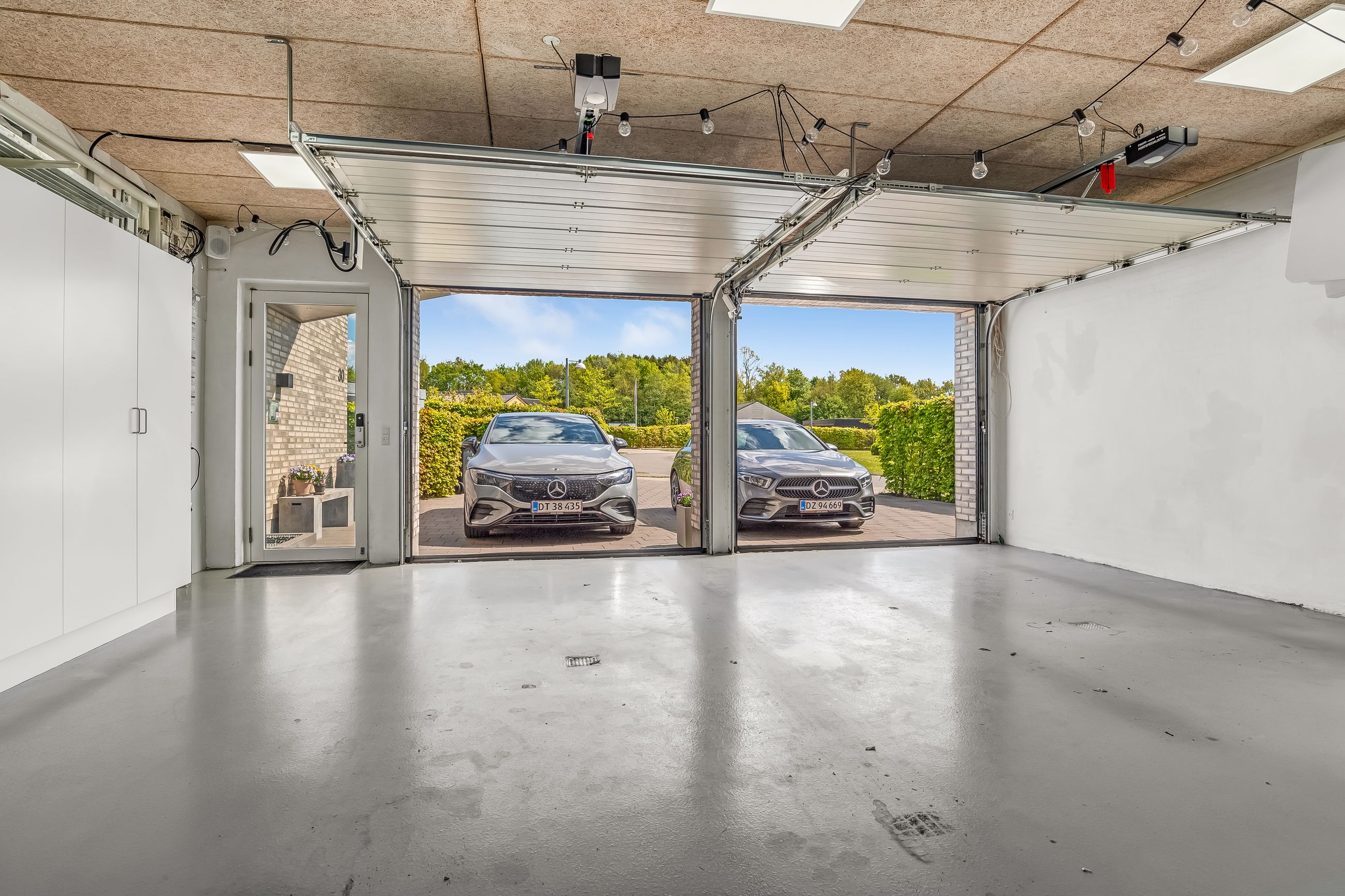 Til ejendommen hører også en rummelig dobbeltmuret garage på 68 kvadratmeter med elport – ideel til bilentusiasten eller som ekstra opbevaringsplads eller multirum.