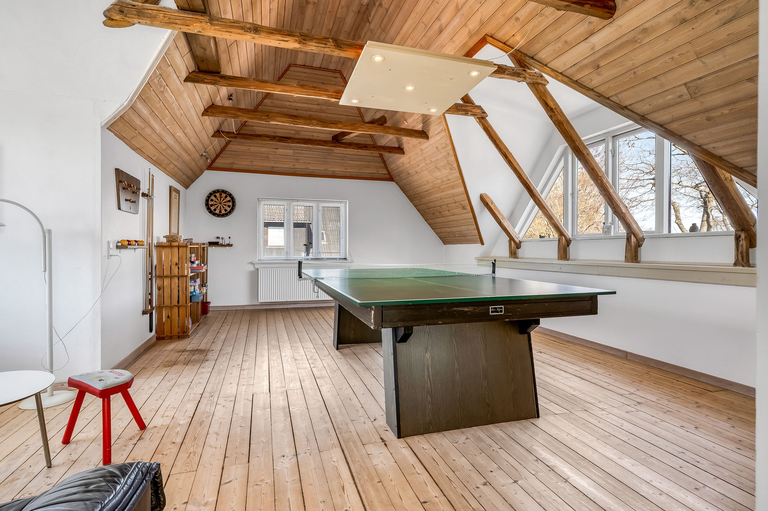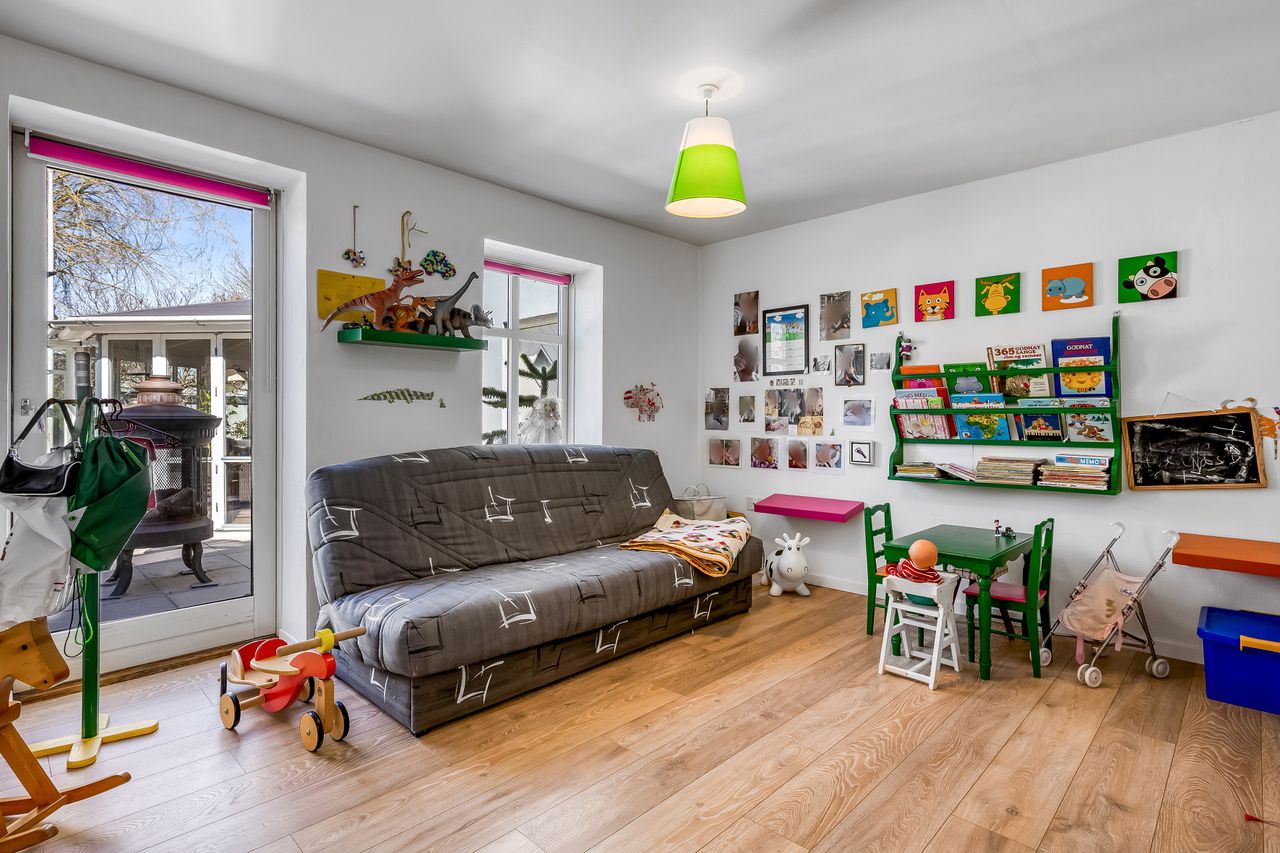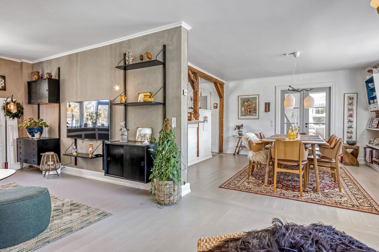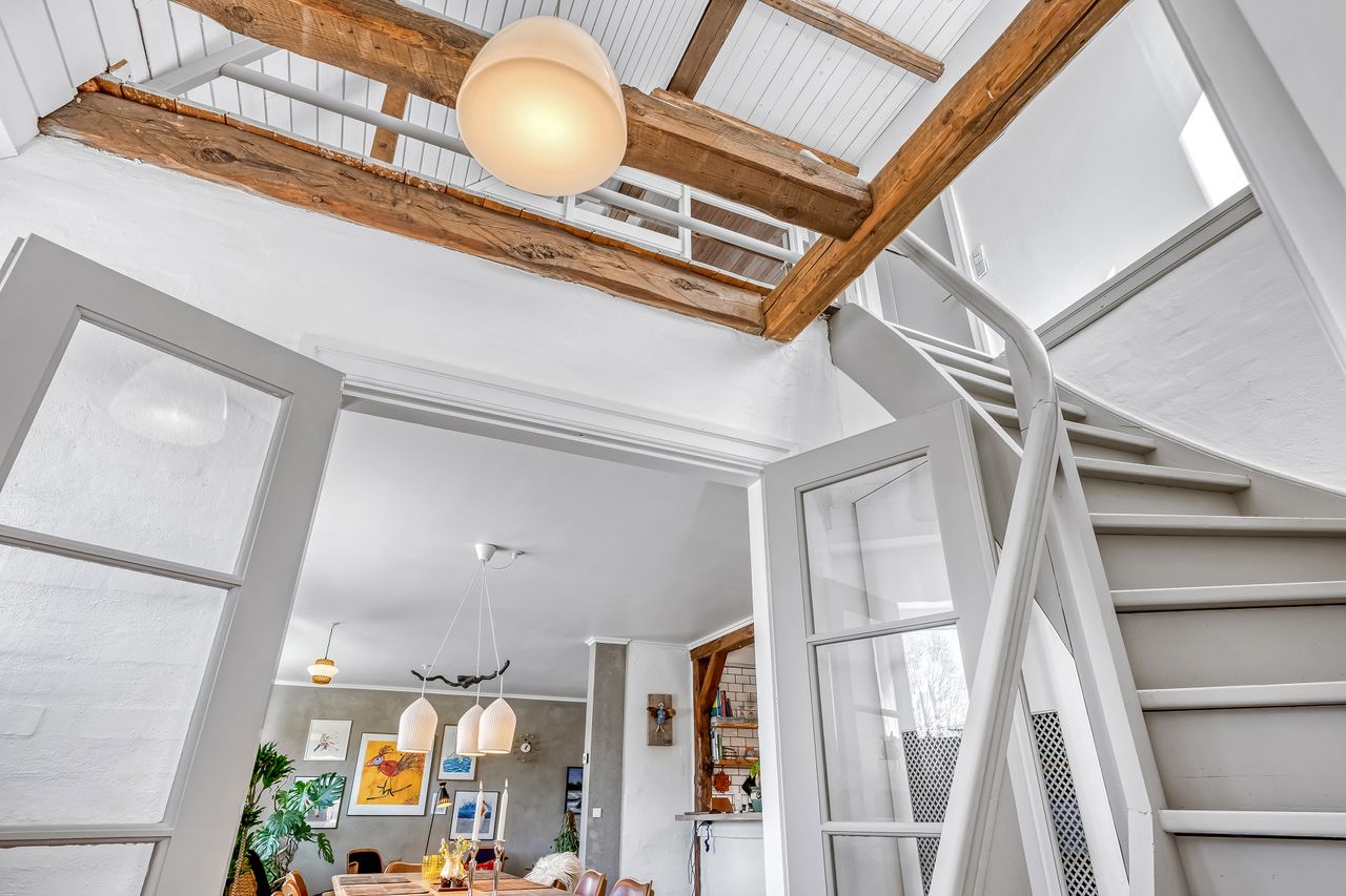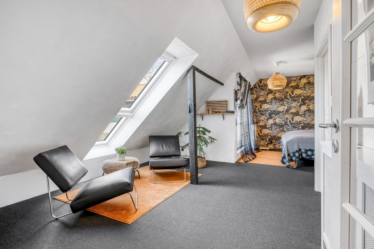 Indretningen strækker sig over flere plan og imponerer med et flot indgangsparti, der leder videre til moderne badeværelser og en stor stue. Her er plads til både afslapning og sociale sammenkomster. De store soverum tilbyder rigelig plads til hele familien eller gæsterne, mens de gode opholdsrum giver mulighed for kreativ udfoldelse eller leg.