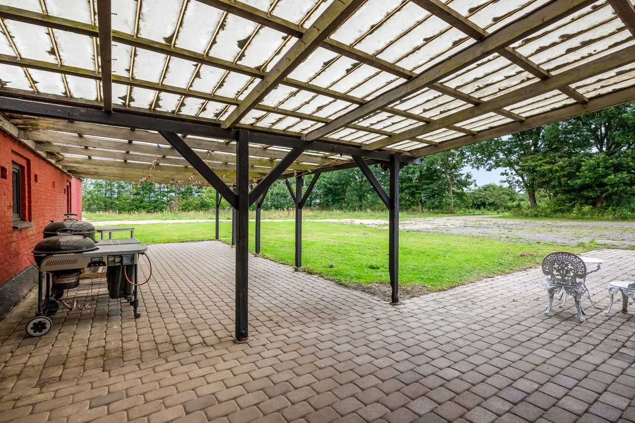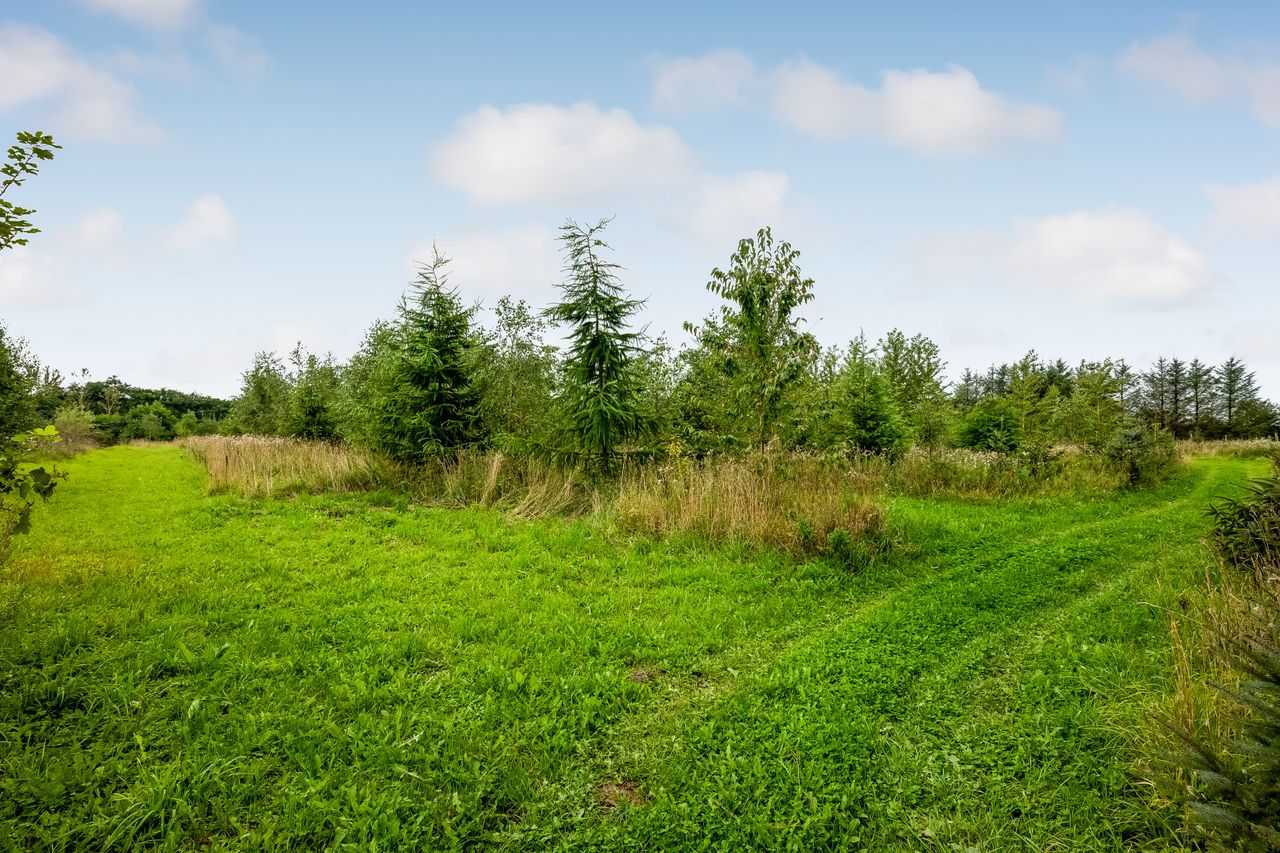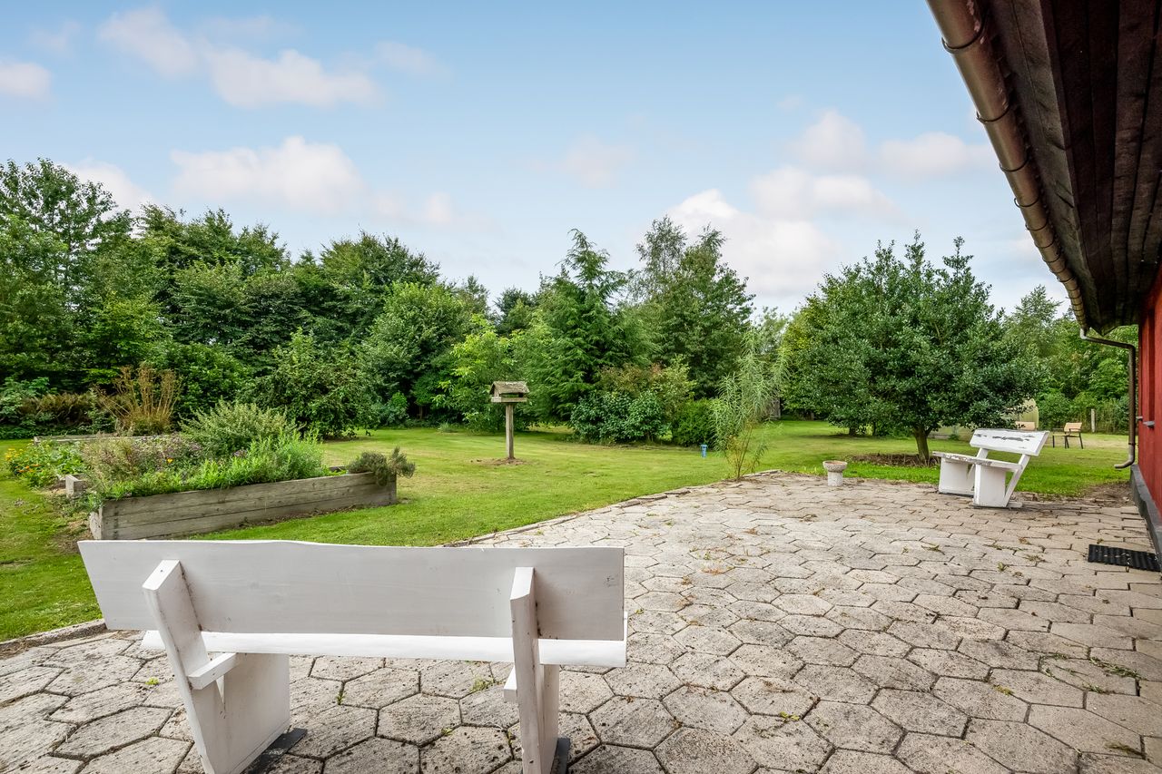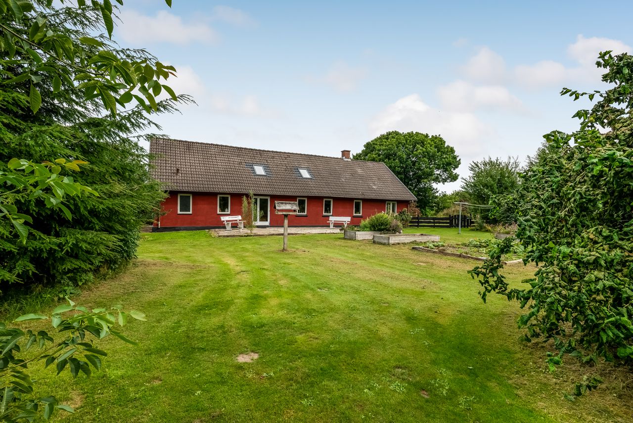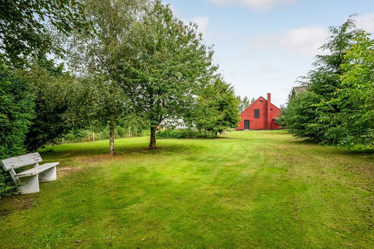Udenfor fortsætter eventyret med en vidtstrakt have foran huset samt cirka to hektar jord udlagt til vildtvoksende natur med brede gangstier – ideelt for naturelskere eller dem med grønne fingre. De brugbare udbygninger giver yderligere fleksibilitet; måske har du altid drømt om din egen hestefold?