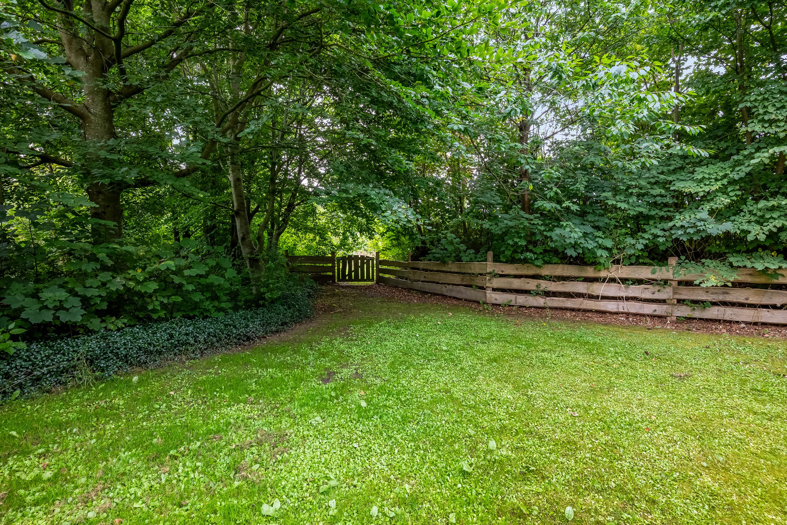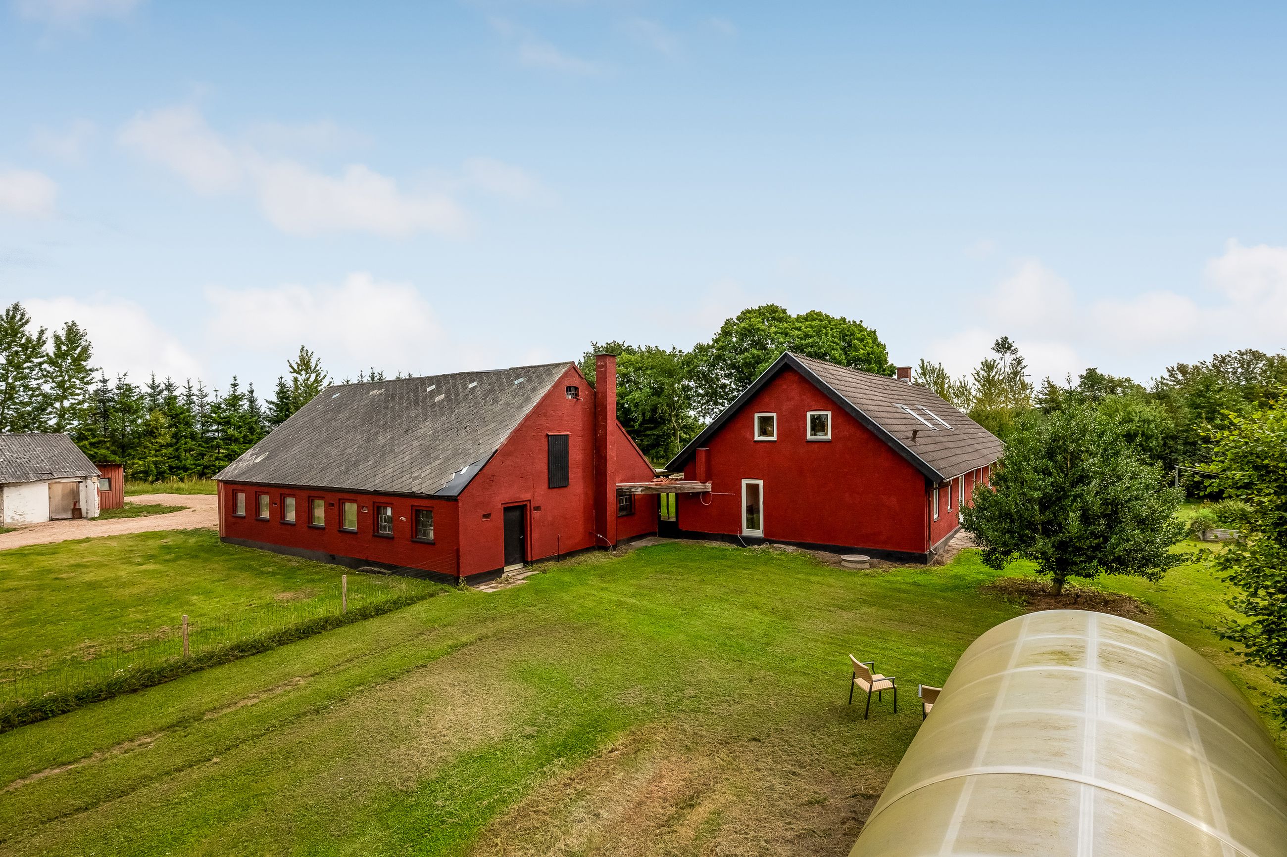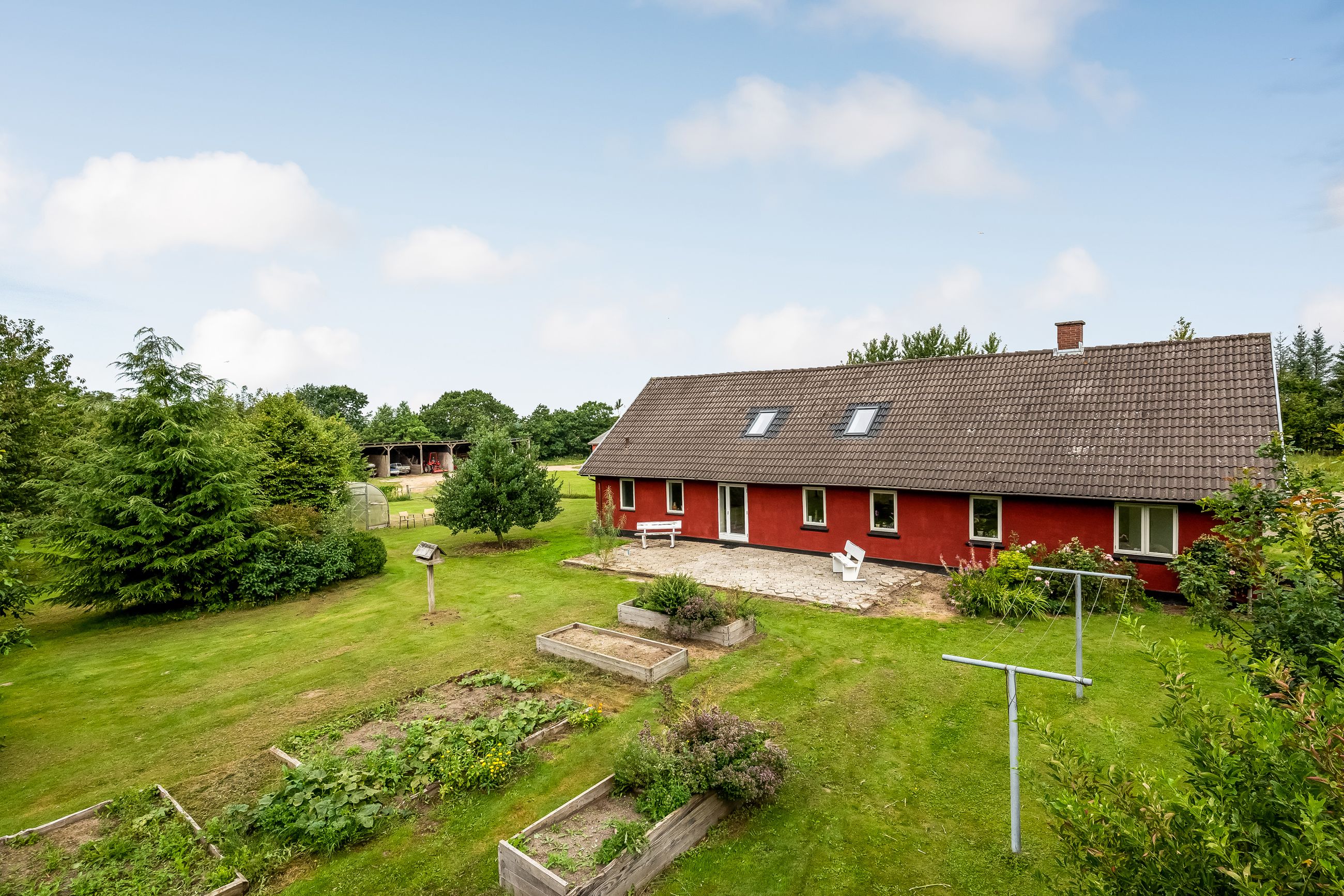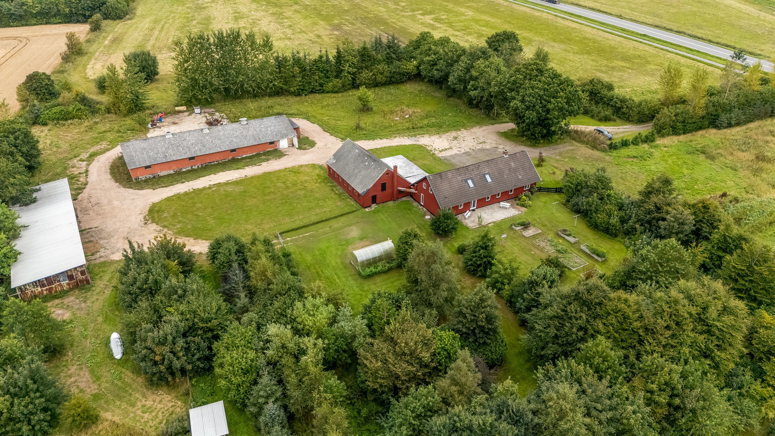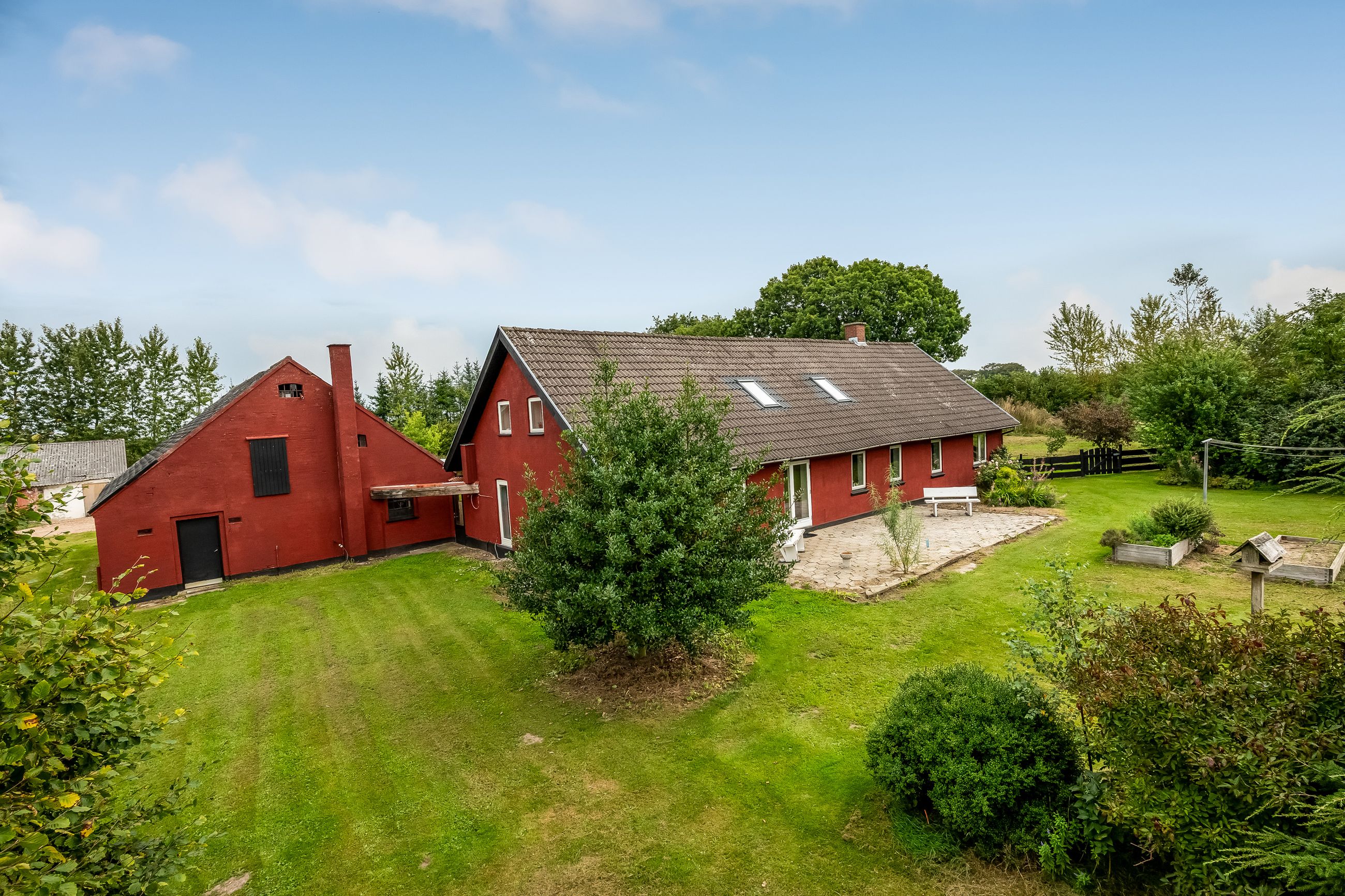 Udenfor fortsætter eventyret med en vidtstrakt have foran huset samt cirka to hektar jord udlagt til vildtvoksende natur med brede gangstier – ideelt for naturelskere eller dem med grønne fingre. De brugbare udbygninger giver yderligere fleksibilitet; måske har du altid drømt om din egen hestefold?