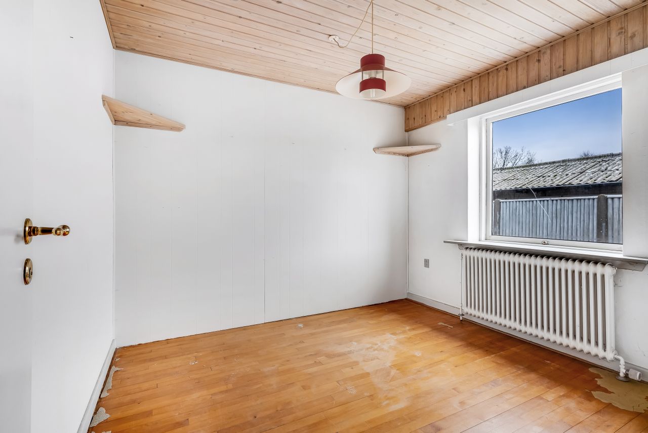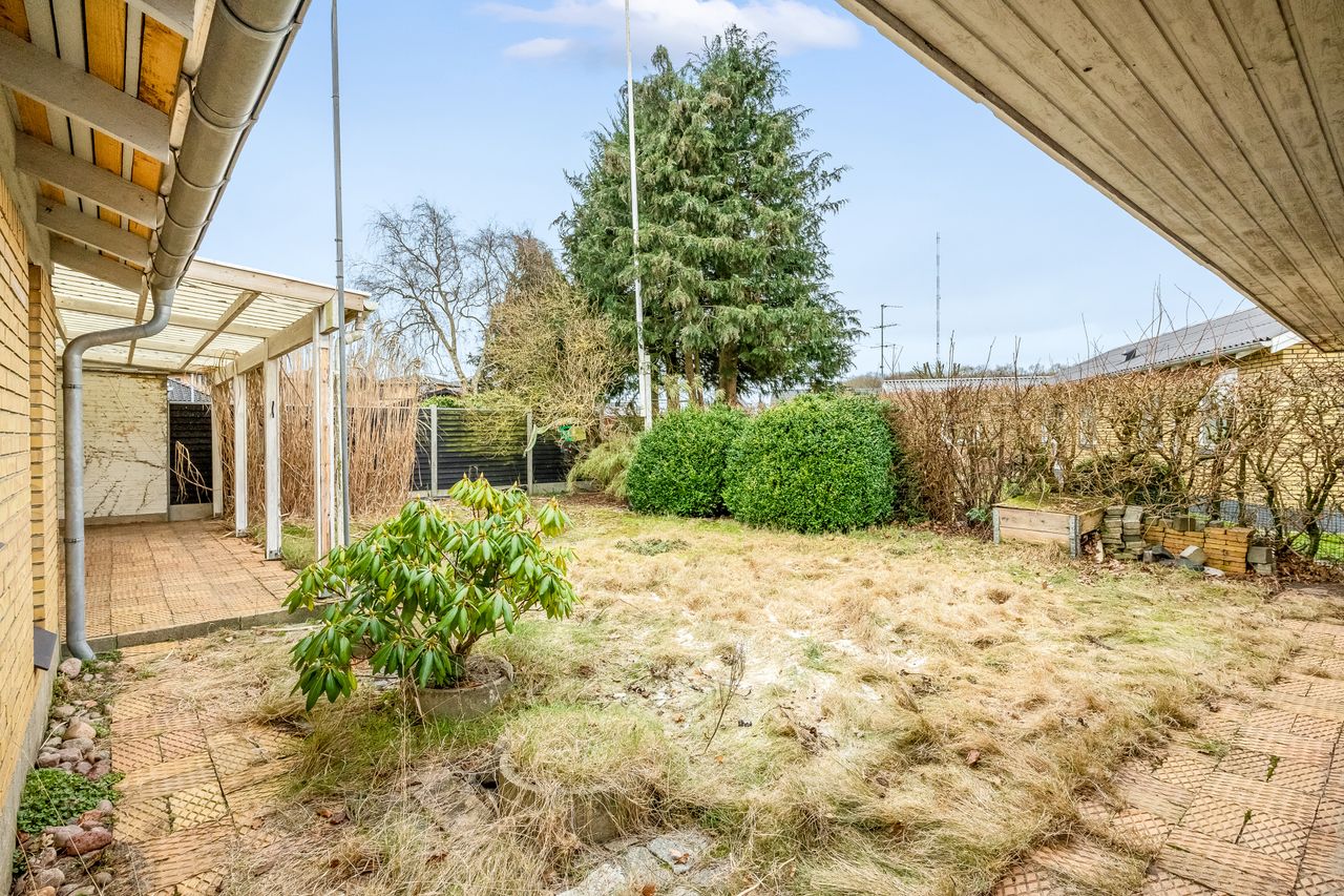 Udenfor finder du en dejlig lukket have med potentiale for at skabe et charmerende gårdhavemiljø – perfekt til børneleg eller havefester. Derudover rummer ejendommen en stor garage med plads til værksted; ideelt for den handy person eller hobbyentusiasten.