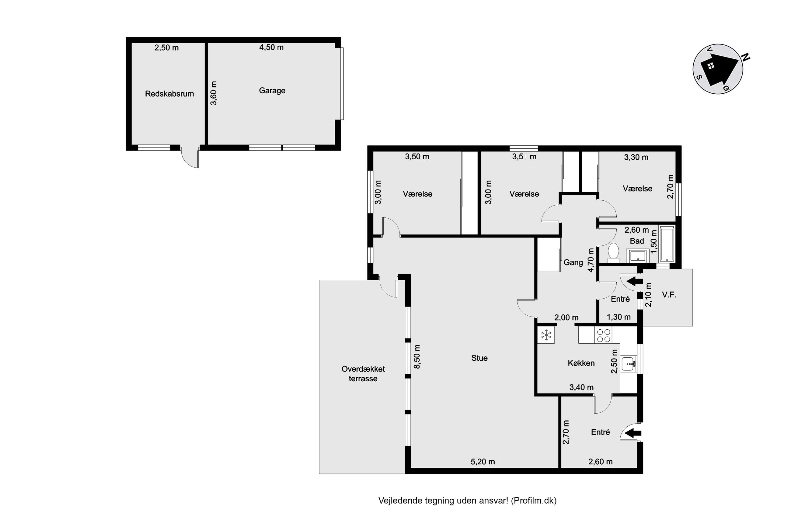 Huset er opført med tre rummelige soverum, der giver plads til hele familien eller muligheden for hjemmekontor. Den store stue er hjertet i huset og inviterer til hyggelige stunder med familie og venner. Fra stuen er der direkte udgang til en overdækket terrasse, hvor man kan nyde de lune sommeraftener eller en kop kaffe om morgenen året rundt.