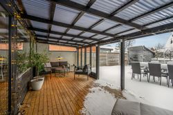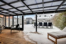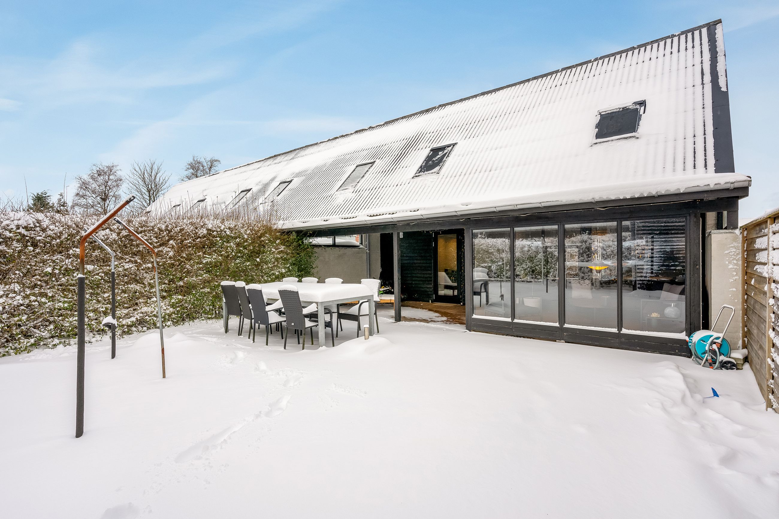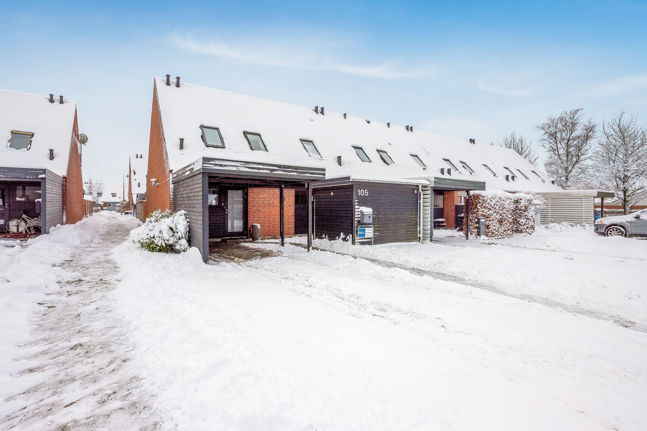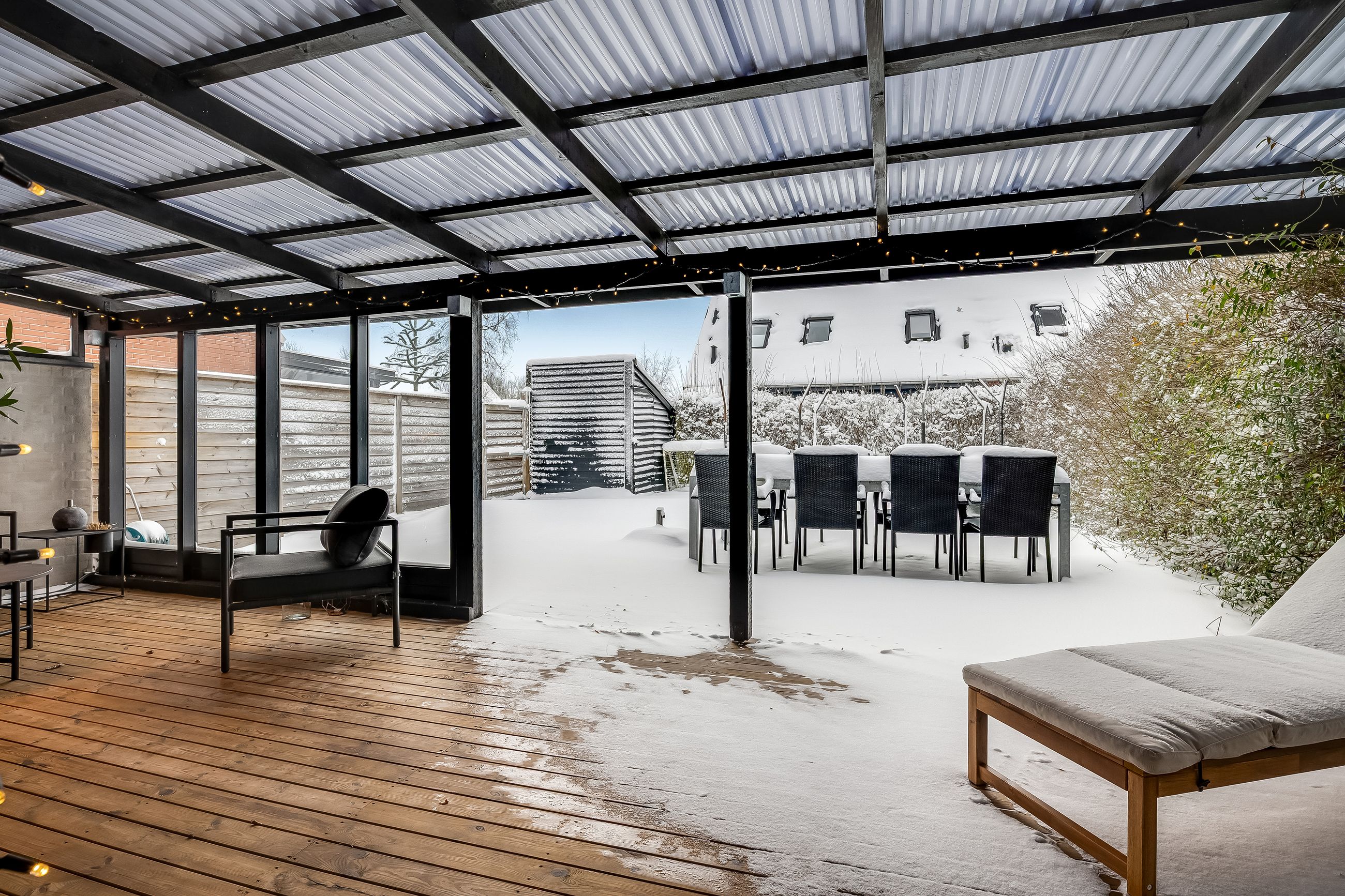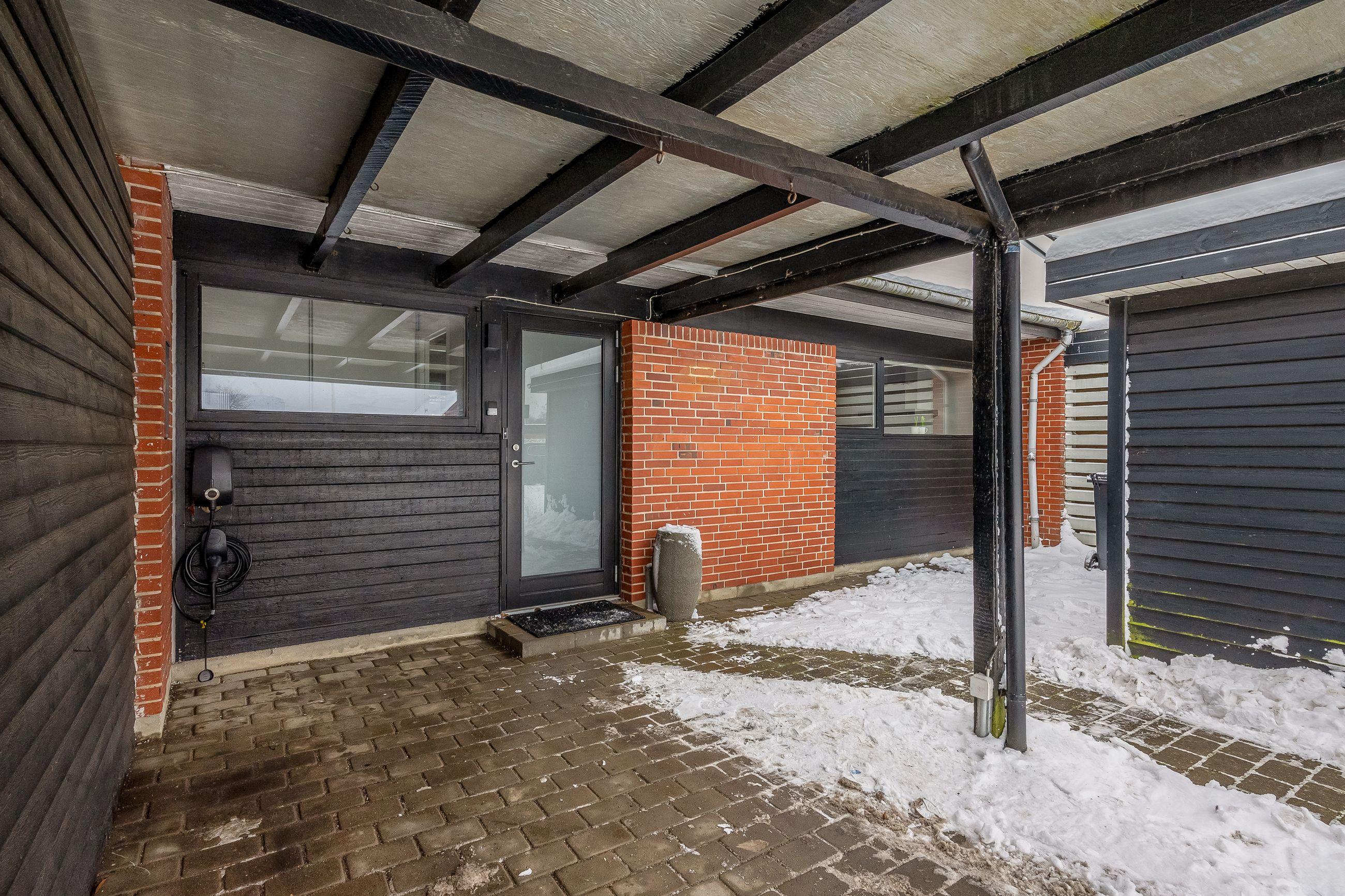 Udenfor venter nemt anlagte udearealer med flisebelægning samt en carport og udhus til opbevaring af haveredskaber eller cykler. Den overdækkede terrasse fungerer som en naturlig forlængelse af stuen og giver mulighed for at nyde udelivet året rundt.