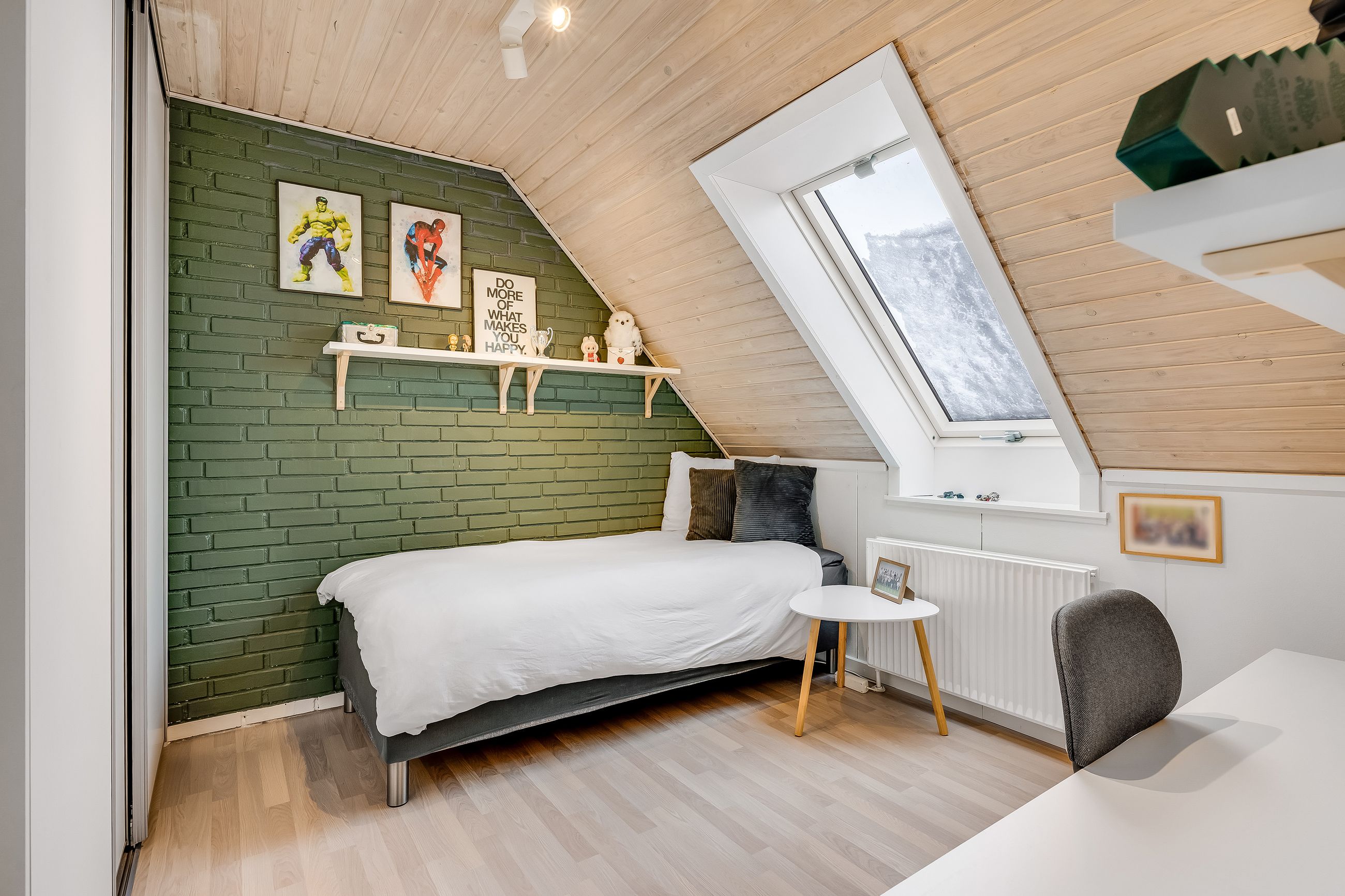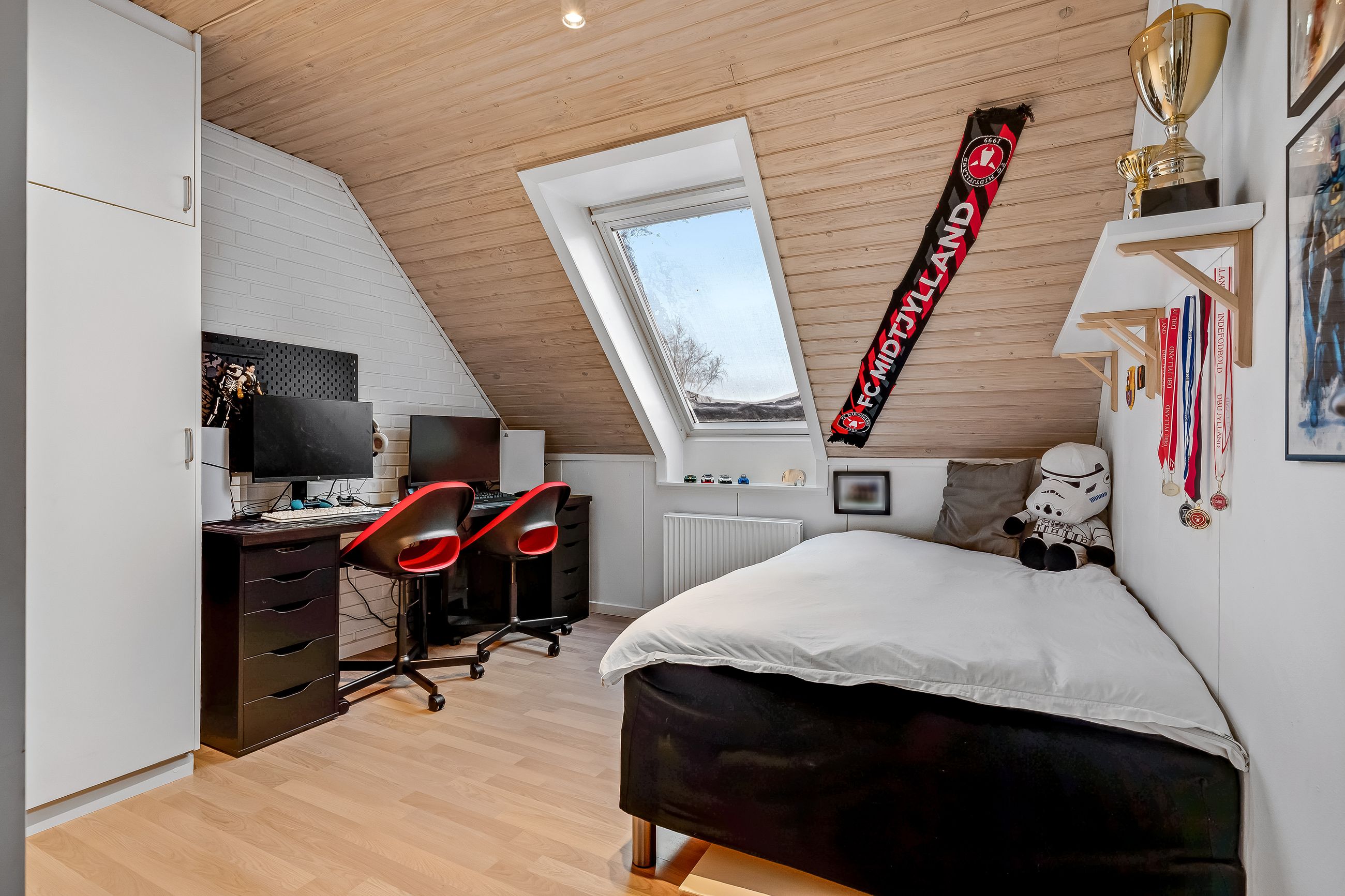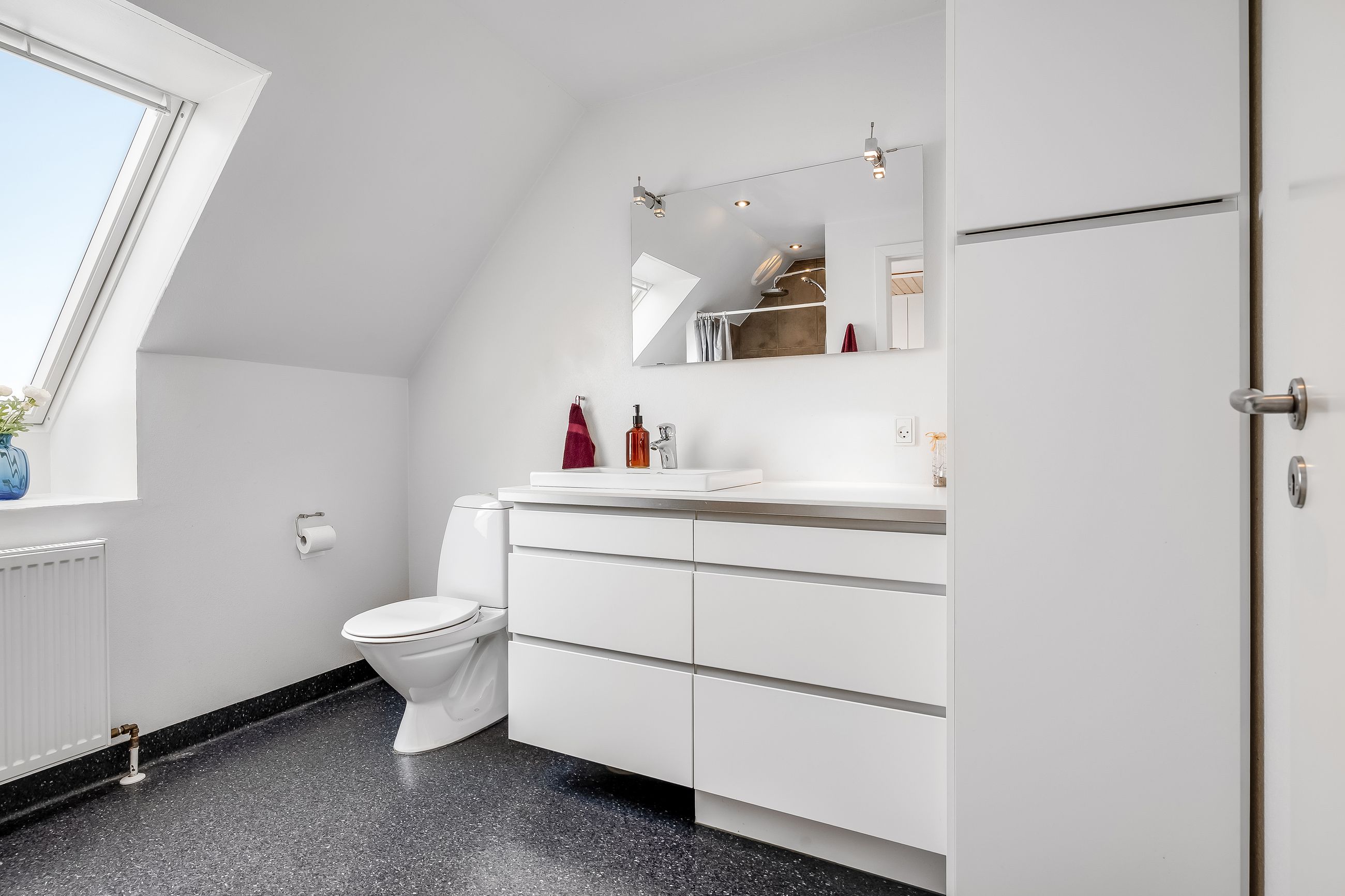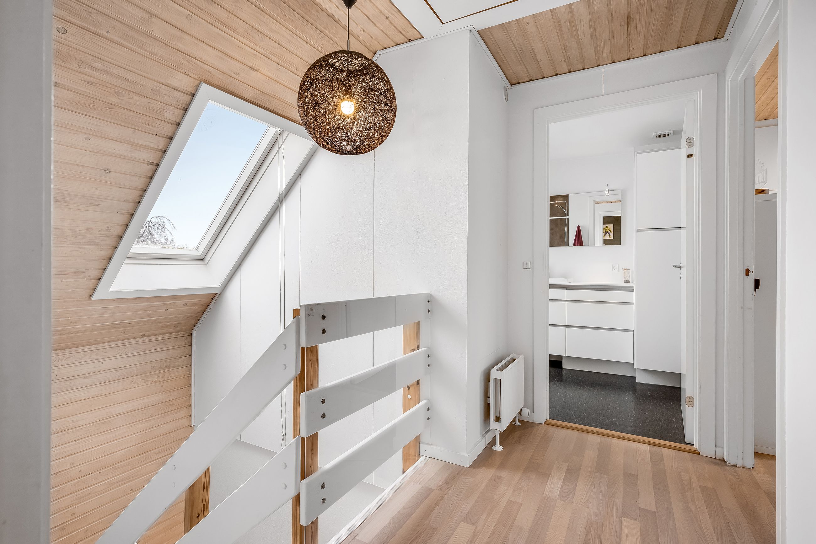 På første sal finder du en repos, der leder dig videre til et stort soveværelse samt to yderligere værelser – perfekt for børnefamilien eller dem, der ønsker ekstra kontor- eller hobbyrum. Badeværelset på denne etage er blevet moderniseret med sans for detaljer og funktionalitet.