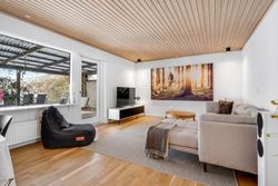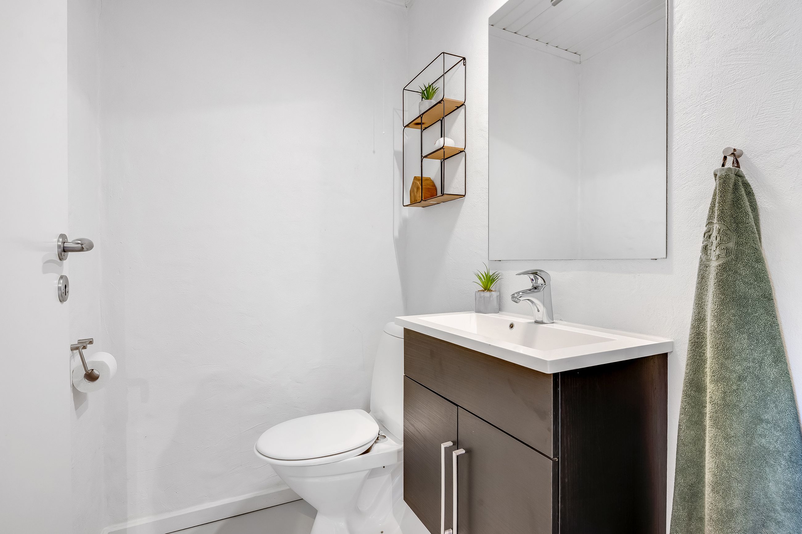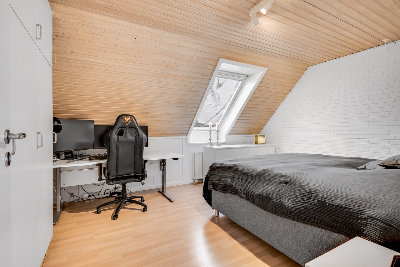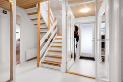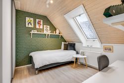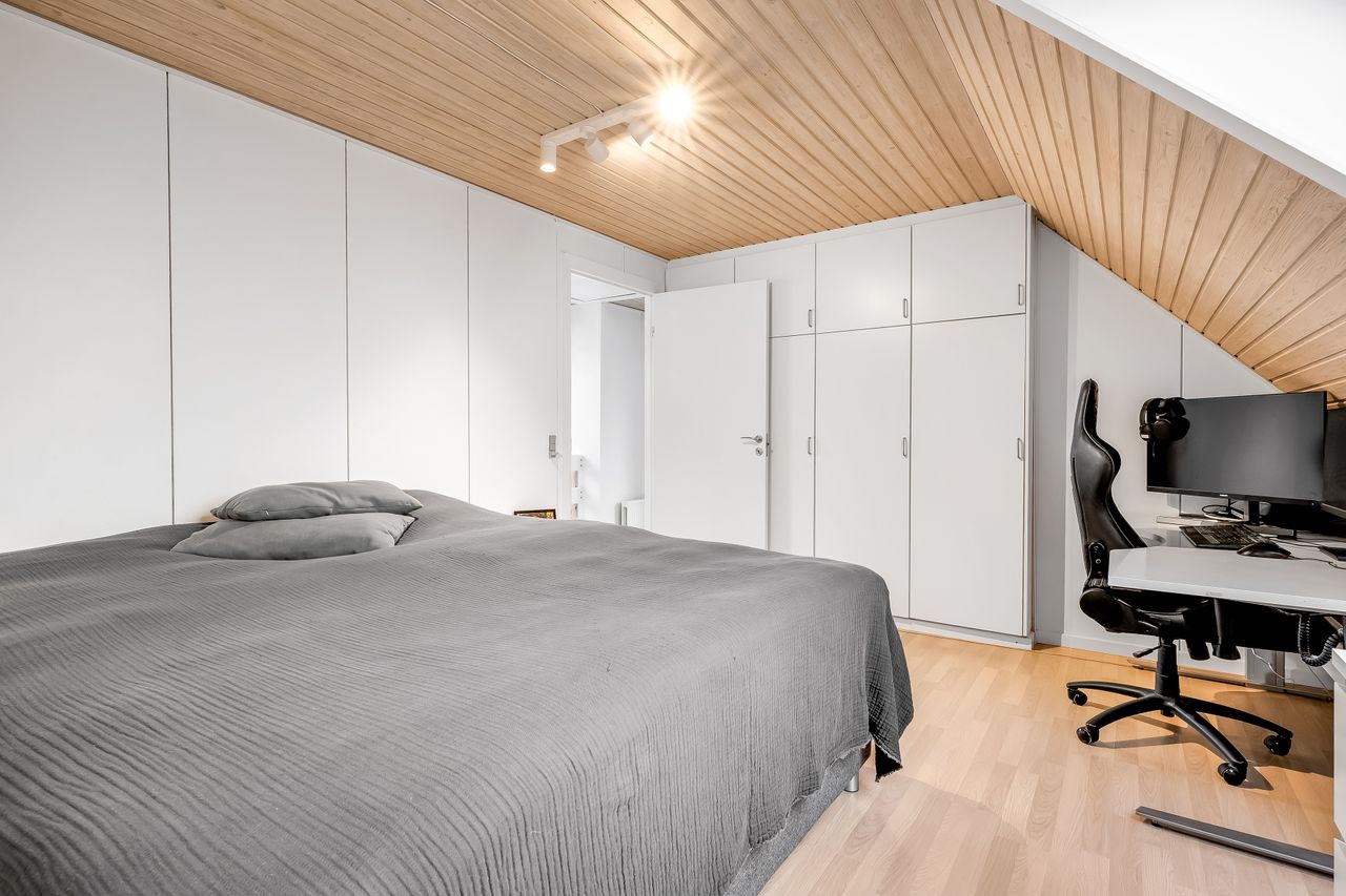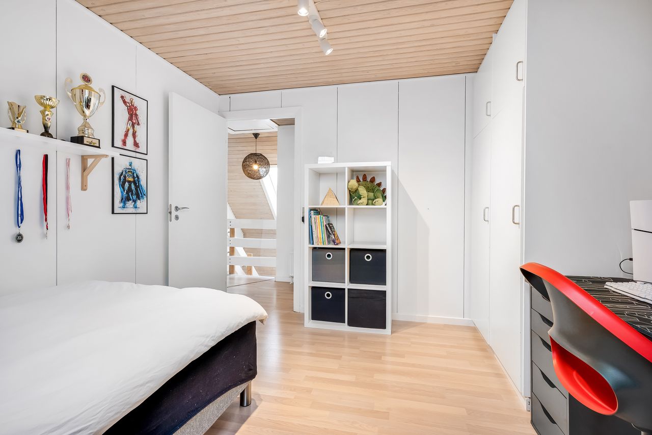 På første sal finder du en repos, der leder dig videre til et stort soveværelse samt to yderligere værelser – perfekt for børnefamilien eller dem, der ønsker ekstra kontor- eller hobbyrum. Badeværelset på denne etage er blevet moderniseret med sans for detaljer og funktionalitet.