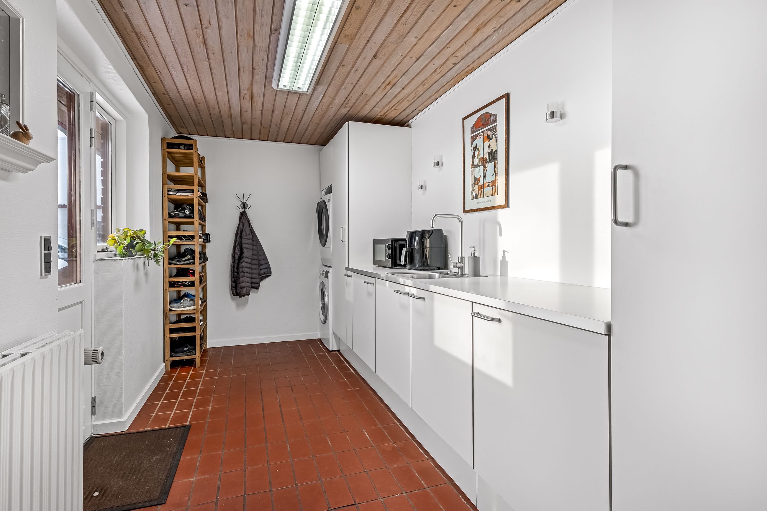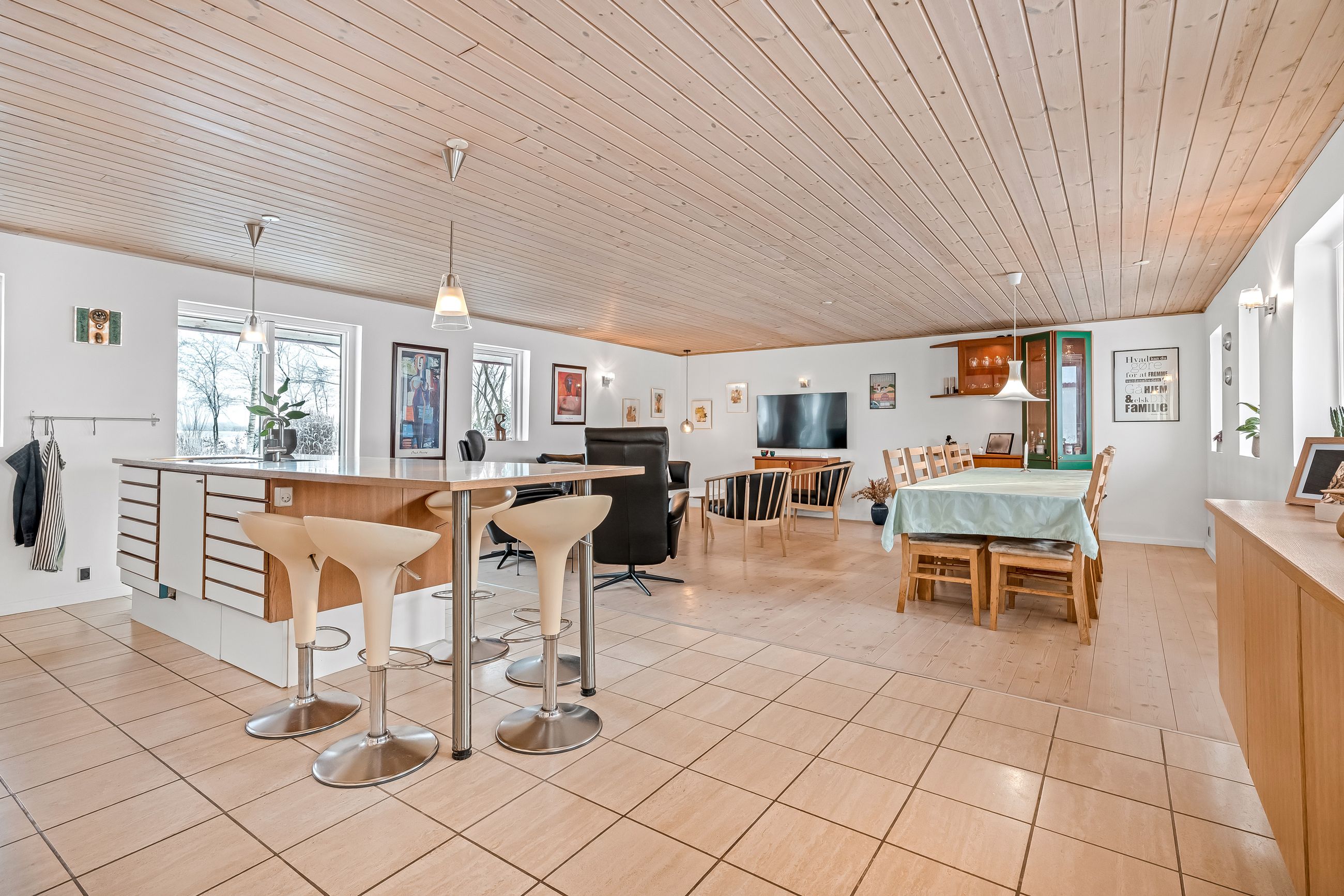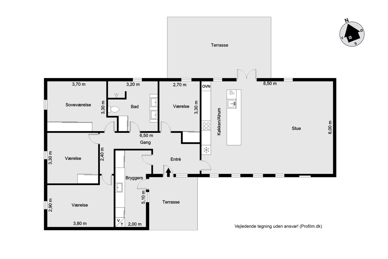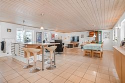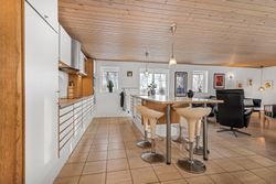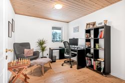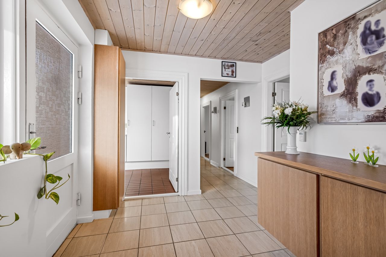Indenfor byder ejendommen på et praktisk bryggers og en indbydende entre, der leder videre til det store lyse køkken/alrum/stue. Dette område er hjertet af hjemmet med sit gode lysindfald og åbne forbindelse mellem madlavning og ophold. Derudover rummer huset tre rummelige værelser samt et soveværelse, perfekt for familien eller som kontorplads. Badeværelset er funktionelt indrettet med bruseniche.