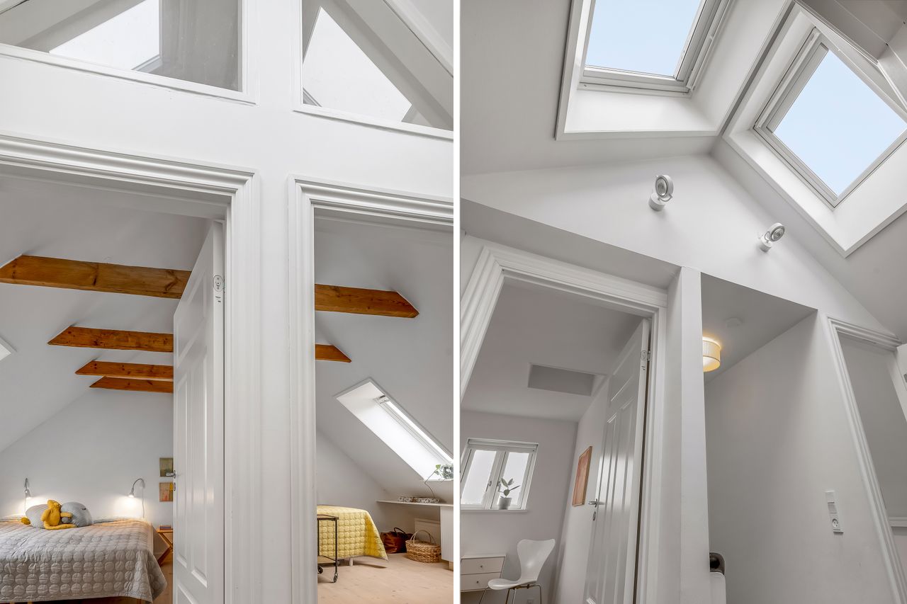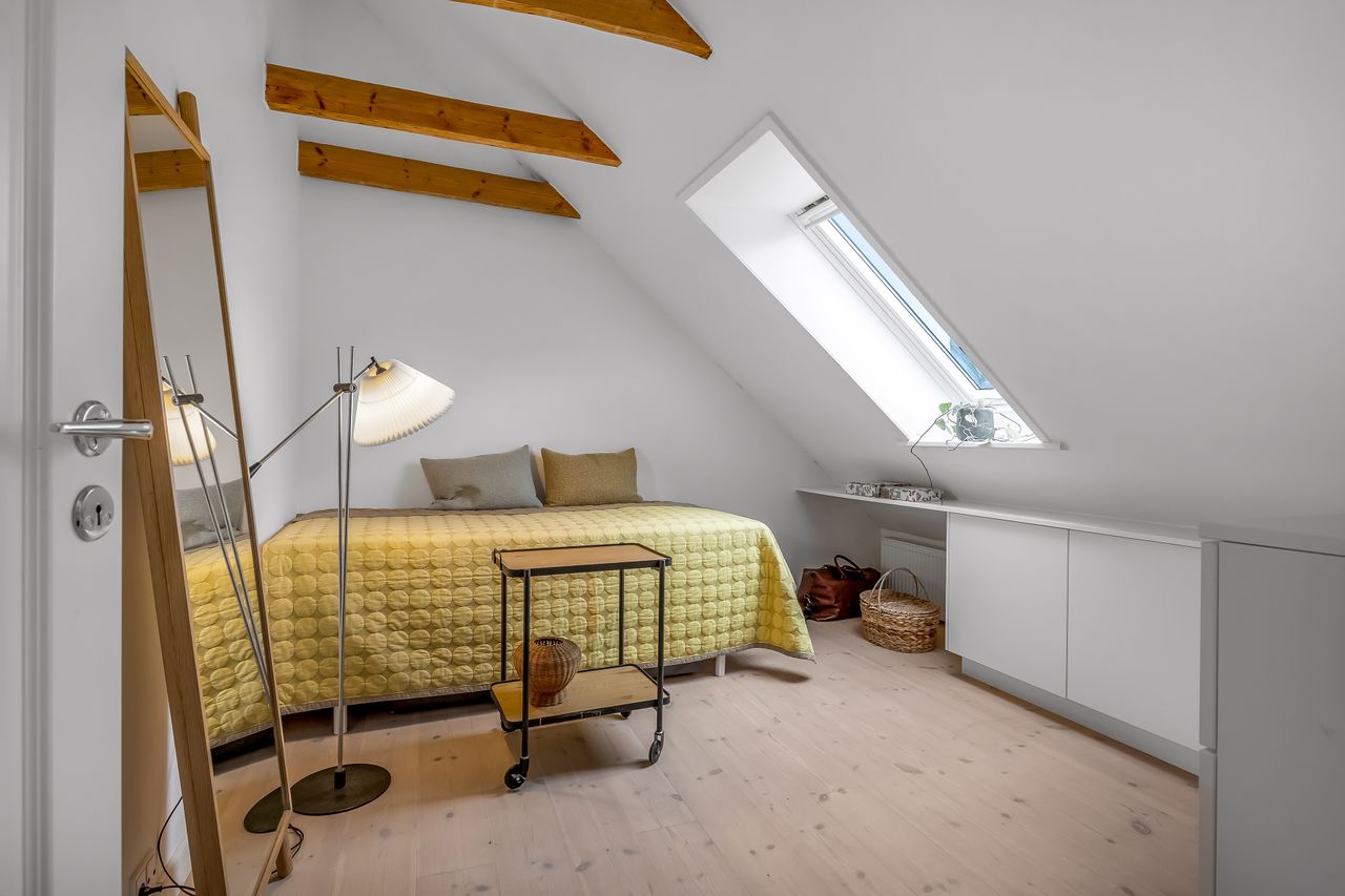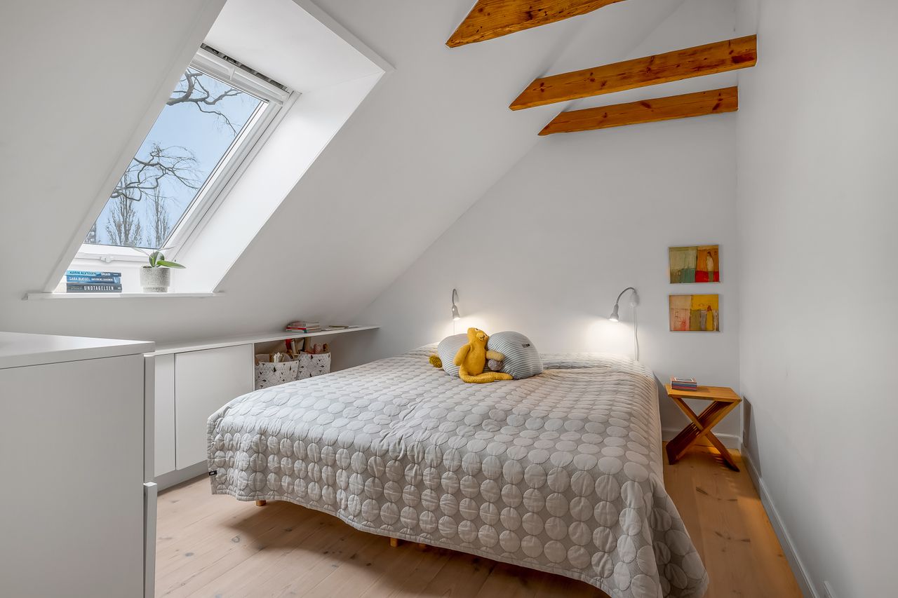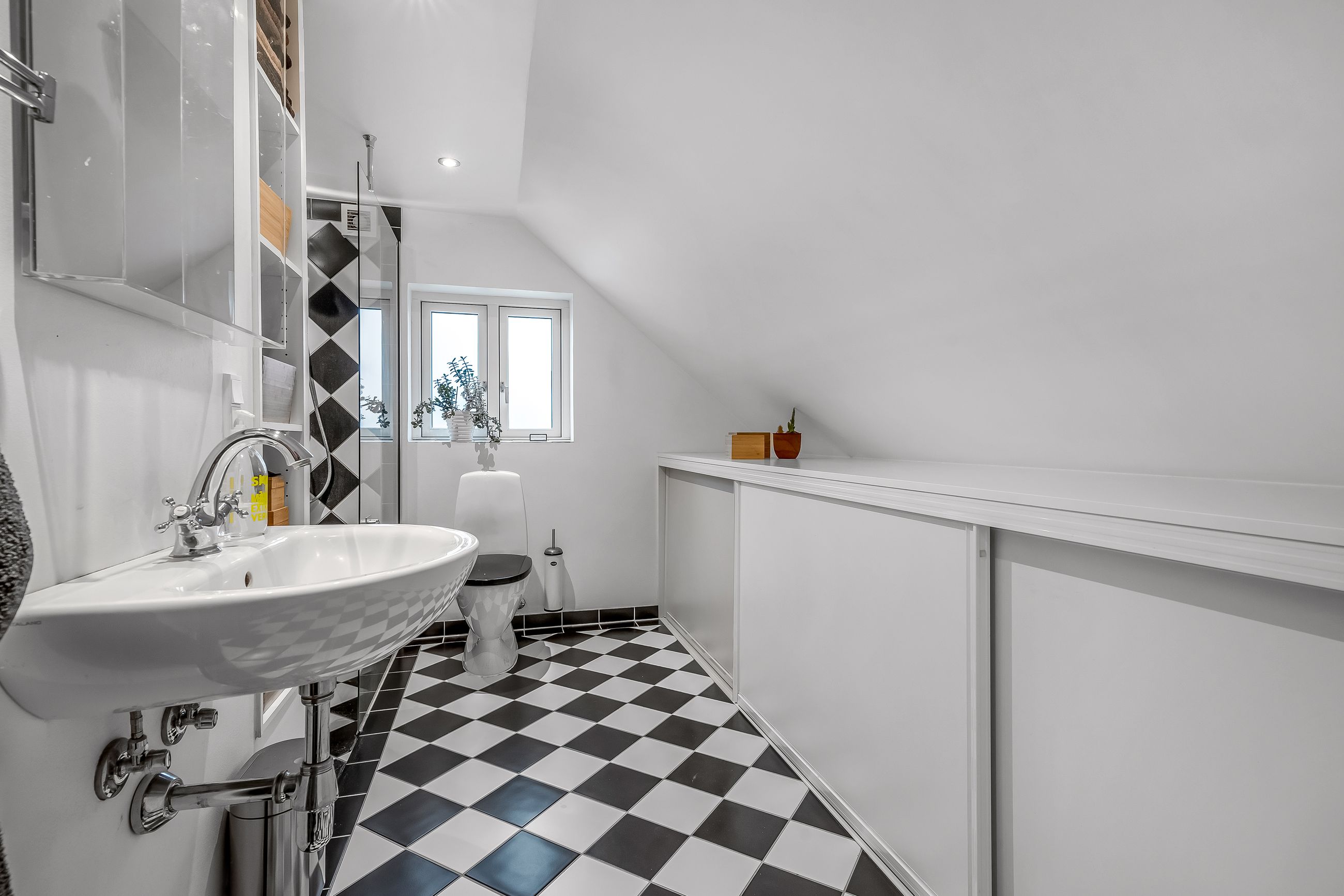 På første sal finder du et soveværelse samt to ekstra værelser – perfekte som børneværelser eller gæsteværelser. Badeværelset er moderne indrettet med både vaskemaskine og tørretumbler for maksimal bekvemmelighed. Loftet til kip og ovenlysvinduerne skaber en lys og luftig atmosfære.