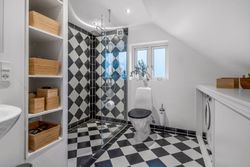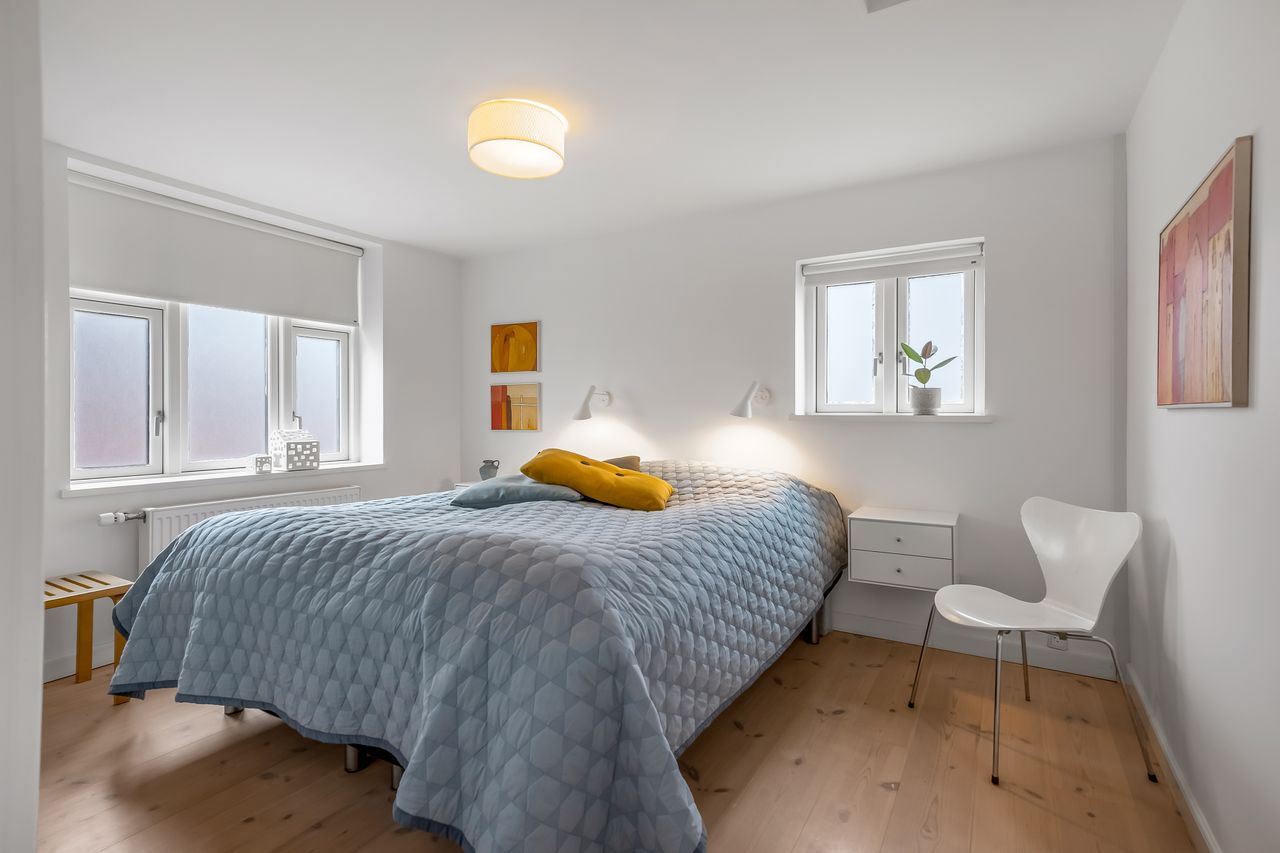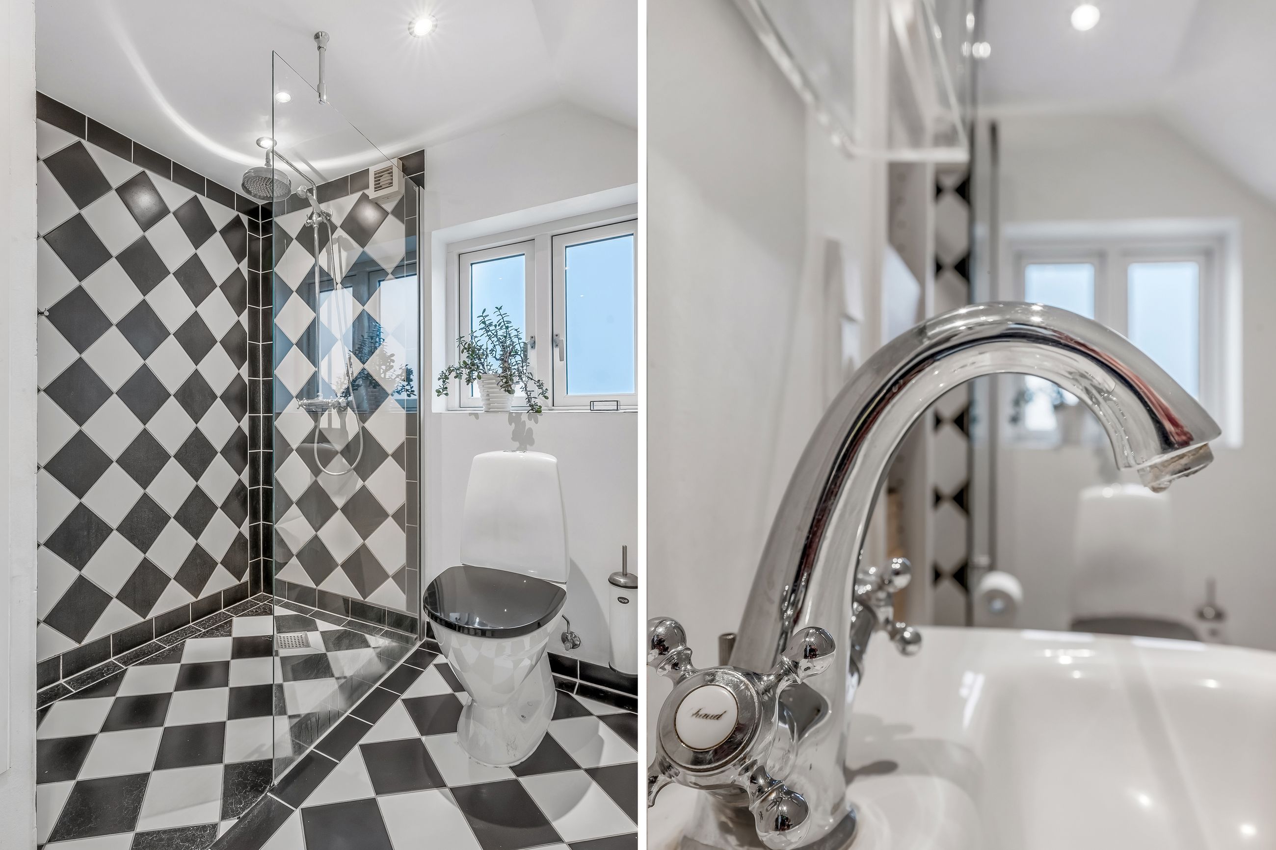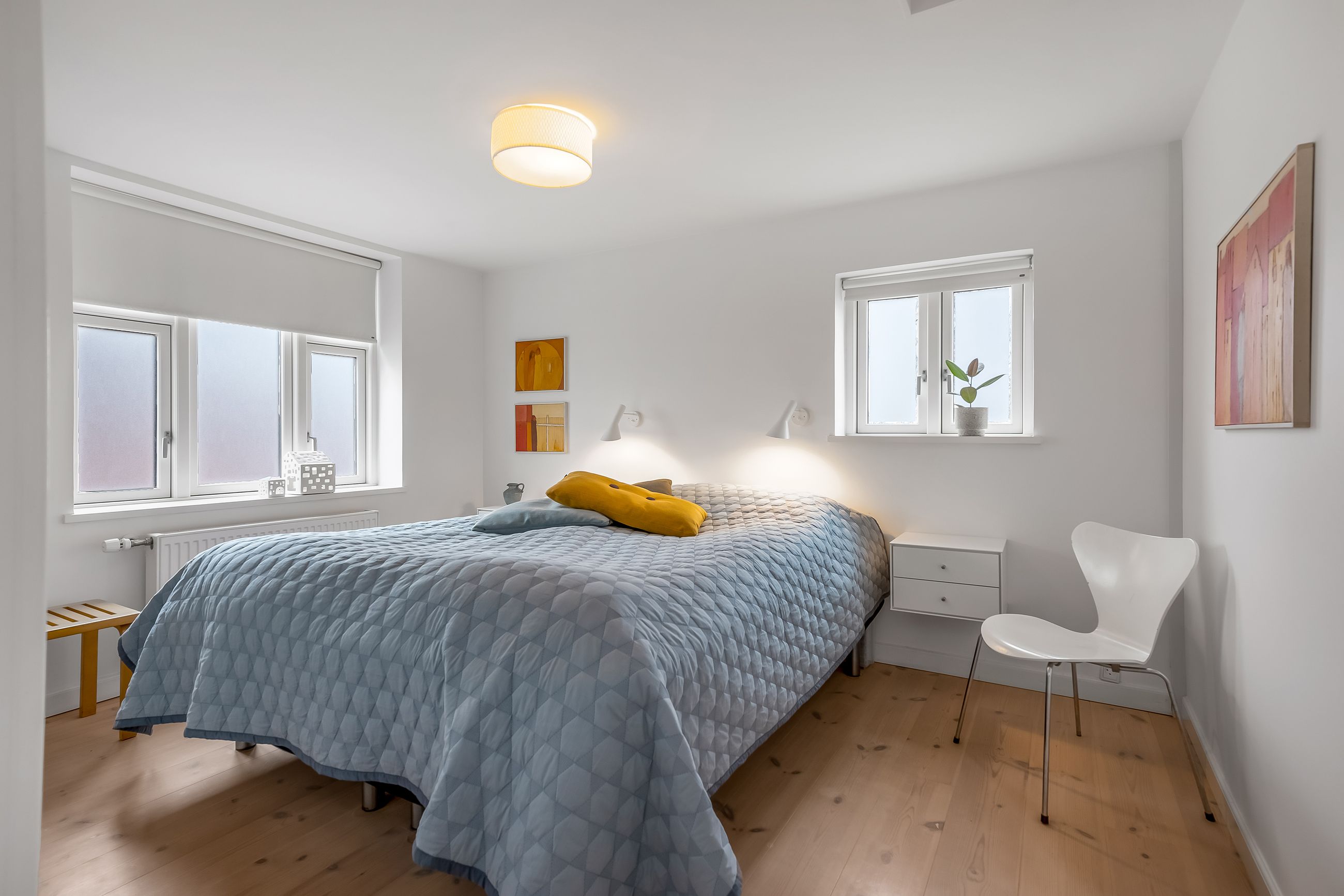 På første sal finder du et soveværelse samt to ekstra værelser – perfekte som børneværelser eller gæsteværelser. Badeværelset er moderne indrettet med både vaskemaskine og tørretumbler for maksimal bekvemmelighed. Loftet til kip og ovenlysvinduerne skaber en lys og luftig atmosfære.