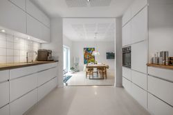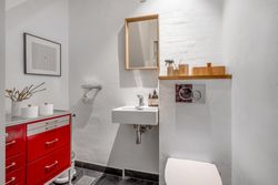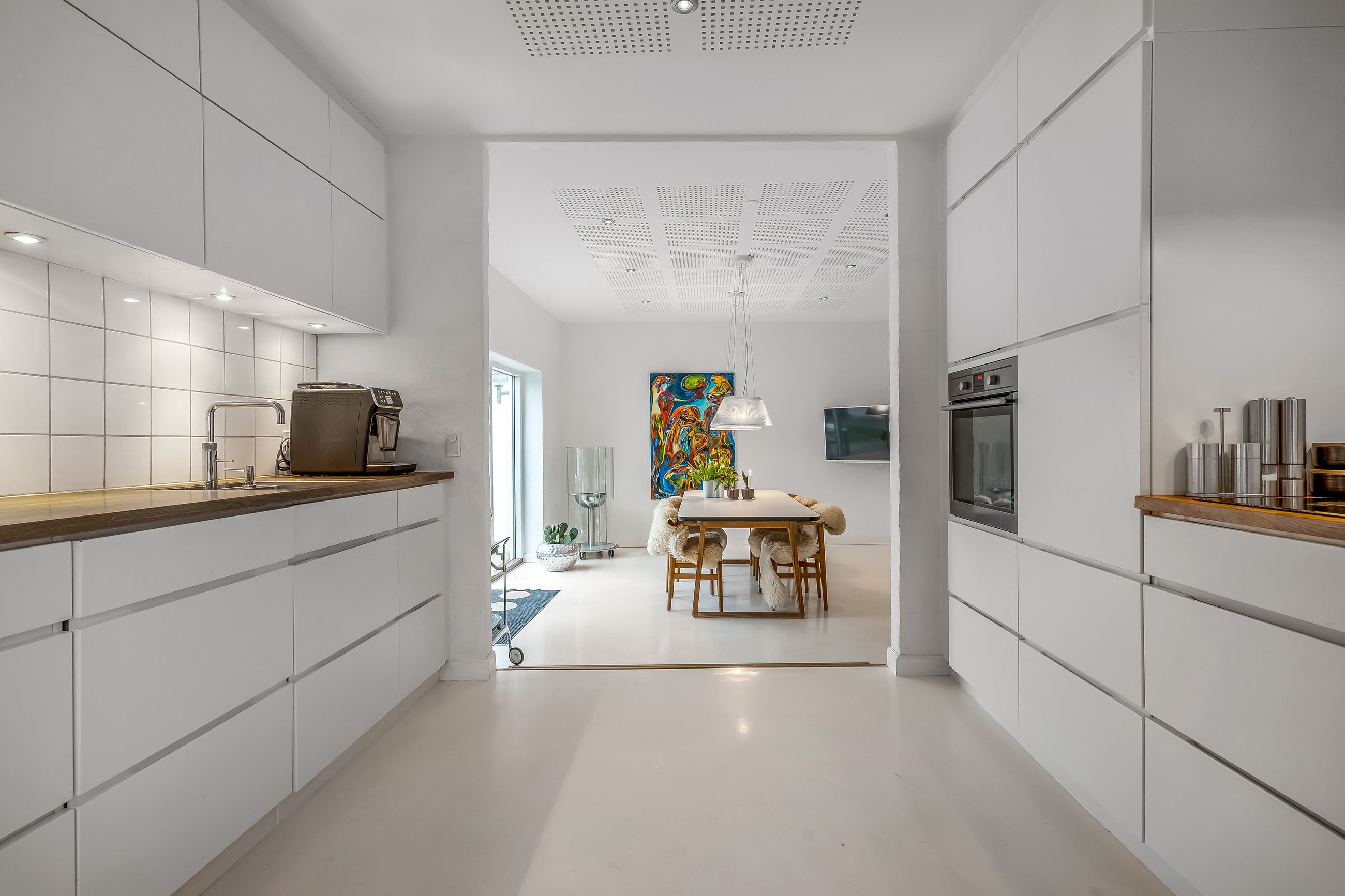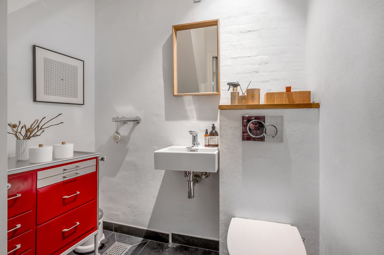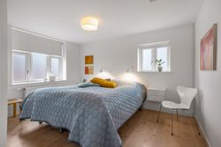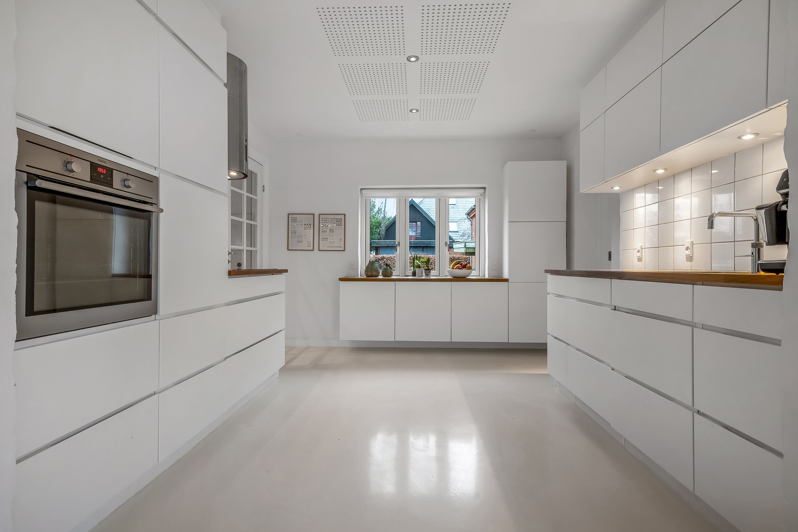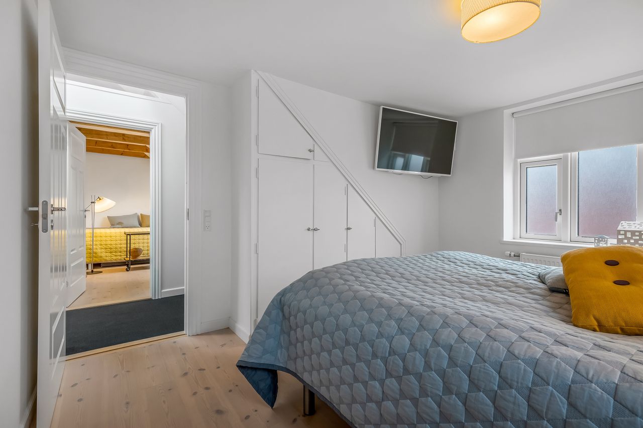 På første sal finder du et soveværelse samt to ekstra værelser – perfekte som børneværelser eller gæsteværelser. Badeværelset er moderne indrettet med både vaskemaskine og tørretumbler for maksimal bekvemmelighed. Loftet til kip og ovenlysvinduerne skaber en lys og luftig atmosfære.