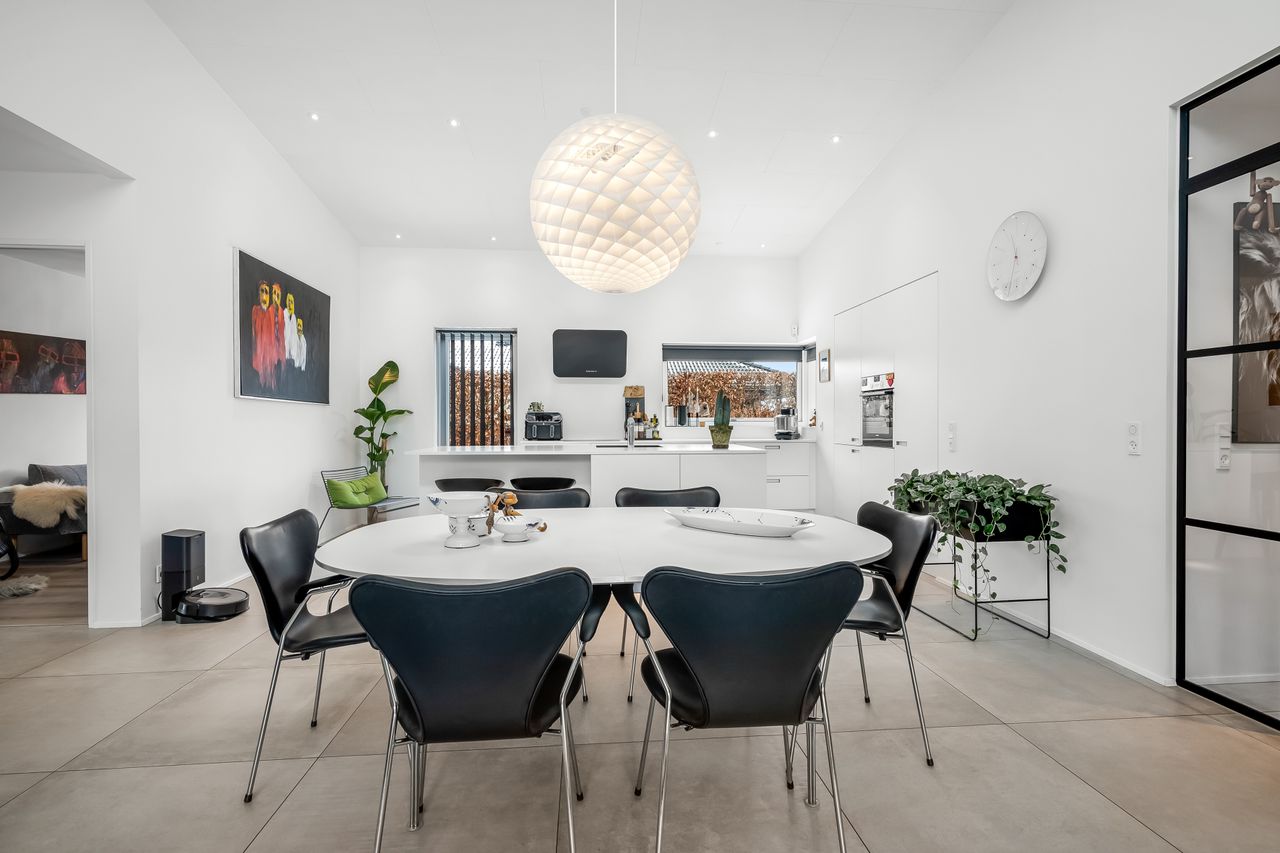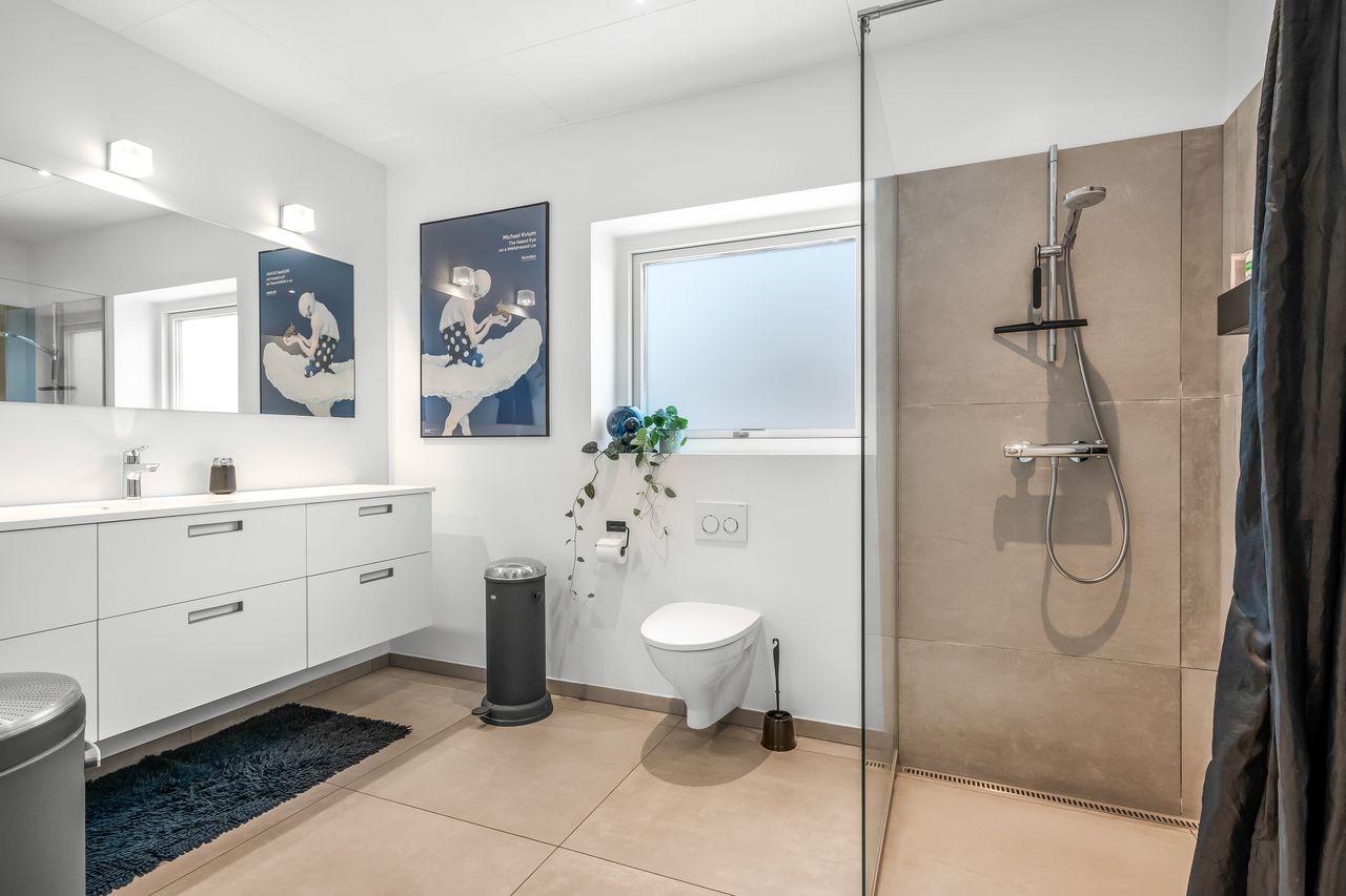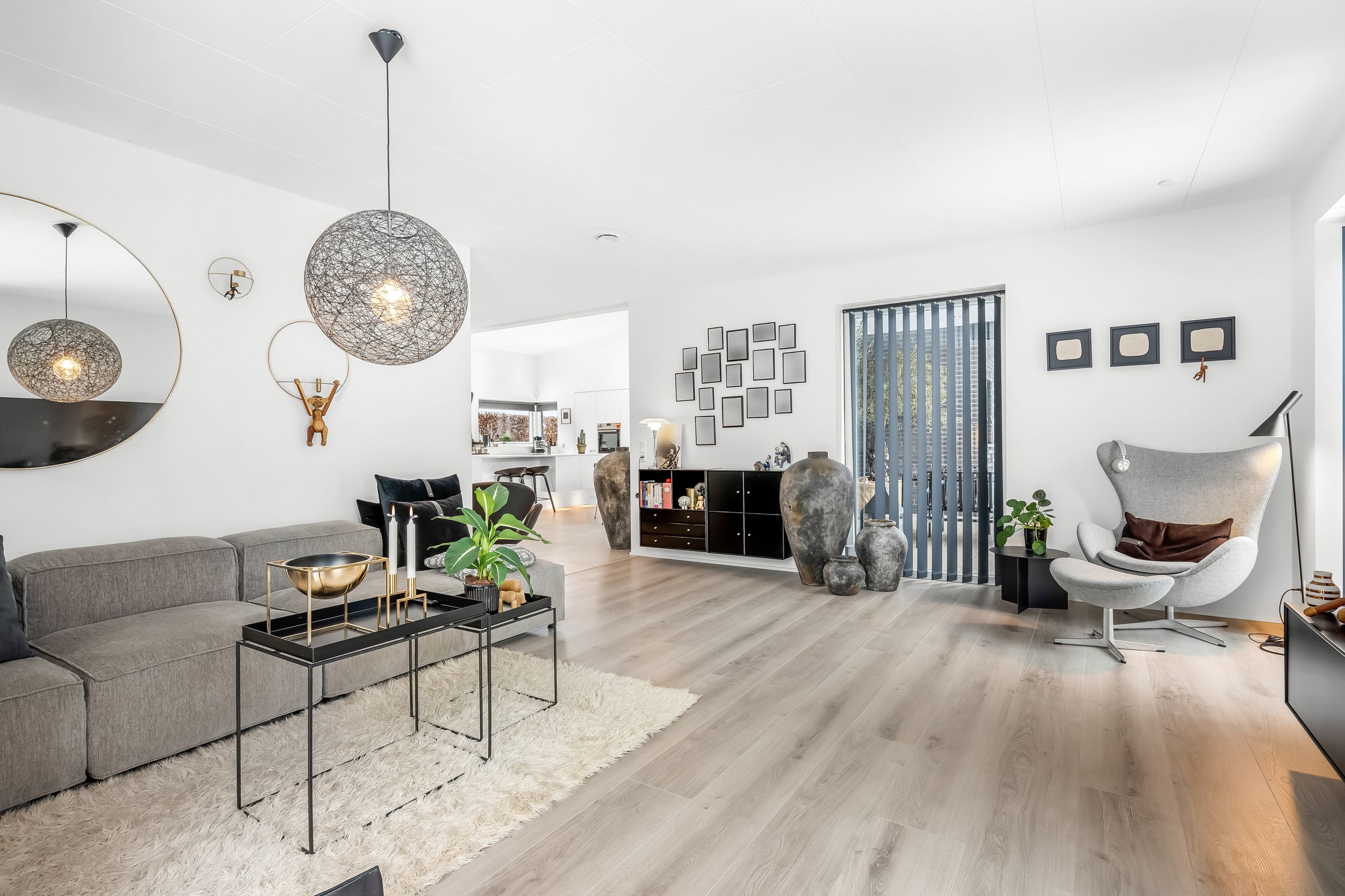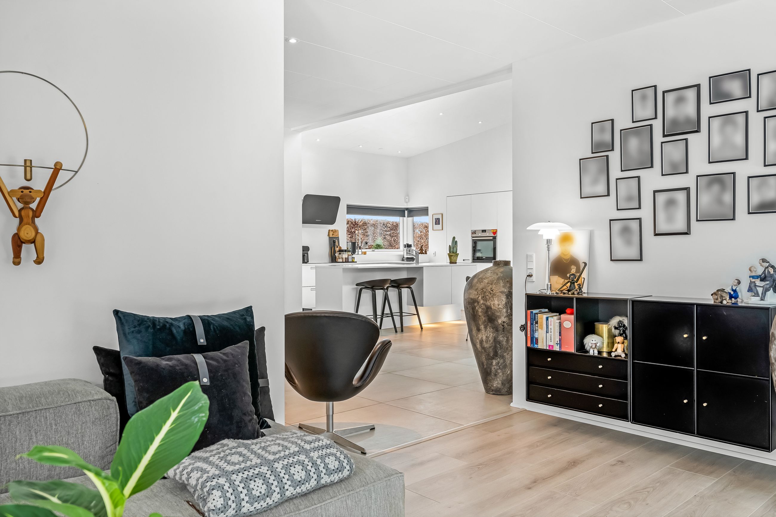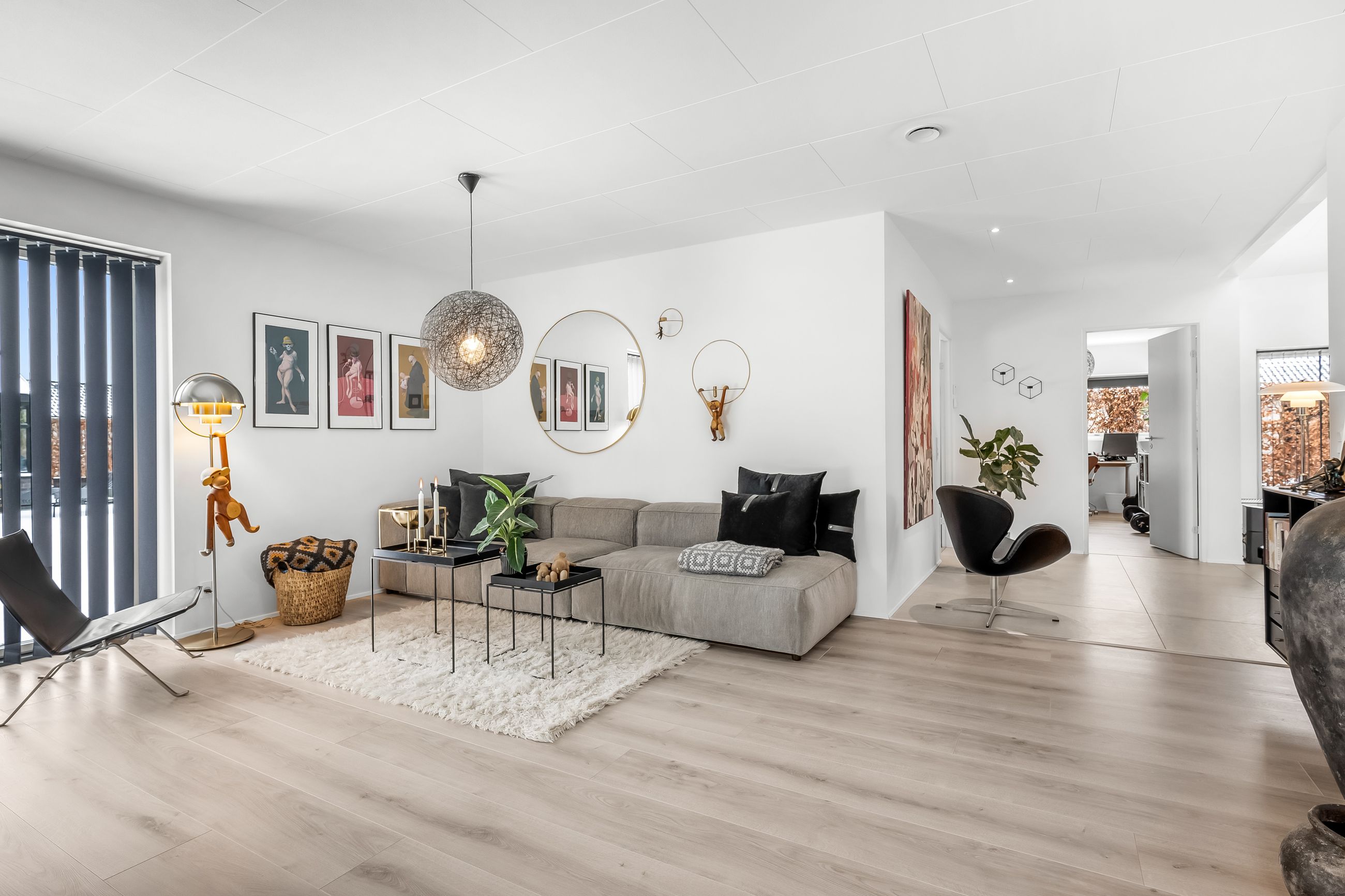 Villaen byder på 4 gode soverum fordelt på separate afdelinger. Det praktiske bryggers har god plads til opbevaring og depotrum, mens det åbne køkken/alrum imponerer med højt til loftet og praktisk viktualierum samt direkte udgang til en stor sydvendt overdækket gårdhave. Overalt i boligen er der Rockfon lofter der sikrer den gode akustik i hjemmet. Alt dette skaber de perfekte rammer for hyggelige familiemiddage eller afslapning efter en lang dag.