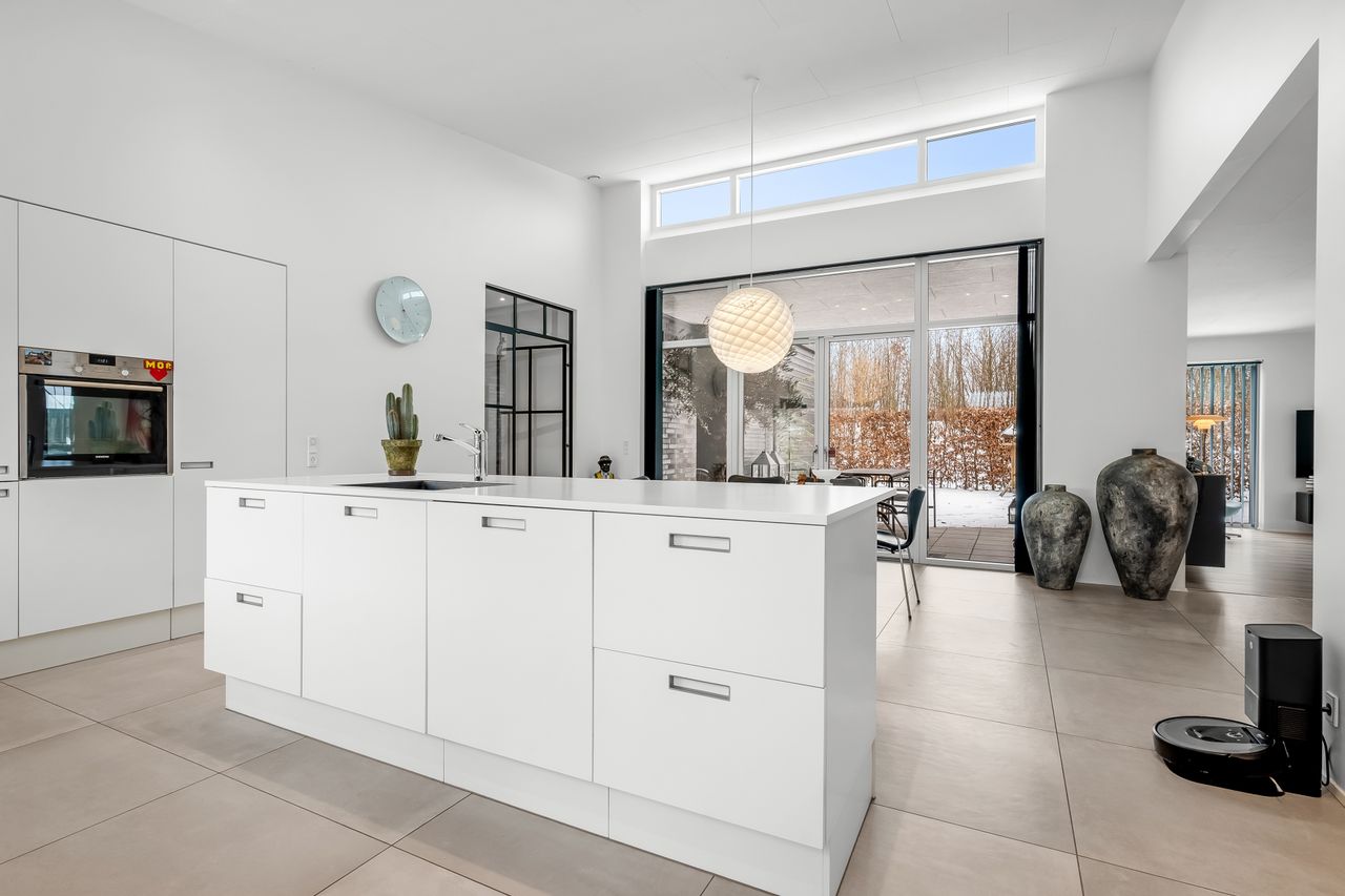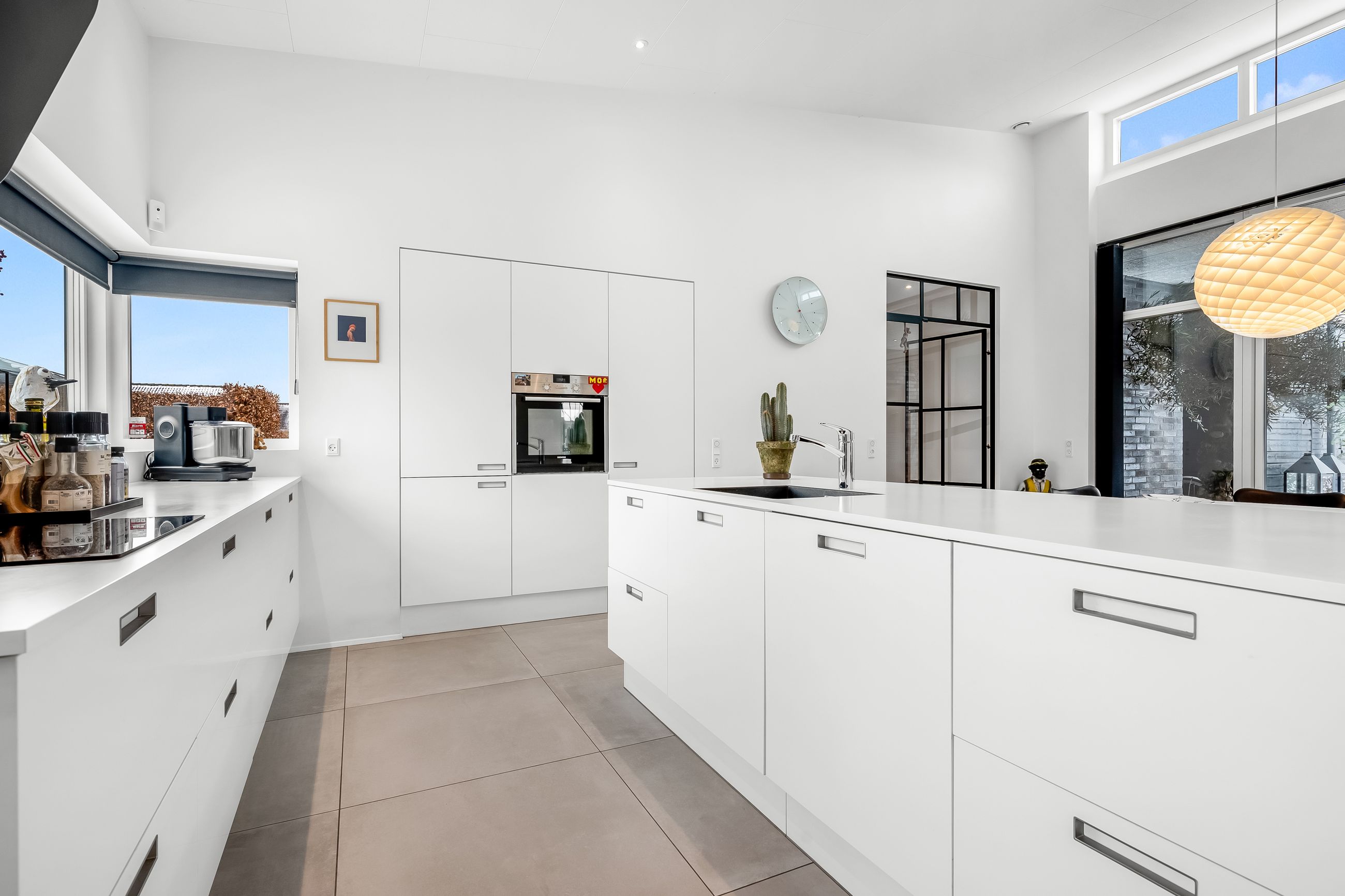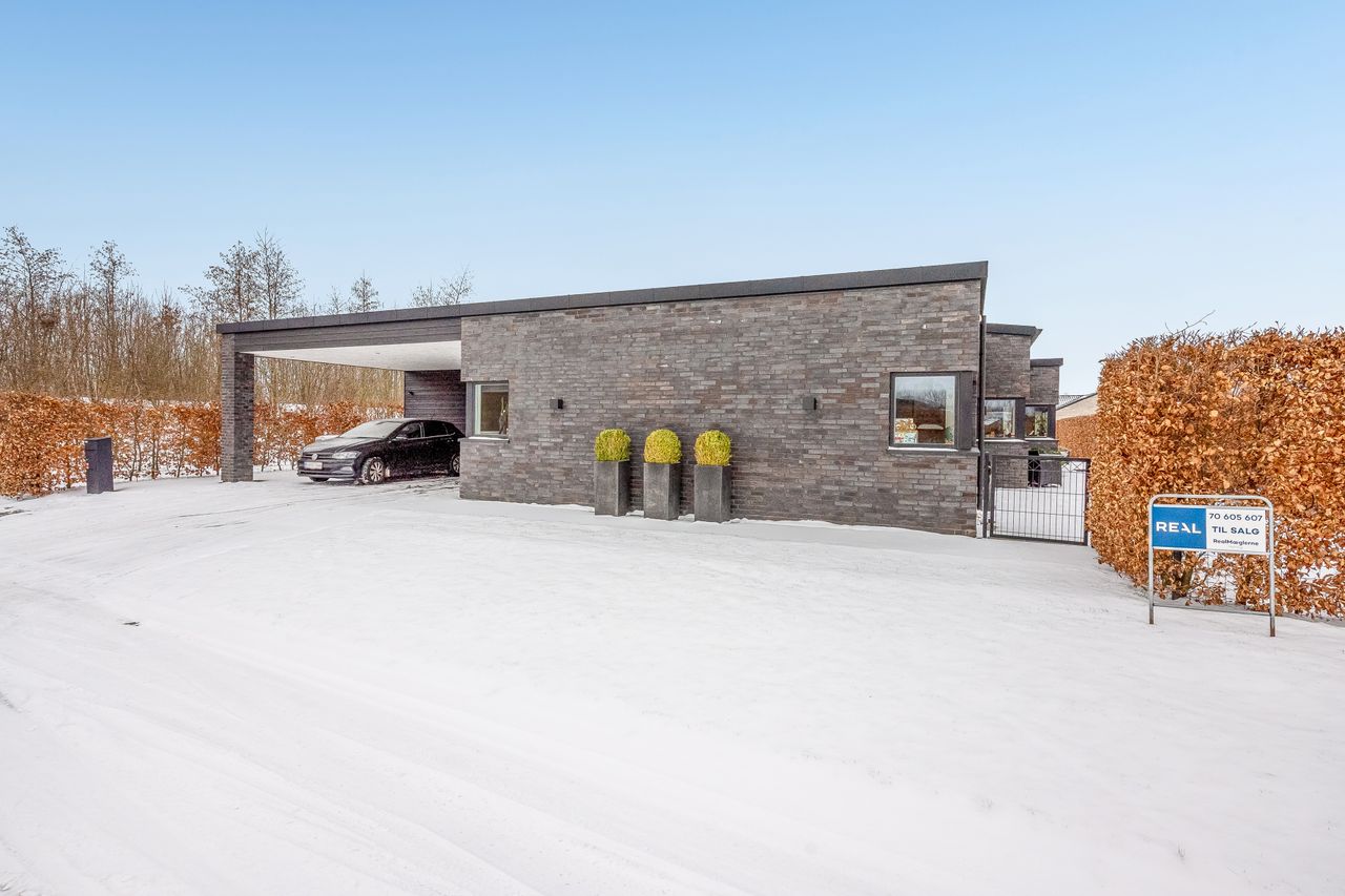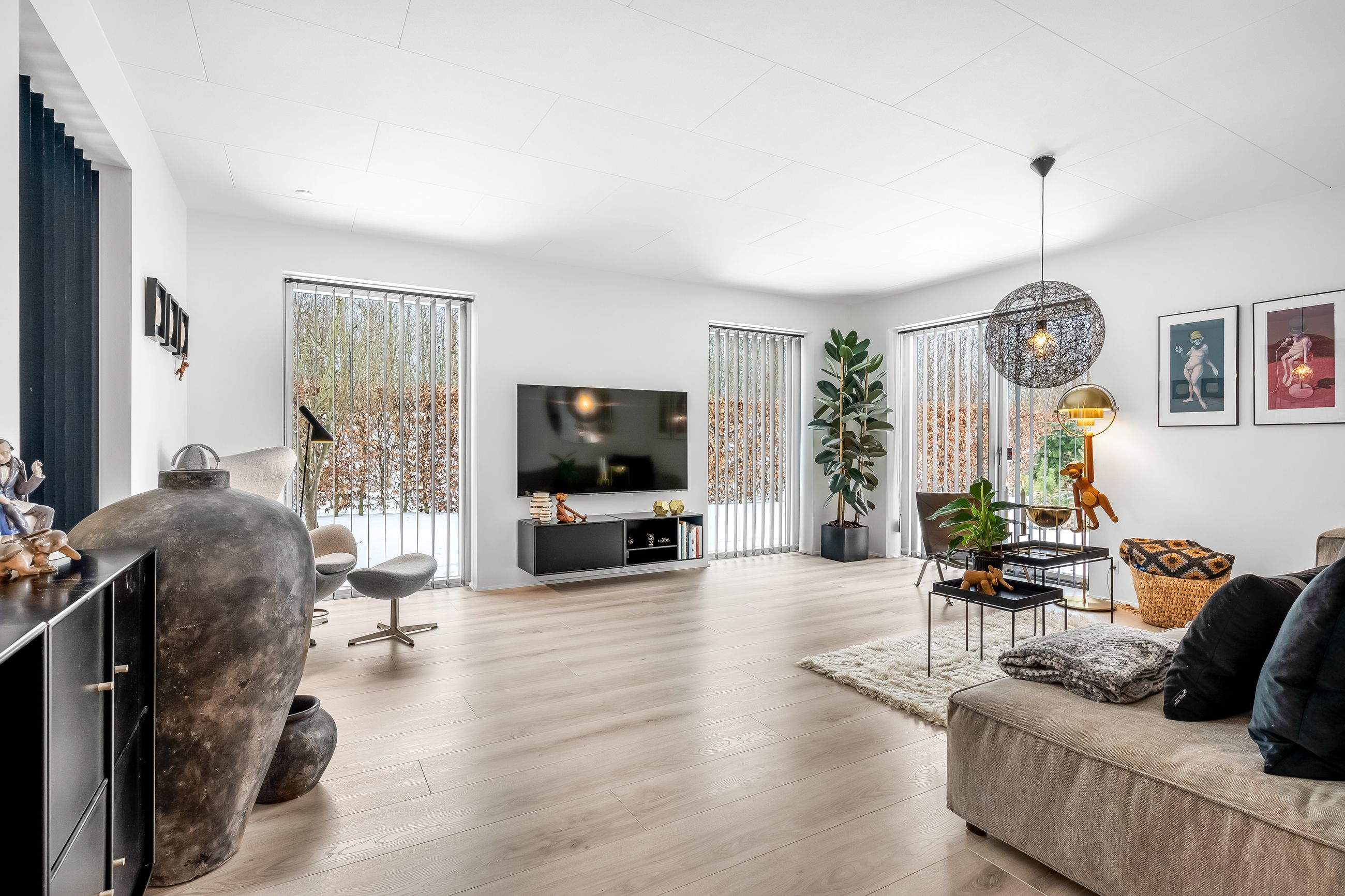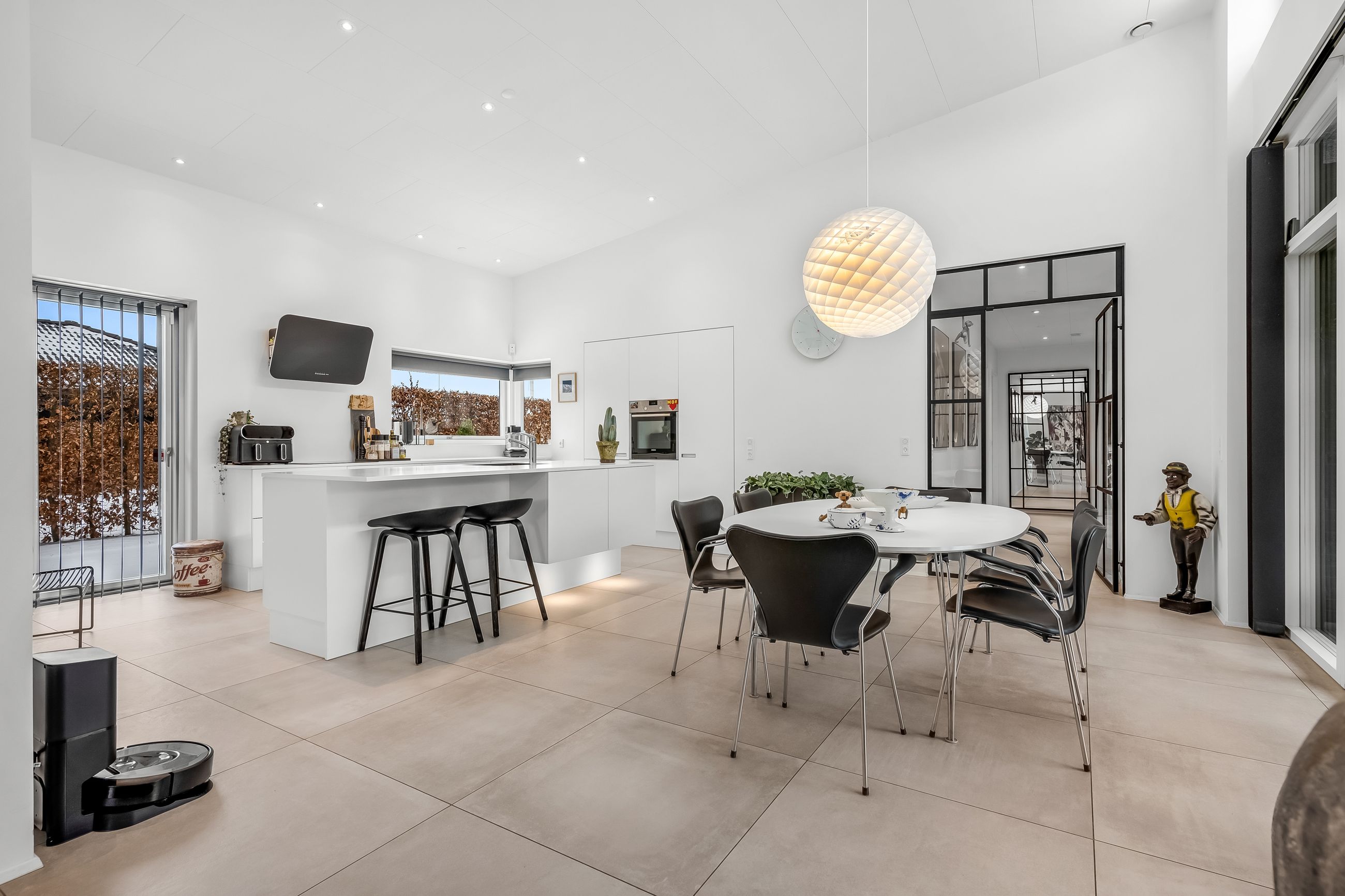 Villaen byder på 4 gode soverum fordelt på separate afdelinger. Det praktiske bryggers har god plads til opbevaring og depotrum, mens det åbne køkken/alrum imponerer med højt til loftet og praktisk viktualierum samt direkte udgang til en stor sydvendt overdækket gårdhave. Overalt i boligen er der Rockfon lofter der sikrer den gode akustik i hjemmet. Alt dette skaber de perfekte rammer for hyggelige familiemiddage eller afslapning efter en lang dag.