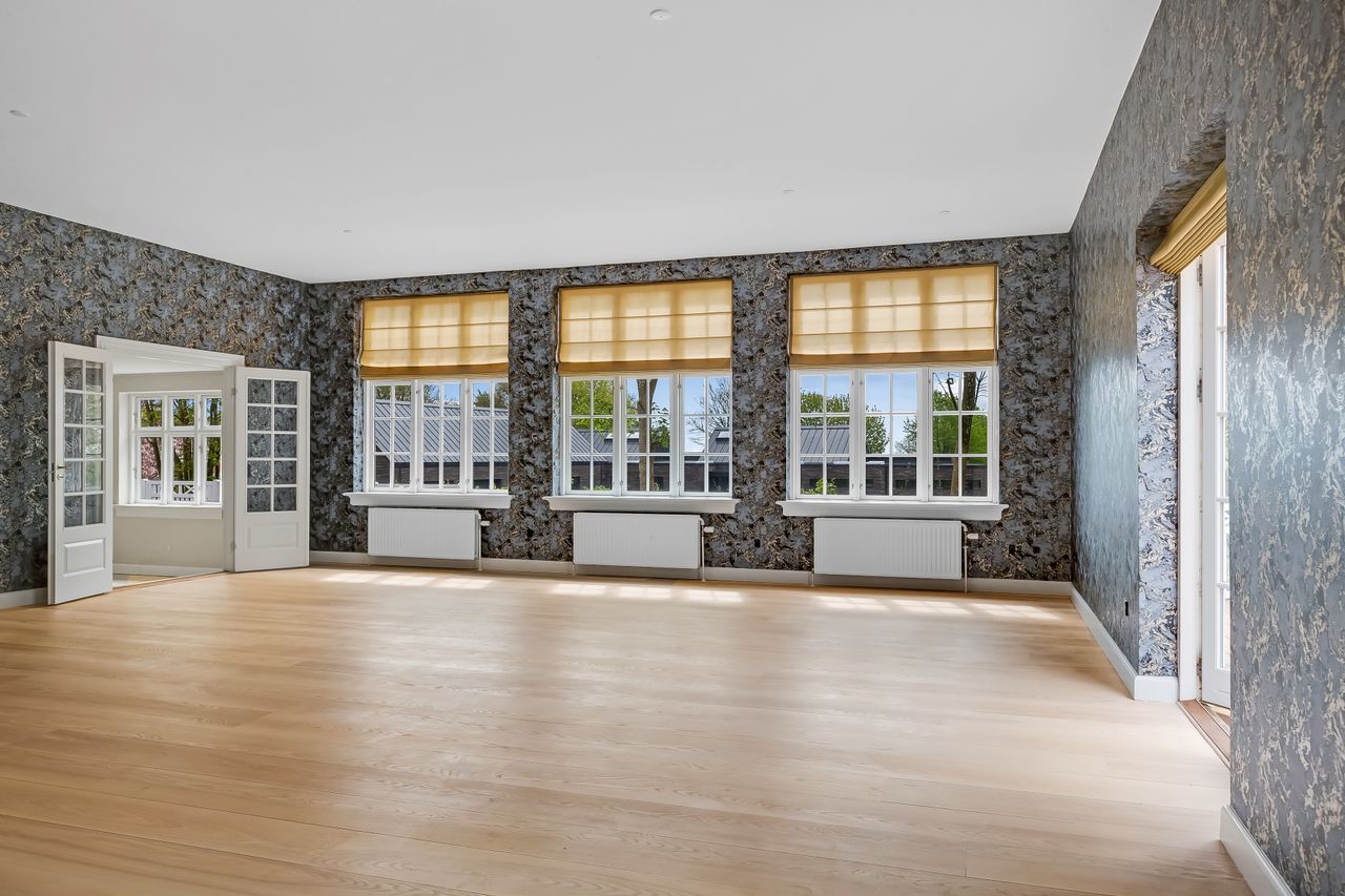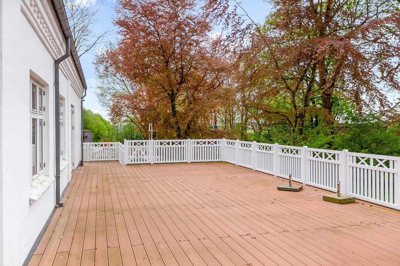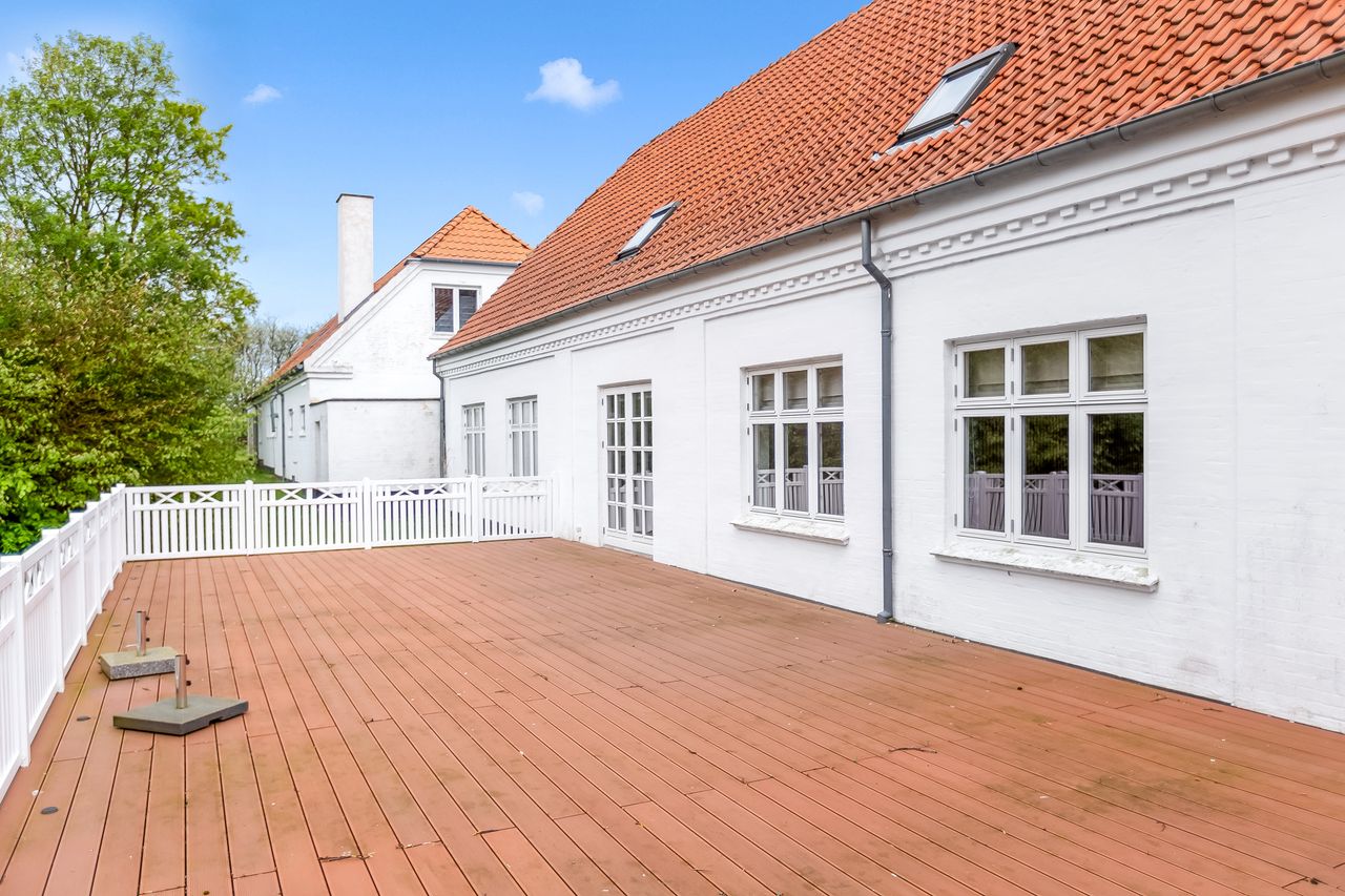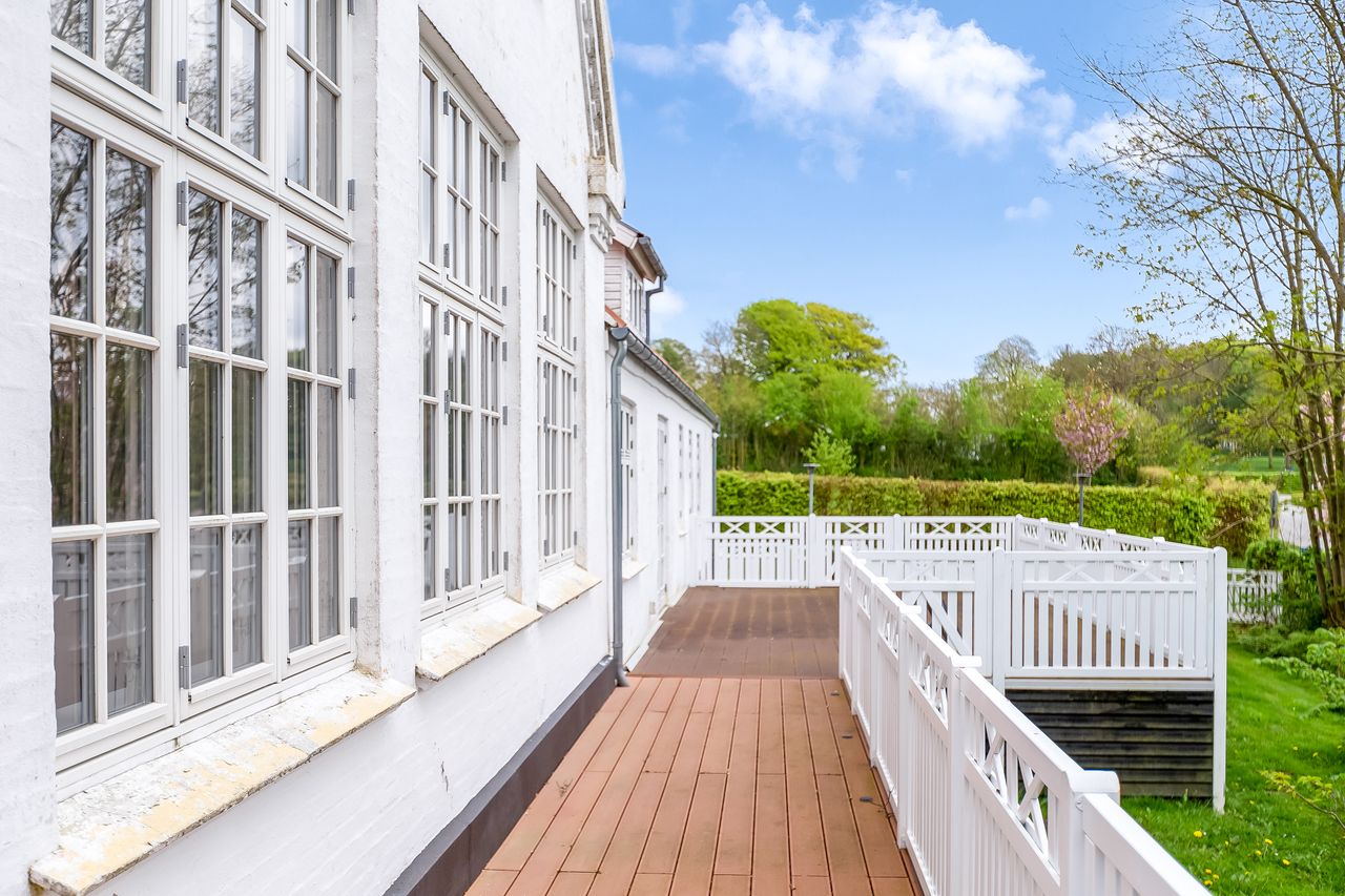 som flotte indgange, højloftede rum med masser af lysindfald. Fra de flotte stuer er der udgang til nyere