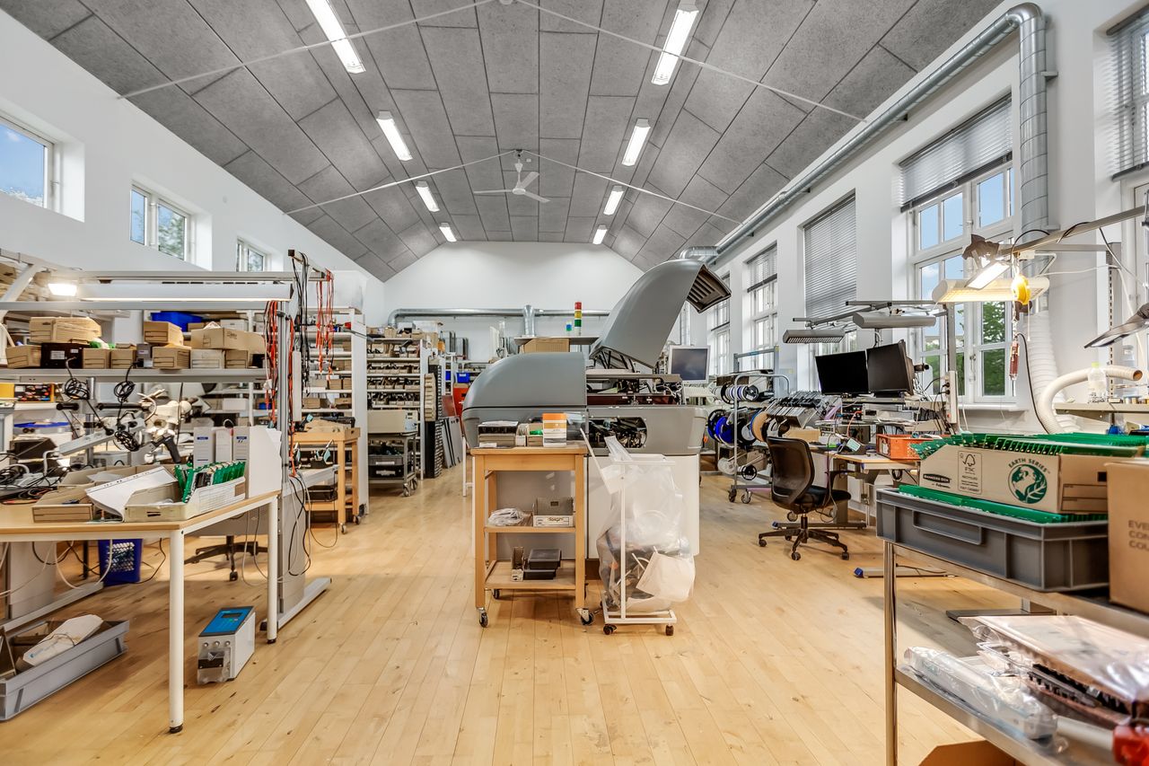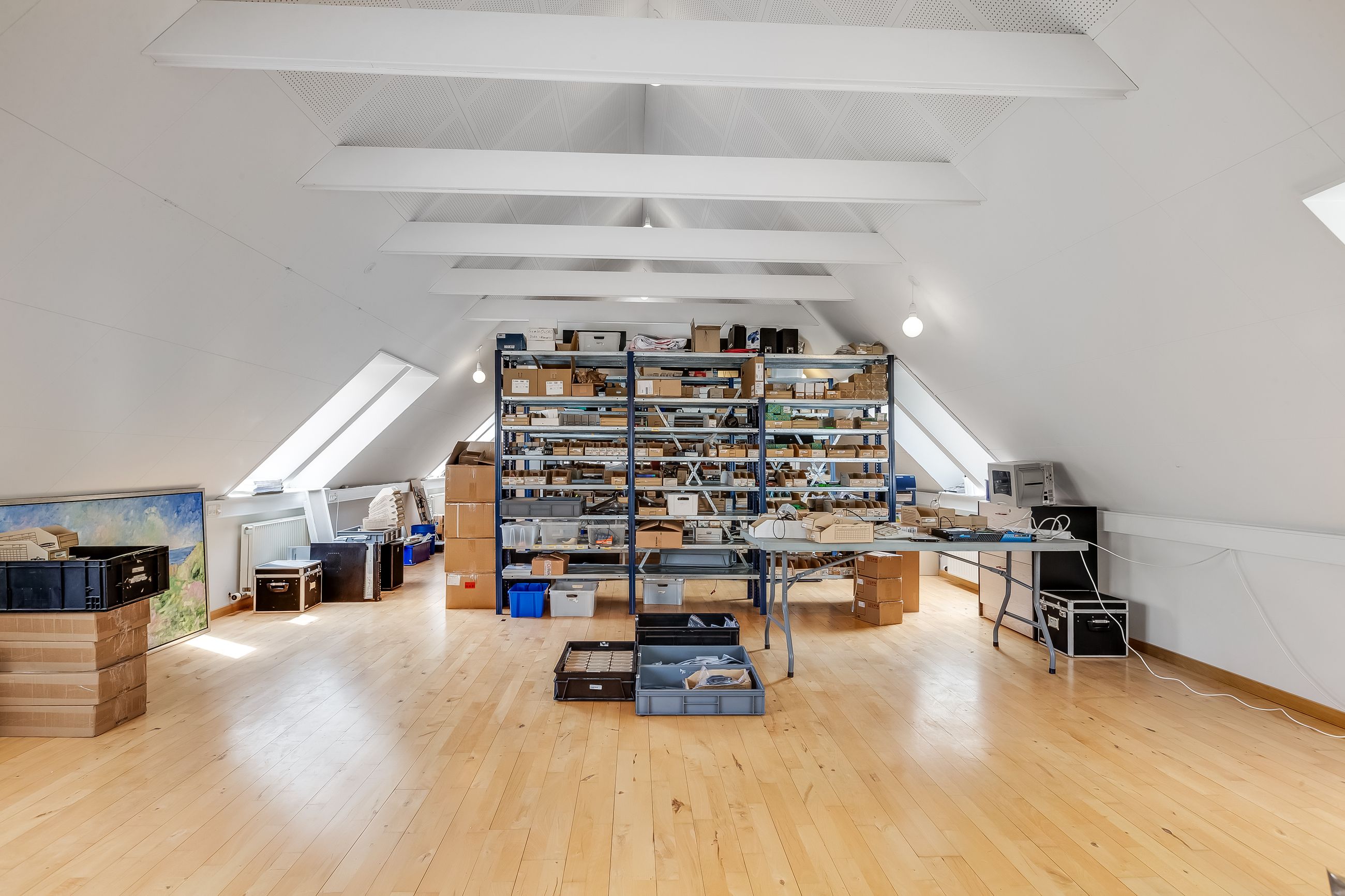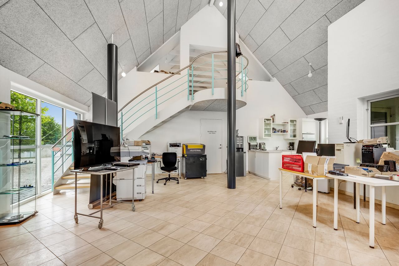 Erhvervsdelen er ligeledes i god stand og indrettet i flere plan. Den tidligere gymnastiksal er i dag en del