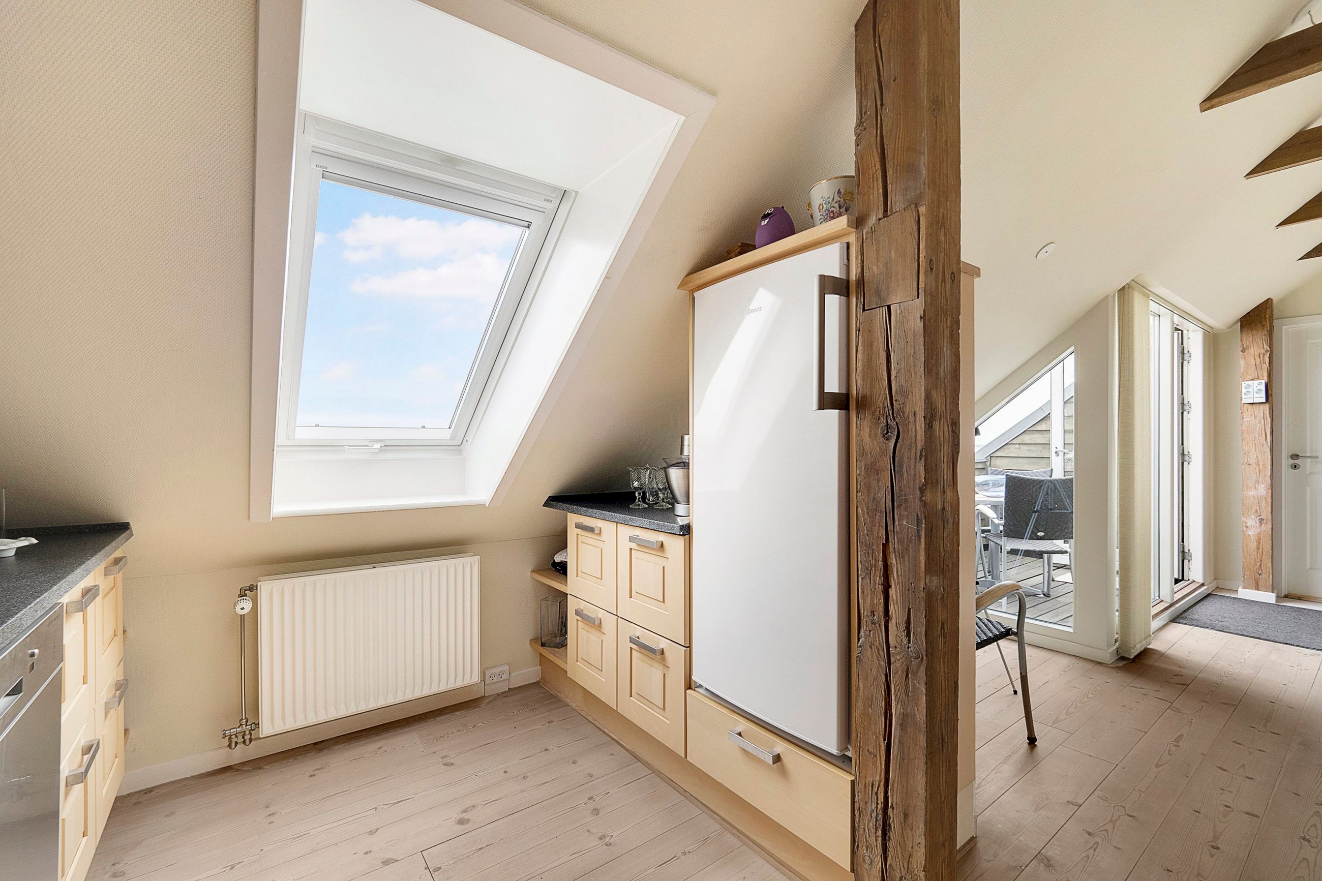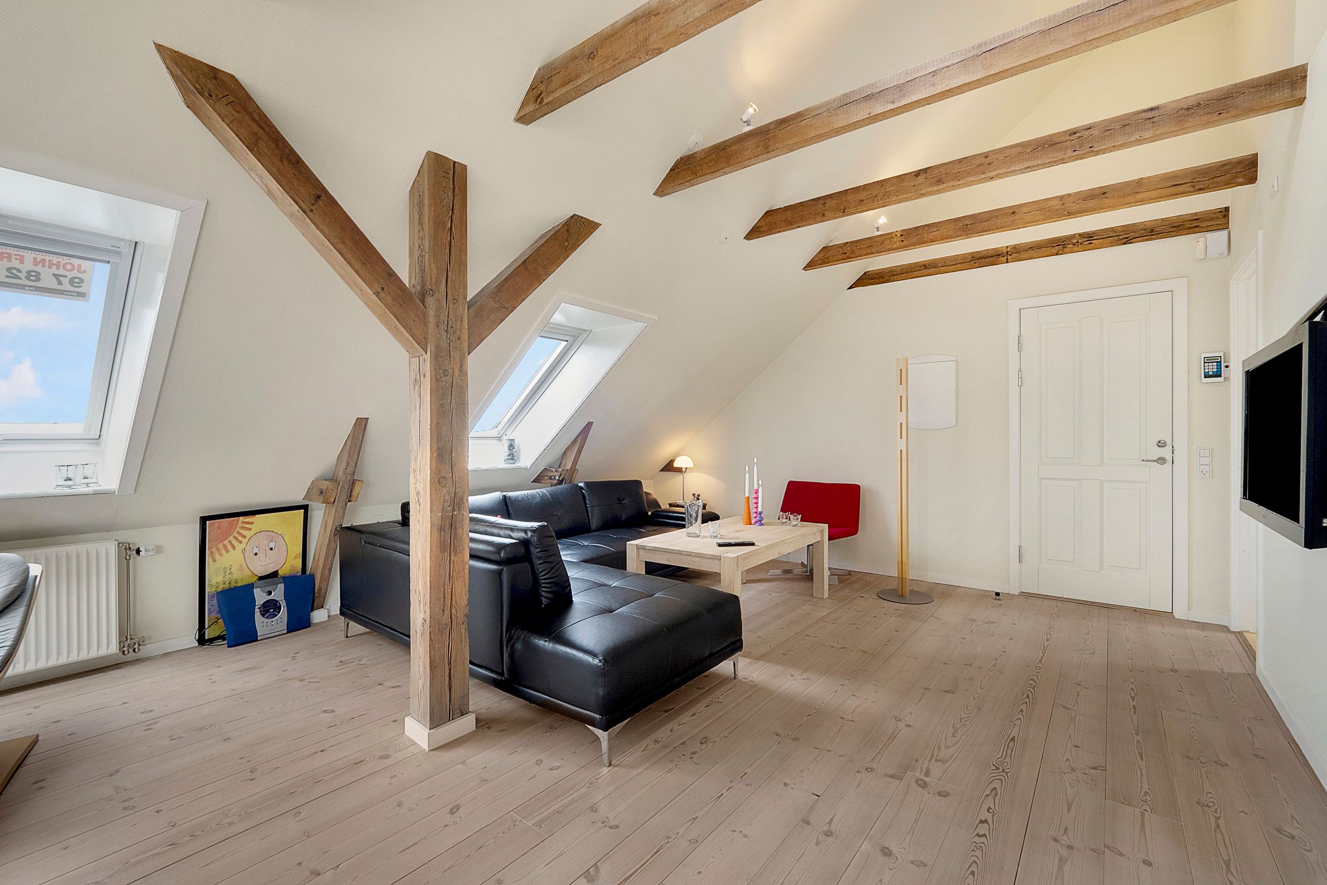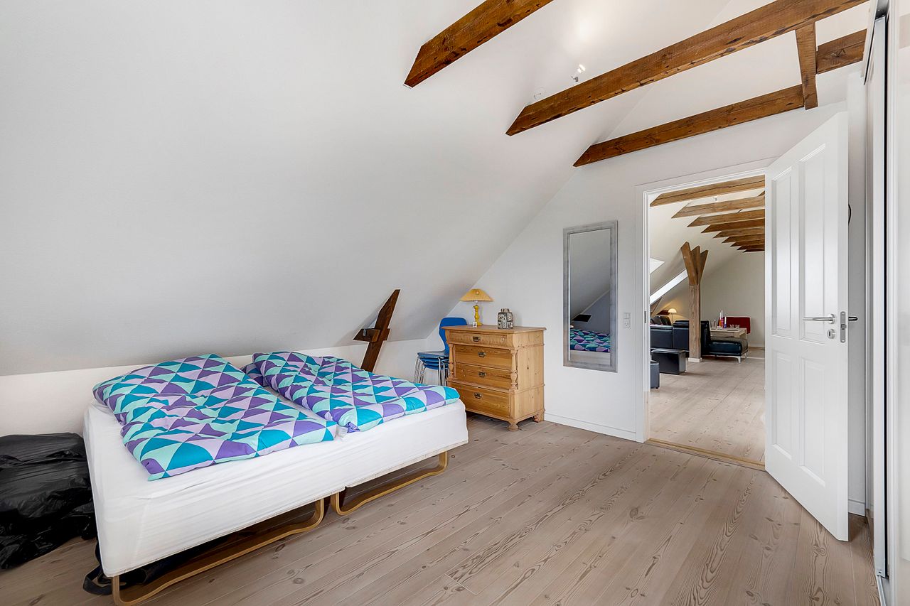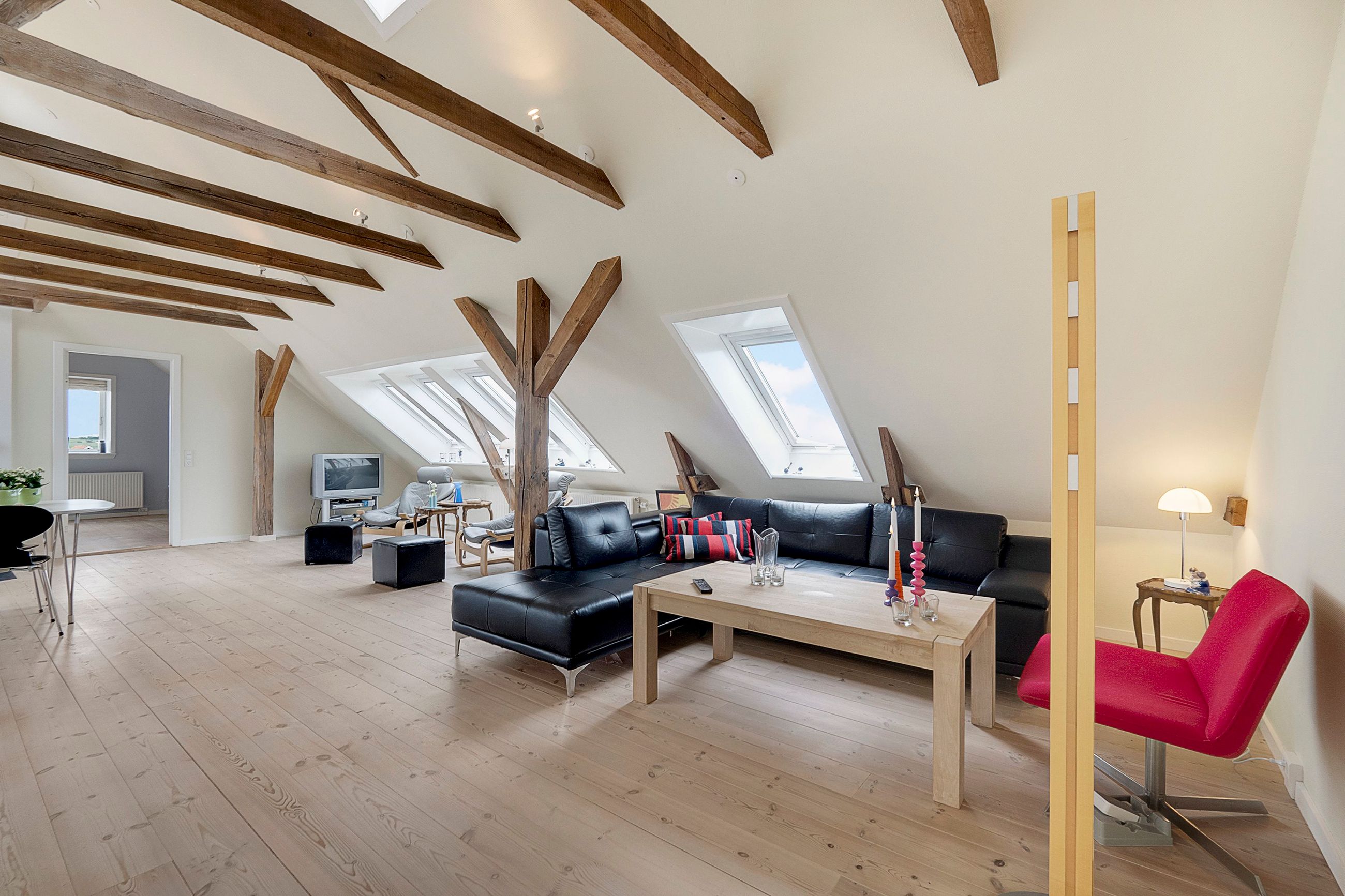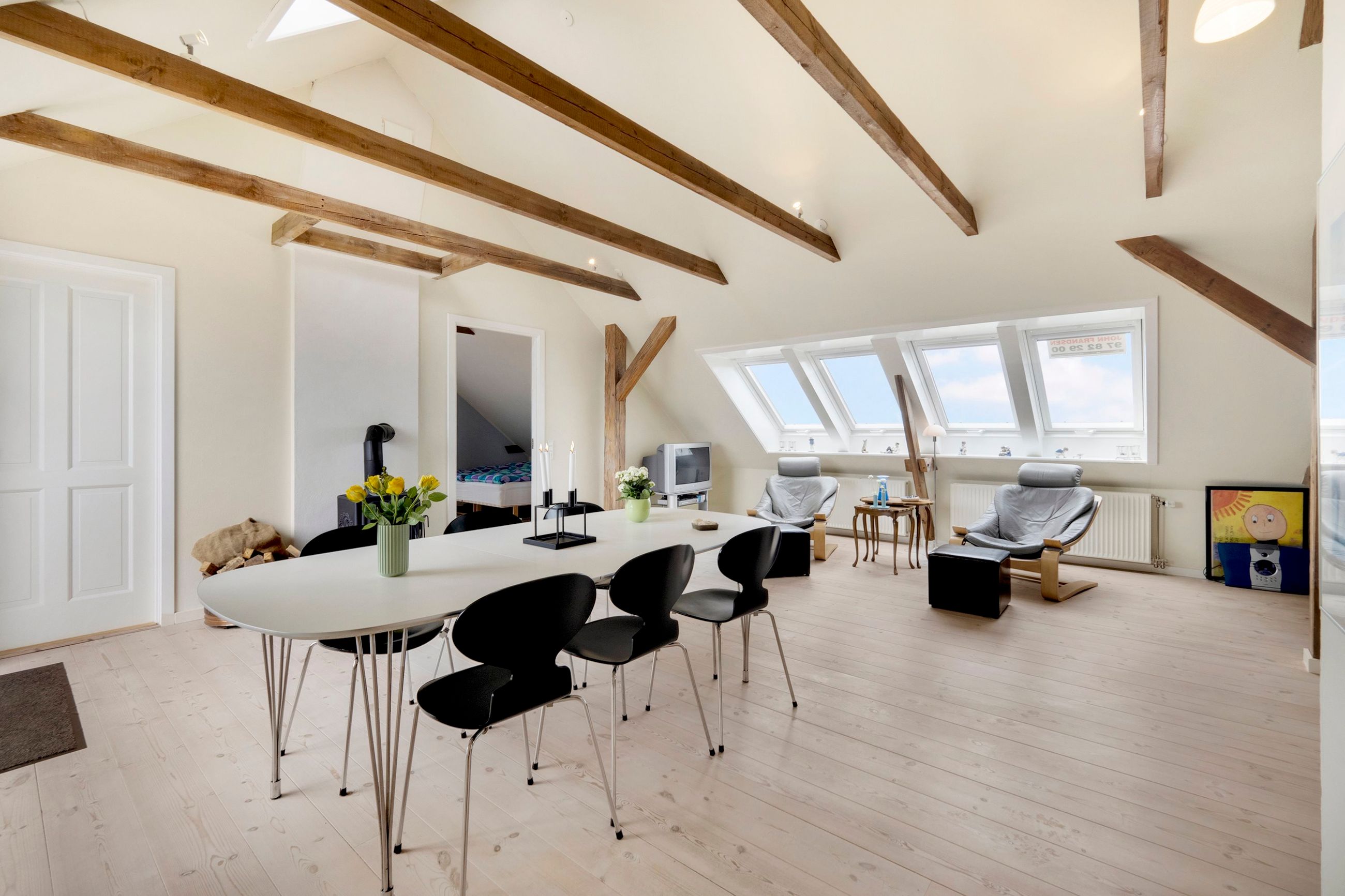 Her får I en bolig med karakter, atmosfære og høj komfort – blandt andet takket være de fritstående bjælker, de smukke trægulve og det generøse lysindfald fra flere ovenlysvinduer. Loft til kip skaber en behagelig rumfornemmelse, og stuen byder på flere hyggelige zoner – hvad enten det er sofahjørnet, hyggekrogen under ovenlyset eller det store spisebord, der samler jer.